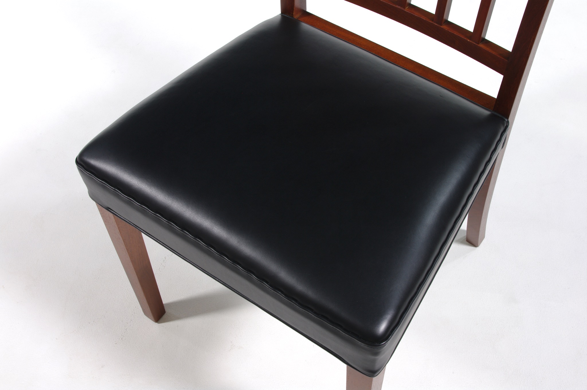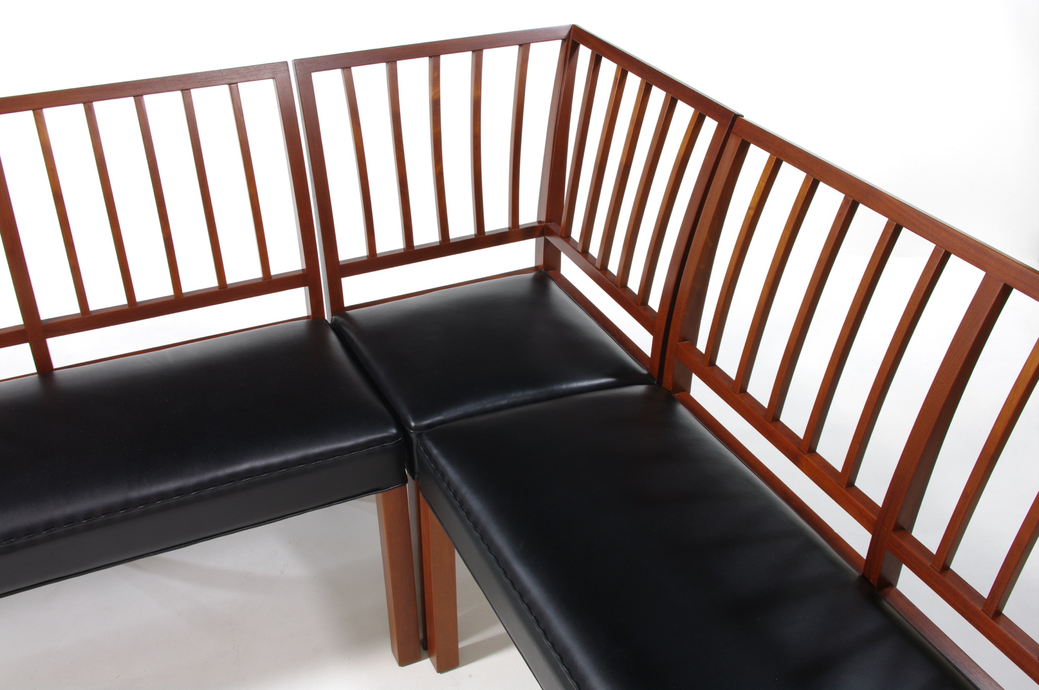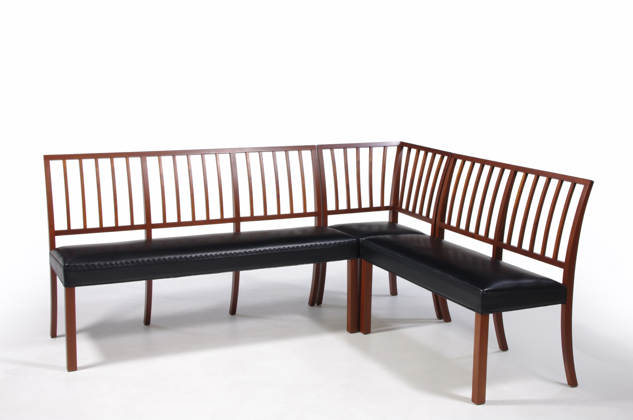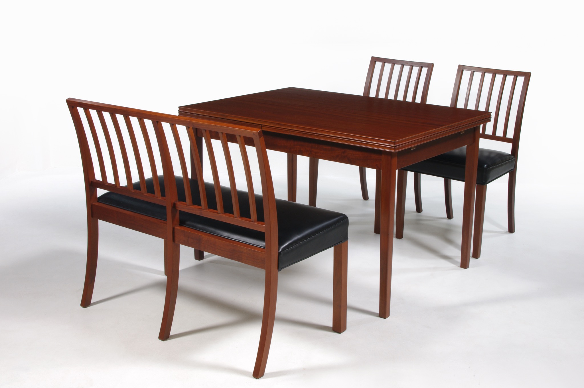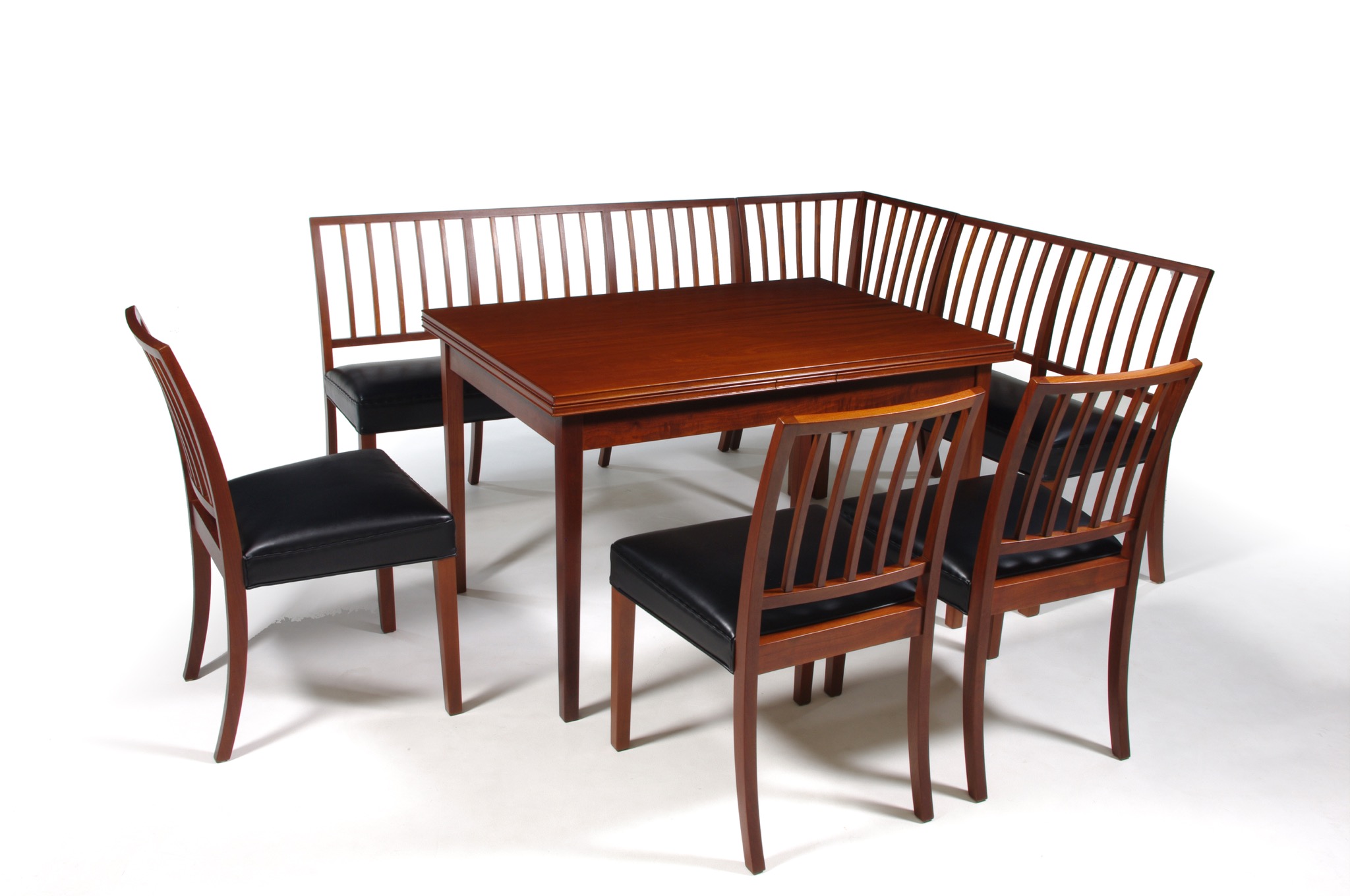 20世紀前葉に活躍したデンマークの建築家、Kaj Gottlob/カイ・ゴットロブによるベンチシートタイプのダイニングセットです。名工 A.J.イヴァーセンによって1934年に発表されたモデルで、こちらのセットもその当時作られたものでしょう。キューバンマホガニーと思しき良質な材が用いられております。テーブルにはエクステンション機能が備わり、天板の拡張が可能です。椅子のシートは黒色皮革にて張り替えており、とても綺麗な状態です。サイドチェアx3脚、3人掛けベンチ、2人掛けベンチ、コーナーベンチ、テーブルとの計7点セットとなり、テーブルを伸ばせば7人くらいはゆったり座れそうです。