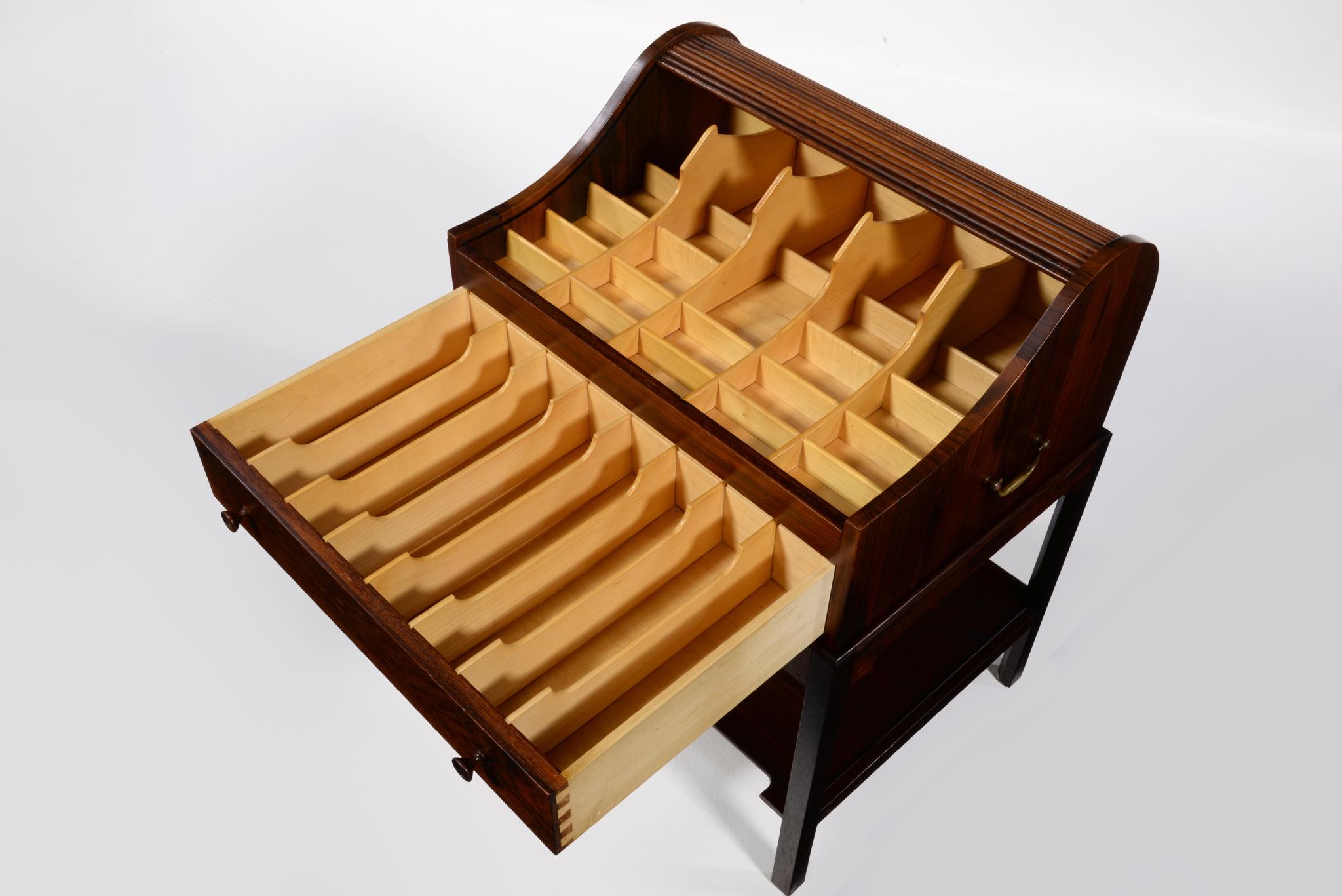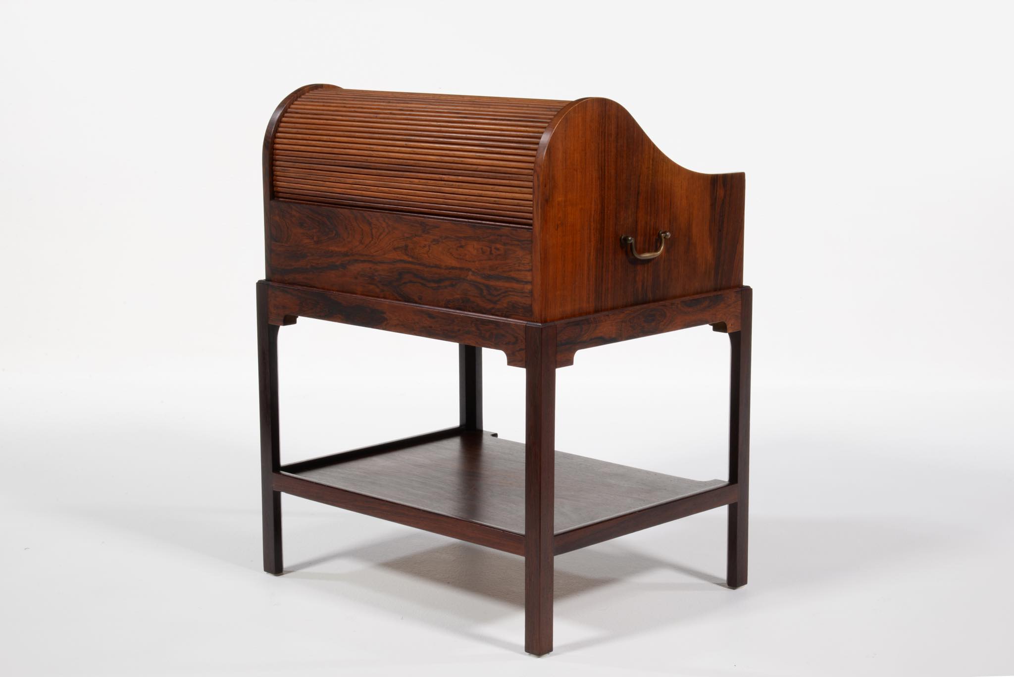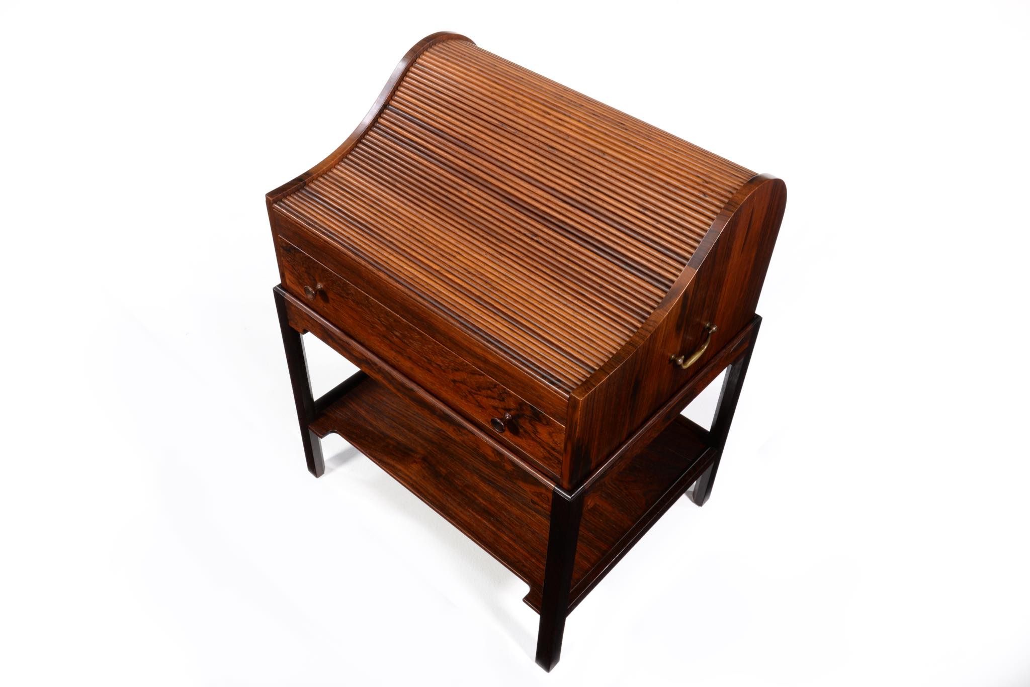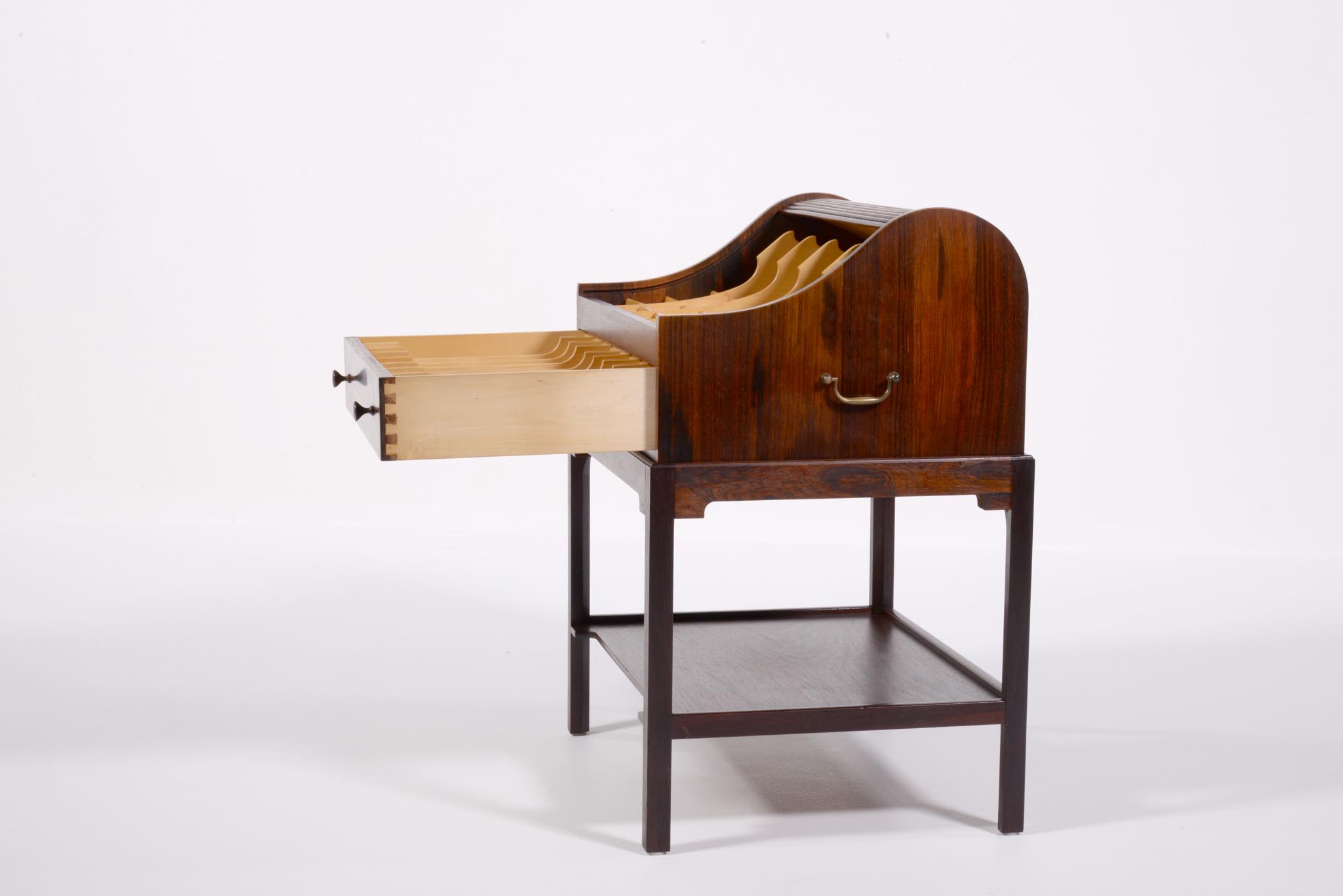 デンマークの家具デザイナー、Hans J. Wegner/ハンス・ウェグナーによってデザインされたソーイング(手芸用)テーブルです。1944年のキャビネットメーカーズギルド展に出品されたモデルで、小ロットでのみ生産されたもののようです。1944年当時はキューバンマホガニーで作られ、施錠できるよう鍵が備わったようですが、こちらのモデルは無垢材のブラジリアンローズウッドが用いられており、キーボックスはありません。抽斗を引くとトップの蛇腹が同時に開くという、ギミックが効いています。一部小さなあたり傷が見られますが、極めてきれいな状態です。