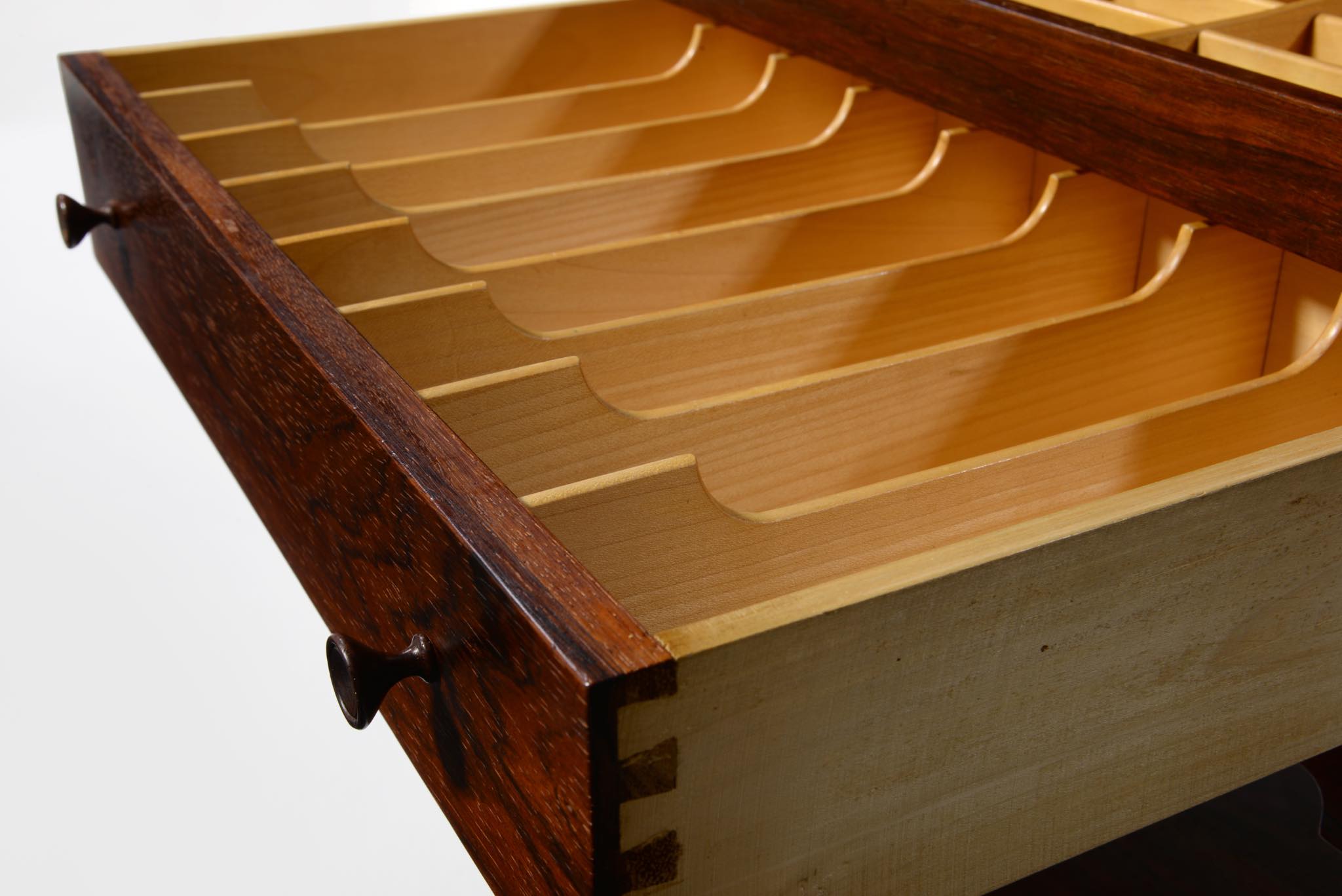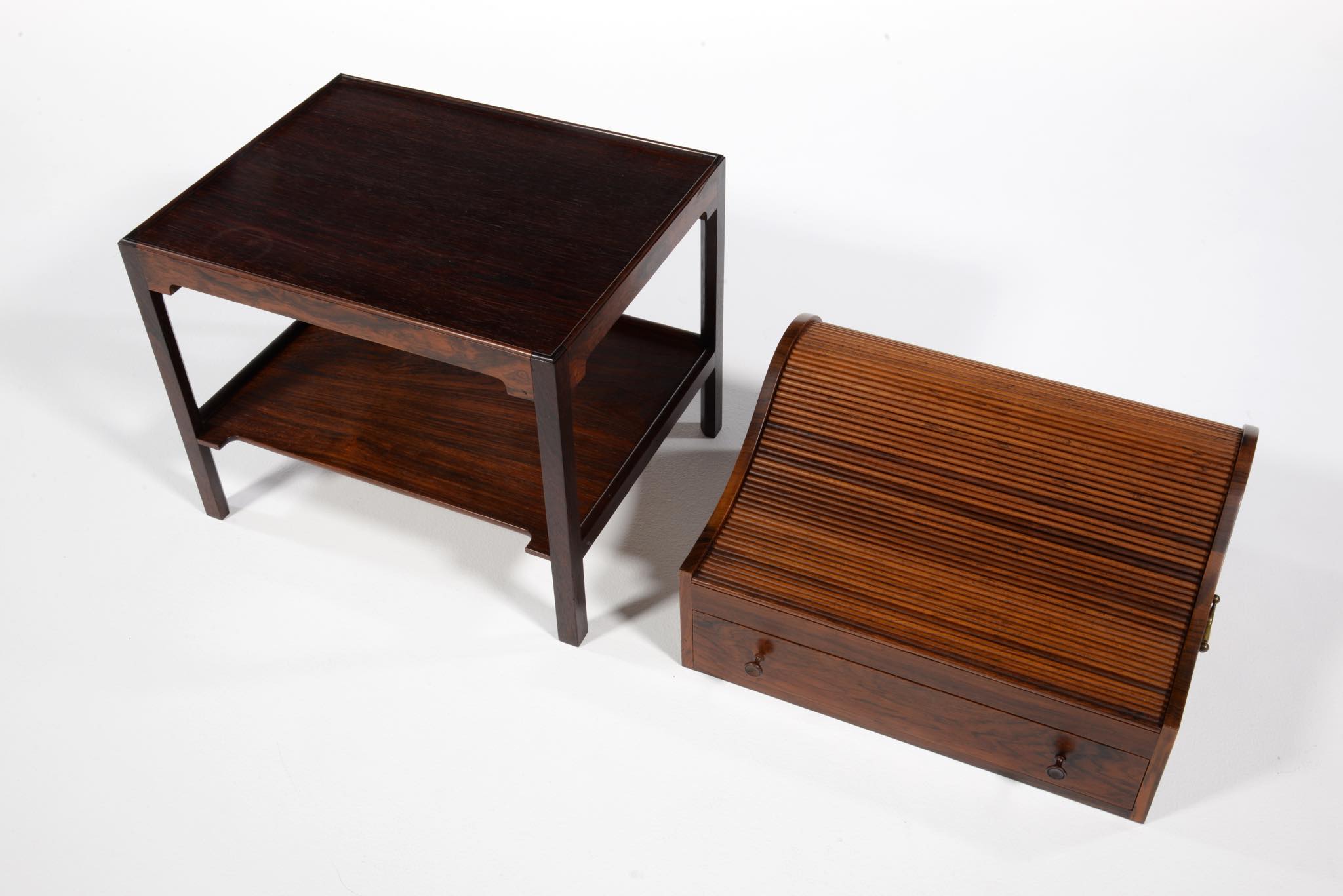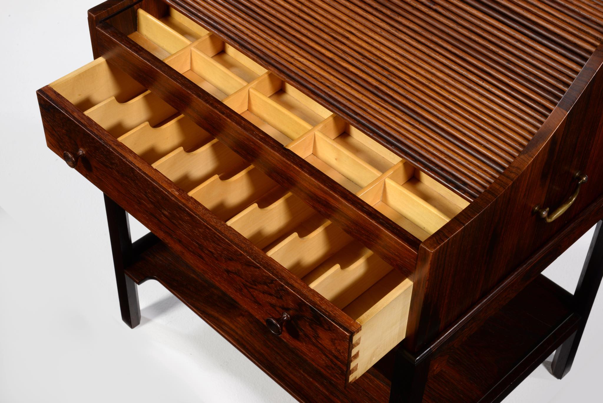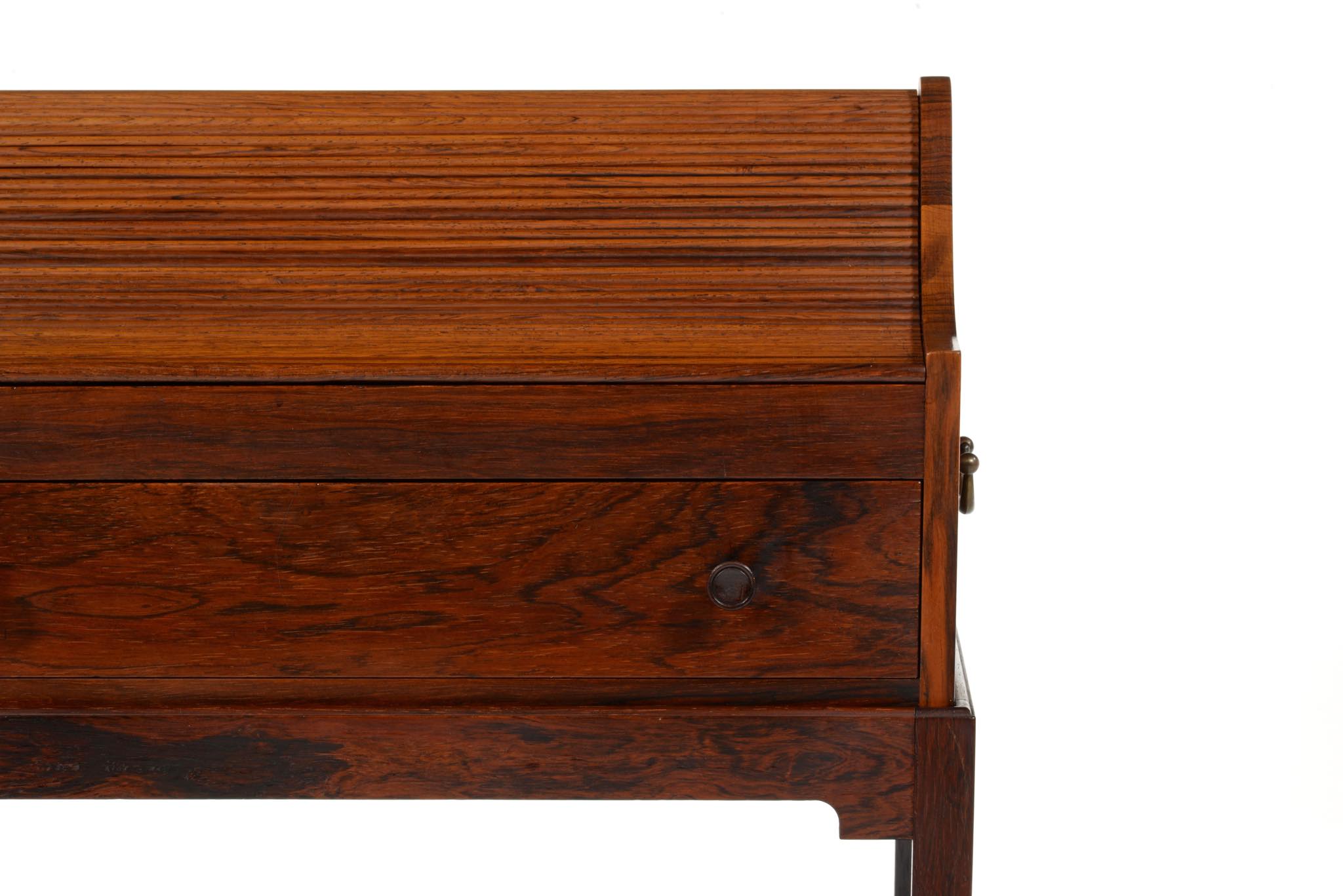 デンマークの家具デザイナー、Hans J. Wegner/ハンス・ウェグナーによってデザインされたソーイング(手芸用)テーブルです。1944年のキャビネットメーカーズギルド展に出品されたモデルで、小ロットでのみ生産されたもののようです。1944年当時はキューバンマホガニーで作られ、施錠できるよう鍵が備わったようですが、こちらのモデルは無垢材のブラジリアンローズウッドが用いられており、キーボックスはありません。抽斗を引くとトップの蛇腹が同時に開くという、ギミックが効いています。一部小さなあたり傷が見られますが、極めてきれいな状態です。