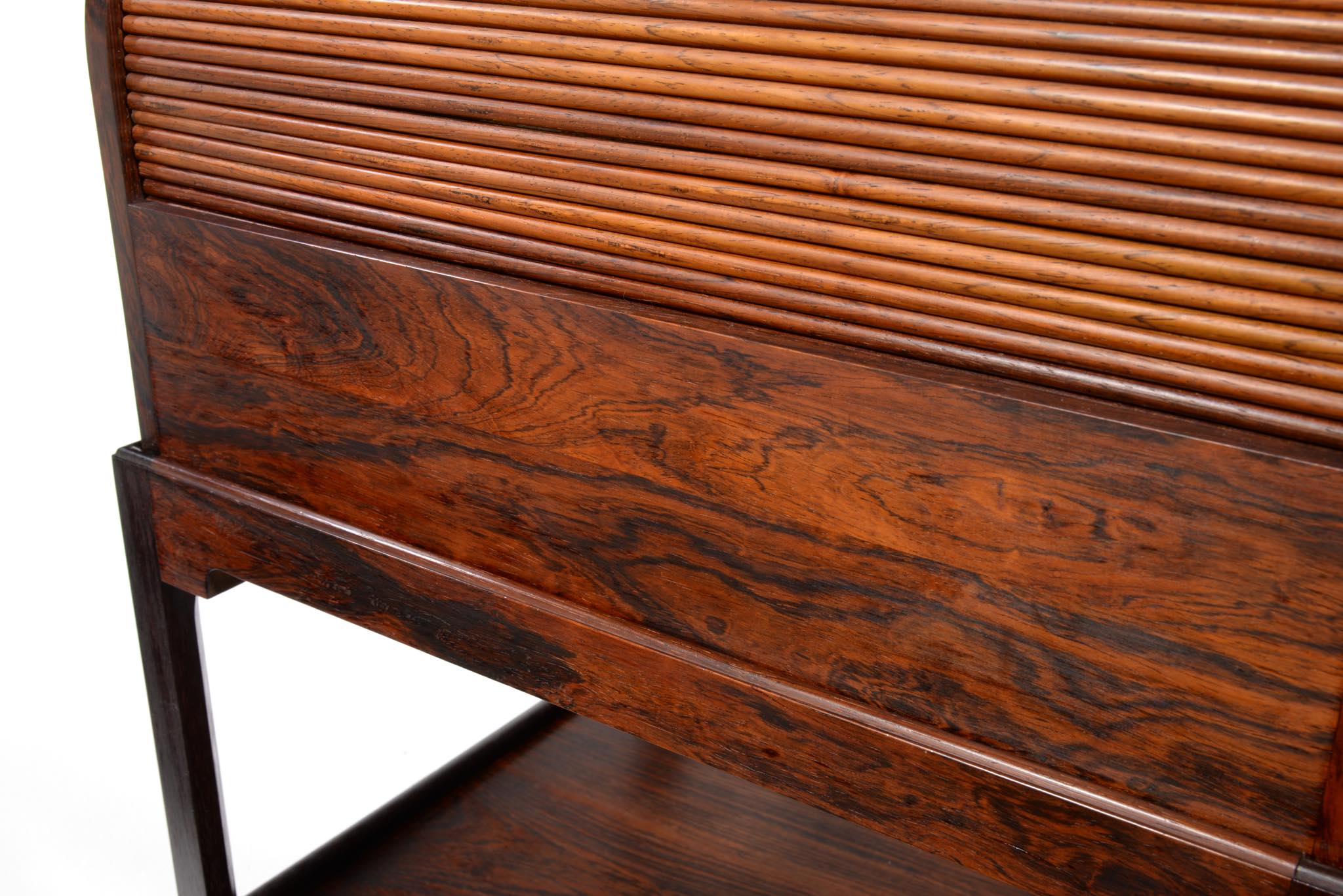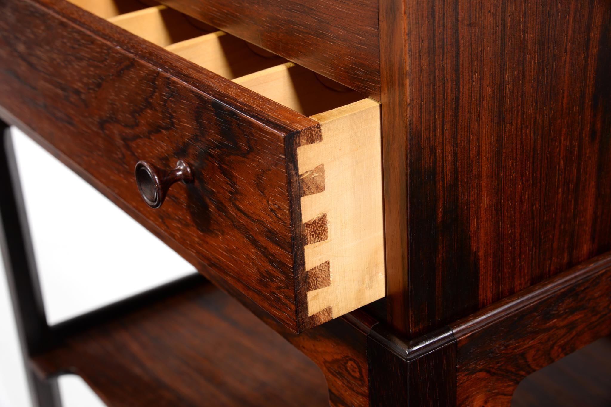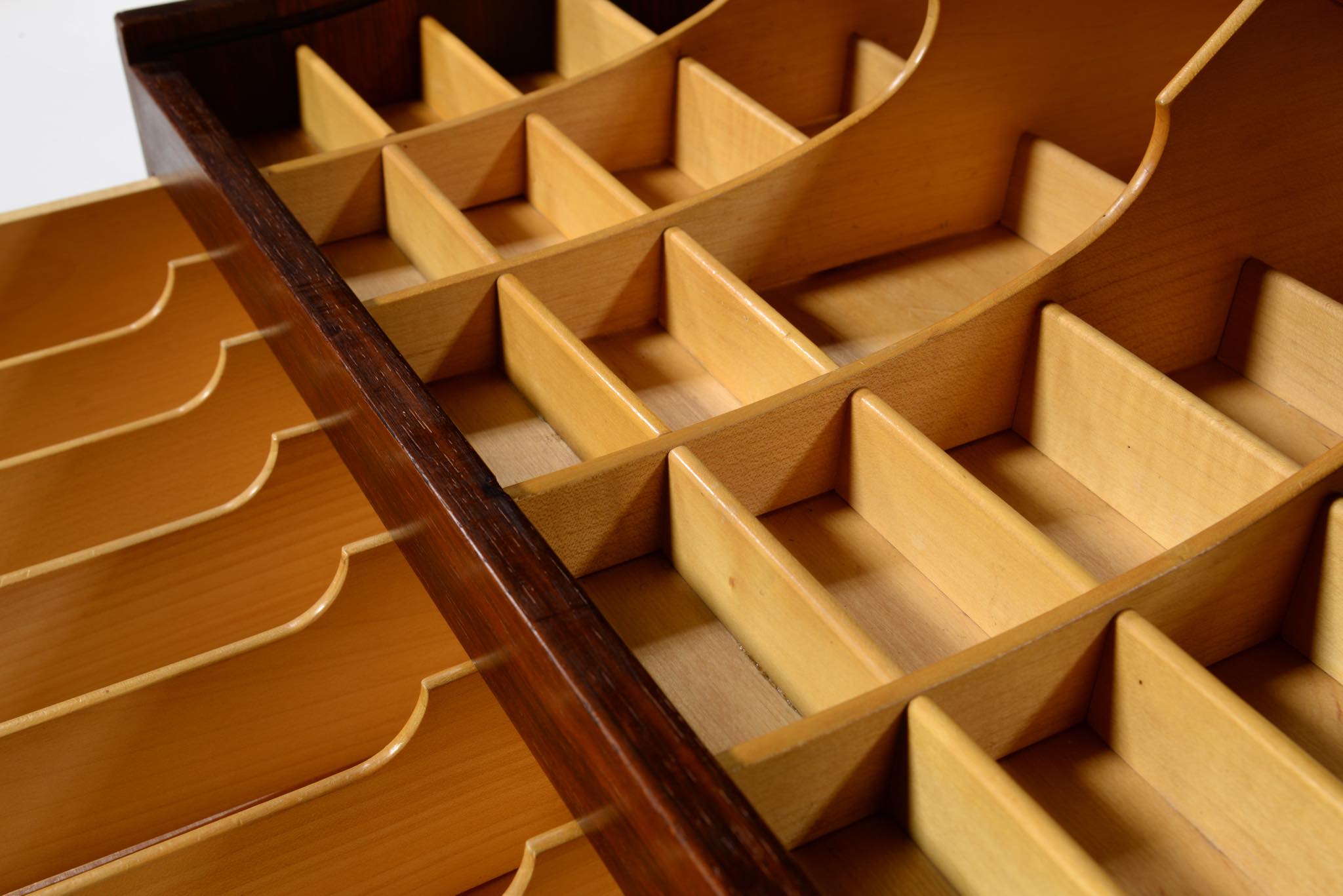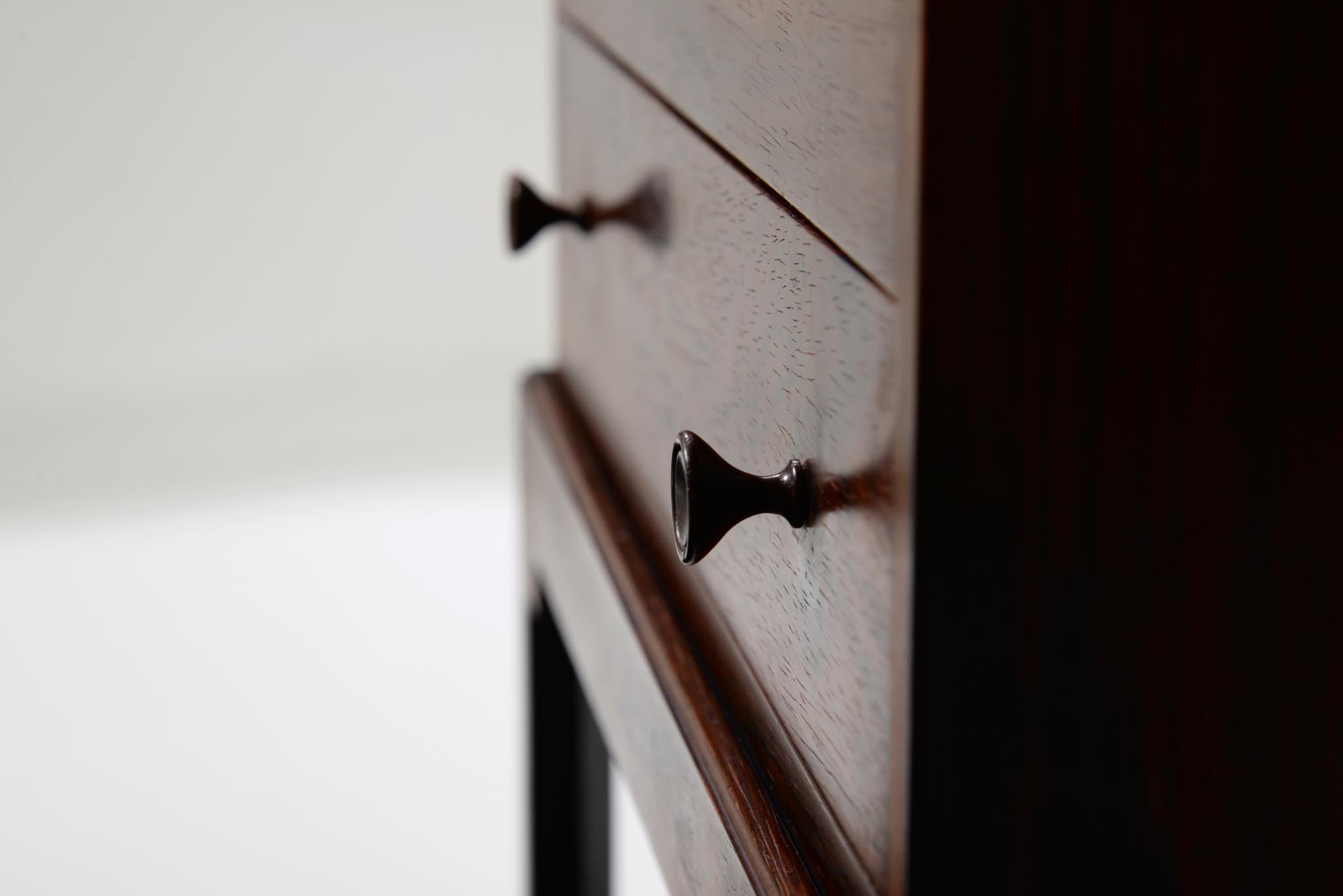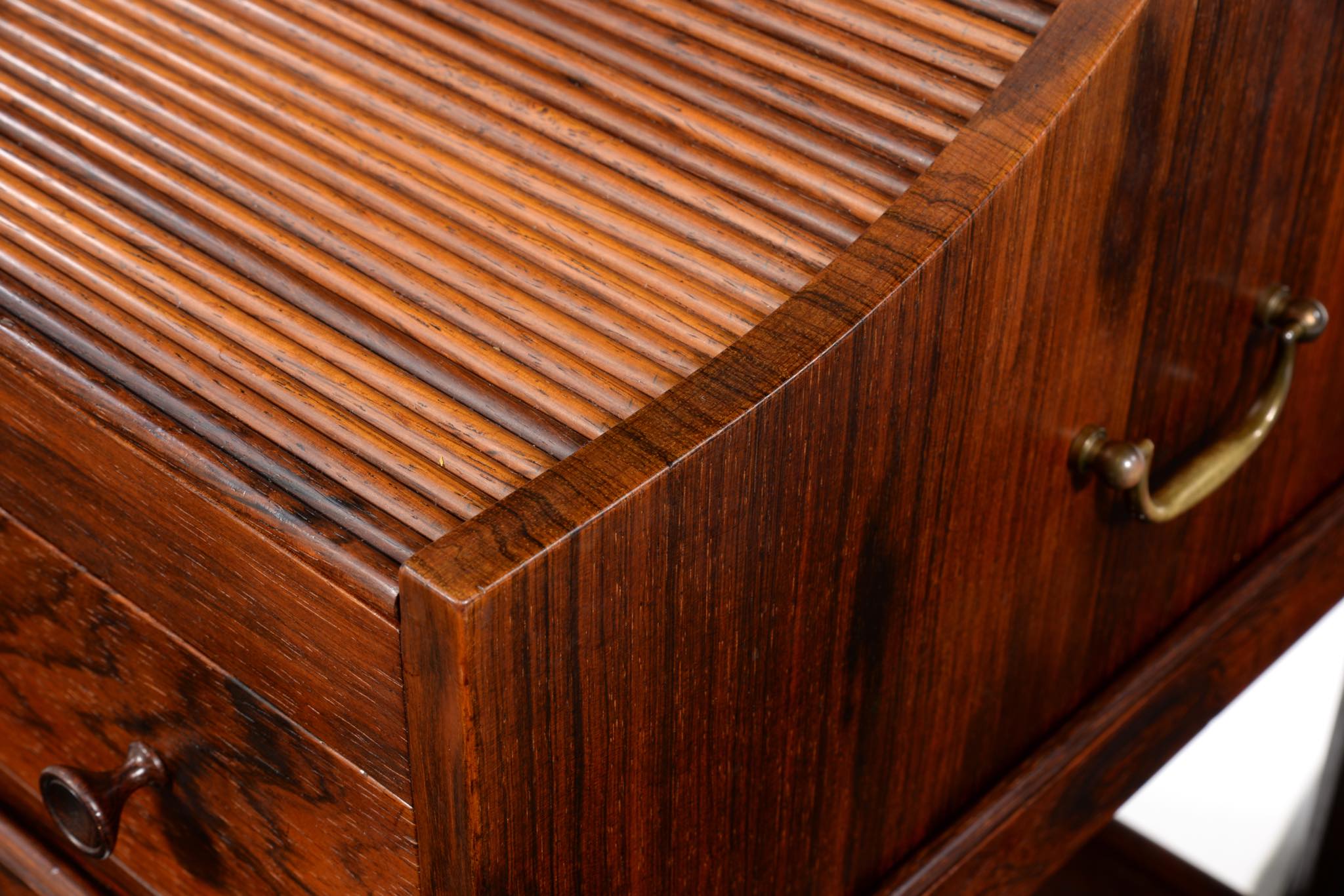 デンマークの家具デザイナー、Hans J. Wegner/ハンス・ウェグナーによってデザインされたソーイング(手芸用)テーブルです。1944年のキャビネットメーカーズギルド展に出品されたモデルで、小ロットでのみ生産されたもののようです。1944年当時はキューバンマホガニーで作られ、施錠できるよう鍵が備わったようですが、こちらのモデルは無垢材のブラジリアンローズウッドが用いられており、キーボックスはありません。抽斗を引くとトップの蛇腹が同時に開くという、ギミックが効いています。一部小さなあたり傷が見られますが、極めてきれいな状態です。