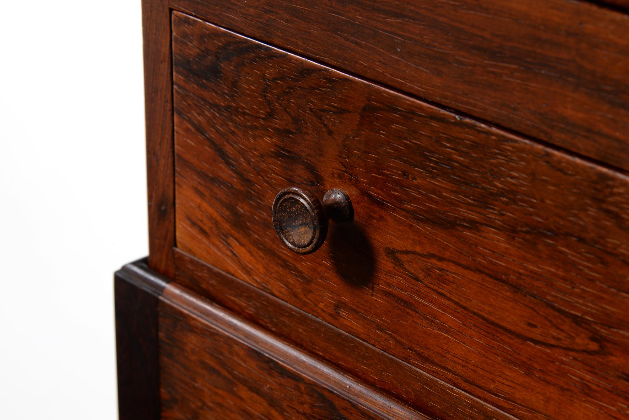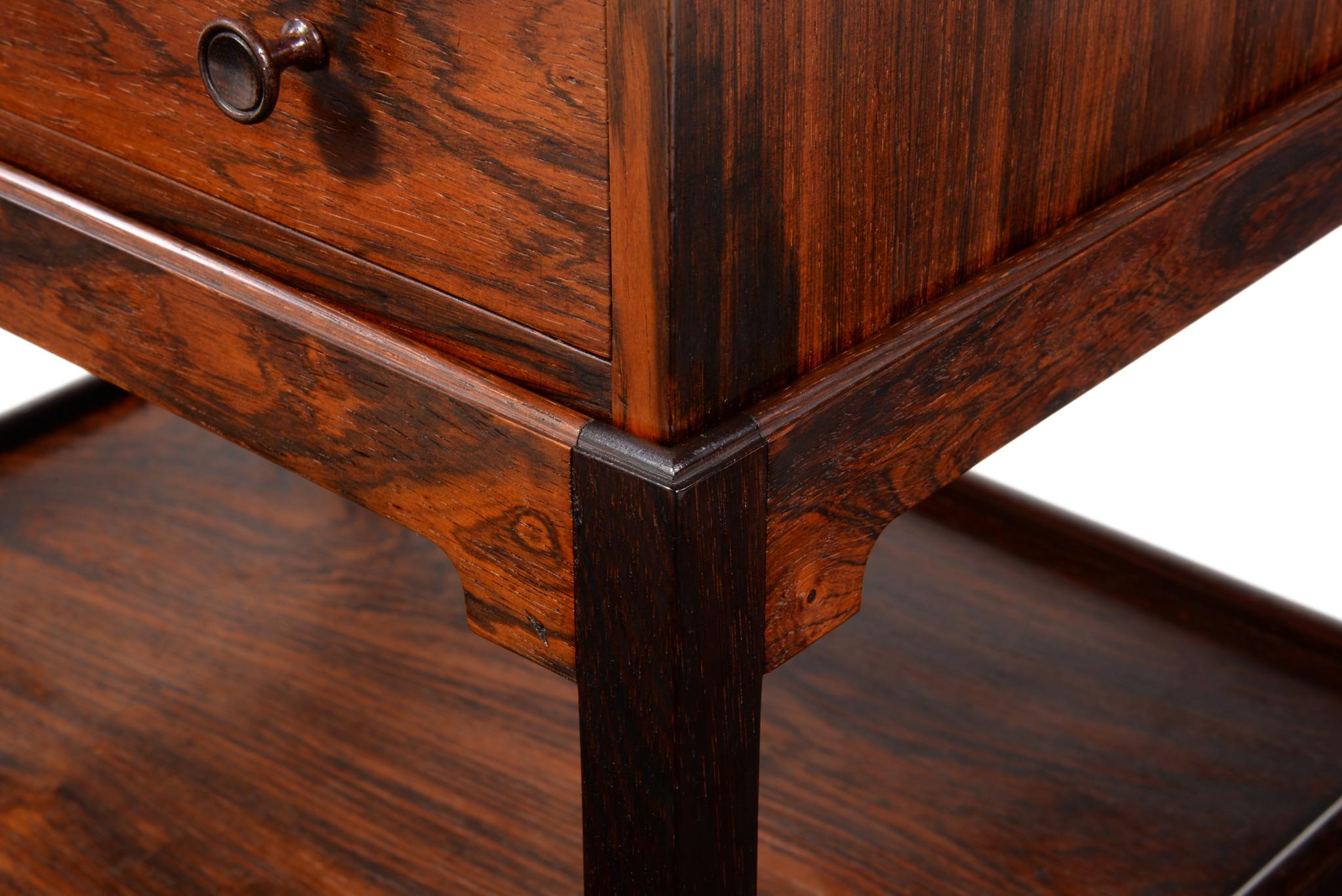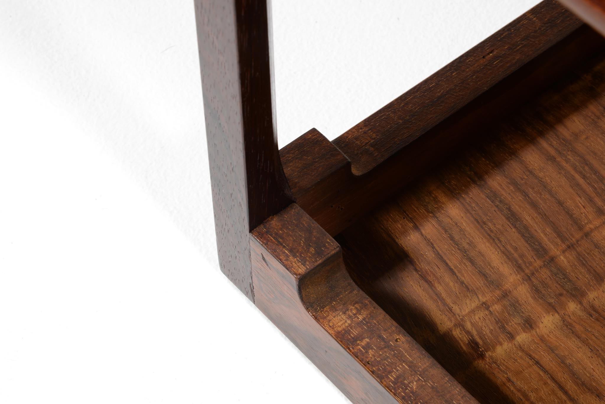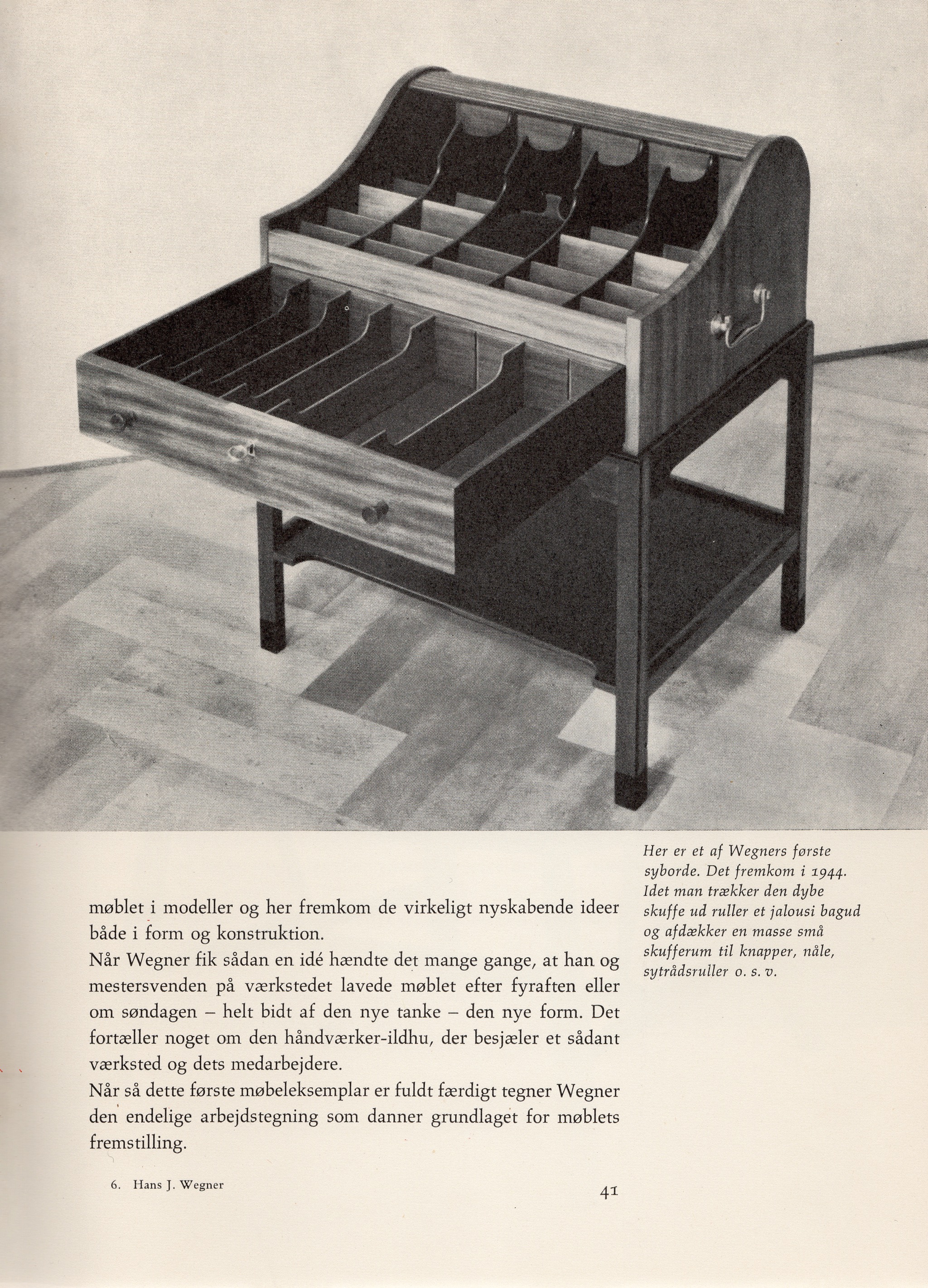 デンマークの家具デザイナー、Hans J. Wegner/ハンス・ウェグナーによってデザインされたソーイング(手芸用)テーブルです。1944年のキャビネットメーカーズギルド展に出品されたモデルで、小ロットでのみ生産されたもののようです。1944年当時はキューバンマホガニーで作られ、施錠できるよう鍵が備わったようですが、こちらのモデルは無垢材のブラジリアンローズウッドが用いられており、キーボックスはありません。抽斗を引くとトップの蛇腹が同時に開くという、ギミックが効いています。一部小さなあたり傷が見られますが、極めてきれいな状態です。
