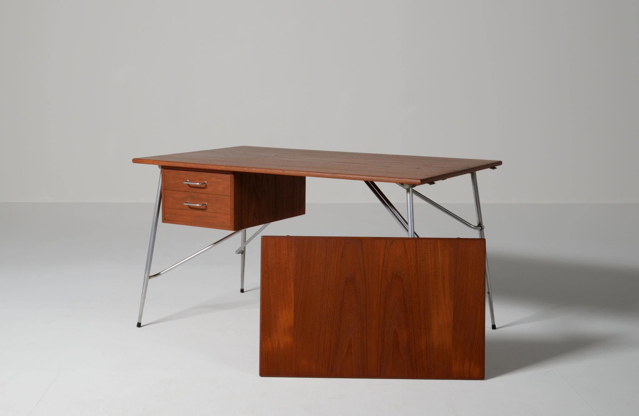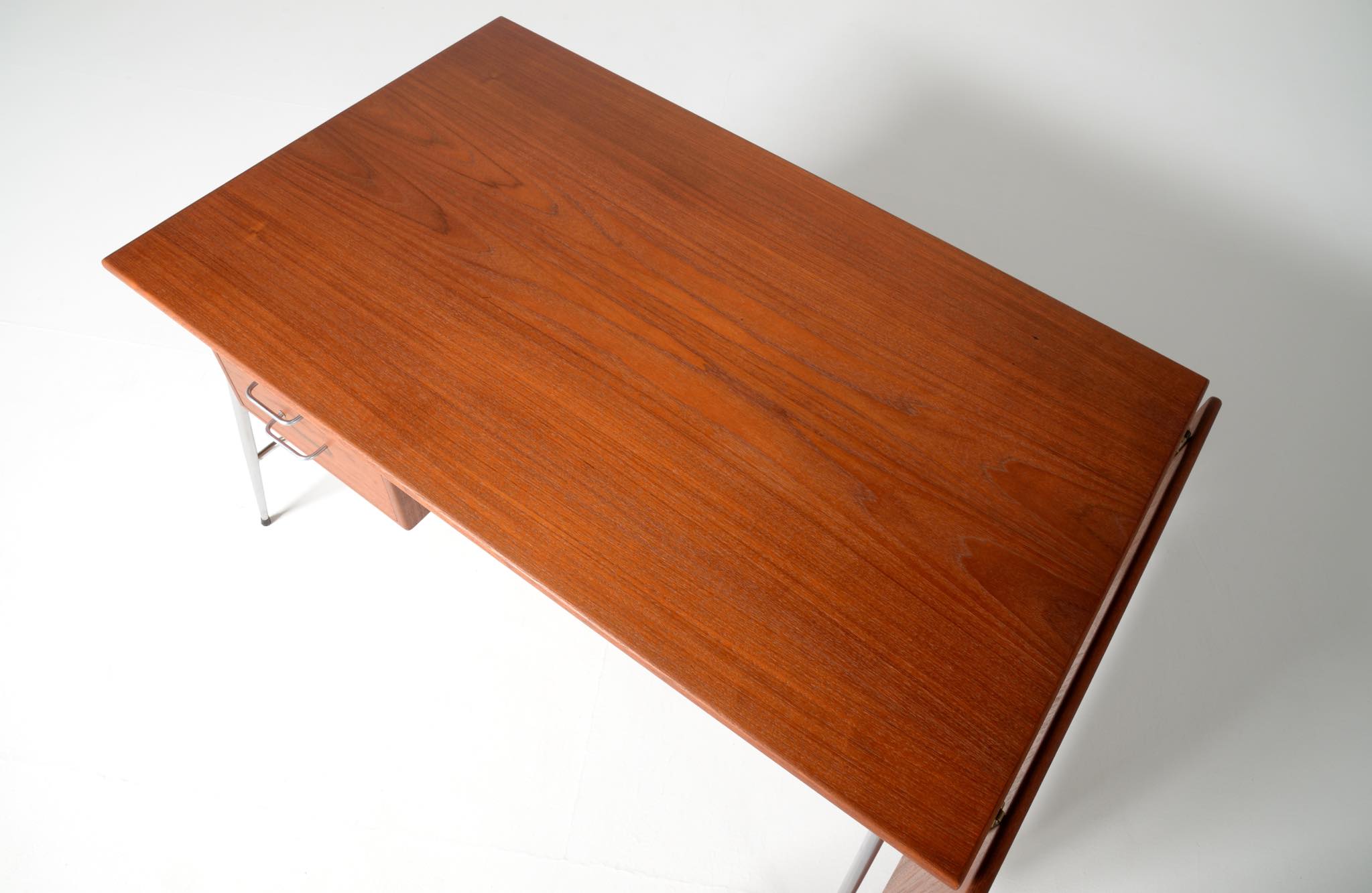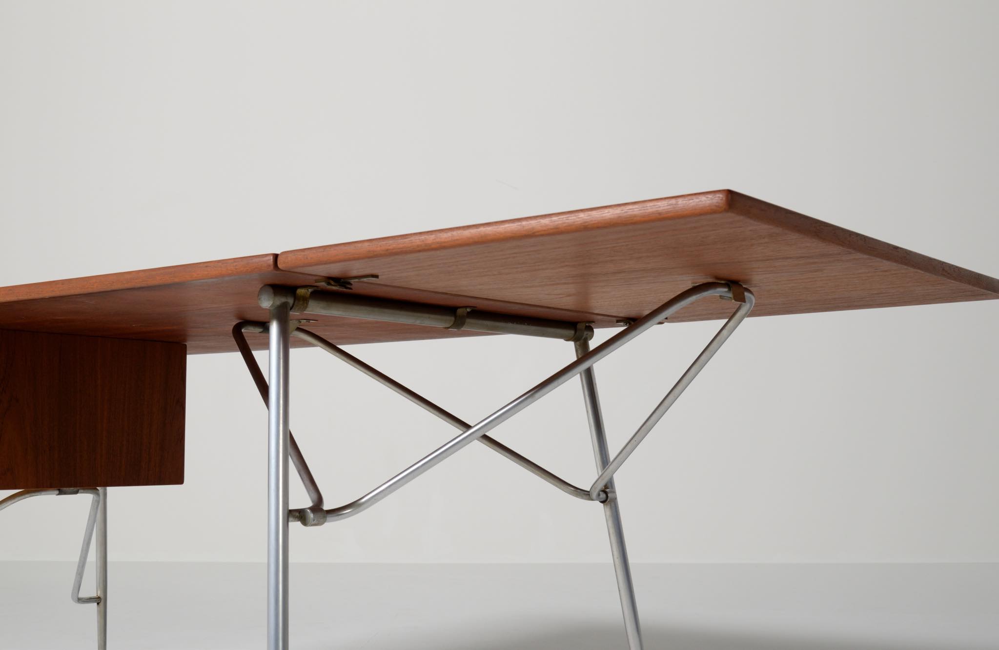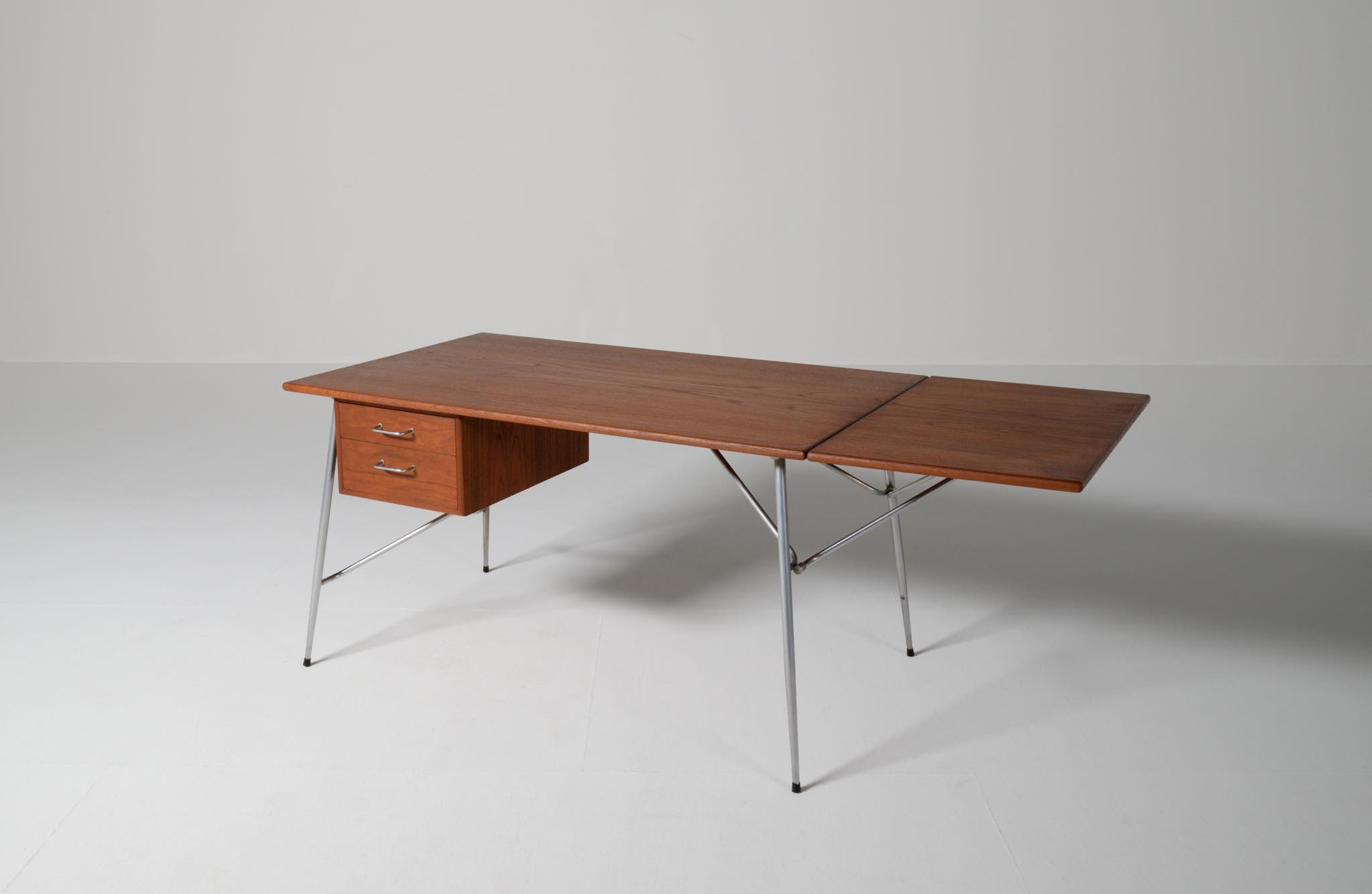 デンマークを代表するデザイナー、Børge Mogensen/ボーエ・モーエンセンによるライティングデスクです。1953年に開催されたDesignmuseum Danmark展に発表されたモデルで、こちらもその頃に作られたものでしょう。チーク材の天板にスチールレッグの組み合わせで、天板拡張のためのドロップリーフが備わります。コンディションは良好です。