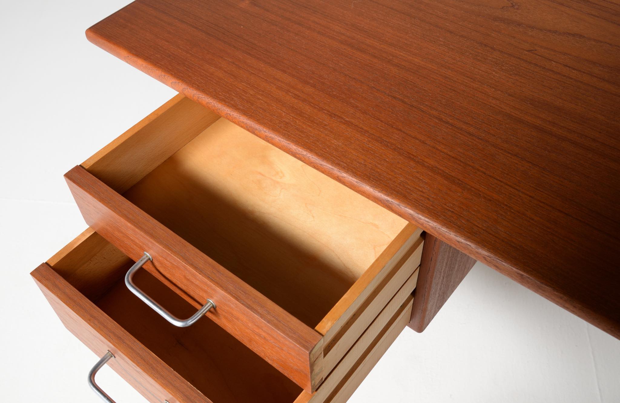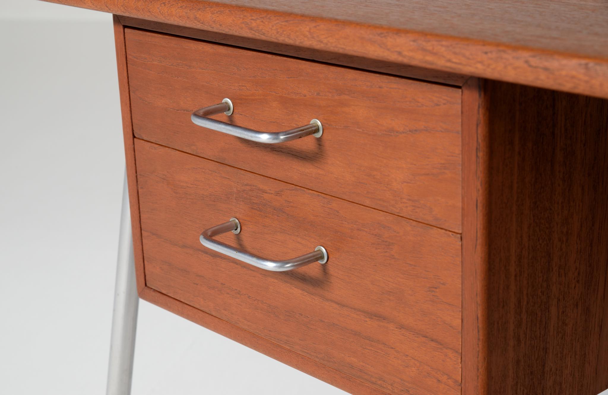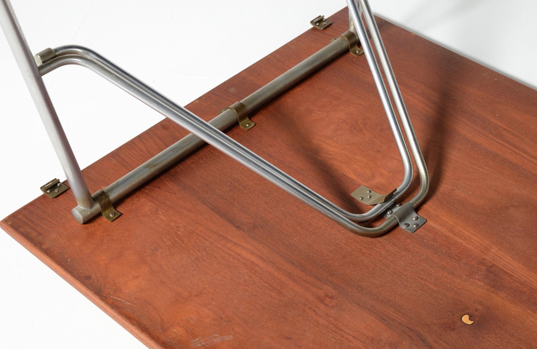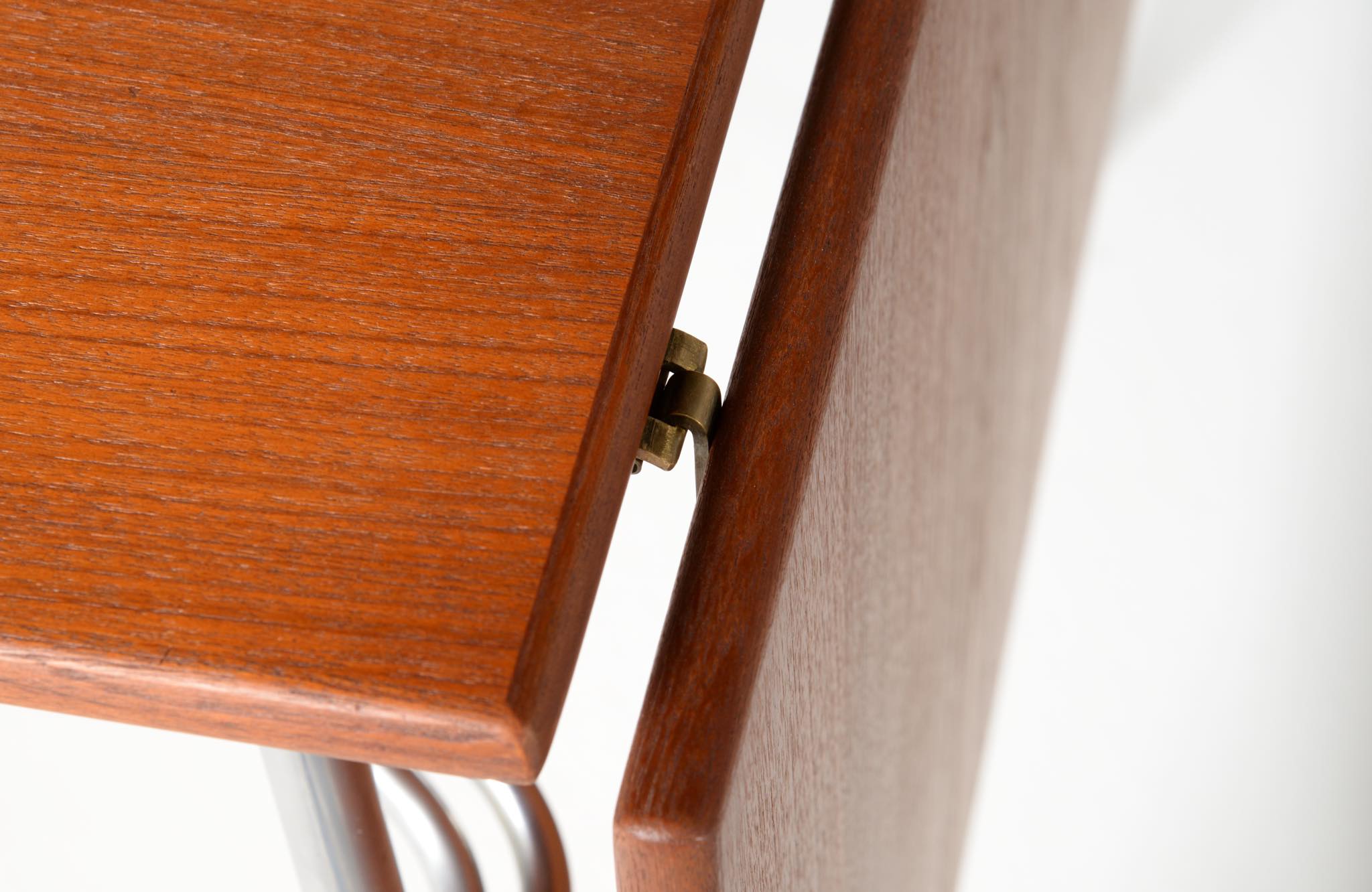 デンマークを代表するデザイナー、Børge Mogensen/ボーエ・モーエンセンによるライティングデスクです。1953年に開催されたDesignmuseum Danmark展に発表されたモデルで、こちらもその頃に作られたものでしょう。チーク材の天板にスチールレッグの組み合わせで、天板拡張のためのドロップリーフが備わります。コンディションは良好です。