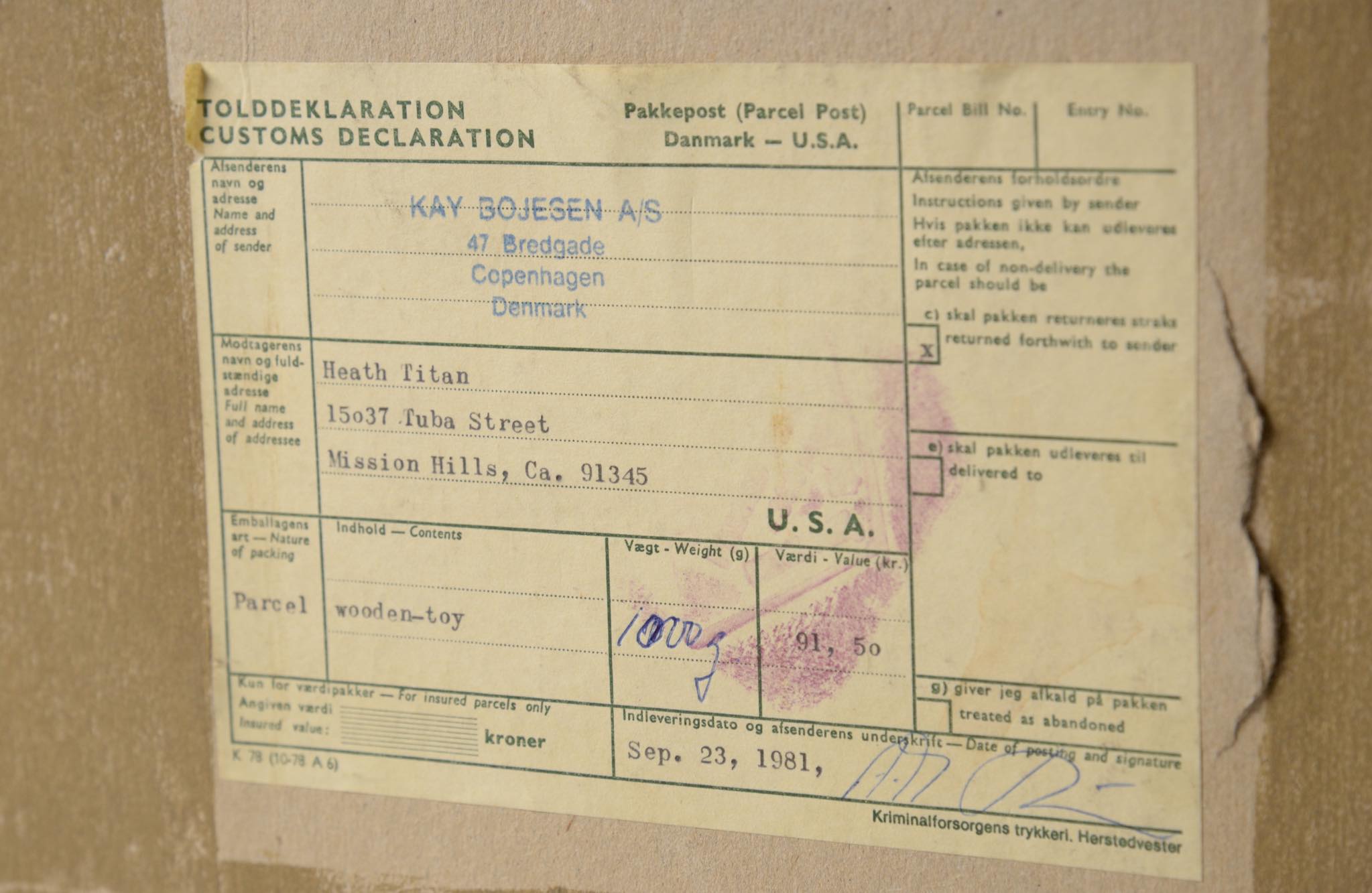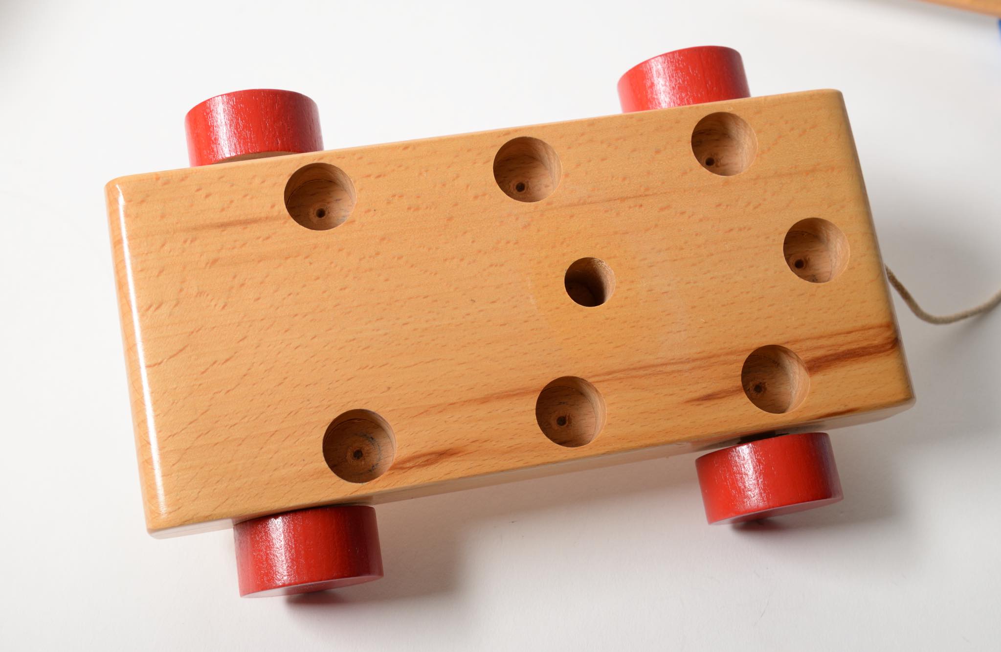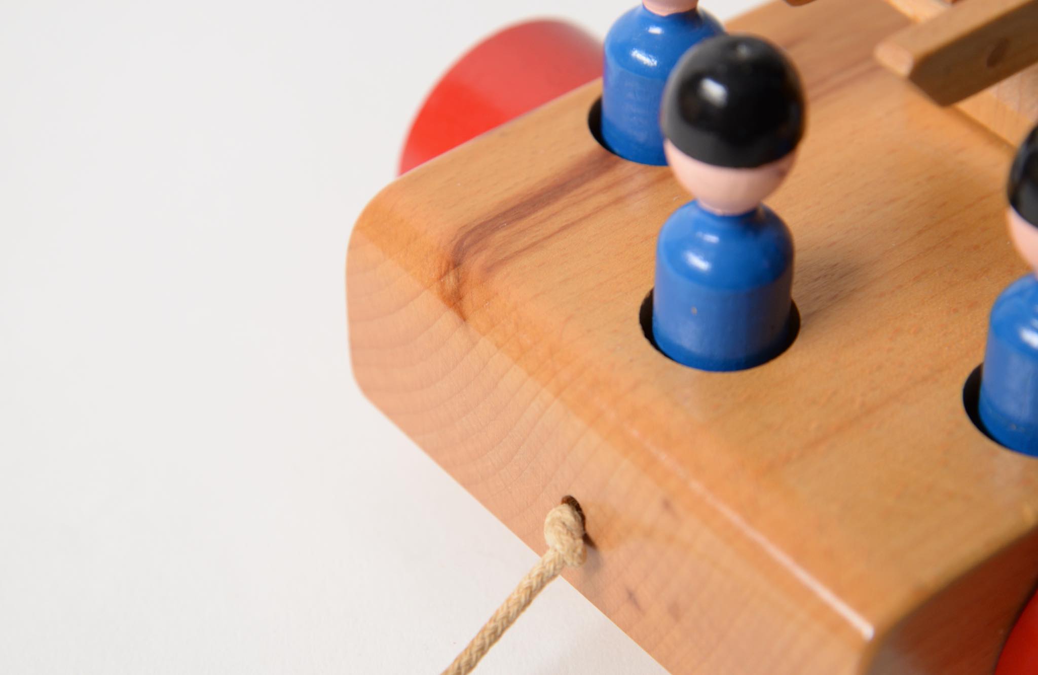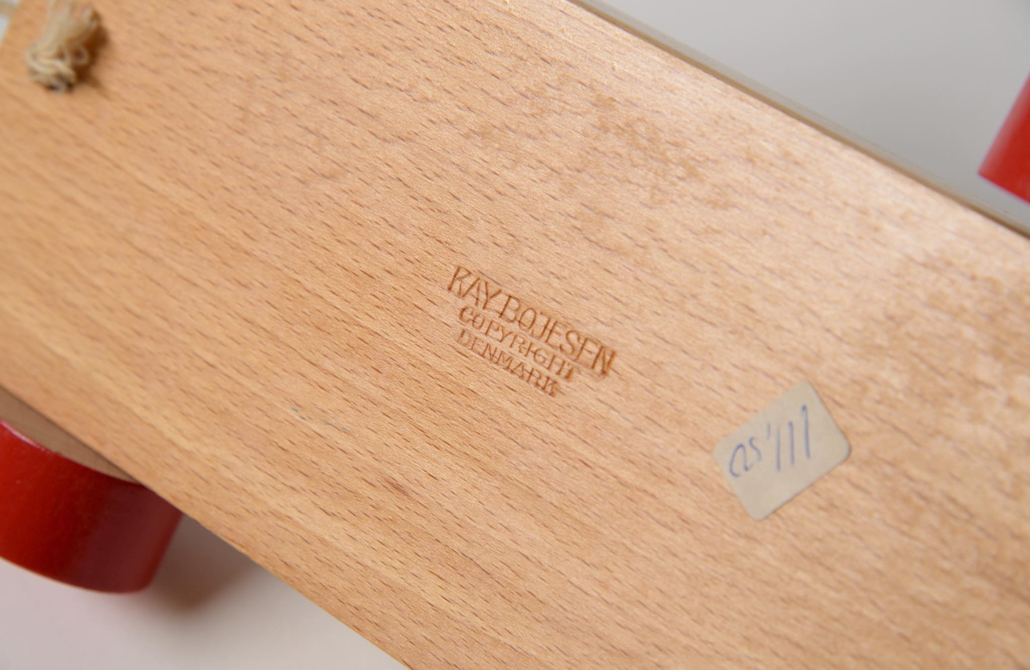 カイボイスンの木製玩具は、どれもシンプルで美しく丈夫である。この消防車もこれ以上シンプルにすることができない程のデザインである。原色の配色は画家のスヴェン・ヨハンセンによるもの。乗っている消防士にも注目してほしい。手も足もなく黒いヘルメットと青い制服のみであるが、とてもユーモラスに表現されていて可愛らしい。これも一つ一つ手描きで着色されている。ハシゴに登らせることもできるため、飾る時に様々なパターンで楽しむことができる。また今回紹介するものは、デッドストックと思われ、更に貴重な箱もある。コレクターなら箱だけでも手に入れたいものだ。カイ・ボイスンは1922年から木製玩具の製作を始めたが、最初はどれも息子のオットーのために作り始めた。この消防車もそうであったに違いない。