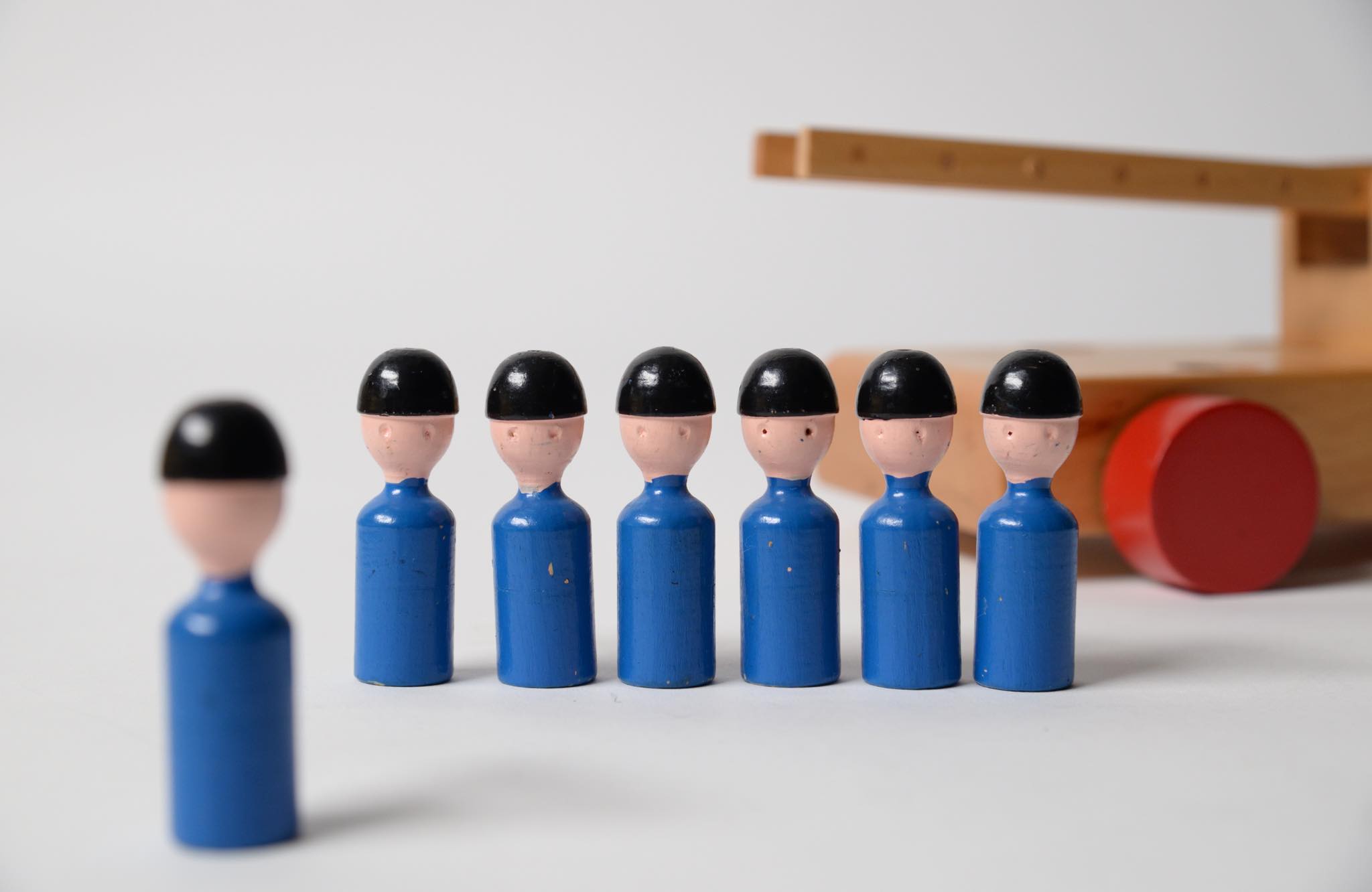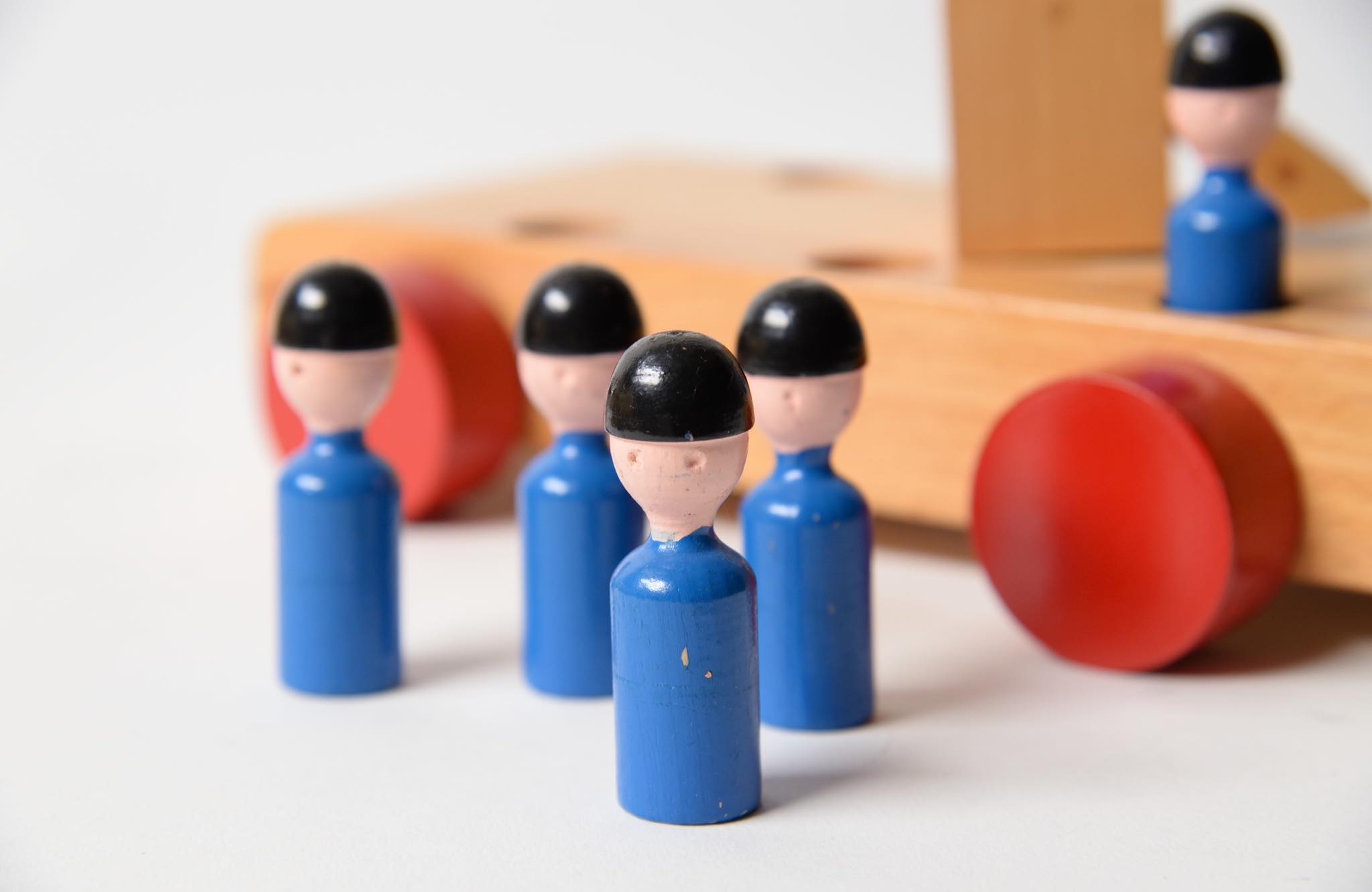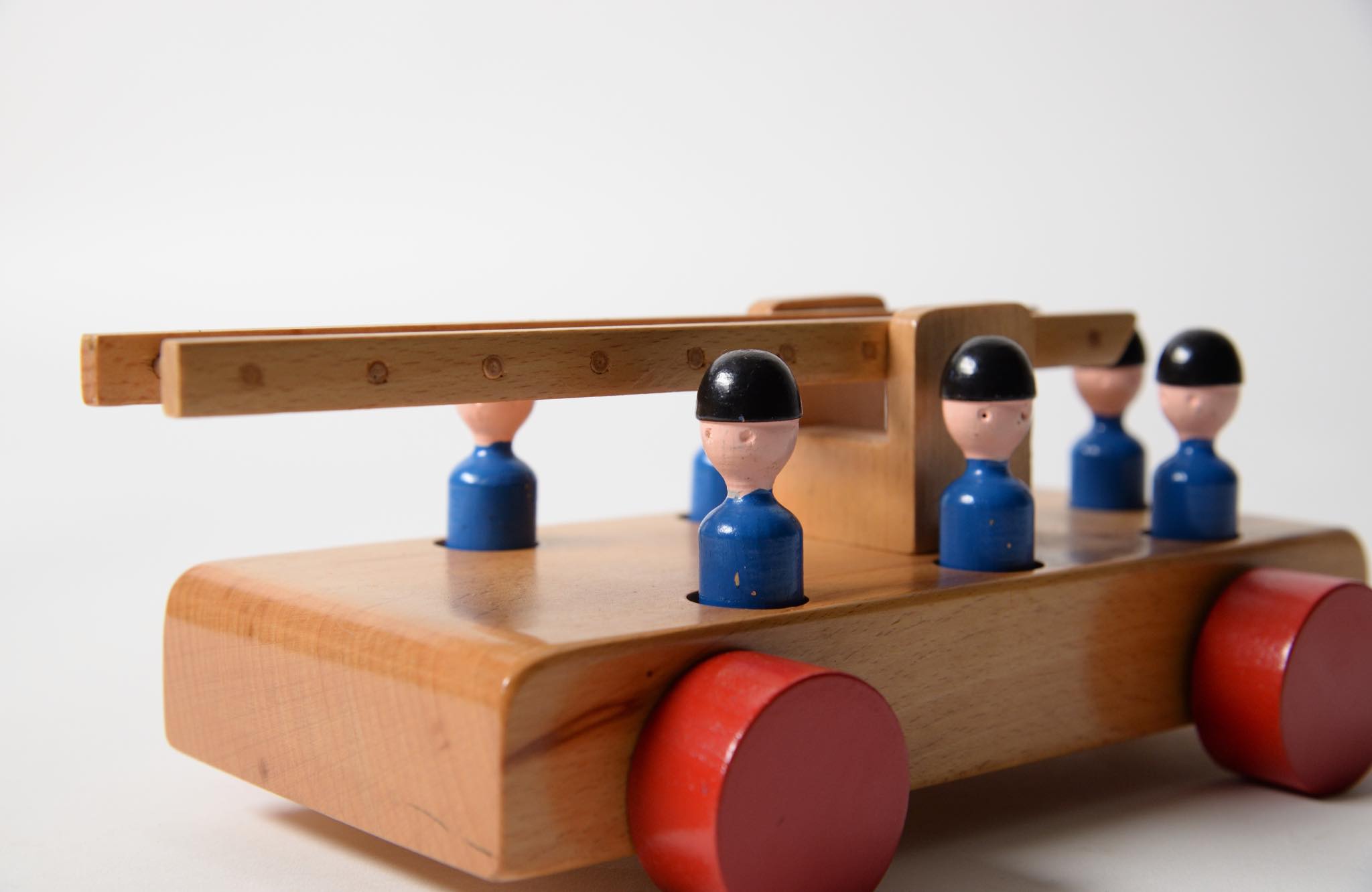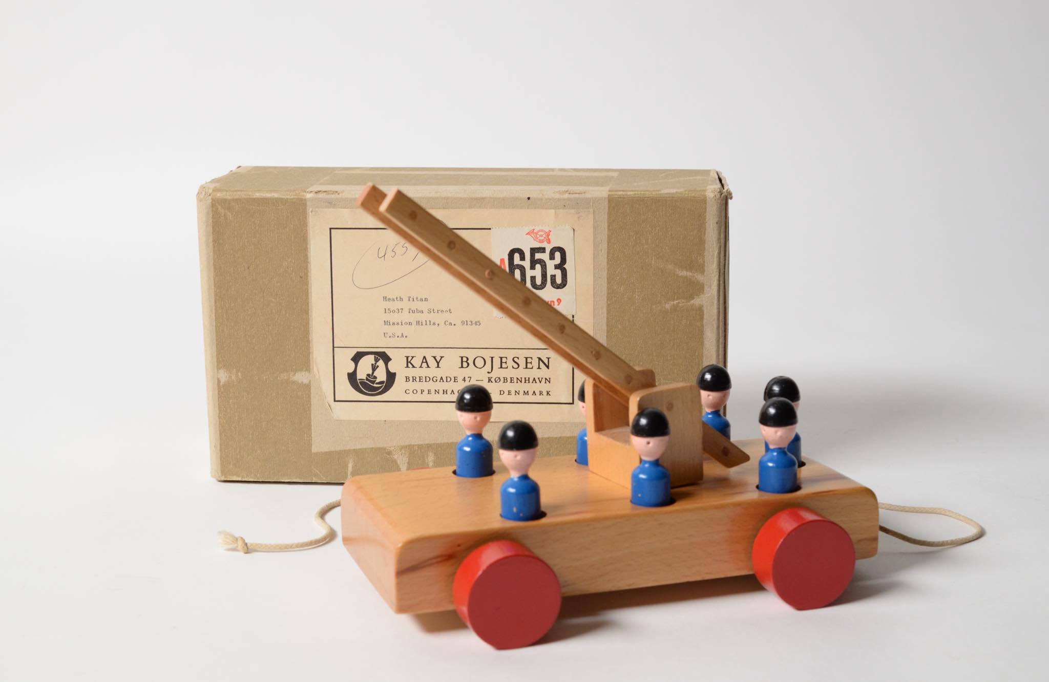 20世紀前中葉に活躍したデンマークの工芸作家、Kay Bojesen/カイ・ボイスンによる消防車です。7人の消防隊員がはしご車で火災現場へ駆けつけ、上階の火を無事に消し止め、整列して点呼を取る体験が卓上で行えます。子供が遊ばなかったのか、あるいはデッドストックで発見されたのかはわかりませんが、とても綺麗な状態でオリジナルの箱も付属します。
