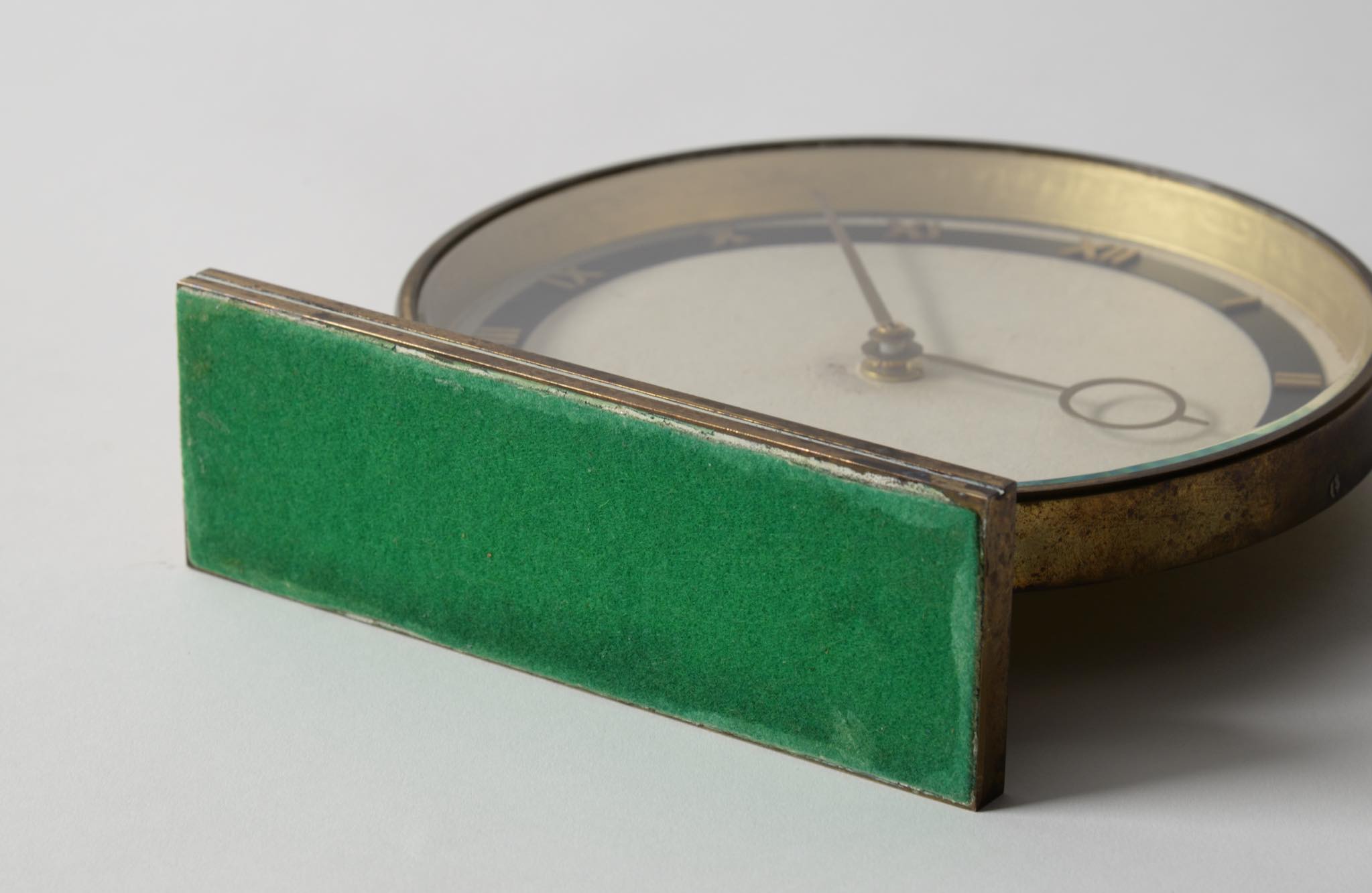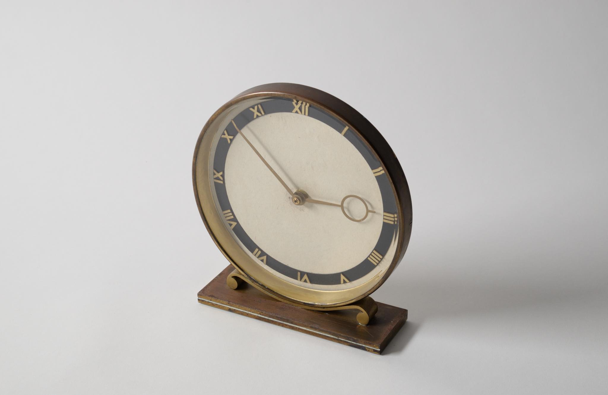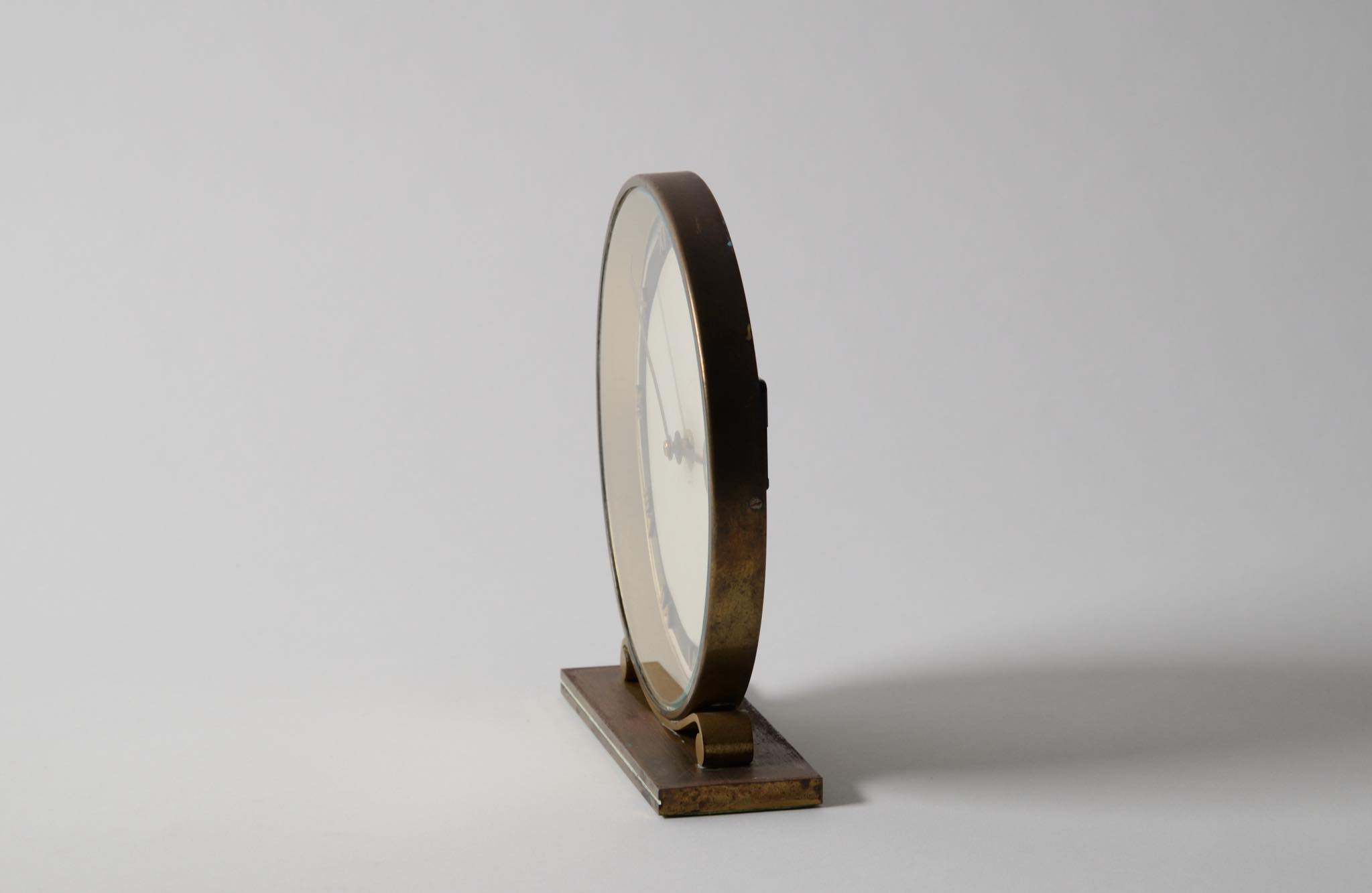 20世紀の前葉に活躍したデンマークの建築家、Kaj Gottlob/カイ・ゴットロブのデザインとされる置き時計です。資料に乏しくデザイナーの確証は得られておりませんが、短針のデザインが氏のスタイルに則っています。時計本体にも刻印等が見られず生産メーカーについても判っておりませんが、1930〜40年代頃の製作品と考えられます。本体は真鍮製、文字盤のガラスは厚みがあり、重厚な趣です。ムーブメントは電池式クオーツに交換されており、正確に時を刻んでいます。