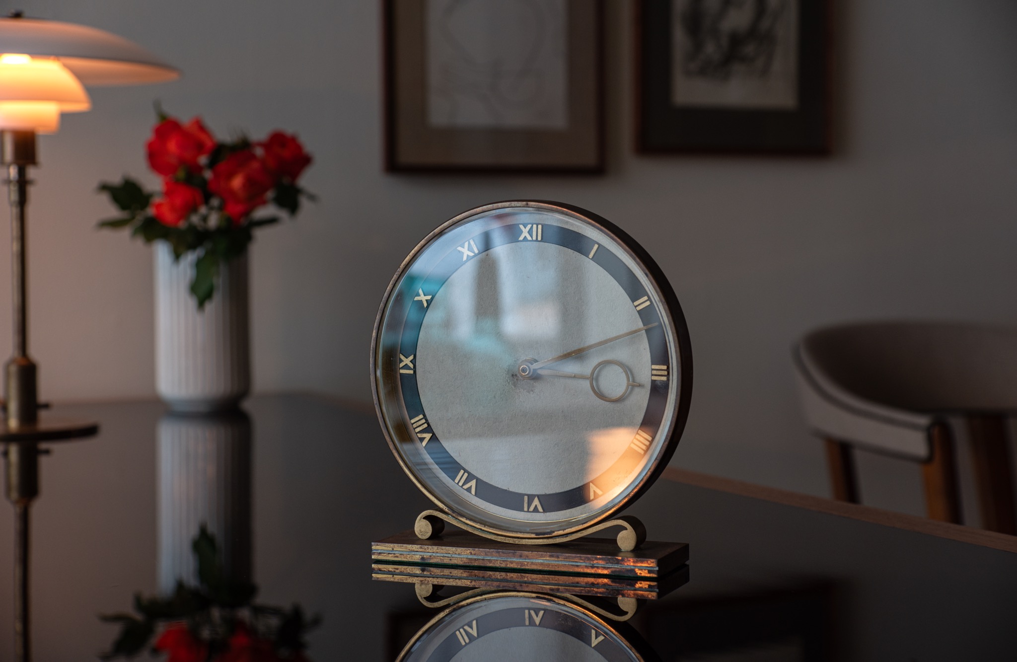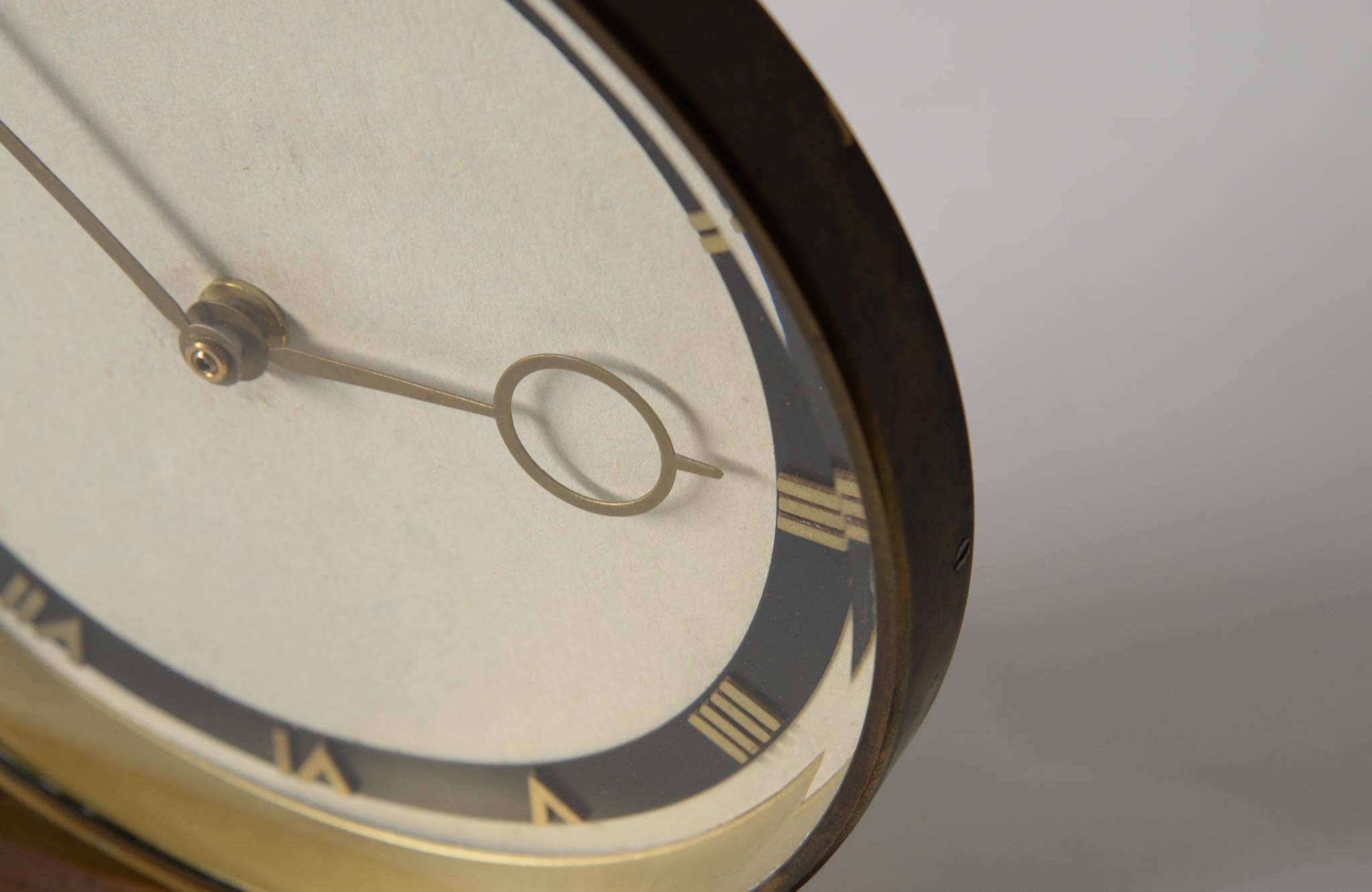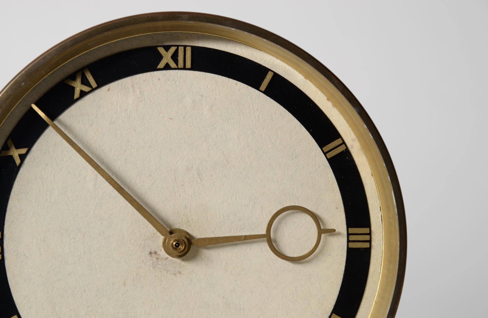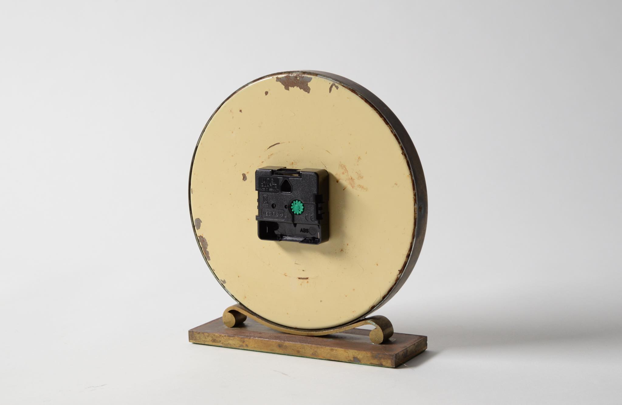 20世紀の前葉に活躍したデンマークの建築家、Kaj Gottlob/カイ・ゴットロブのデザインとされる置き時計です。資料に乏しくデザイナーの確証は得られておりませんが、短針のデザインが氏のスタイルに則っています。時計本体にも刻印等が見られず生産メーカーについても判っておりませんが、1930〜40年代頃の製作品と考えられます。本体は真鍮製、文字盤のガラスは厚みがあり、重厚な趣です。ムーブメントは電池式クオーツに交換されており、正確に時を刻んでいます。