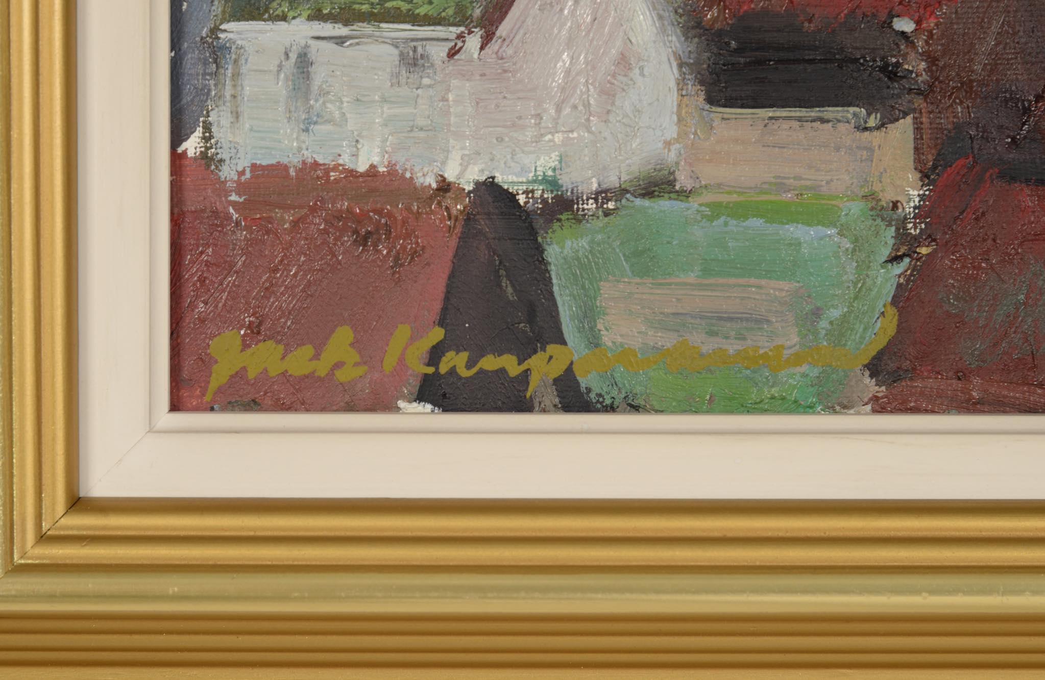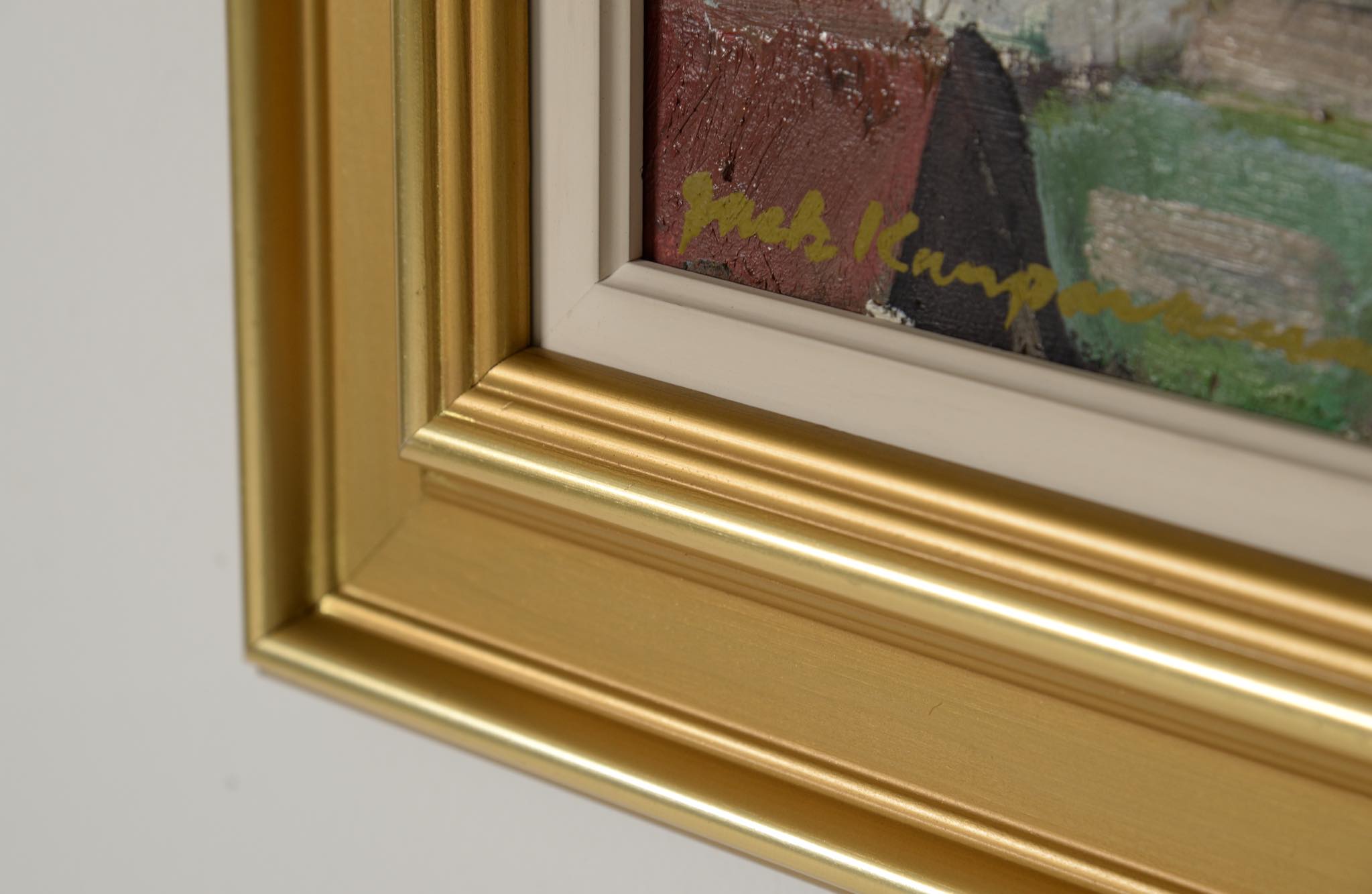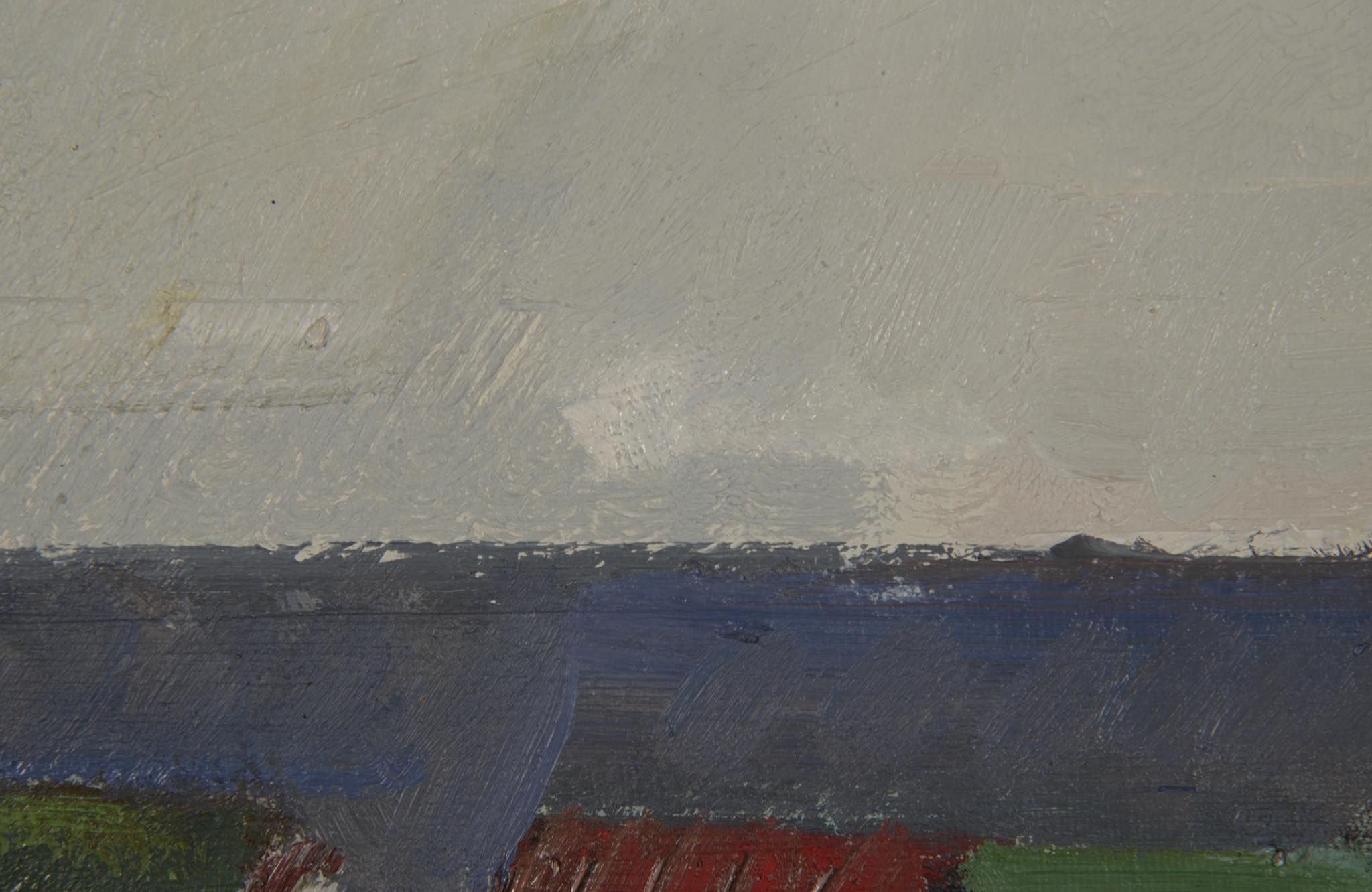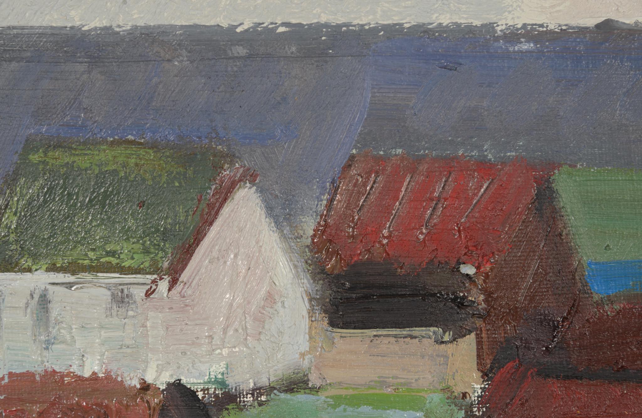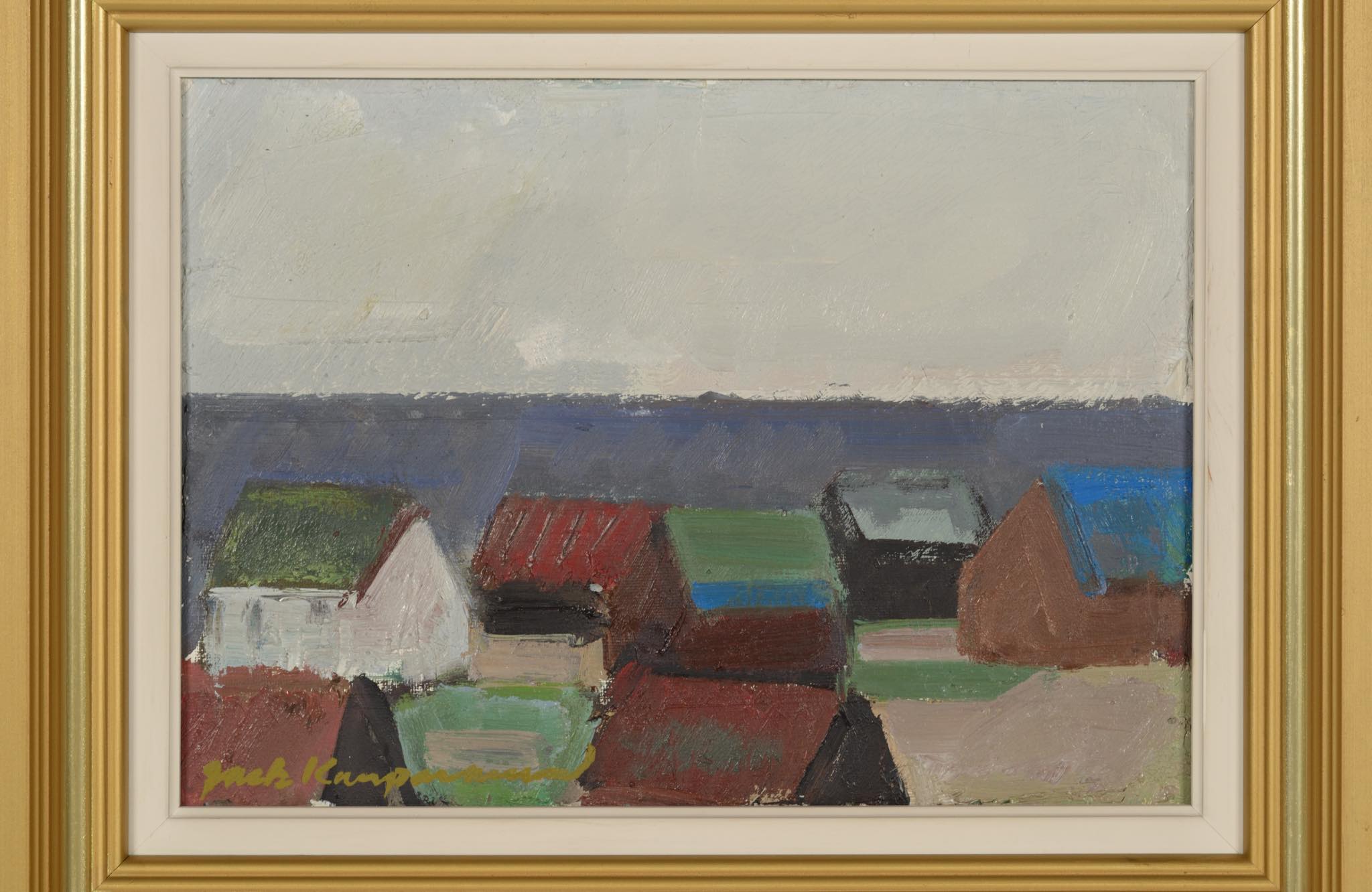 デンマーク人画家、Jack Kampmann/ジャック・カンプマンによる油彩作品です。フェロー諸島の厳しい自然環境と対峙しながら生活する島民たちの集落やその情景を独自のタッチで描いています。こちらは比較的小振りな作品で、湿気を帯びた大気感とその集落が描かれています。フレームはオリジナルで、コンディションは良好です。