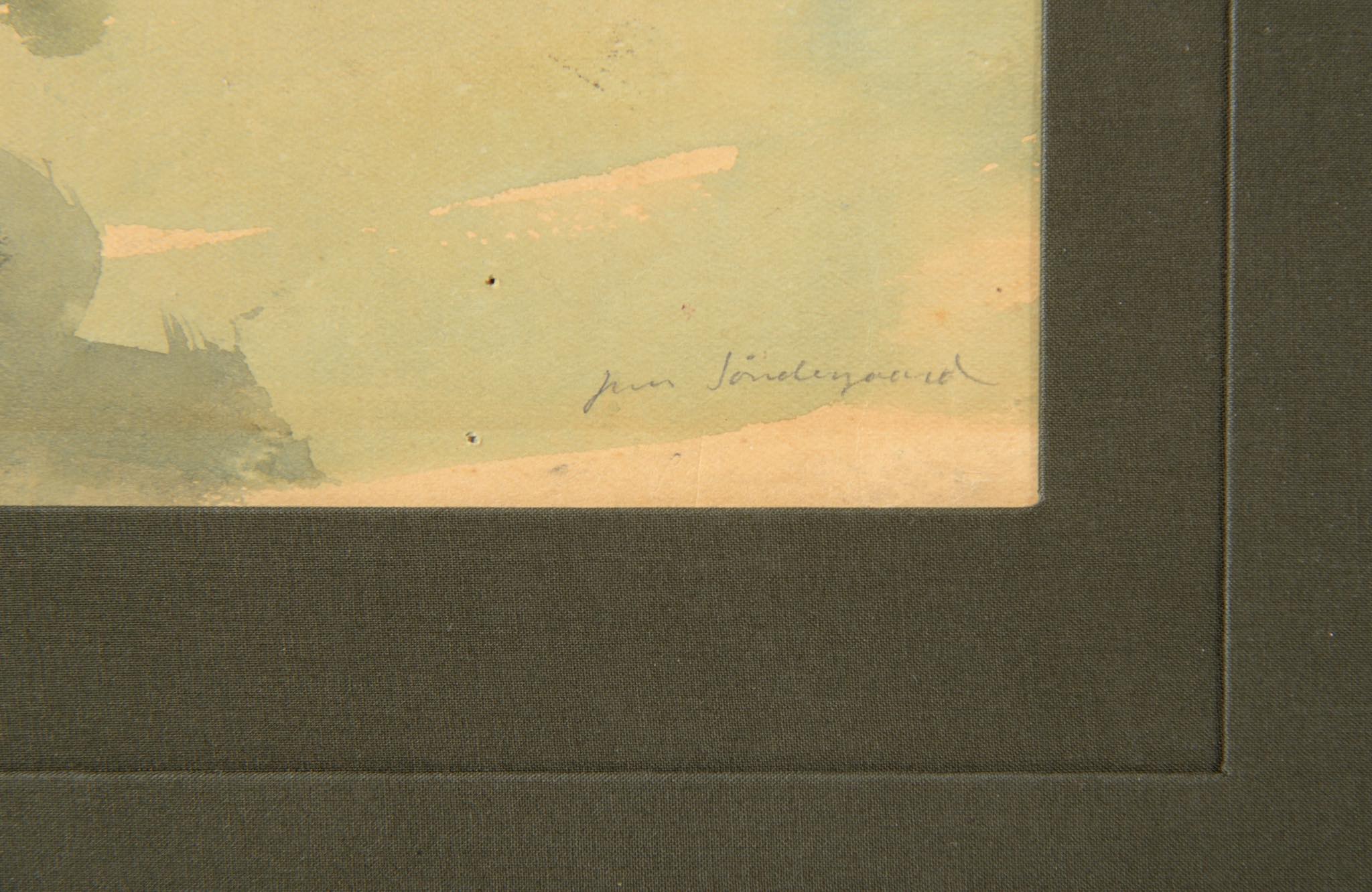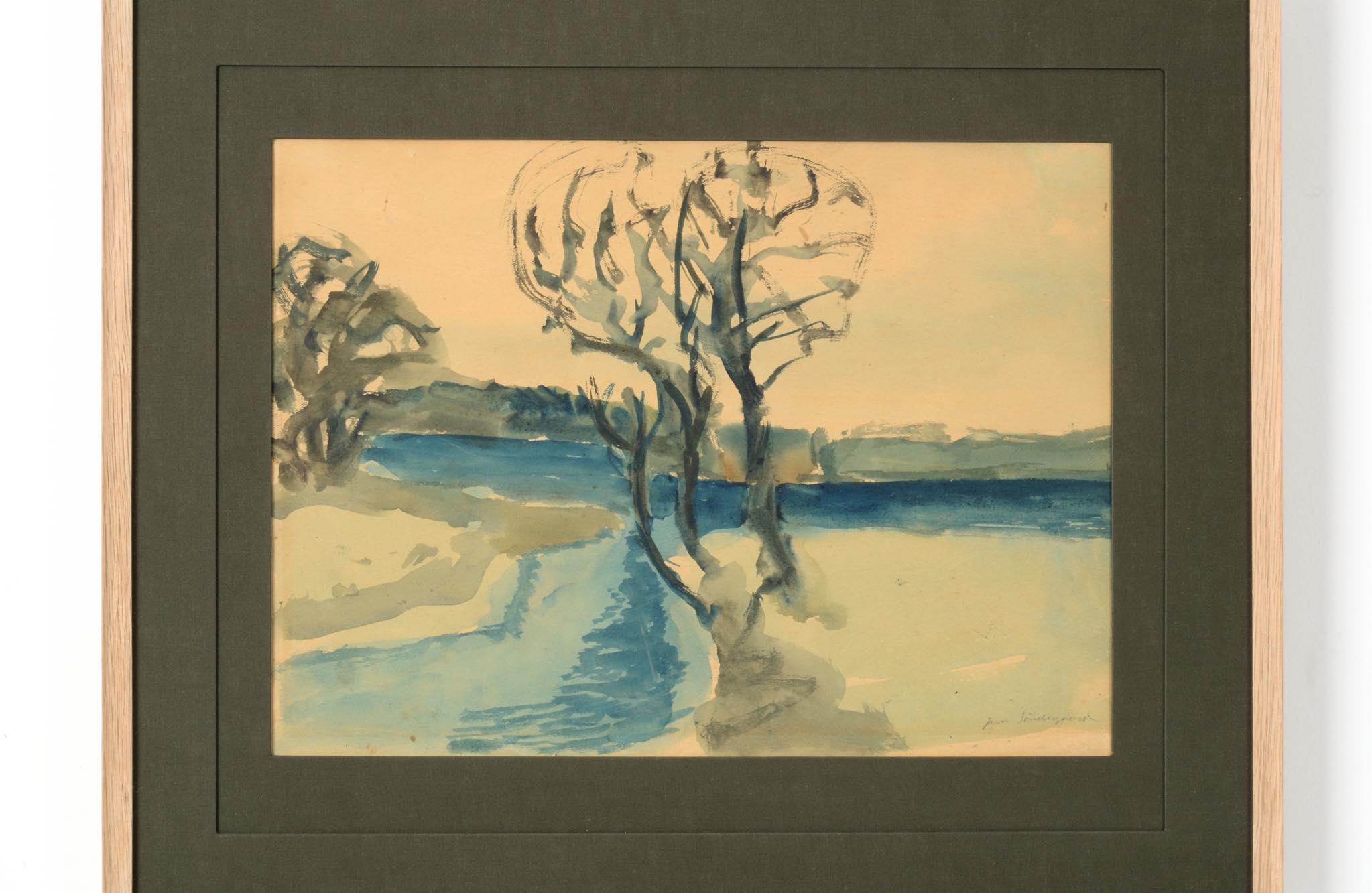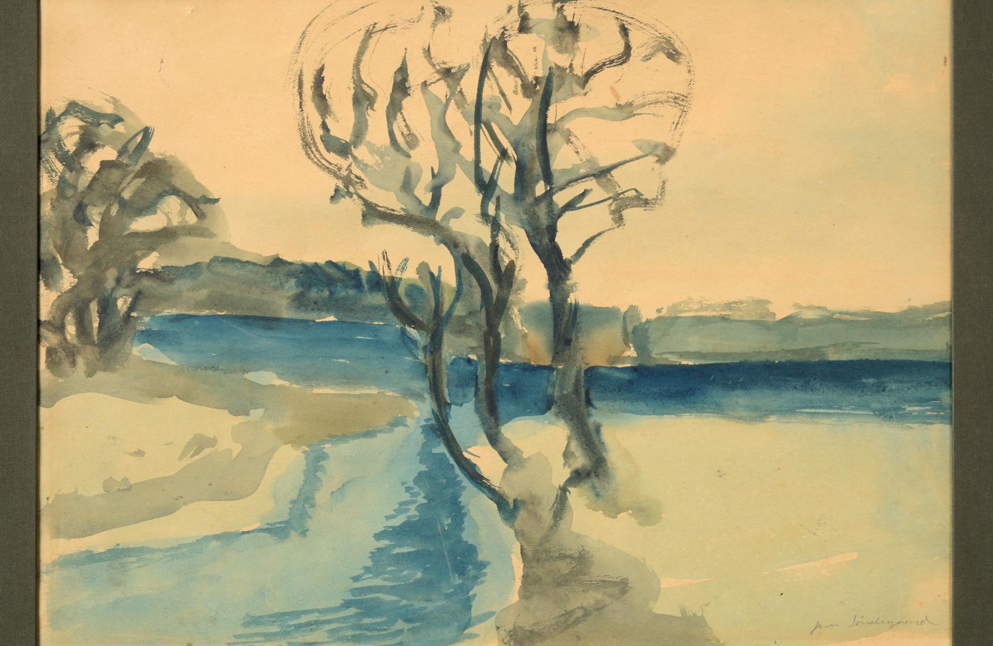 20世紀前葉のデンマークで活躍した画家、イェンス・ソンダーゴーの水彩画作品です。水路と川の交わる湿地帯が独自の表現で描かれています。フレームとマットは新たに設えました。ソンダーゴーは、絵筆の用いて自然の持つ力や海への想いを色濃く表現し、その作風はデンマーク国内および国際的な称賛を獲得しています。