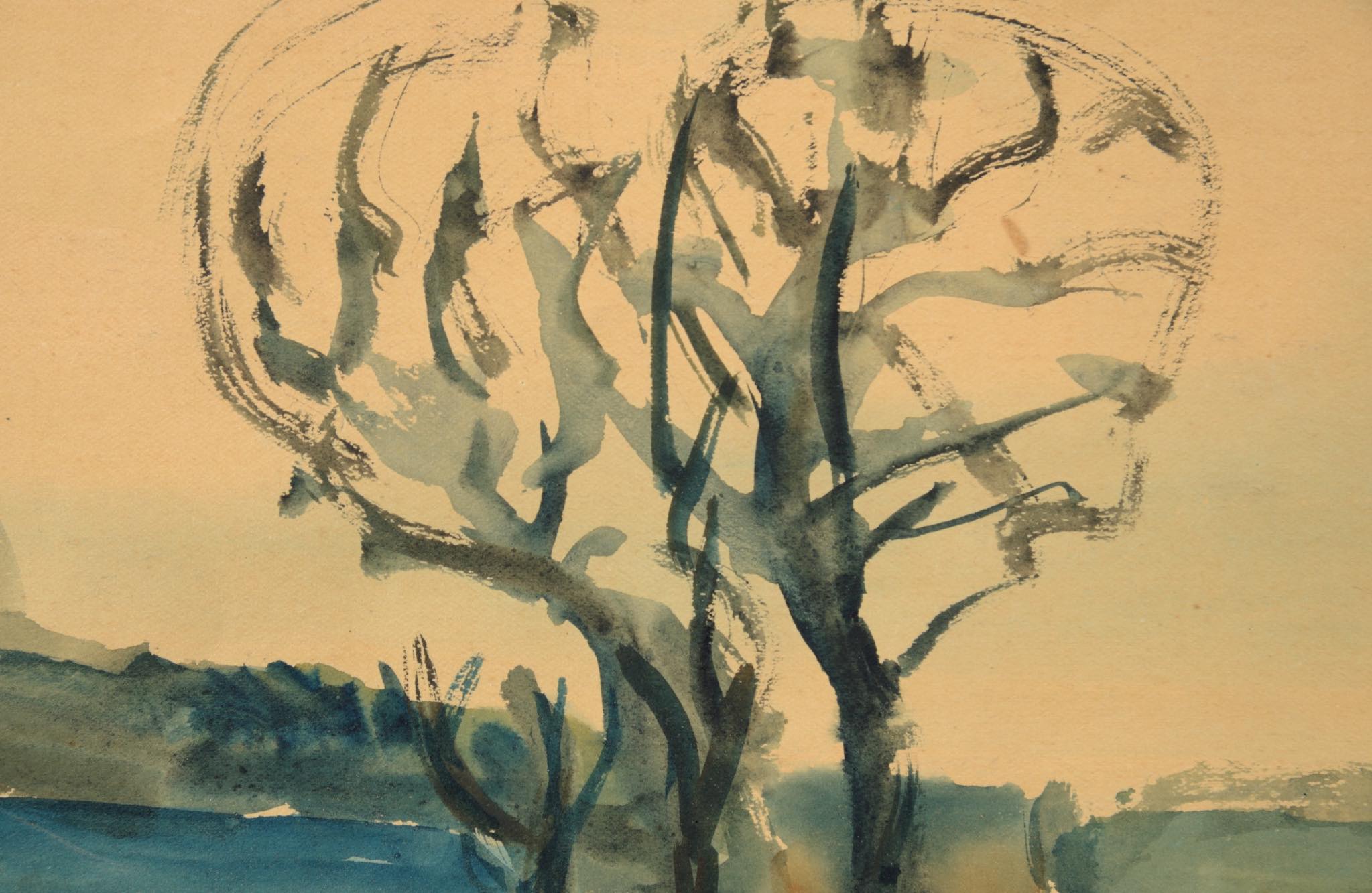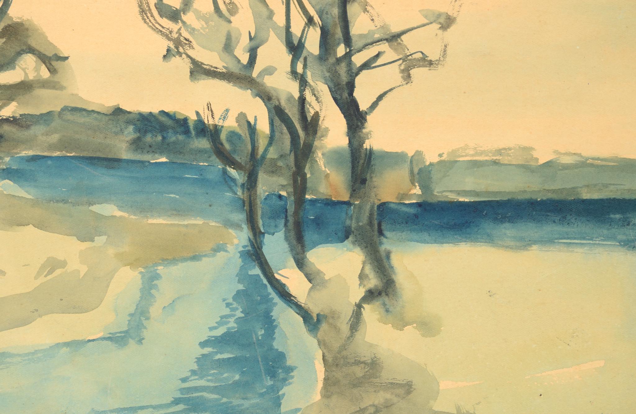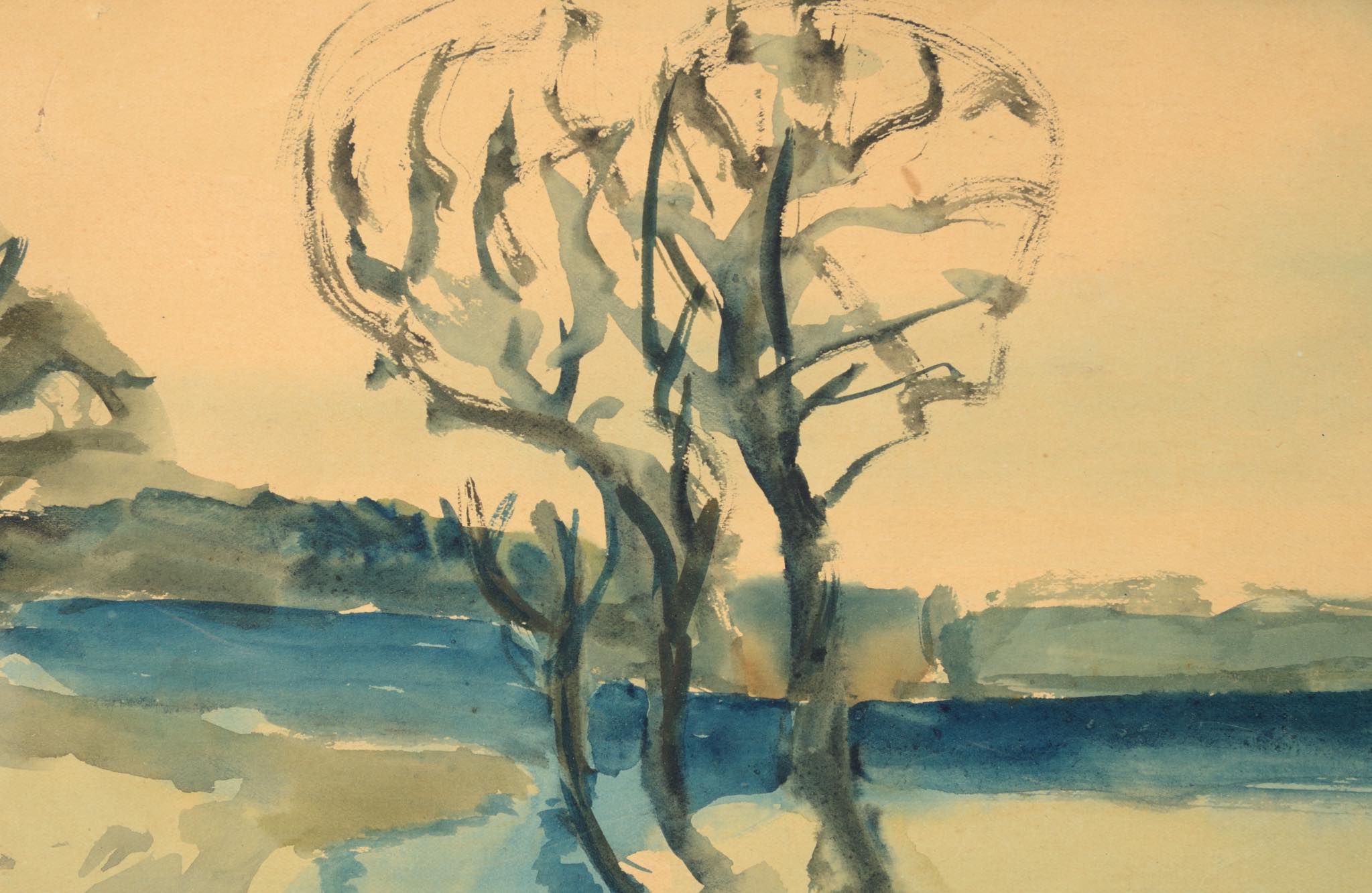 20世紀前葉のデンマークで活躍した画家、イェンス・ソンダーゴーの水彩画作品です。水路と川の交わる湿地帯が独自の表現で描かれています。フレームとマットは新たに設えました。ソンダーゴーは、絵筆の用いて自然の持つ力や海への想いを色濃く表現し、その作風はデンマーク国内および国際的な称賛を獲得しています。