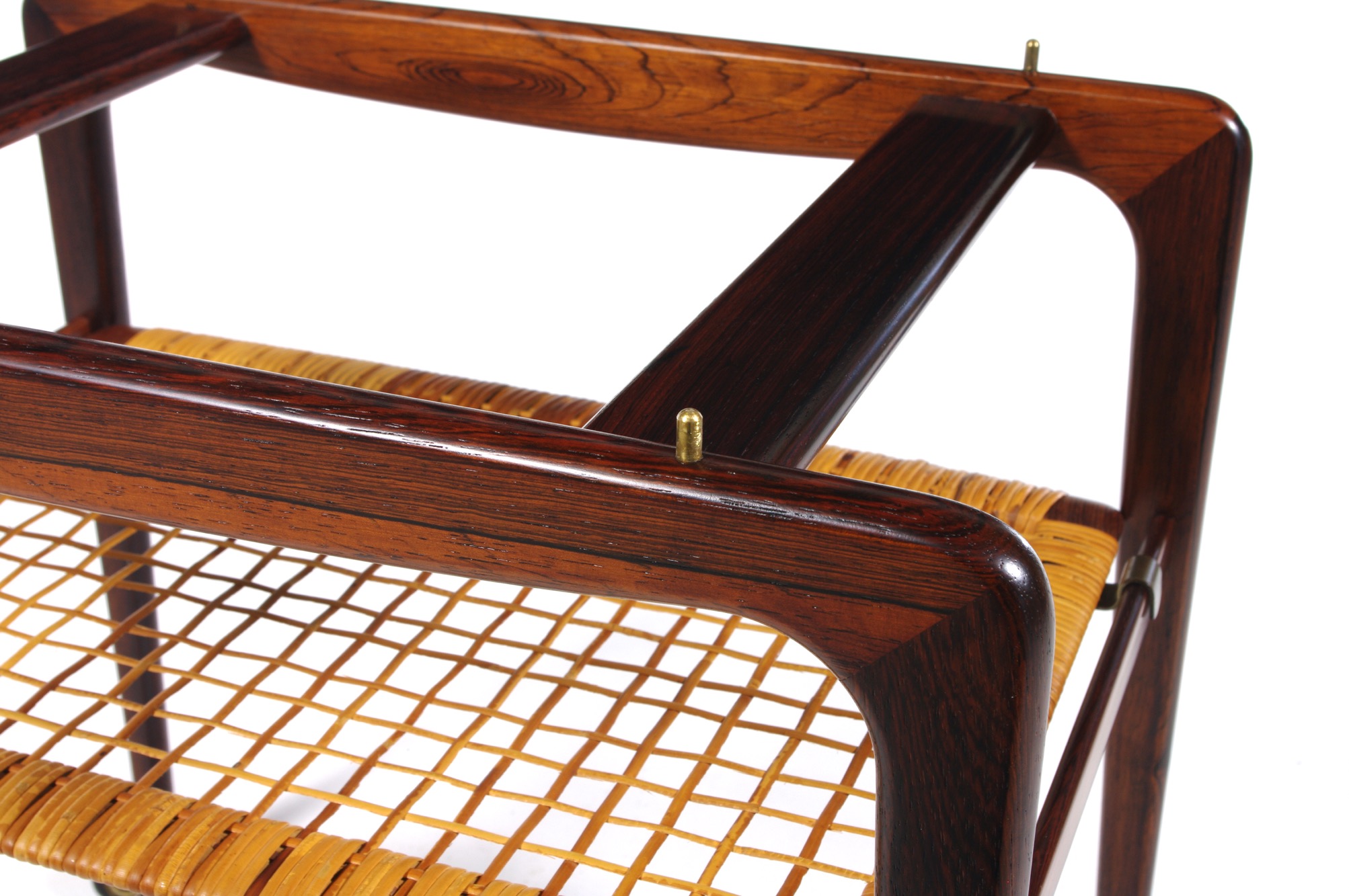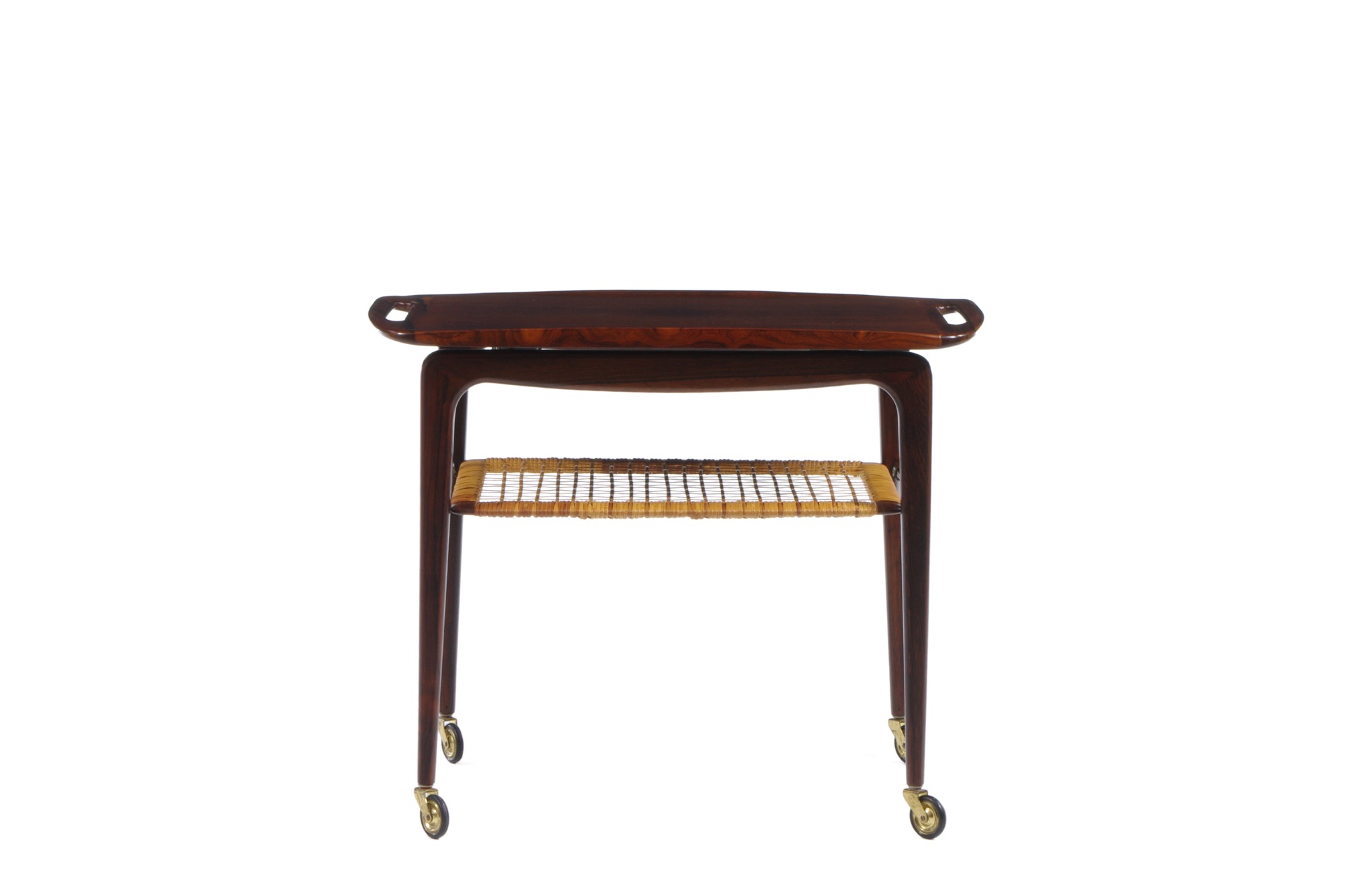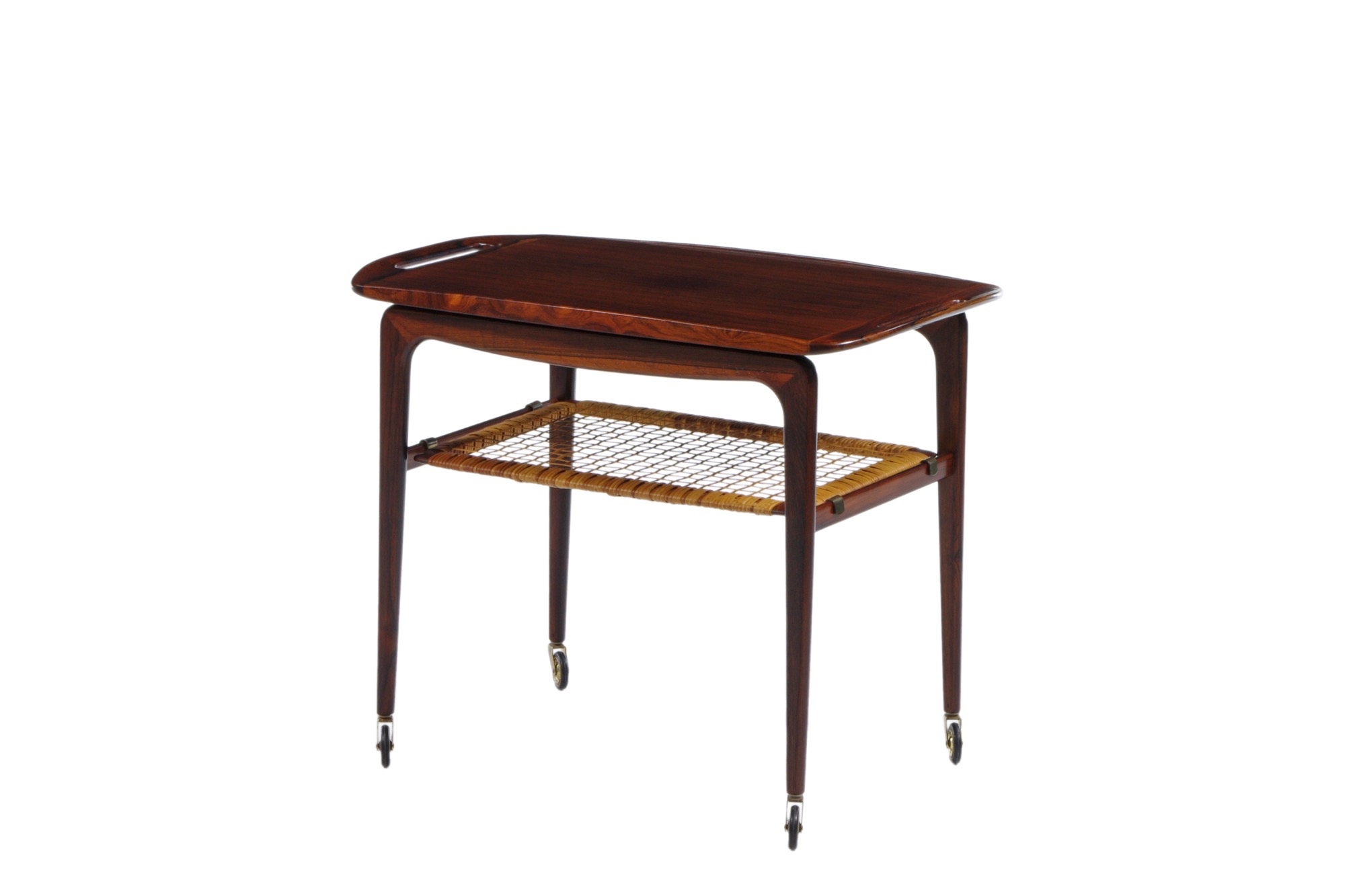 ヨハネス・アナセンによるトロリー、1960年代の作品です。便利な持ち運びができるトレイが備わり、良質なブラジリアンローズウッドで作られています。天板の筆返しや籐編みの棚など、工芸的な趣を楽しめる作品です。