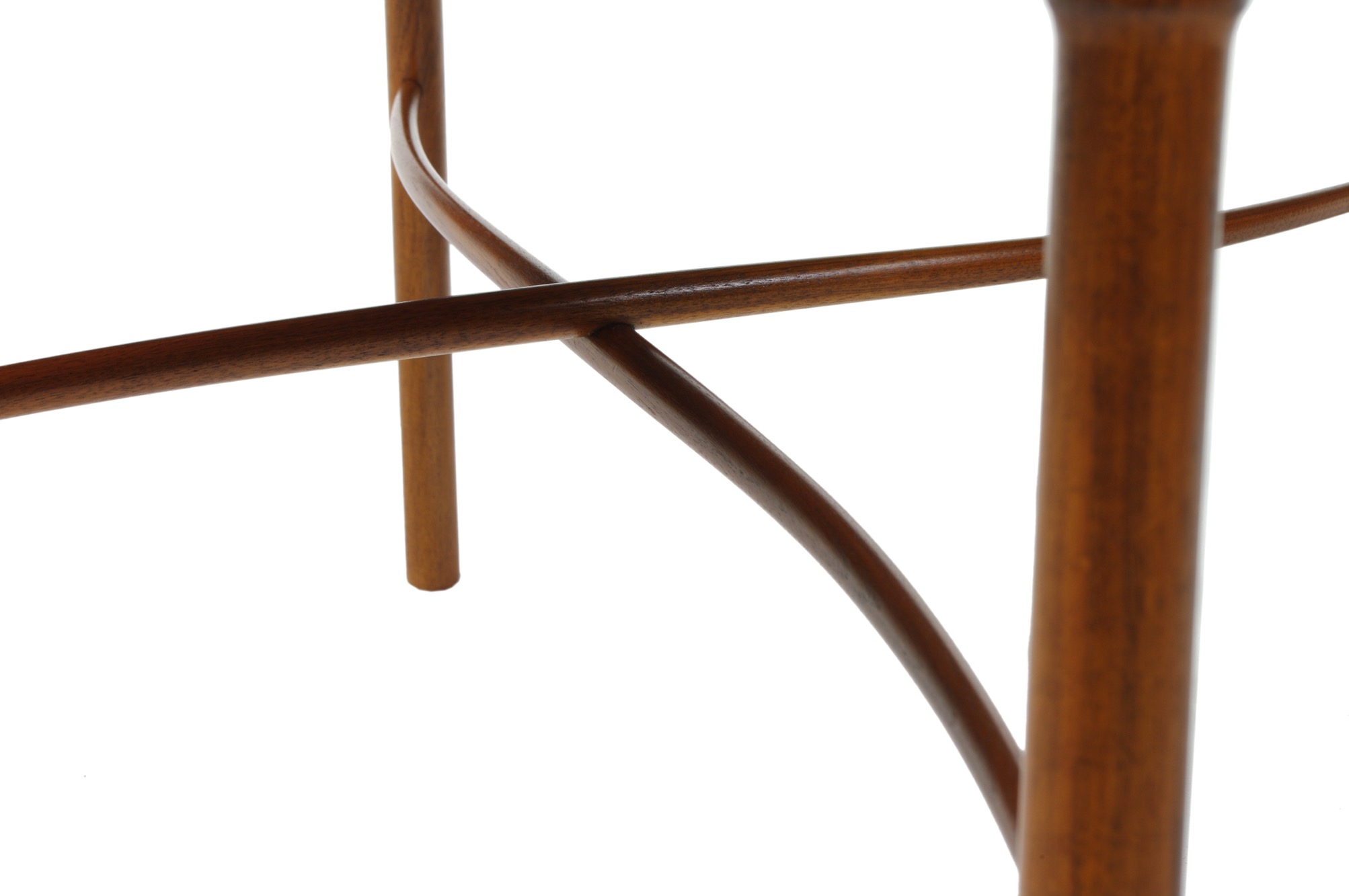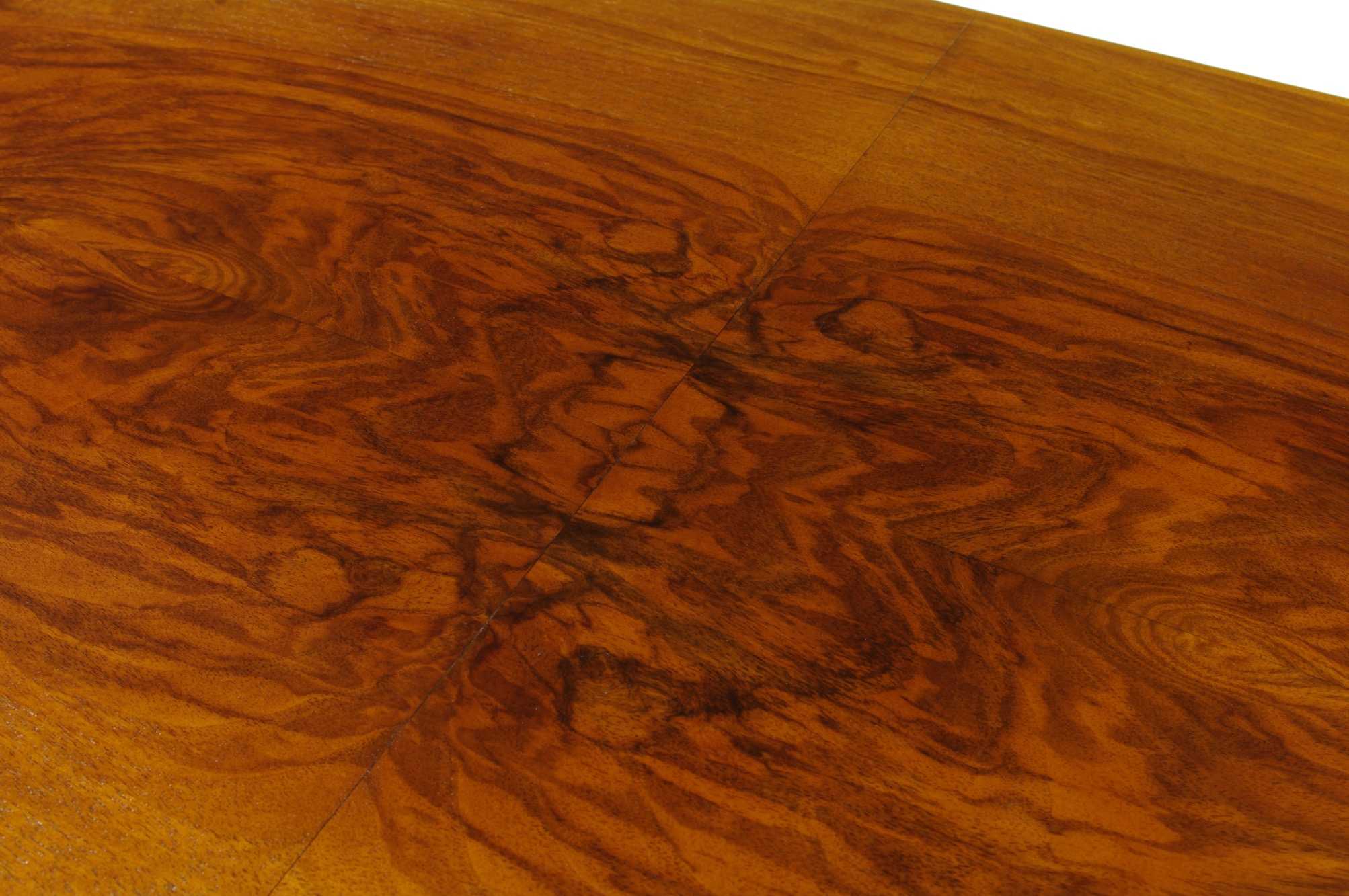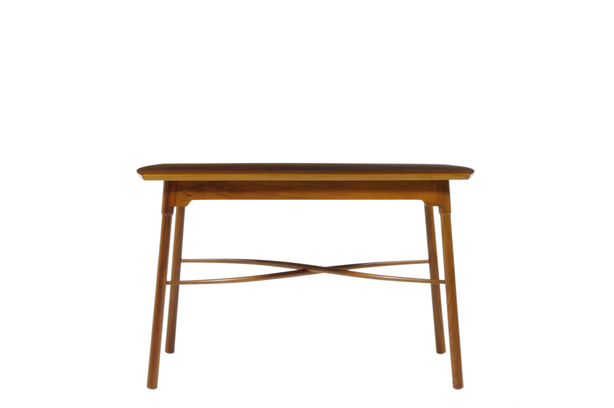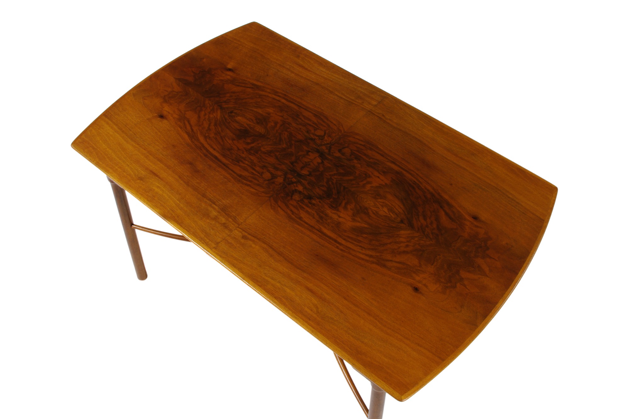 オーレ・ヴァンシャーによるデザイン、フリッツ・ハンセン社製作の1940年代の作品で、細くS字を描いた貫の美しいテーブルです。材はコーカサス地方原産のウォルナットでしょう。ブックマッチに張られた天板が古き良き時代の面影を遺します。