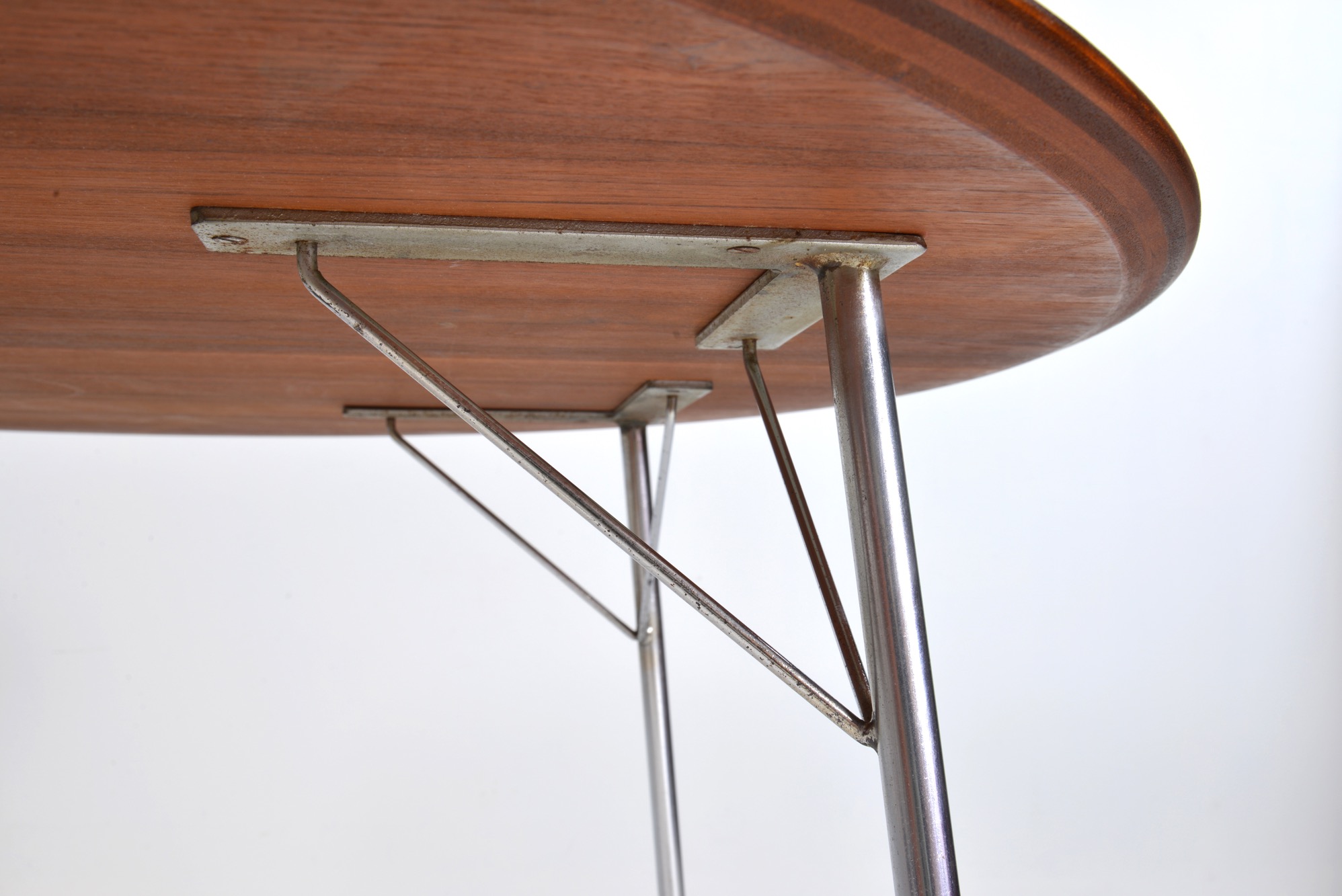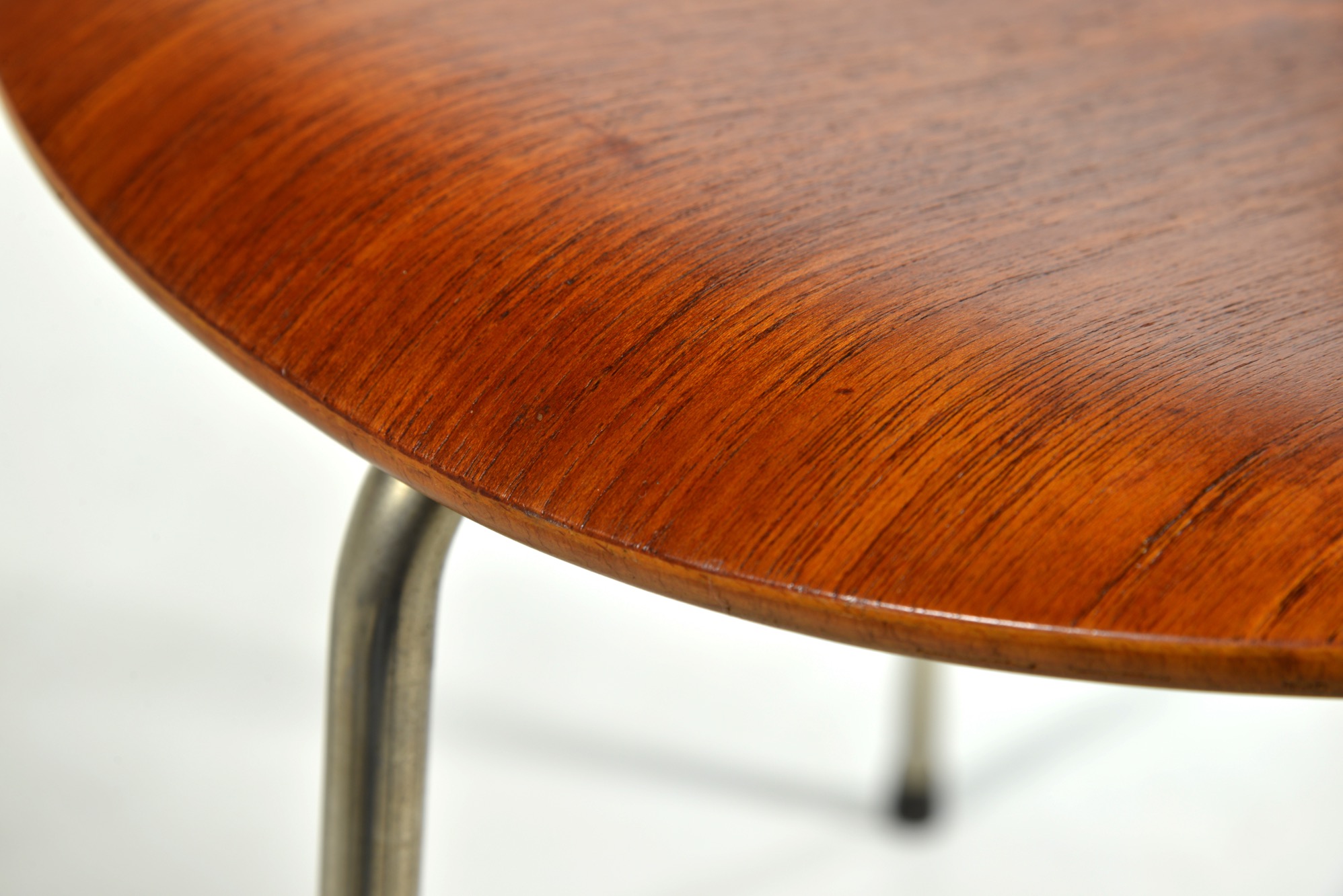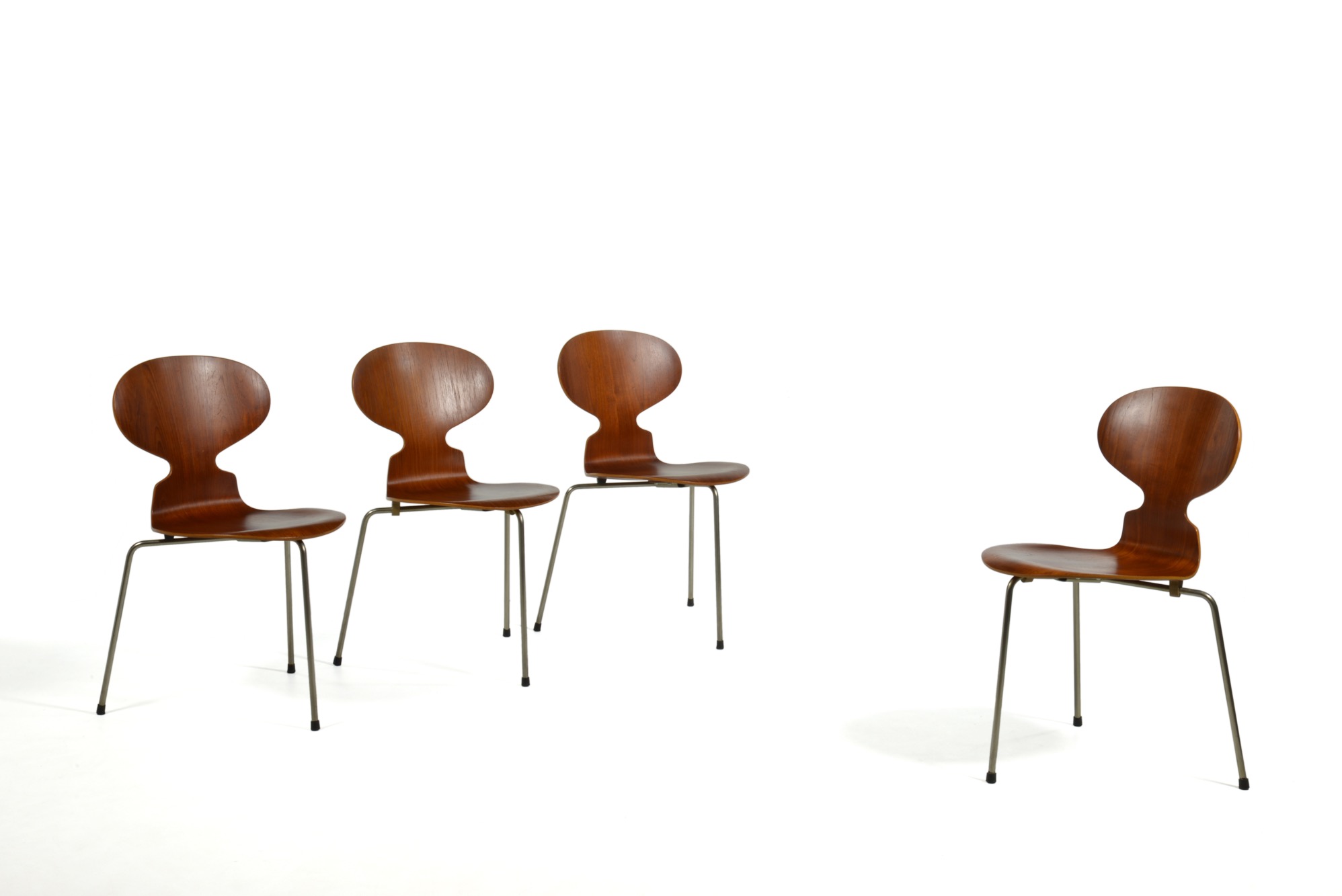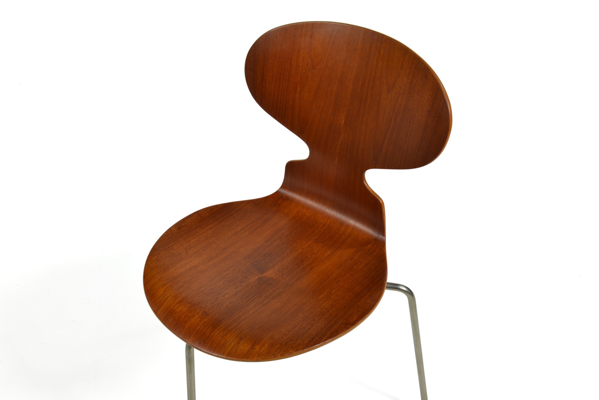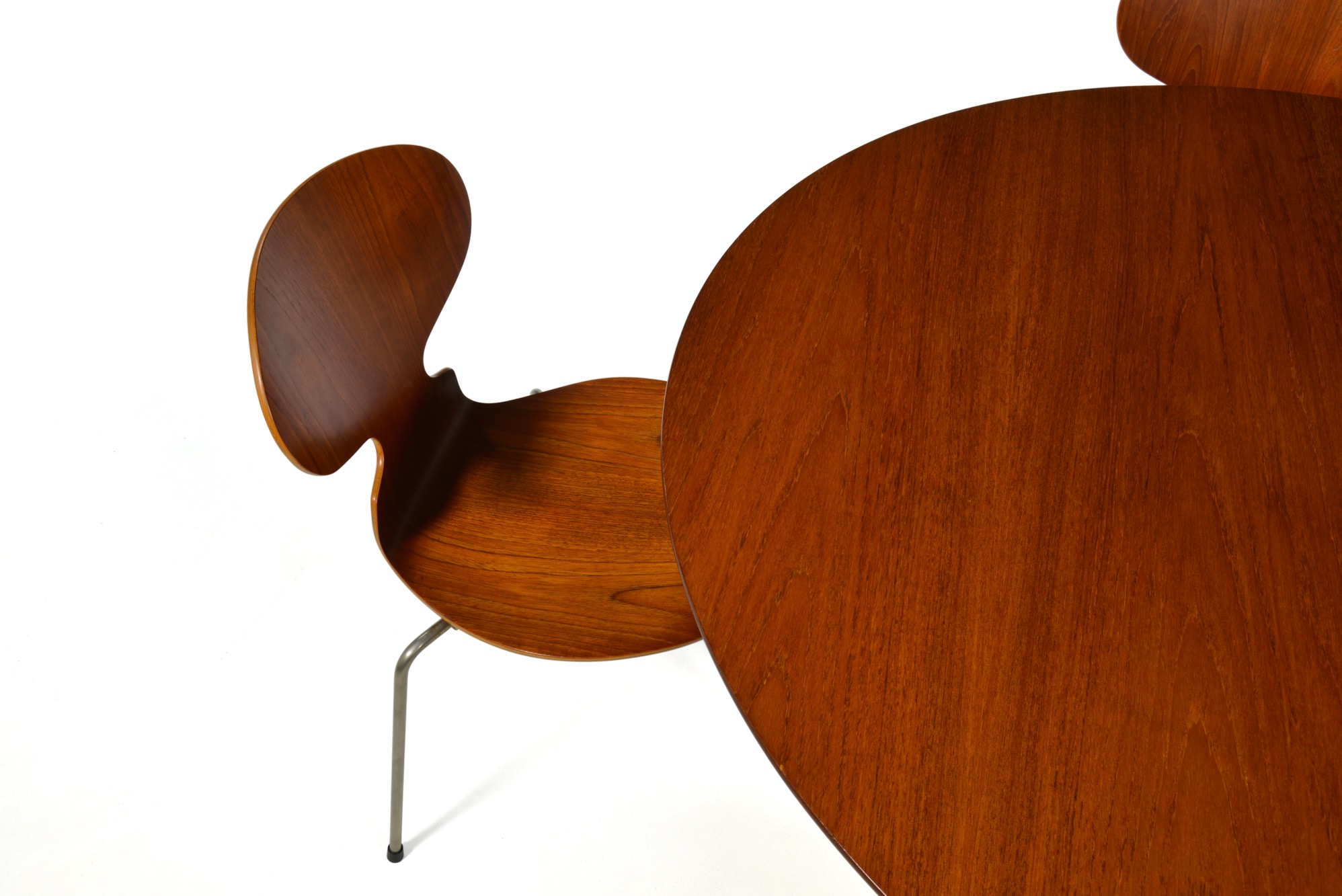 デンマークを代表する建築家、アルネ・ヤコブセンによってデザインされ、古い時代に作られたアントチェアとテーブルのセットです。チークのプライウッドに鉄製の脚部で構成されています。