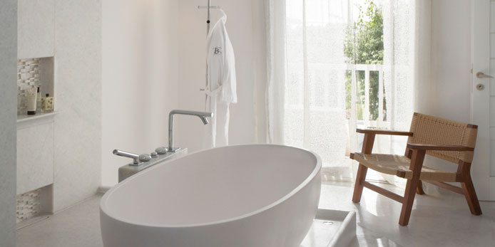 客室そしてスウィートの白を基調としたインテリアは室温を抑え、リラックスできる穏やかな環境を作り出し、建物の外と内をはっきりと仕切らないデザインにより開放感のある雰囲気を演出しています。