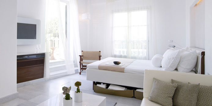 このホテルからは、白く塗られた美しいミコノスの家々や光り輝く素晴らしきエーゲ海を見渡せます。ホテルの真ん中にはサンセットを望む素晴らしいプールがあり、その周りにチョーラの家々を緻密に模した7棟の建物が点在しています。