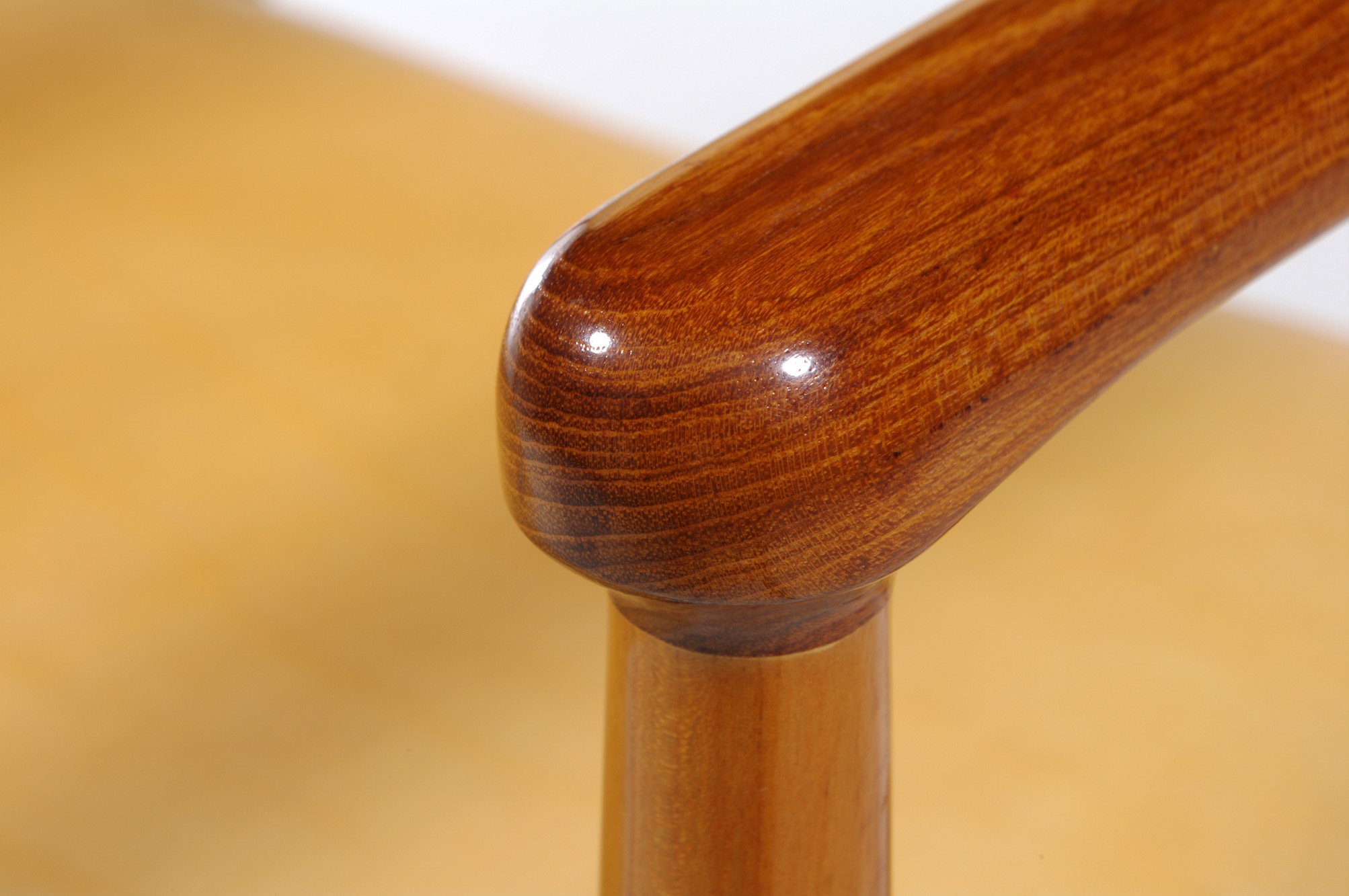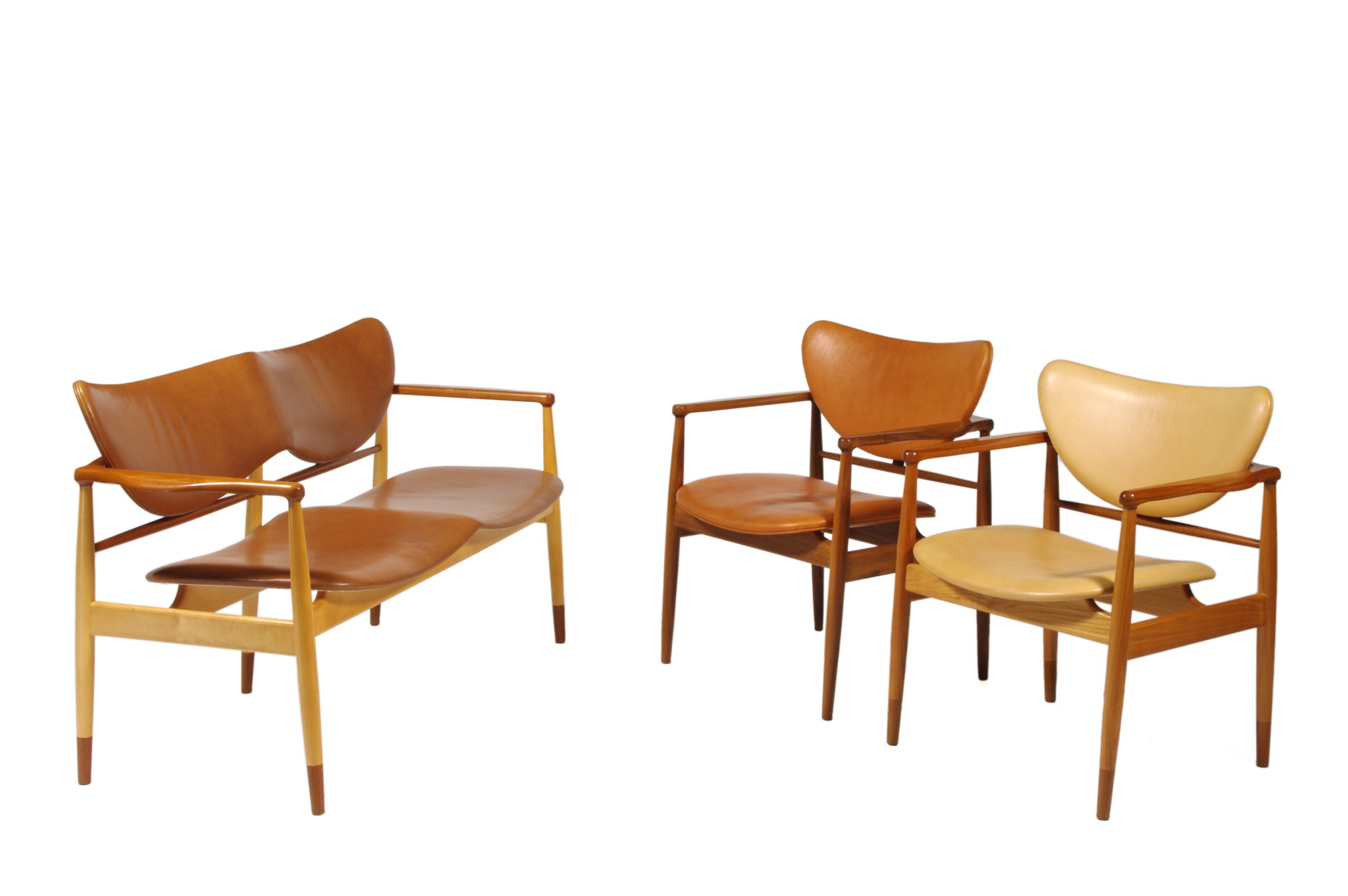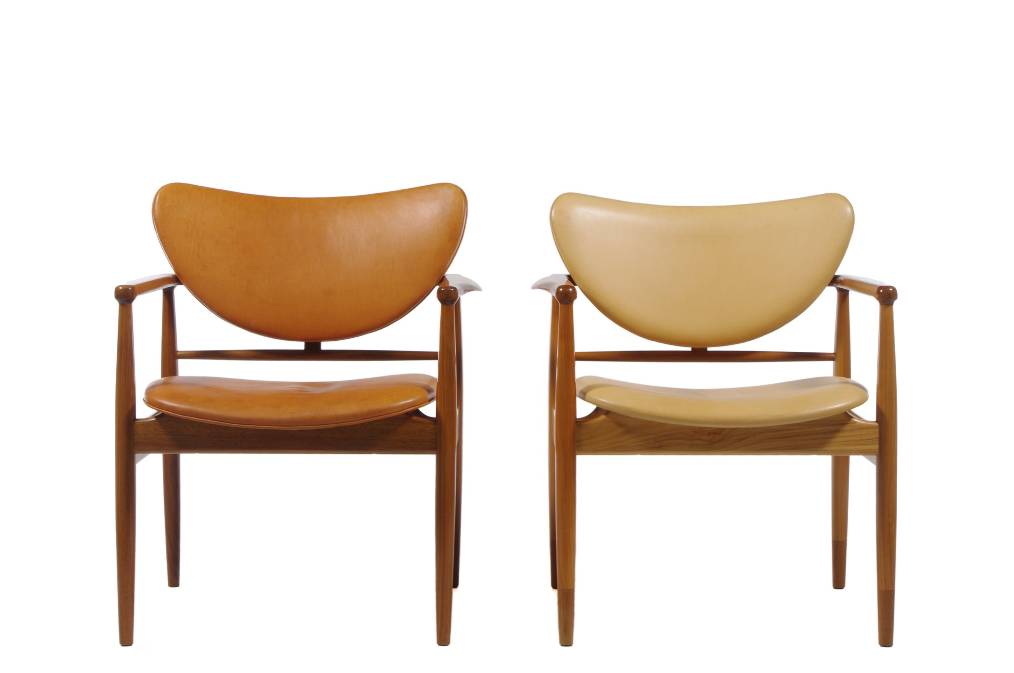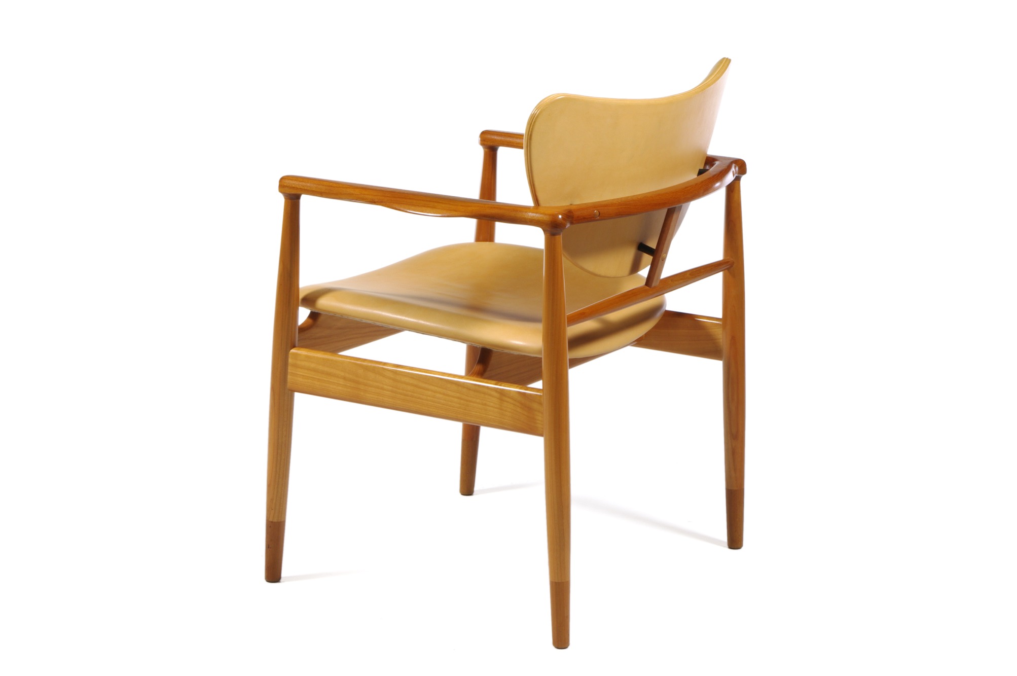フィン・ユールによる48年発表のアームチェア、ニルス・ロス・アナセン工房によるもので、フレームはチークとチェリー材のコンビネーション、ヌメ皮革が張られ、緩衝材にはウレタンが用いられています。