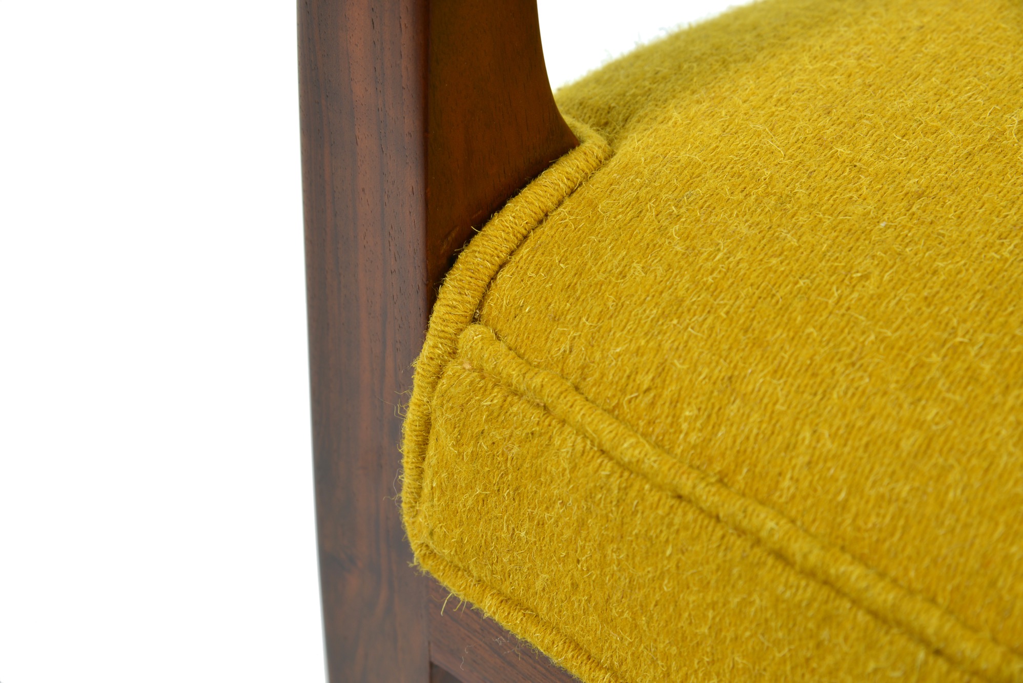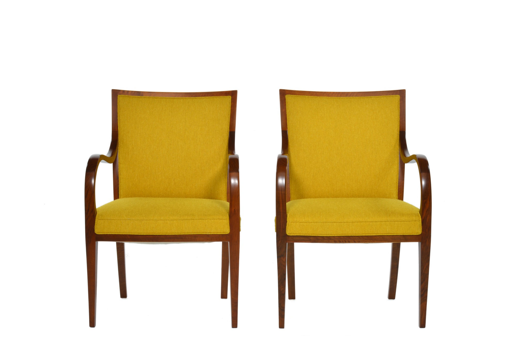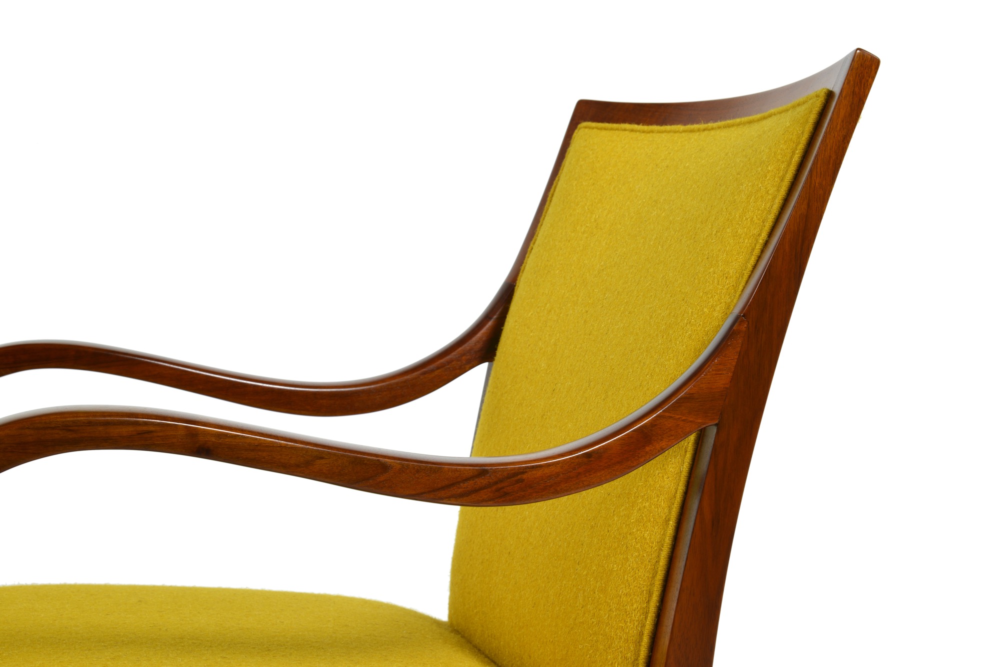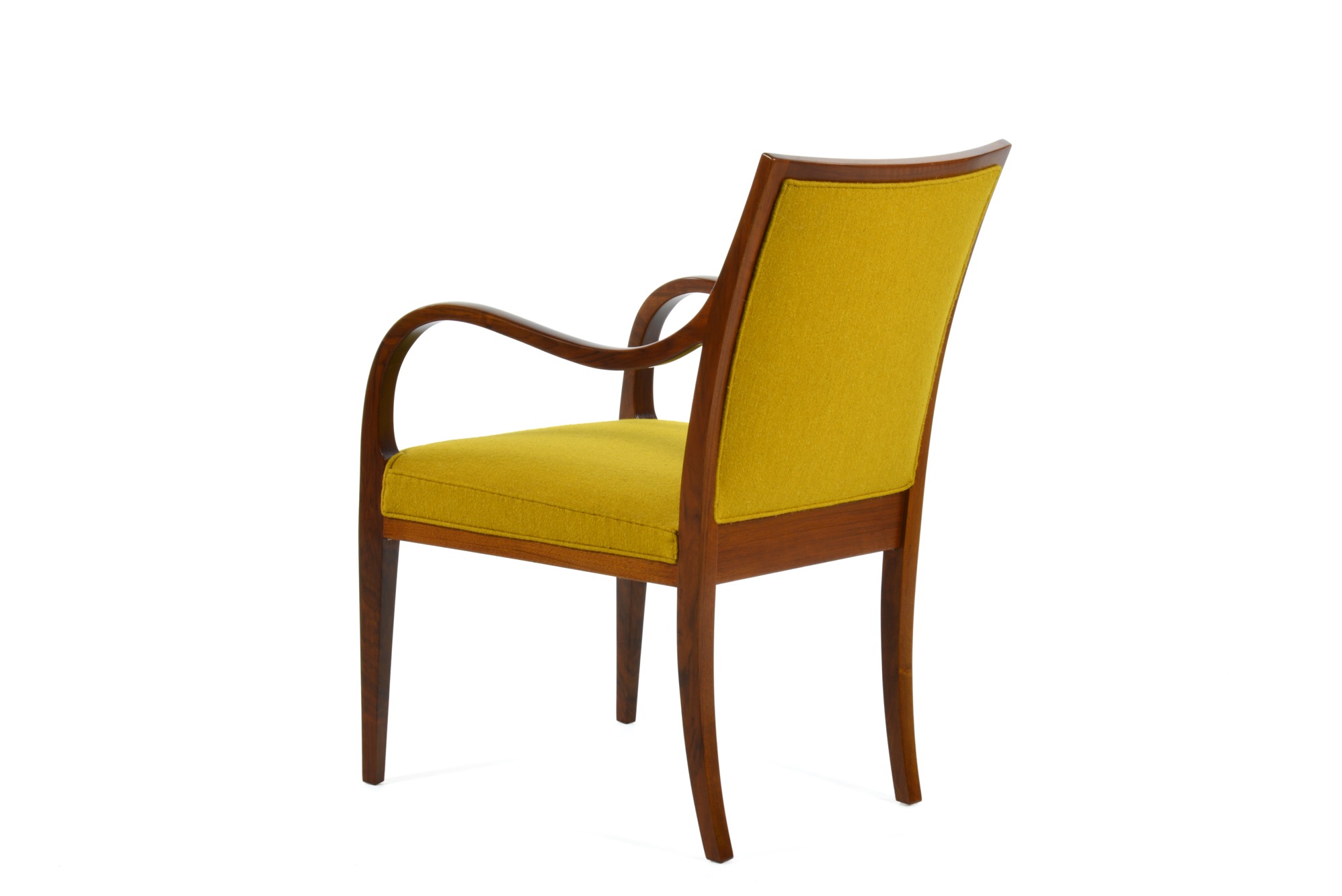20世紀初頭のデンマークデザイン黎明期に活躍したデザイナー、フリッツ・ヘニングセンによるラウンジチェア、一対です。1940年代頃に作られたものでしょう。この当時はまだ豊富に採れたであろうマホガニー材のフレームは優雅な曲線を描きます。古い時代のリビングでスタンダードだった高めの座面は、格子状の帯で吊られた構造となっており、着座や立ち上がる時にも楽な姿勢が保て、長時間座っていてもお尻が痛くなりにくく座りやすいなど定評があります。