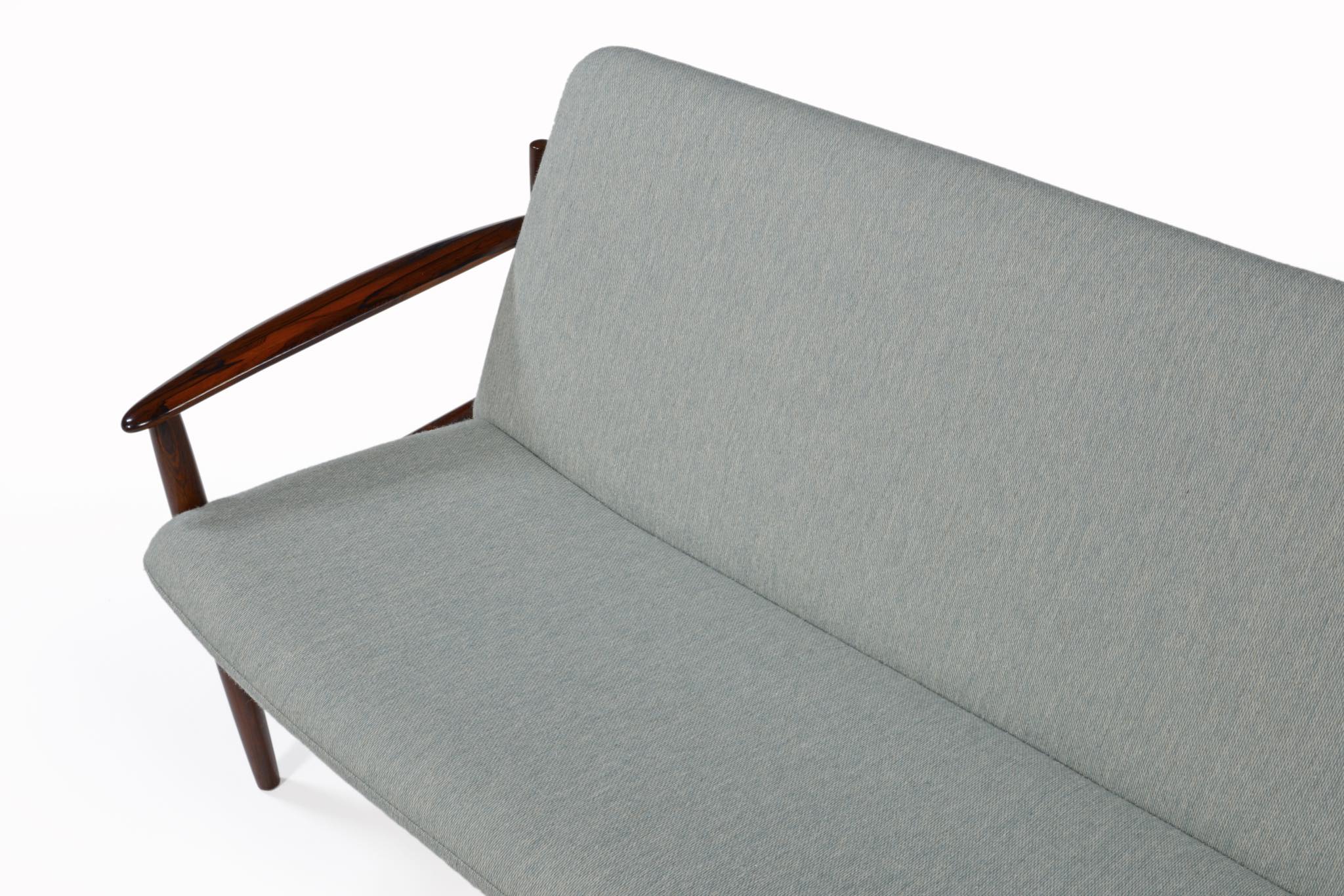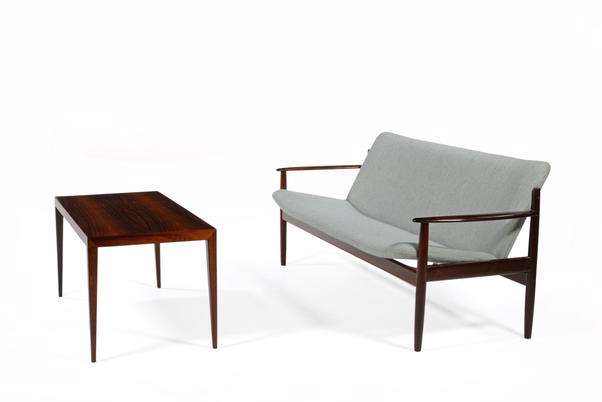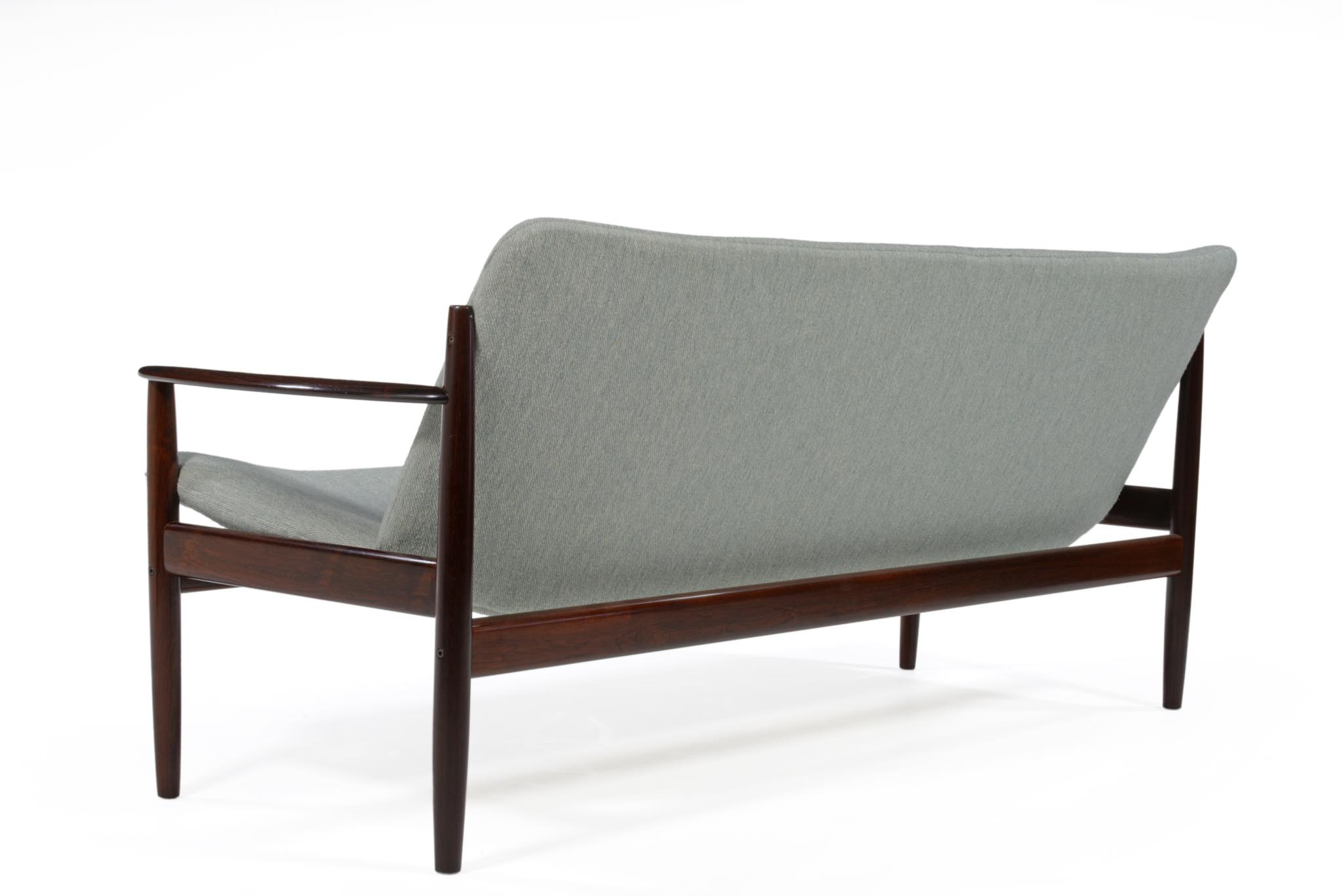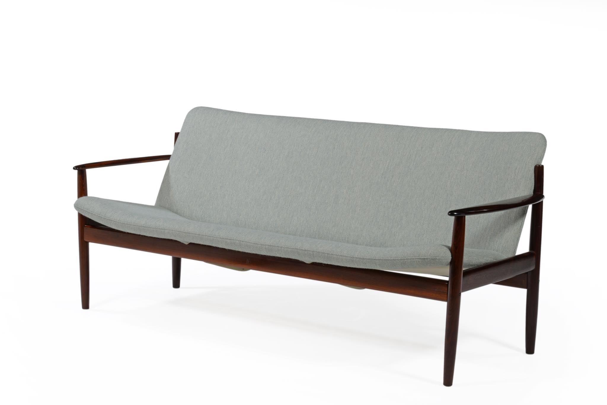 デンマークの家具デザイナー、クート・ウスタヴィによる2.5人掛けのソファです。1962年頃に発表されたモデルで、アーム無しのタイプやラウンジチェアなども展開されていたようです。フレームには見応えのある木目文様の現れたブラジリアンローズウッドが用いられ、シート内部は鉄製フレームで形成された堅牢な作りです。シートは新たにキエルルップ社のファブリックで張り替えました。ローズウッドのフレームの内側には ”Danish Furniture Makers' Quality Control” (デンマーク家具品質管理組合) より発行された証が押印されており、高品質製品である事が伺えます。