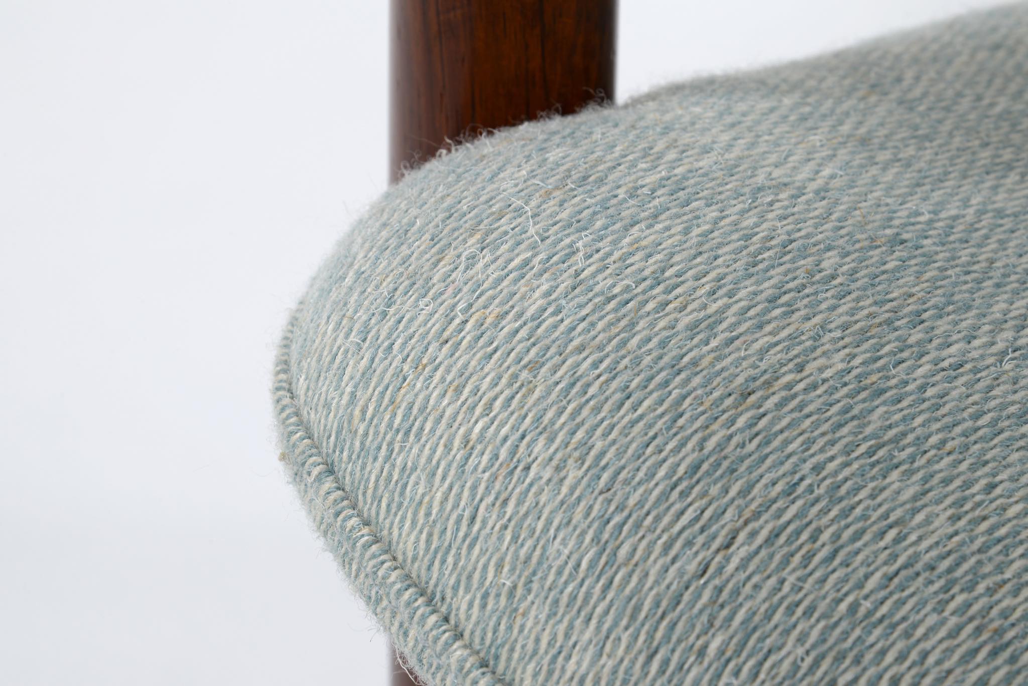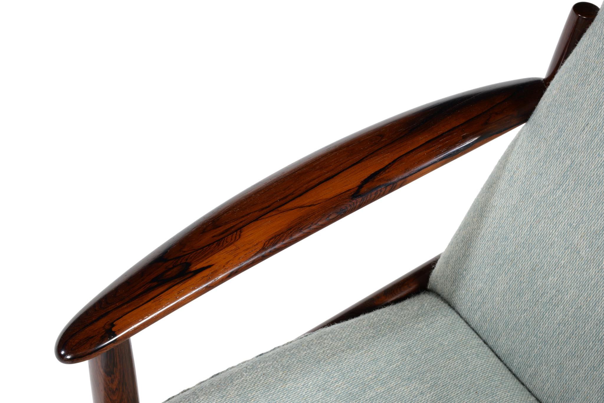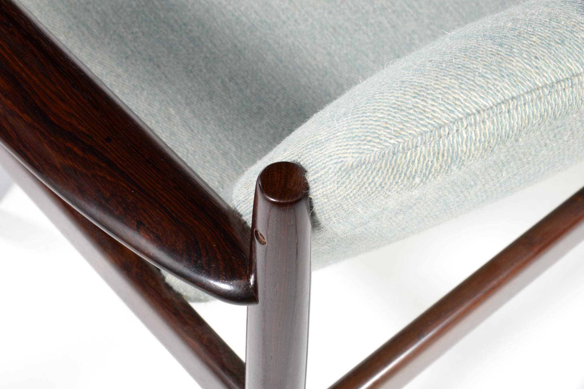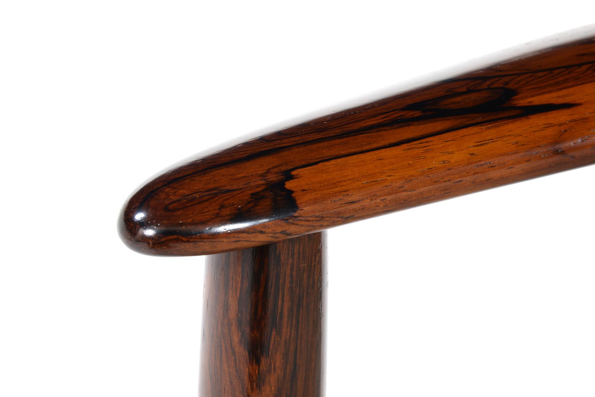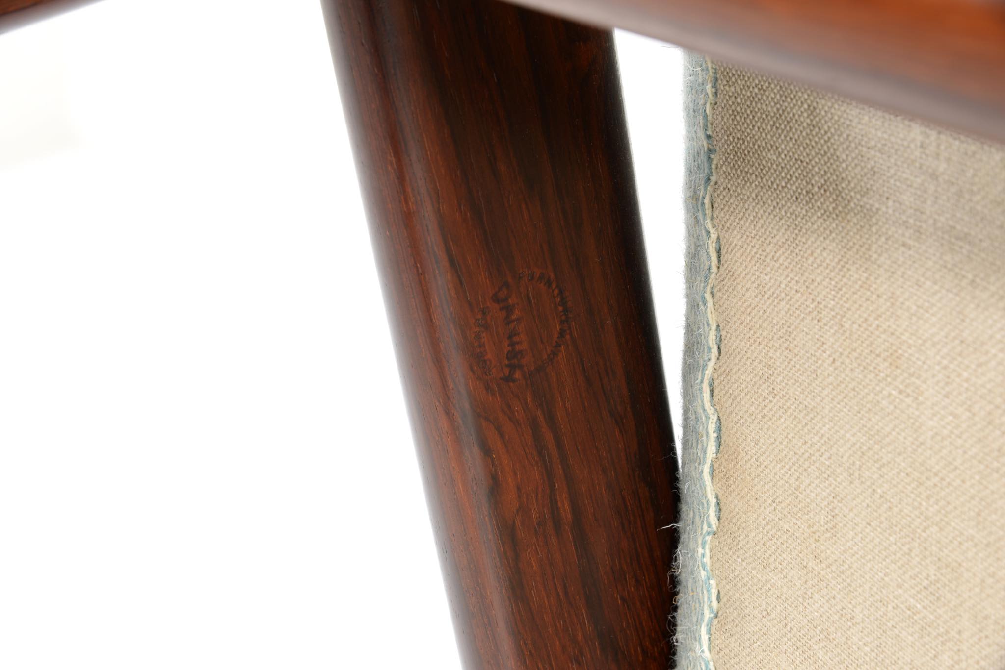 デンマークの家具デザイナー、クート・ウスタヴィによる2.5人掛けのソファです。1962年頃に発表されたモデルで、アーム無しのタイプやラウンジチェアなども展開されていたようです。フレームには見応えのある木目文様の現れたブラジリアンローズウッドが用いられ、シート内部は鉄製フレームで形成された堅牢な作りです。シートは新たにキエルルップ社のファブリックで張り替えました。ローズウッドのフレームの内側には ”Danish Furniture Makers' Quality Control” (デンマーク家具品質管理組合) より発行された証が押印されており、高品質製品である事が伺えます。