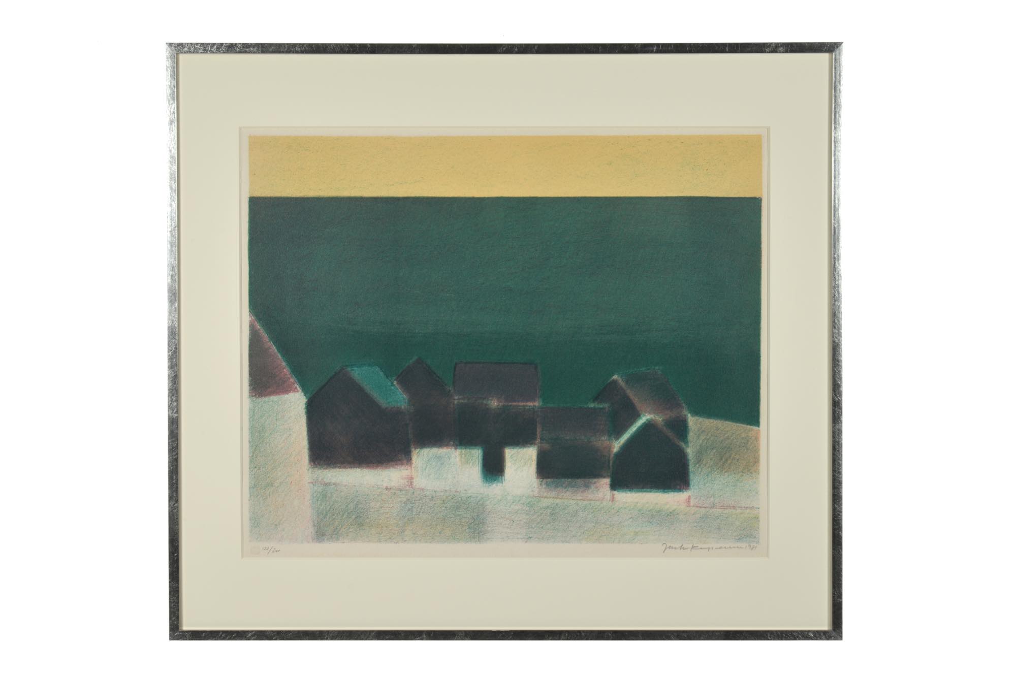 フェロー諸島の風景を描いた、ジャック・カンプマンによる版画作品です。オリジナルと思われる木製銀箔のフレームをそのままに、マットを差し替え整えました。