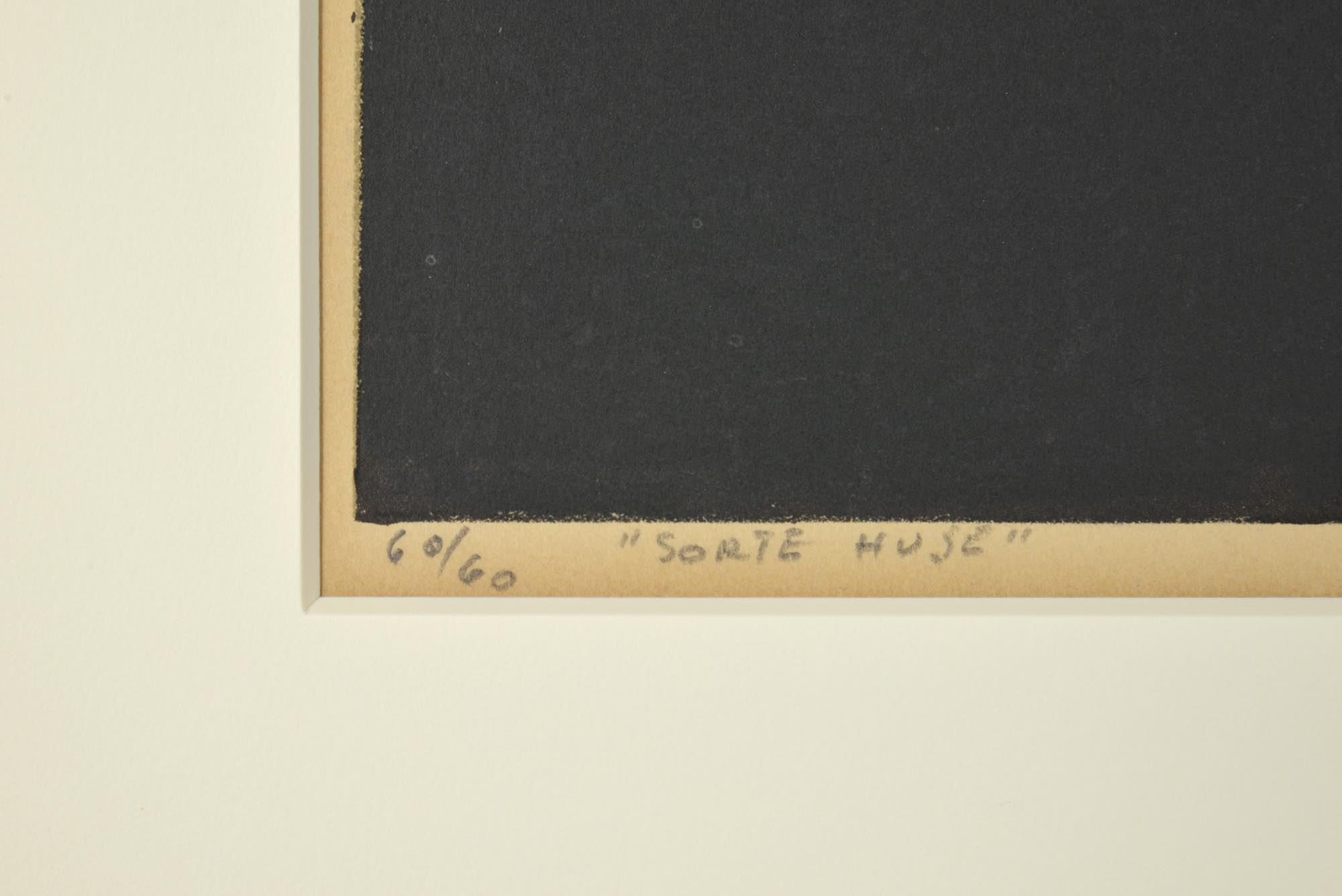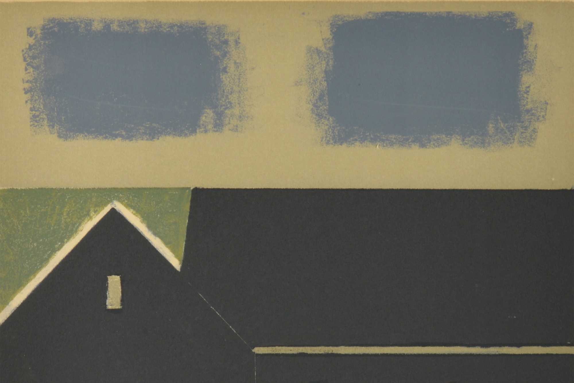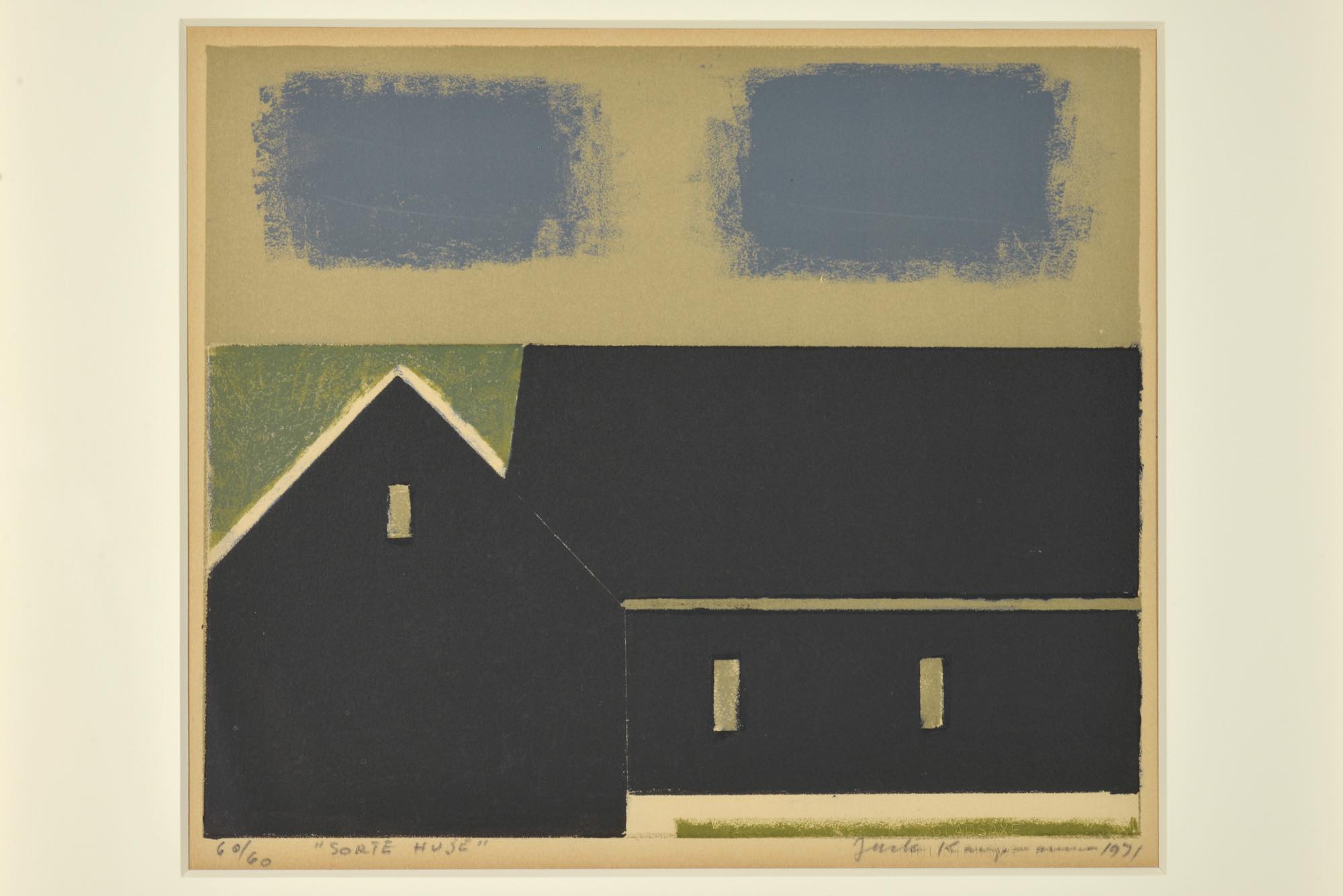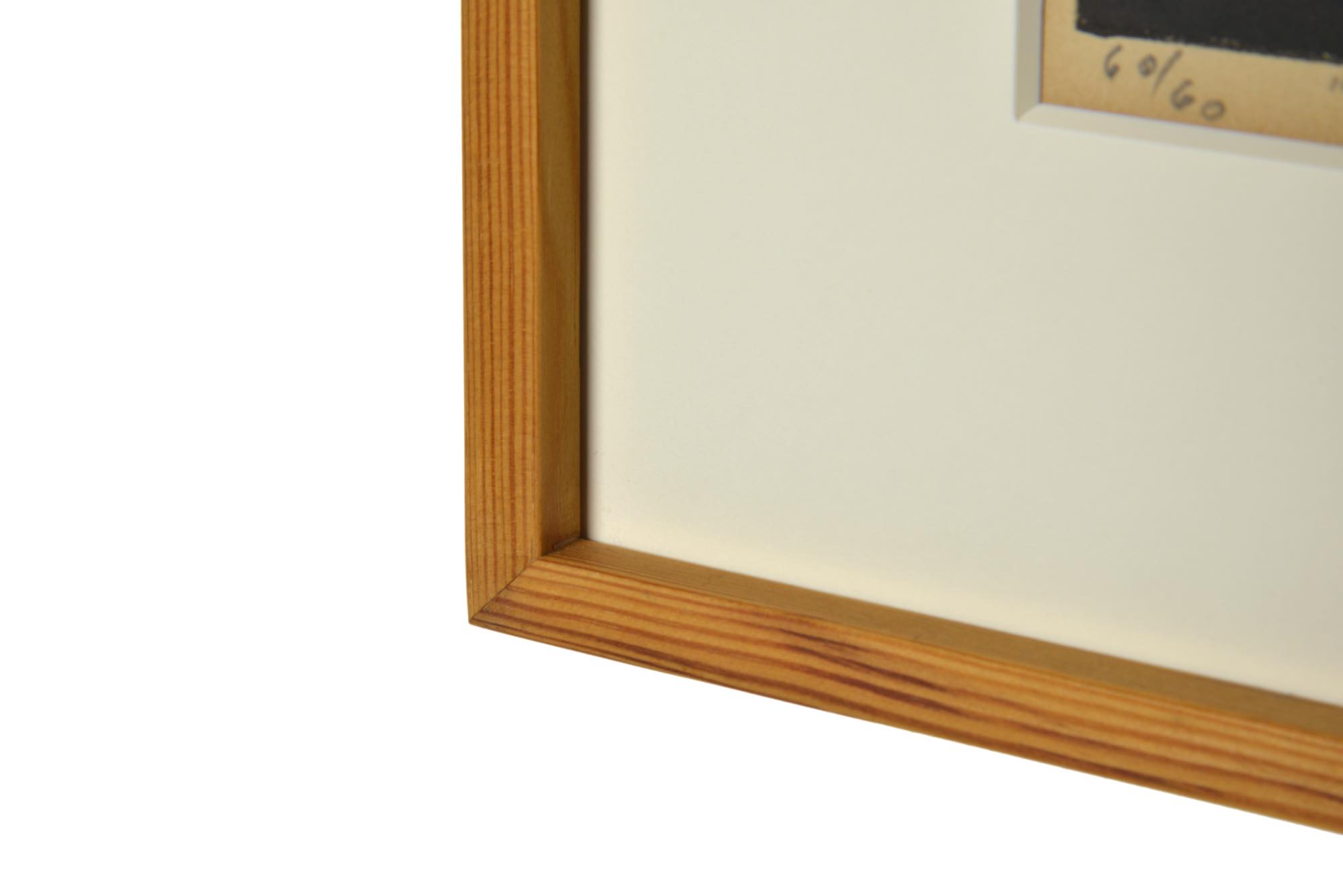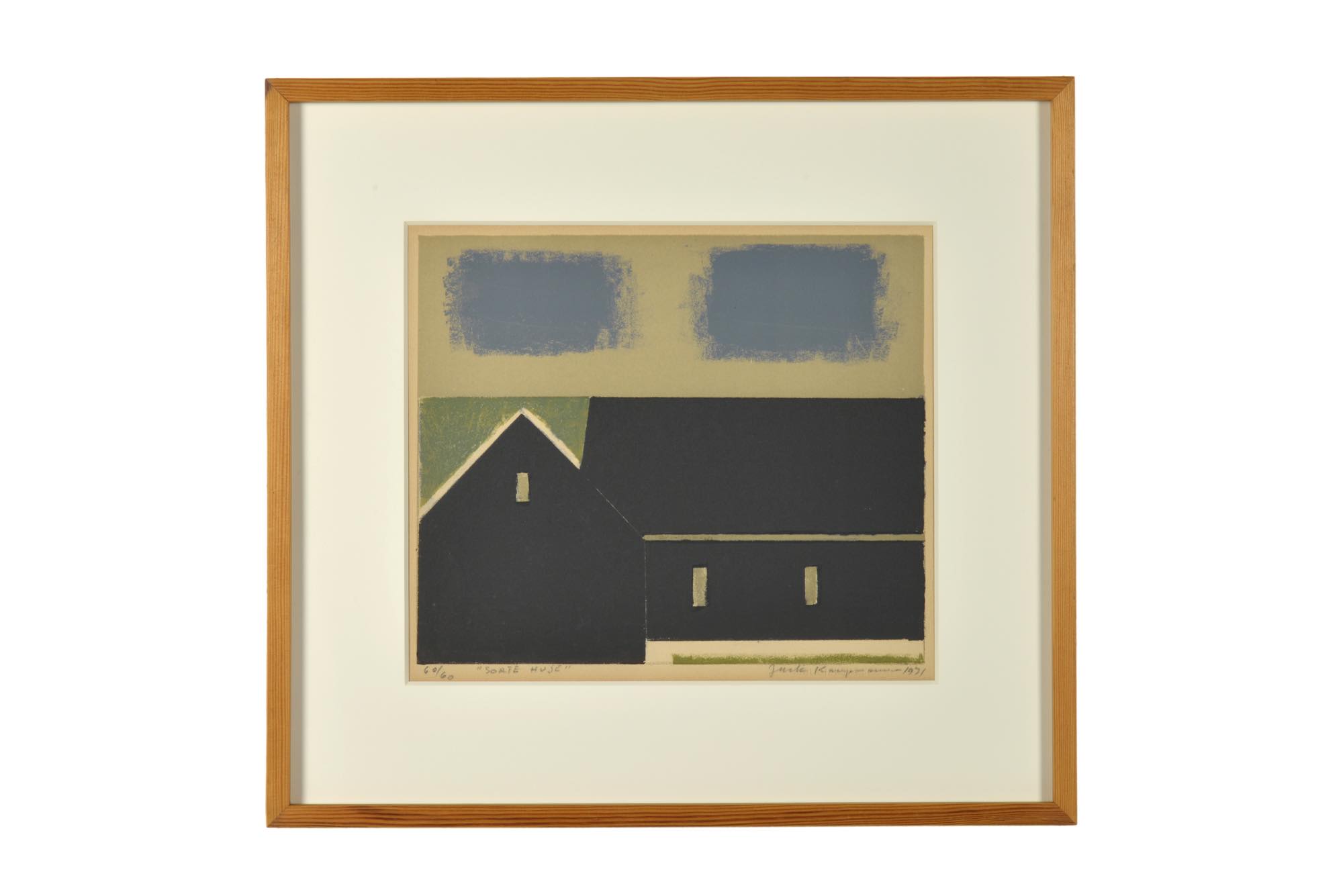 フェロー諸島の風景を描いた版画作品です。ジャック・カンプマンの作品としては珍しく、風景を平面的に表現しています。オリジナルと思われるパイン材のフレームをそのままに、マットを差し替え整えました。
