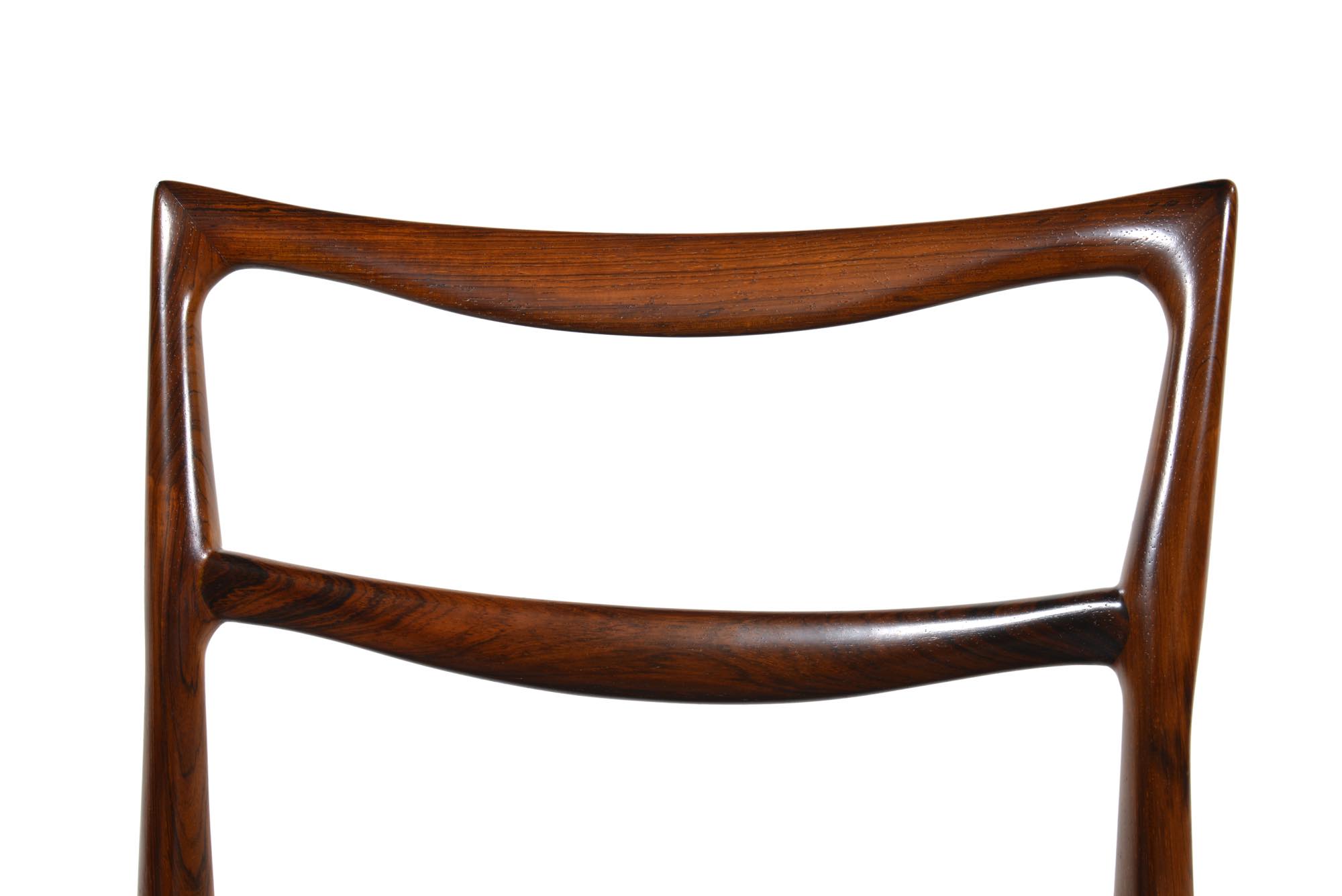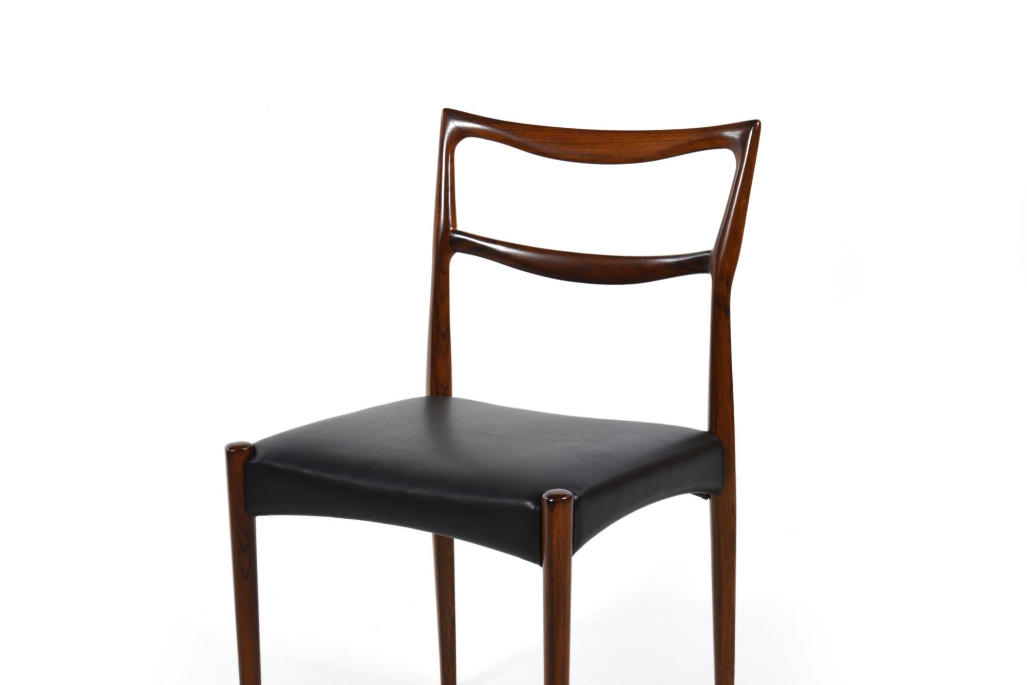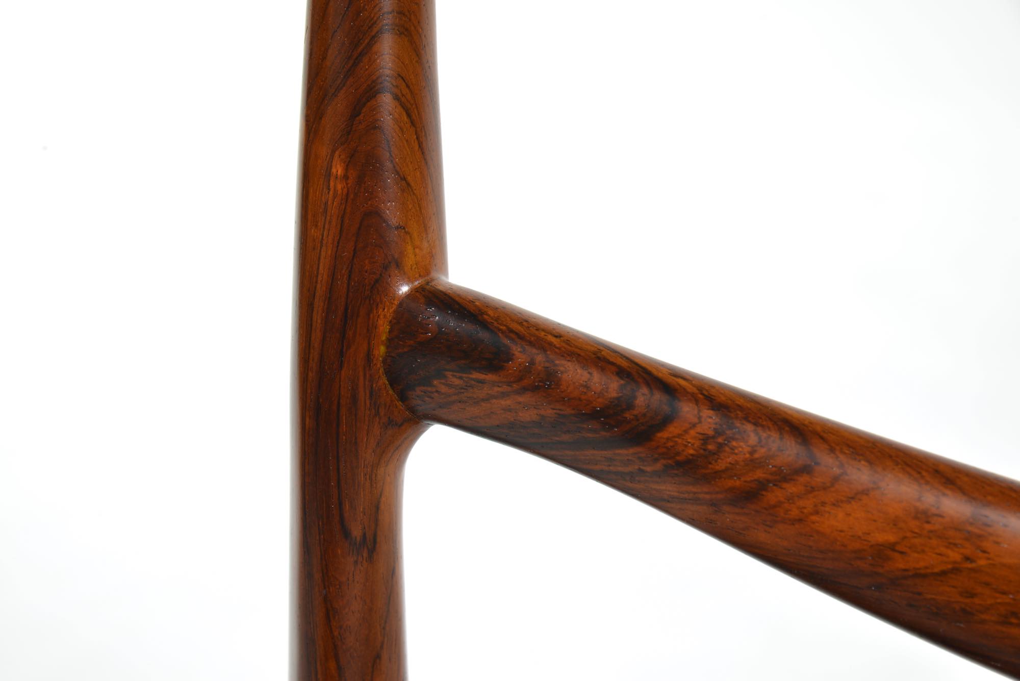 軽く、小振りで有機的なデザインが特徴的なこちらのダイニングチェアは、ノルウェイ出身でフィン・ユールに学び、1960年代のデンマークで活躍したH.W.クレインによるものです。ブラジリアンと思しき良質なローズウッドが用いられており、シートは皮革にて張り替えました。見た目は華奢なのにしっかりしている、そんな印象の椅子です。
