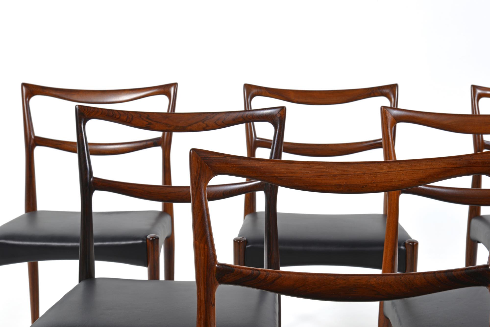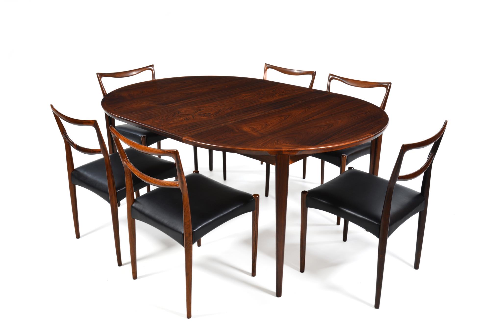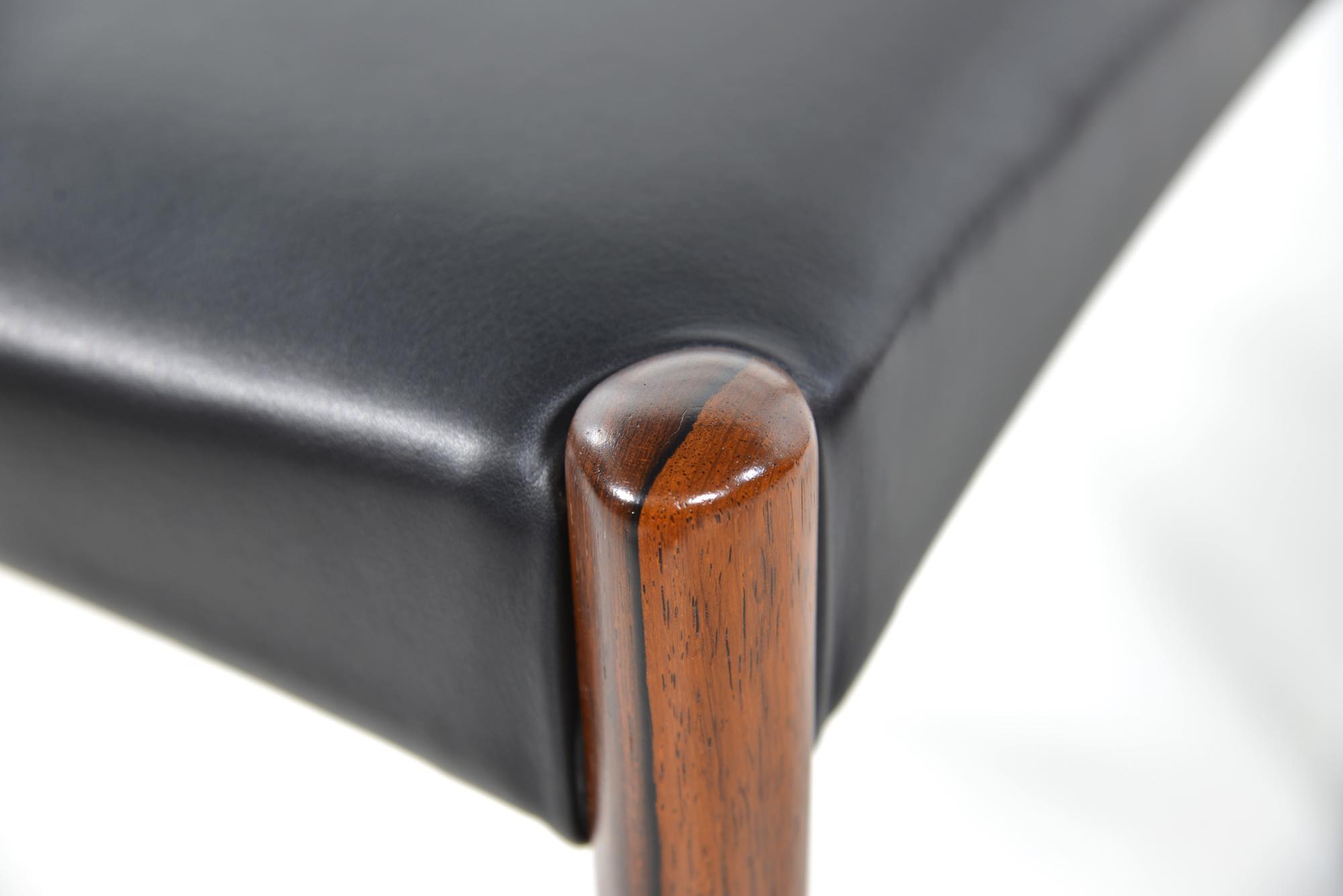 軽く、小振りで有機的なデザインが特徴的なこちらのダイニングチェアは、ノルウェイ出身でフィン・ユールに学び、1960年代のデンマークで活躍したH.W.クレインによるものです。ブラジリアンと思しき良質なローズウッドが用いられており、シートは皮革にて張り替えました。見た目は華奢なのにしっかりしている、そんな印象の椅子です。