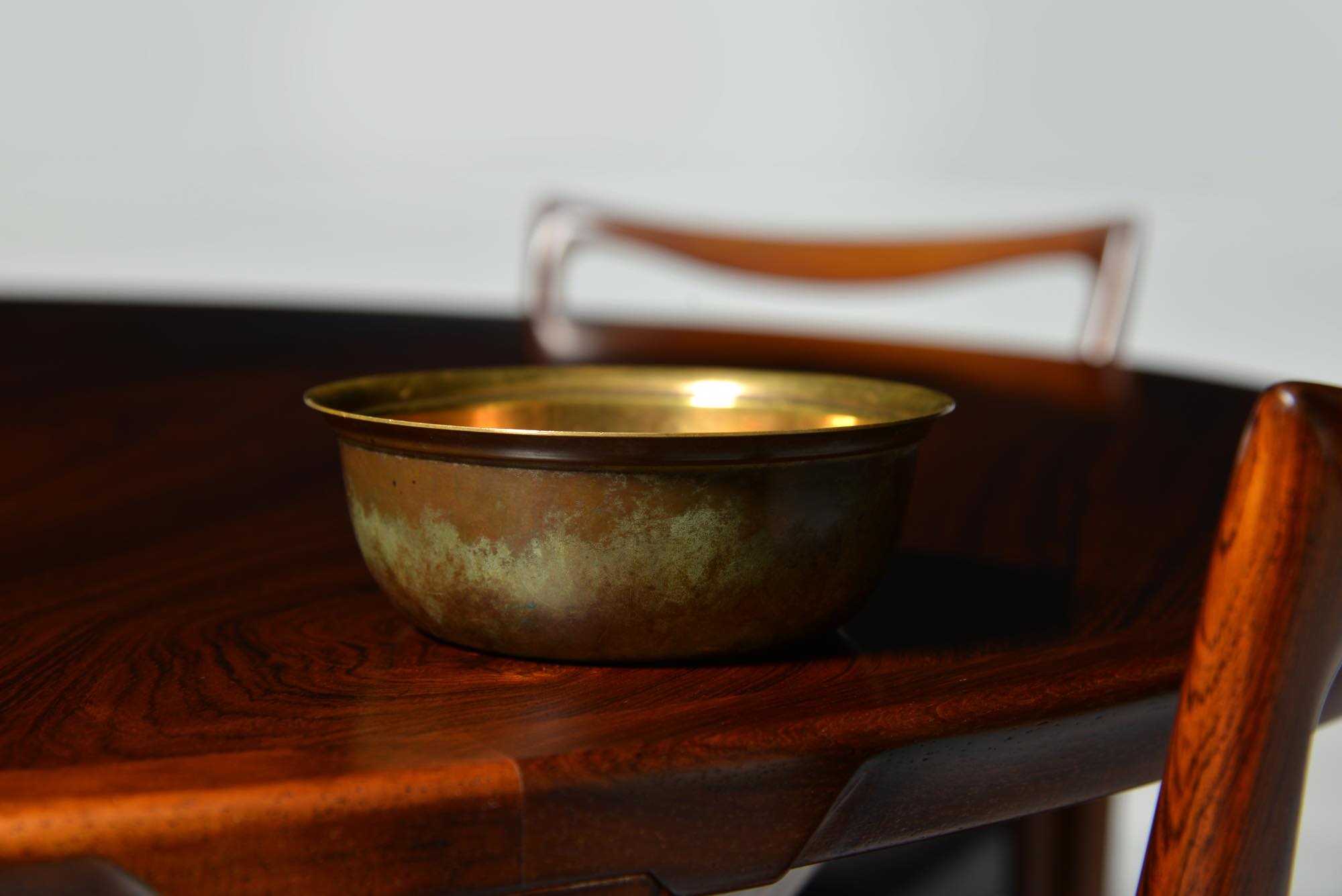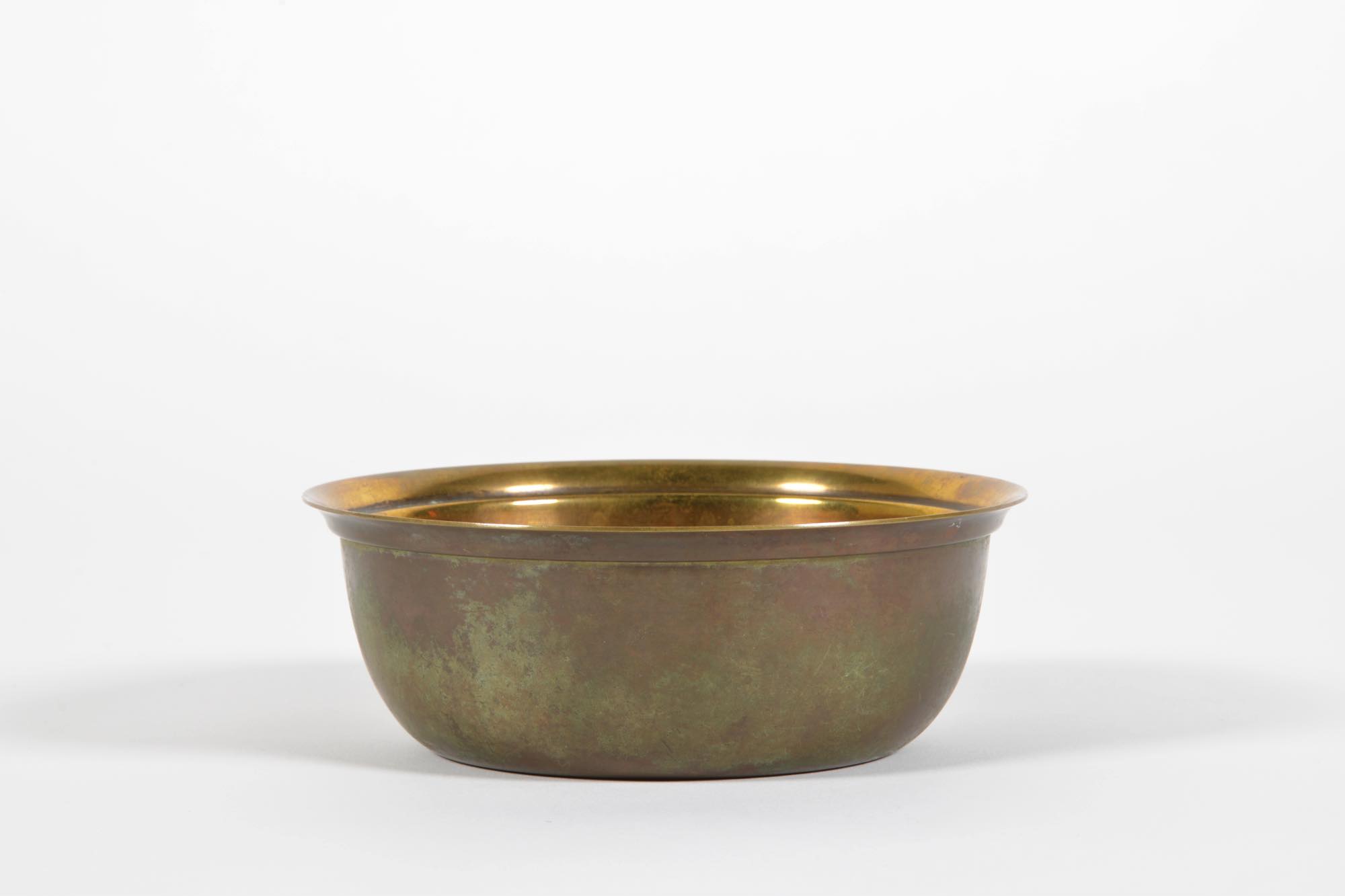 グリーンランド出身、デンマークの金工作家、ユスト・アナセンによるブロンズボウルです。真鍮に近いブロンズを用いて、ユスト・アナセンが得意とした着色加工をボウルの外側に施し、経年による磨耗や摩擦傷などの変化を以って景色としています。見込みは素地にて仕上げられているので、机上の小物入れにも良いでしょう。