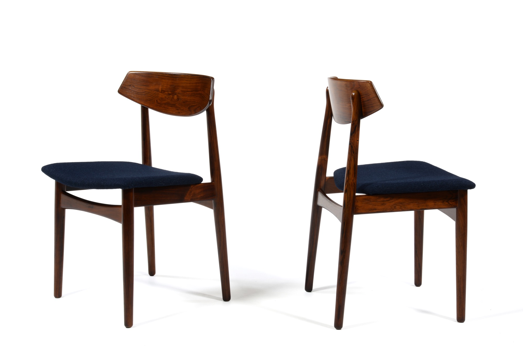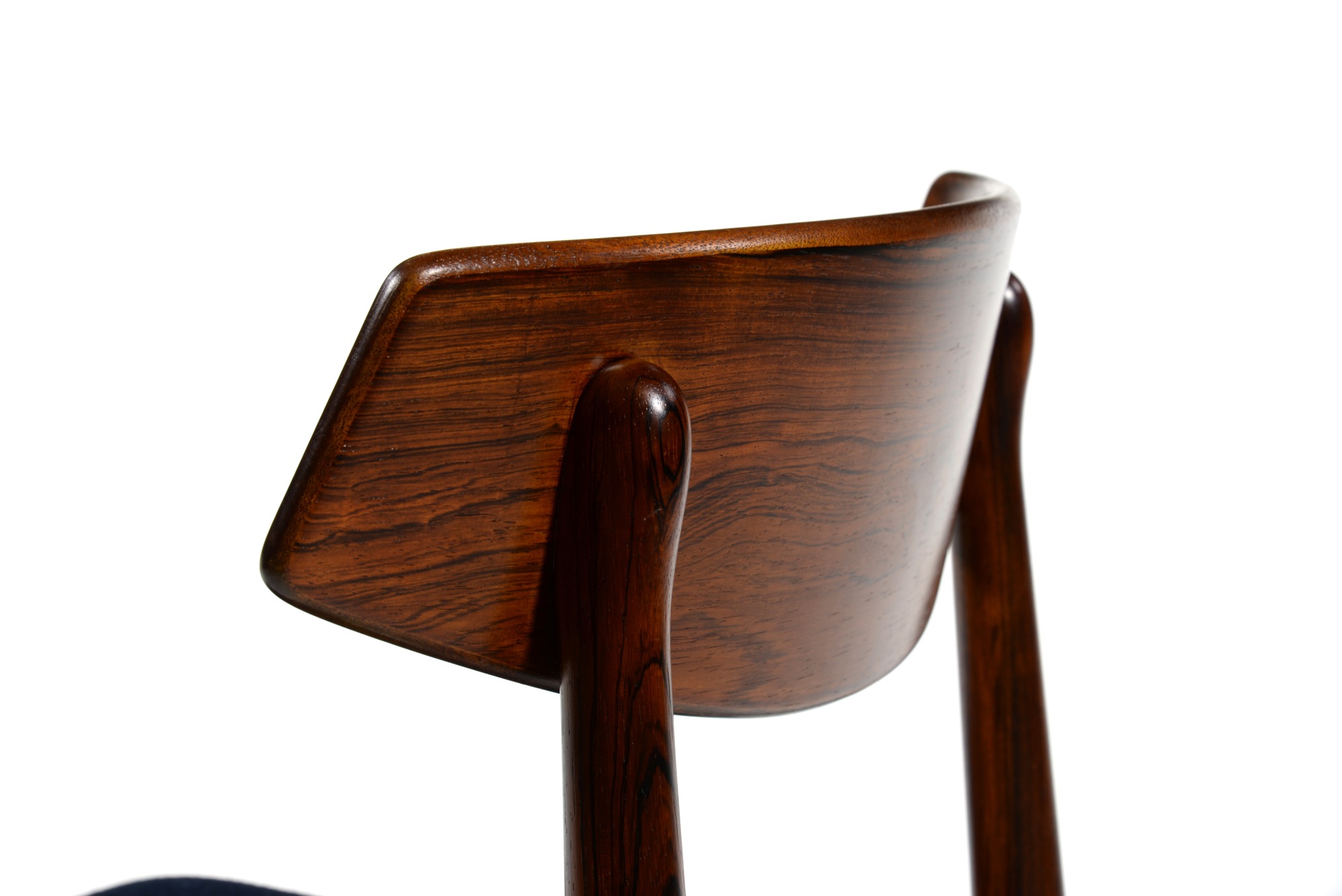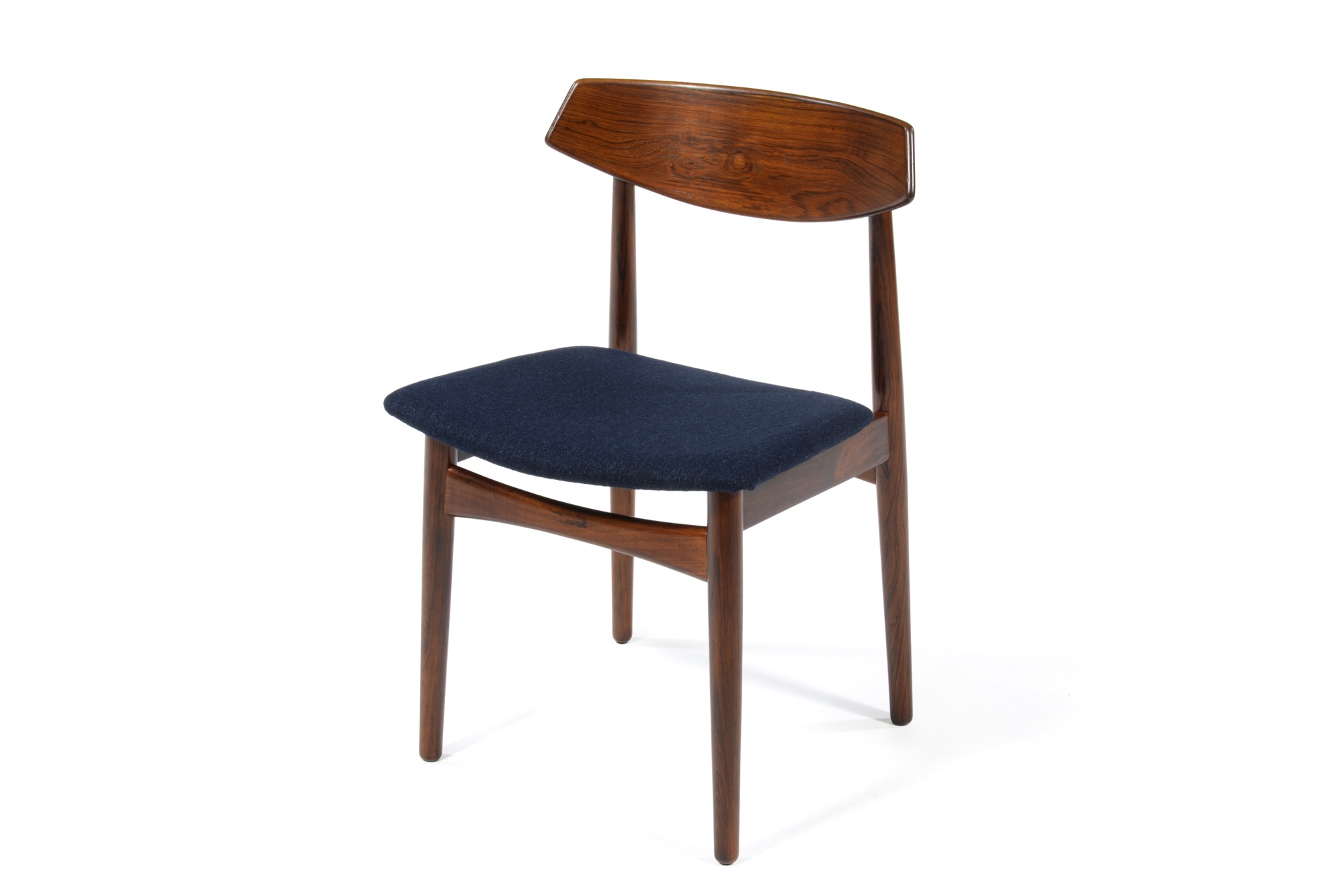 1960年代頃のデンマークで作られたローズウッドのダイニングチェアです。面積のある笠木は掛けやすく、ローズウッドの木目も見応えがあります。Kjellerup/ケアルップのファブリック(紺色)にて張り替えました。