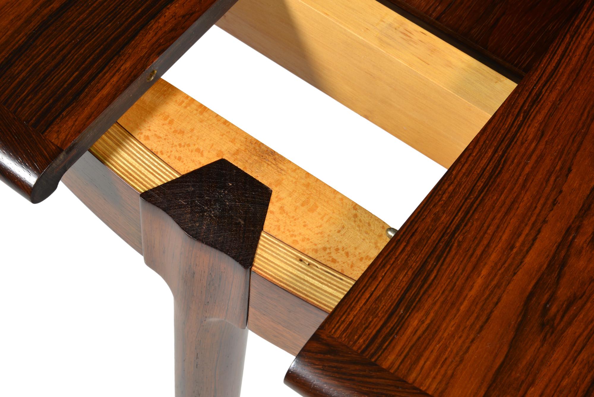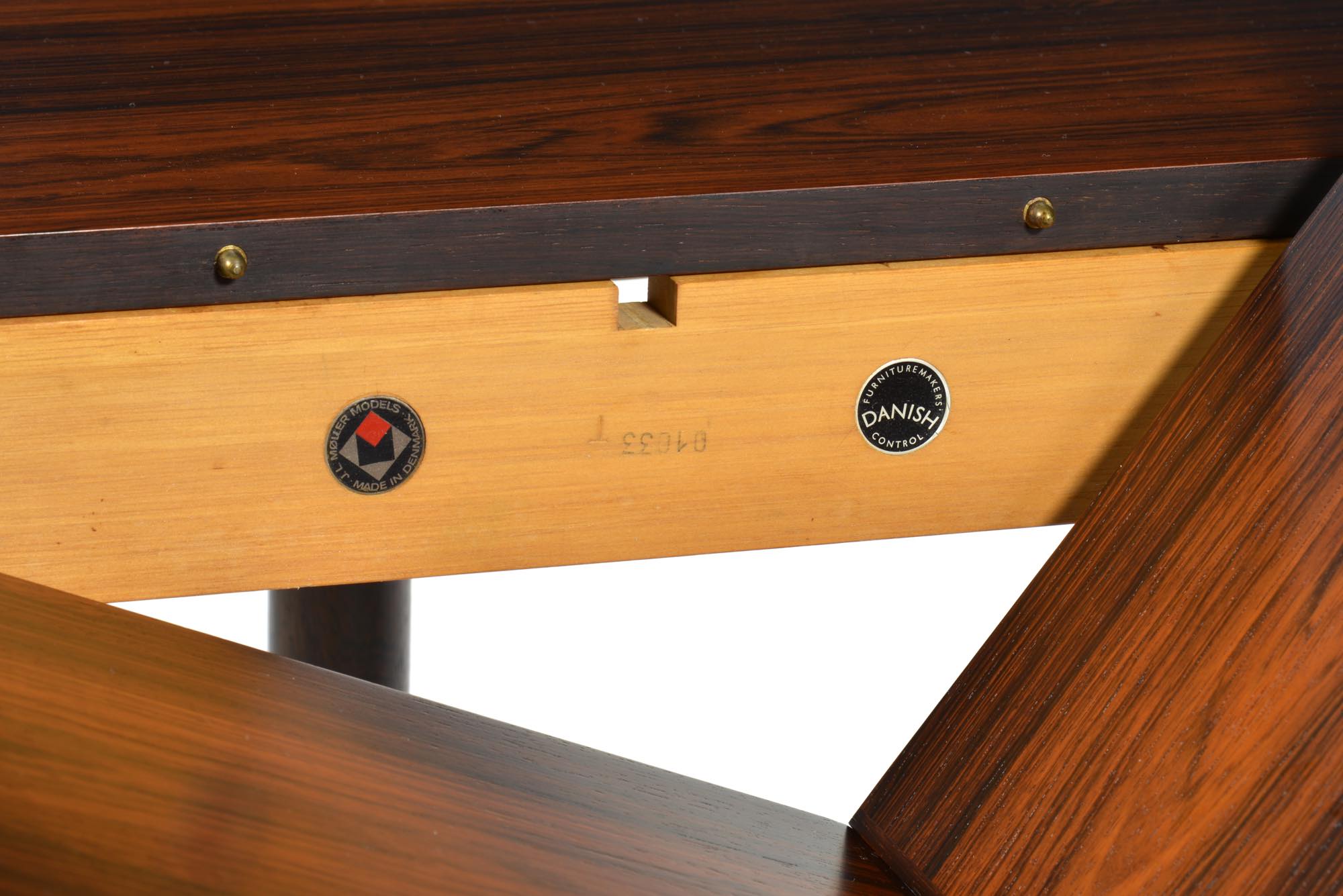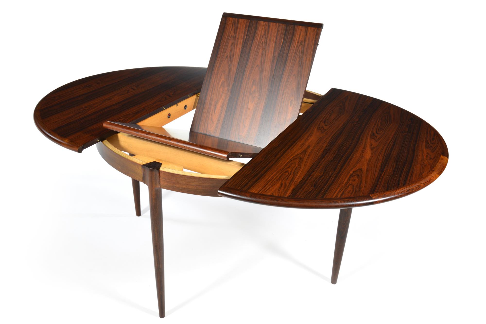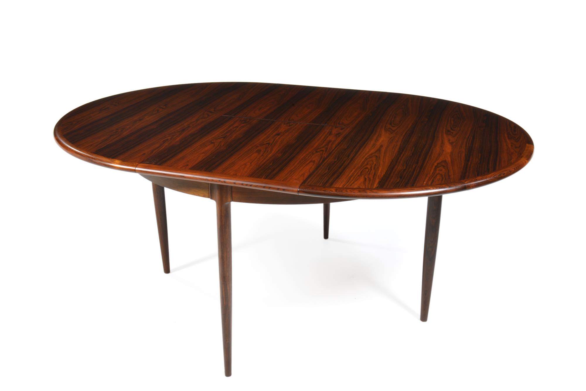 デンマークを代表する家具工房のJ.L. Mollerによって作られたエクステンションテーブルです。折りたたみ式のリーフが内包されており、天板の拡張が可能です。良質なローズウッド材が用いられた綺麗なテーブルです。