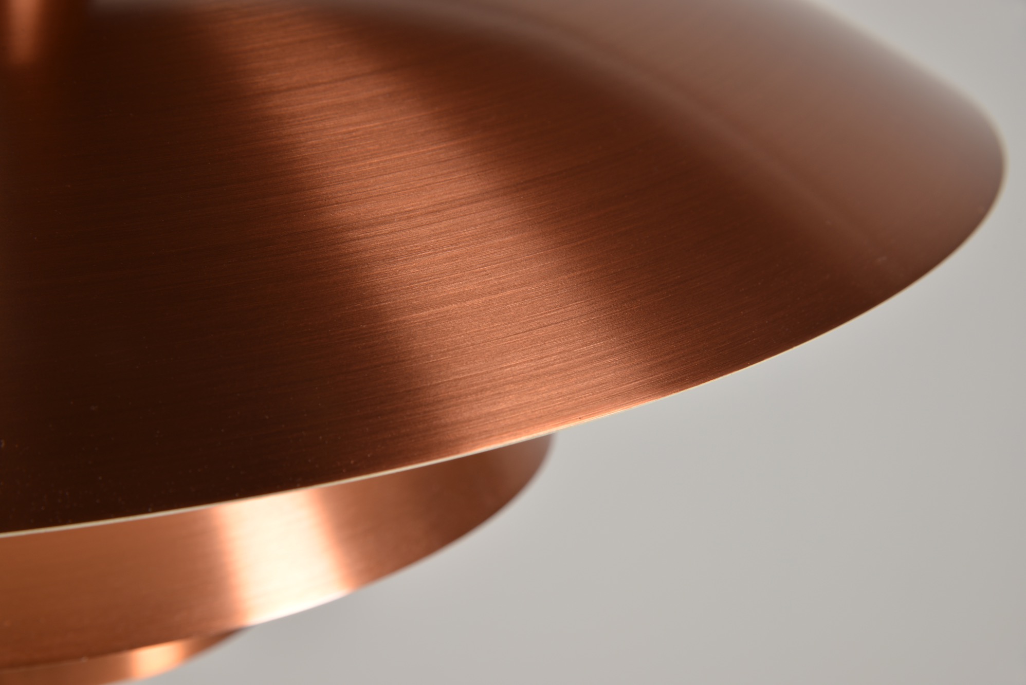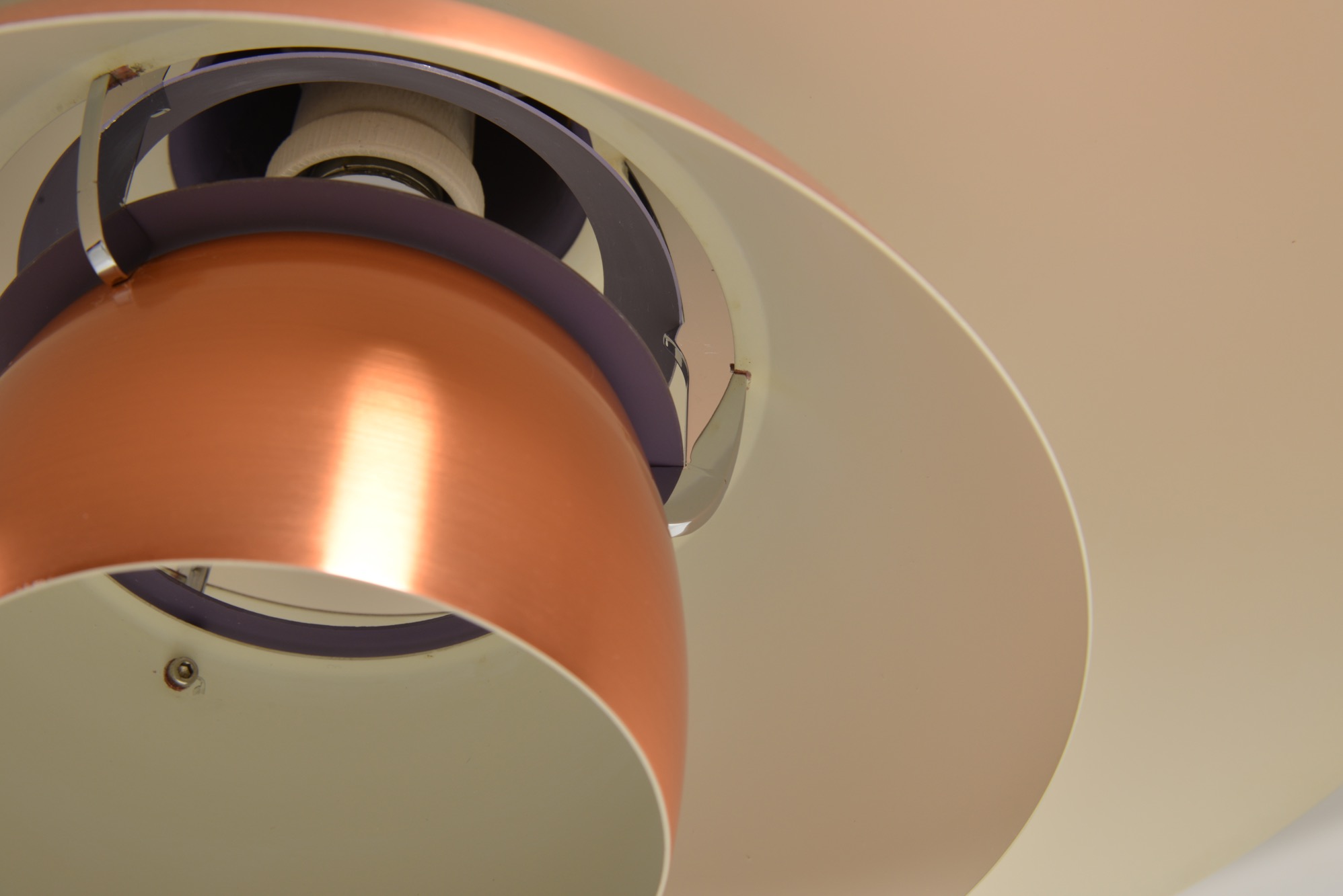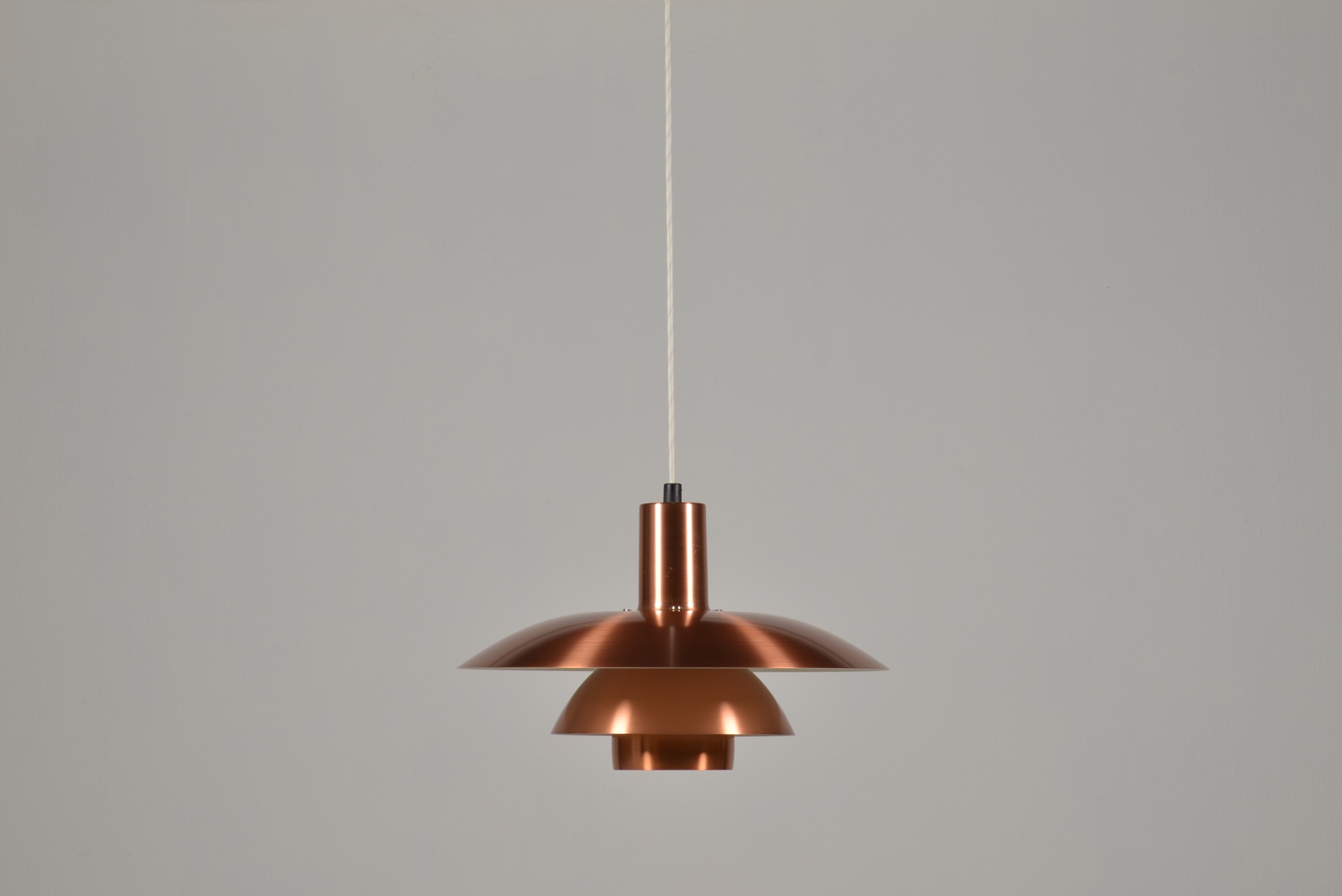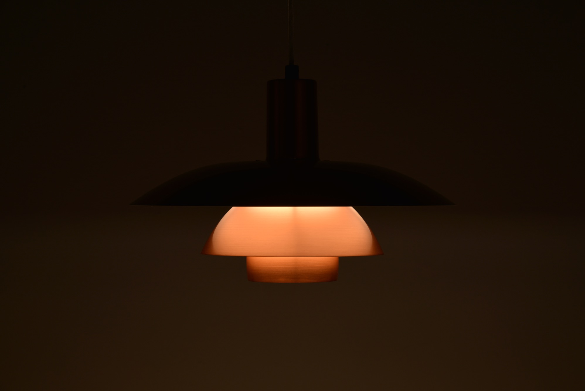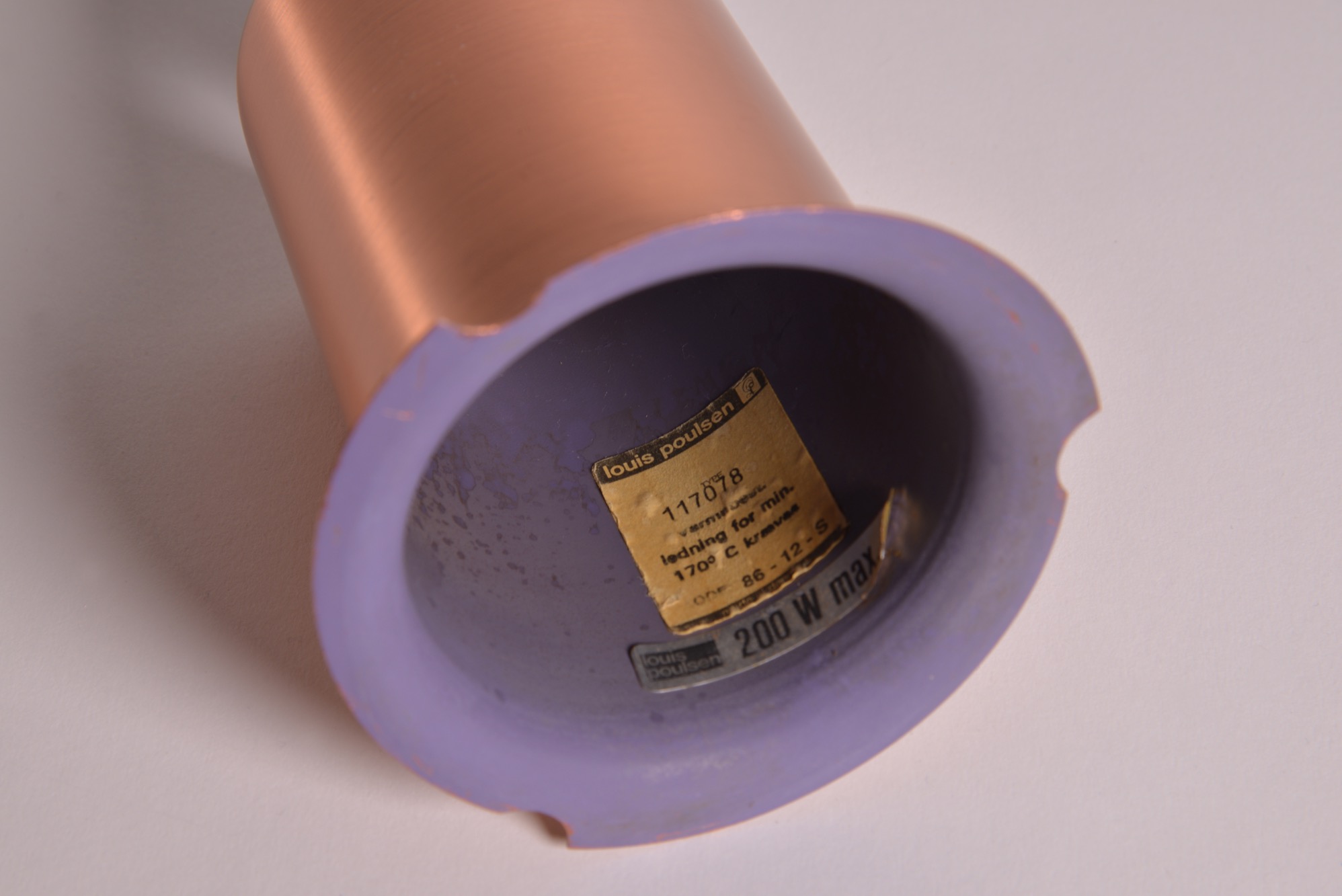 ルイス・ポールセン社によって1984年に発表された銅製のペンダントランプです。現在と同様、当時の限定生産品だったようで、白色アルミ、ヘアラインアルミ、コーティングコッパー、ロウコッパーの4種類のモデルで展開されたようです。こちらはコーティングされたコッパーのタイプで、銅の輝きが衰えません。光源を隠すボトムのメッシュプレートは付属しませんが、傷も少なくコンディションは良好です。詳しくはお問い合わせください。