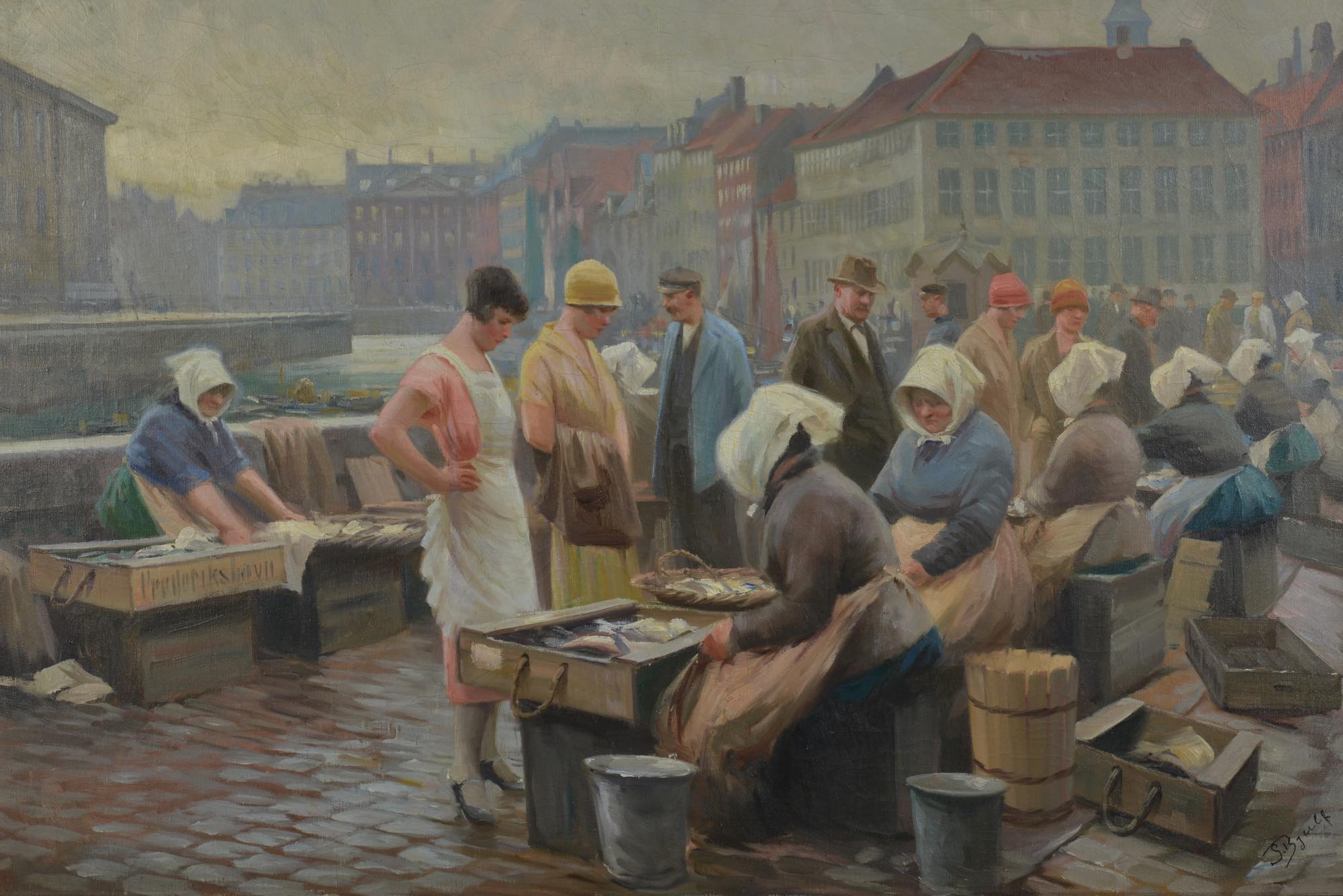 Søren Christian Bjulf "Fish market at Gl. Strand" Oil painthing on canvas, Circa 1920's