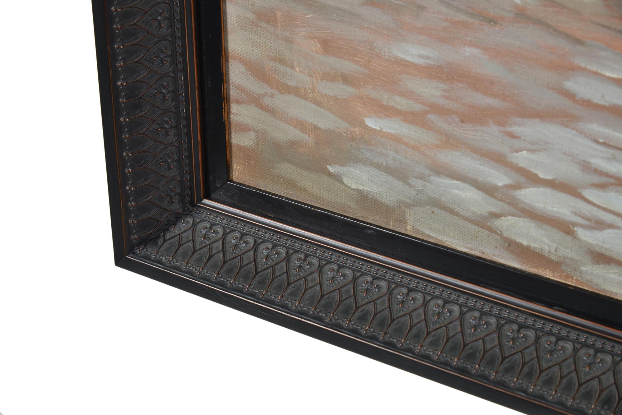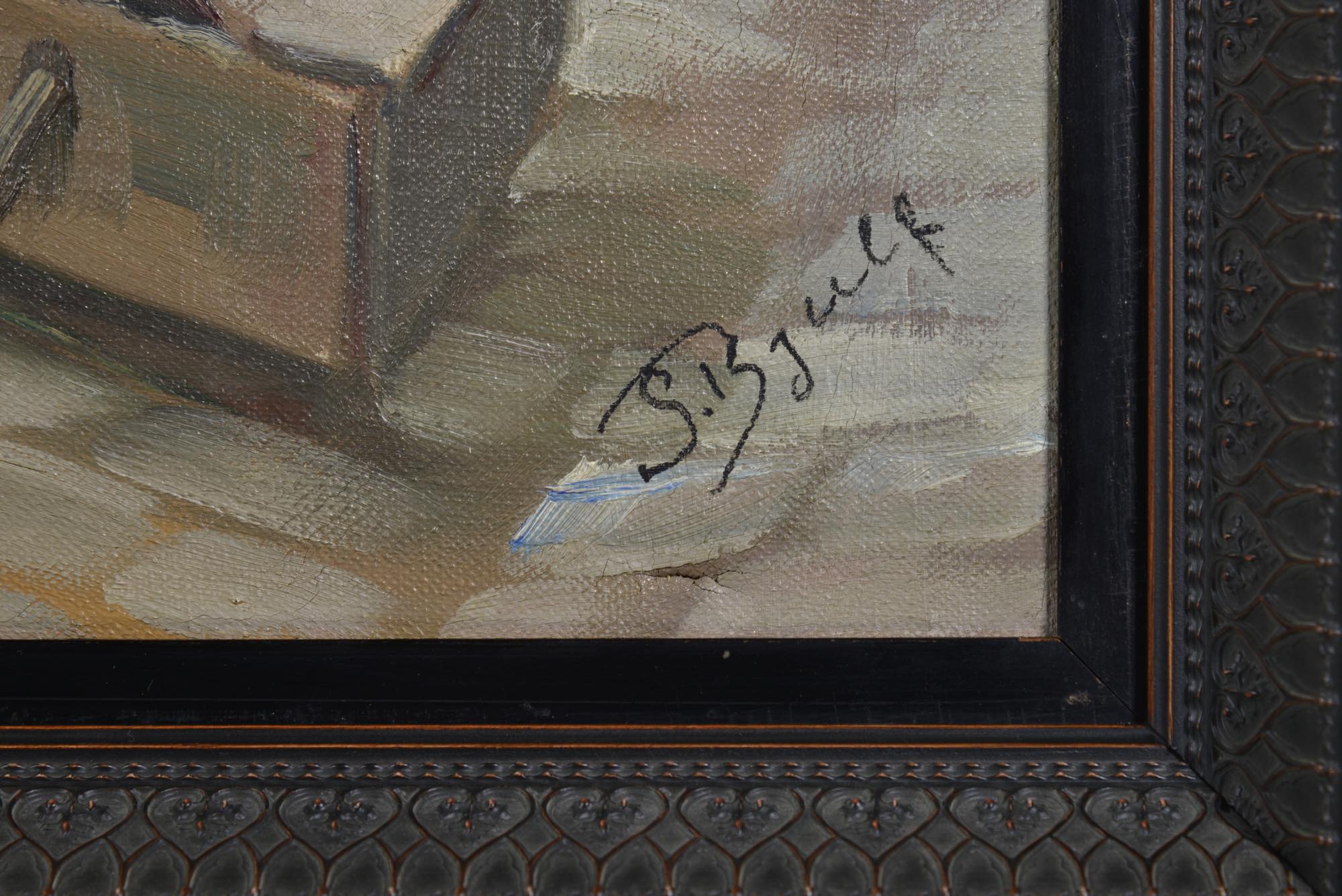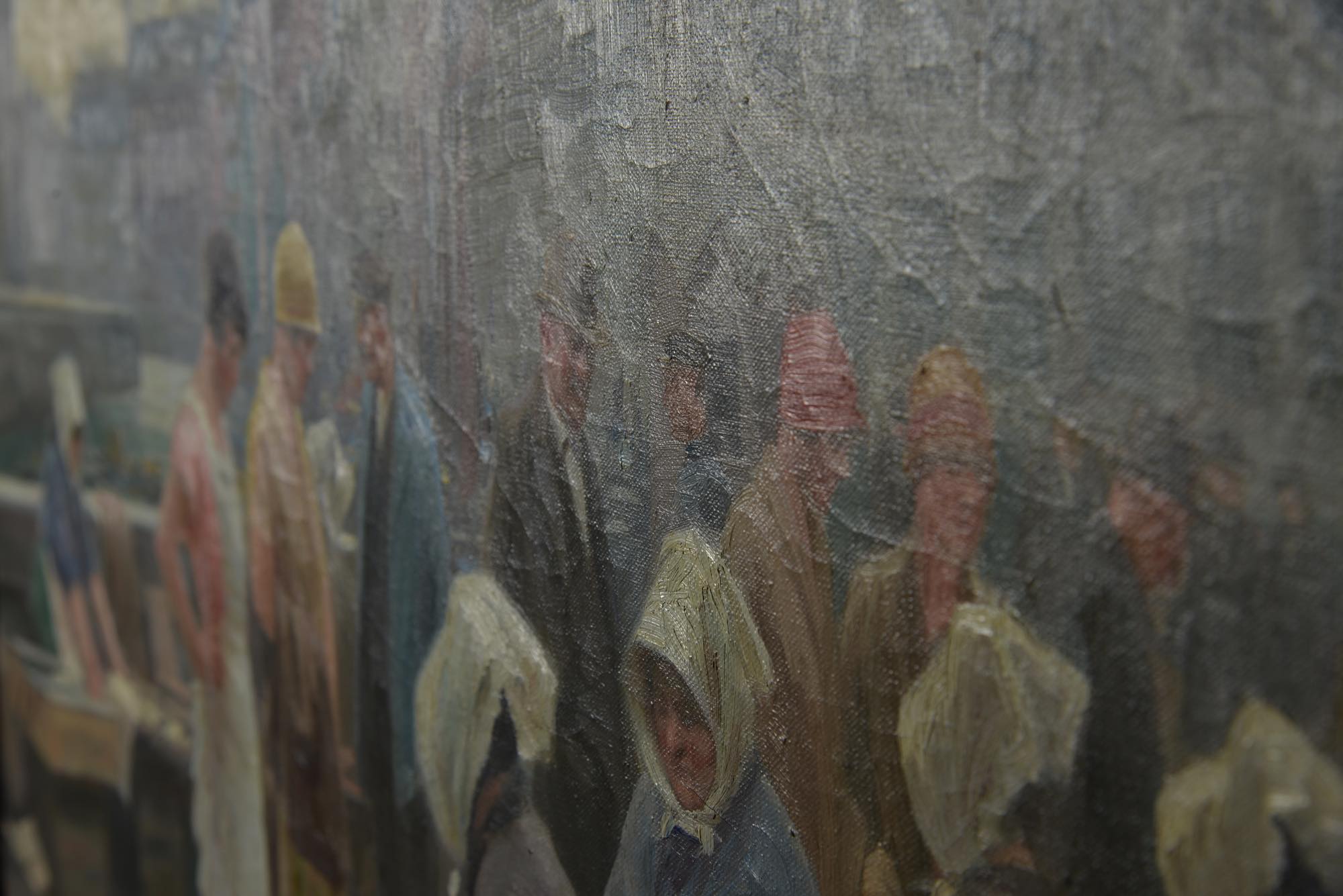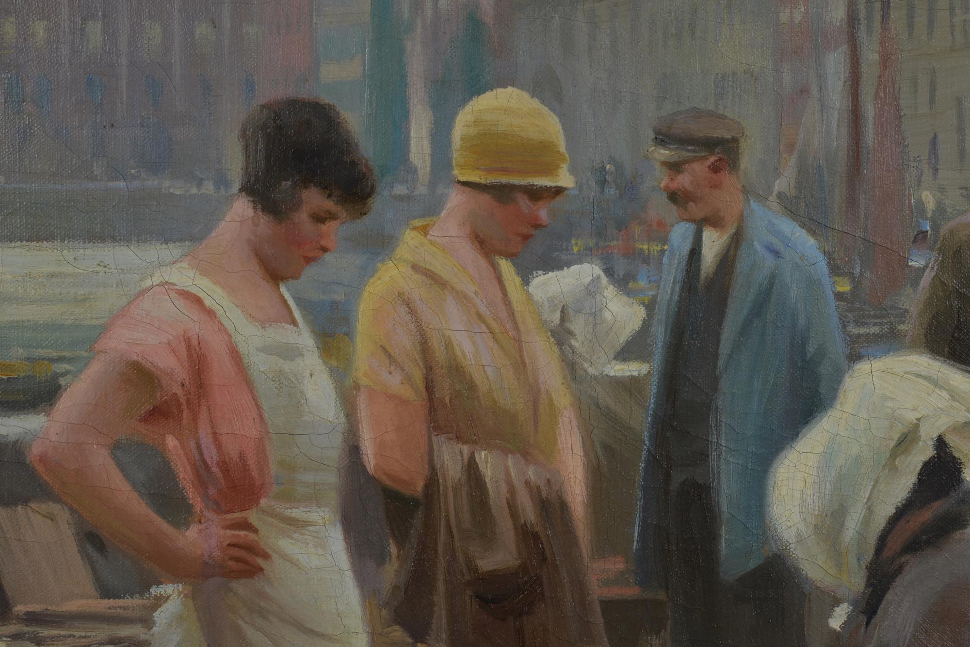 画家のソーレン・クリスチャン・ビュルフによる、コペンハーゲン、ガンメルストランドの魚市場の様子を描いた、1920年頃の油彩作品です。春の湿った大気を感じさせる表現で、やや大振りな作品です。額を誂えました。