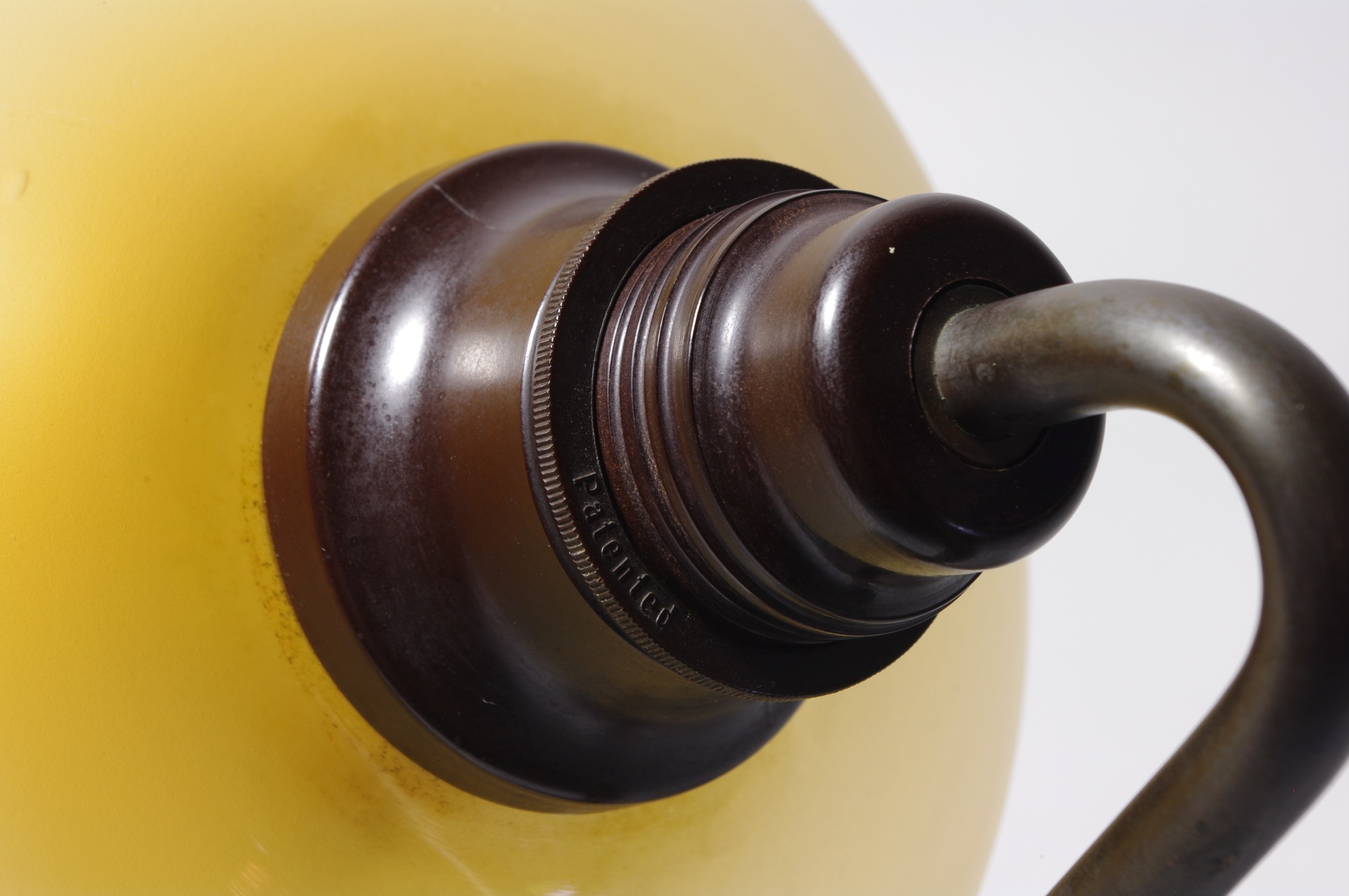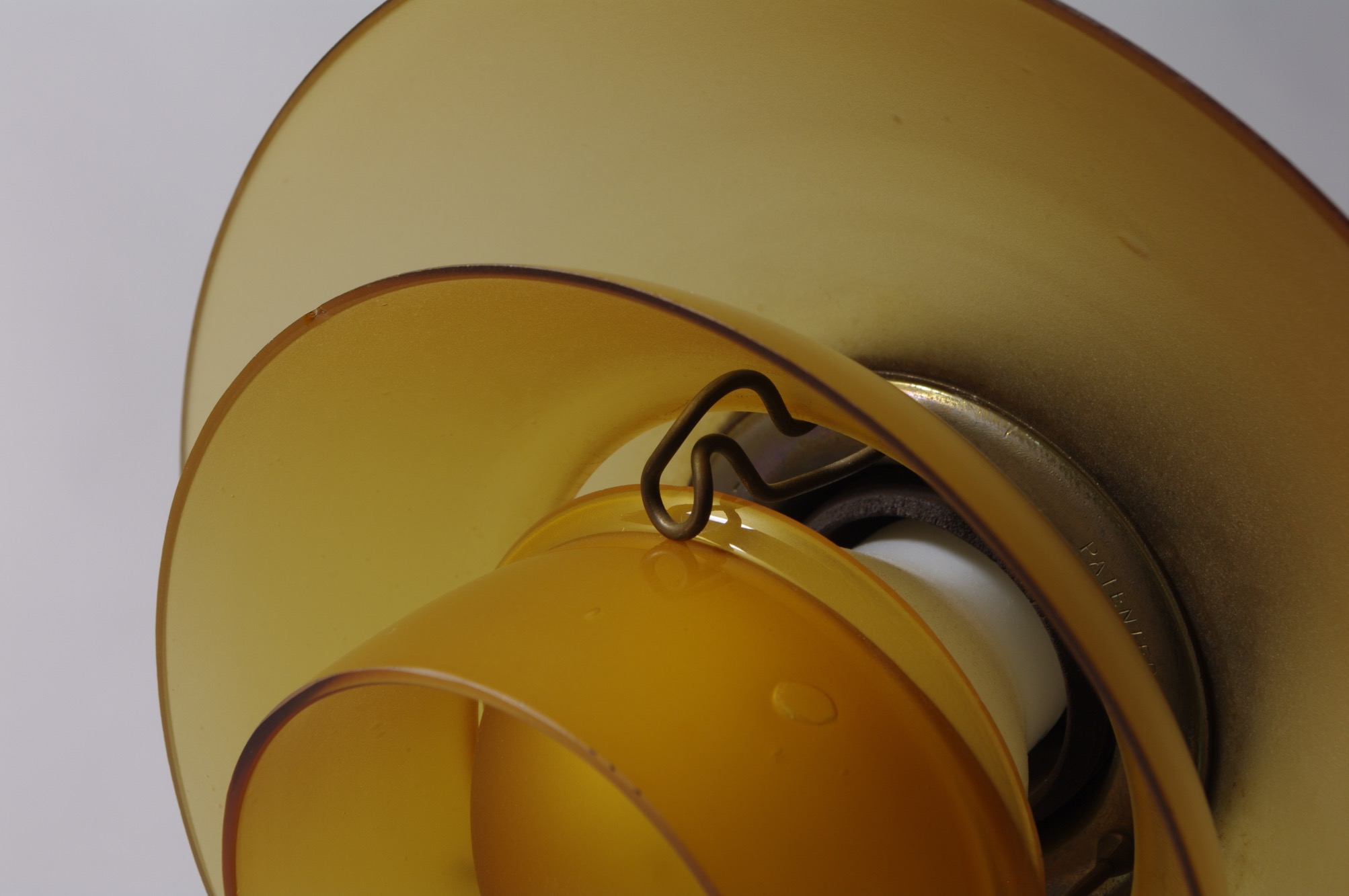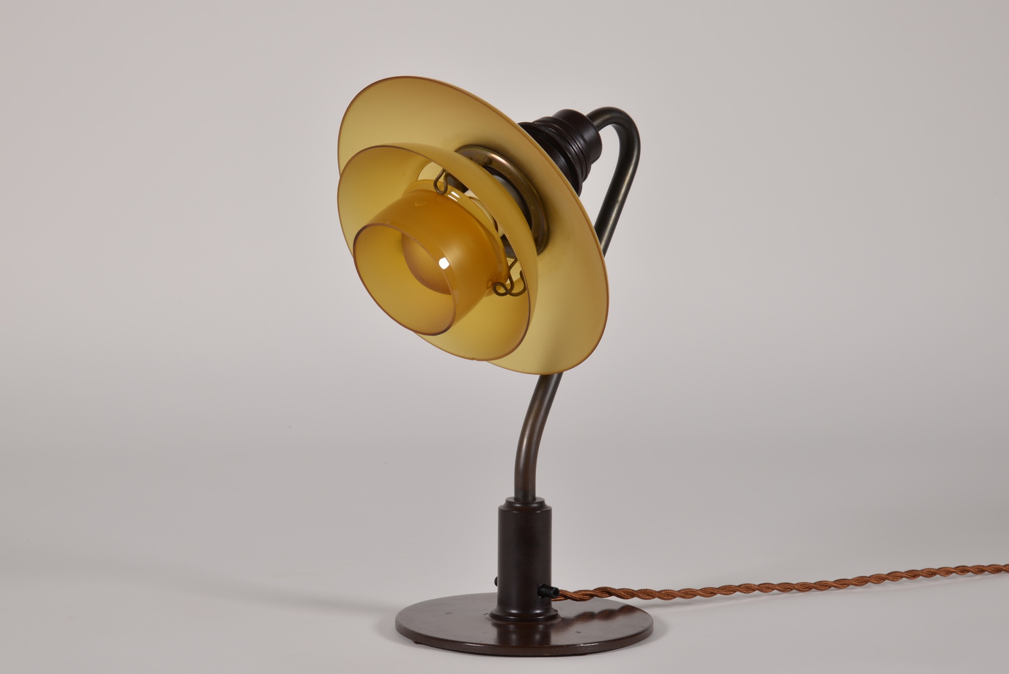 ポール・ヘニングセンによるPH2/2 ”スノードロップ” テーブルランプです。1930年代に作られたものでしょう。ソケットはベークライト製、銅の支柱にアンバーガラスのシェードが相まって美しい佇まいを見せています。