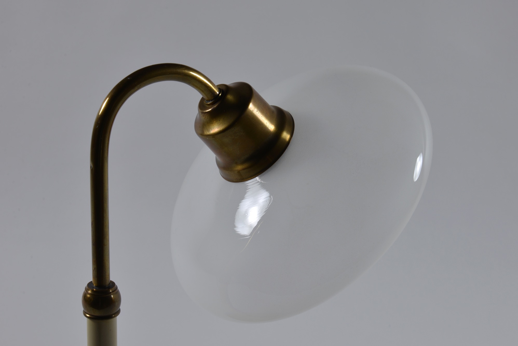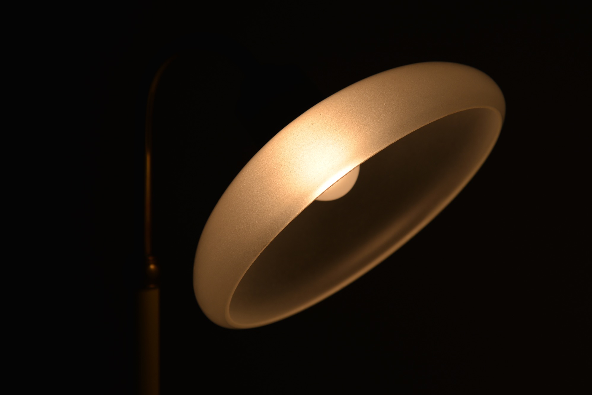 作者、工房、共に不詳のテーブルランプで、1930~40年代頃に作られた製品のようです。真鍮のフレームに、吹きガラスにて形成された腐食フロストのシェードが相まって、クラシカルで落ち着いた佇まいです。