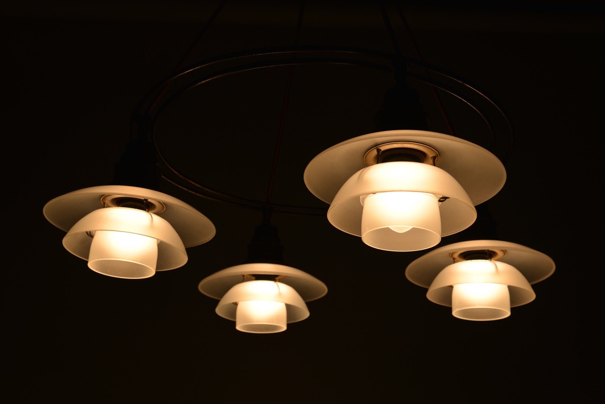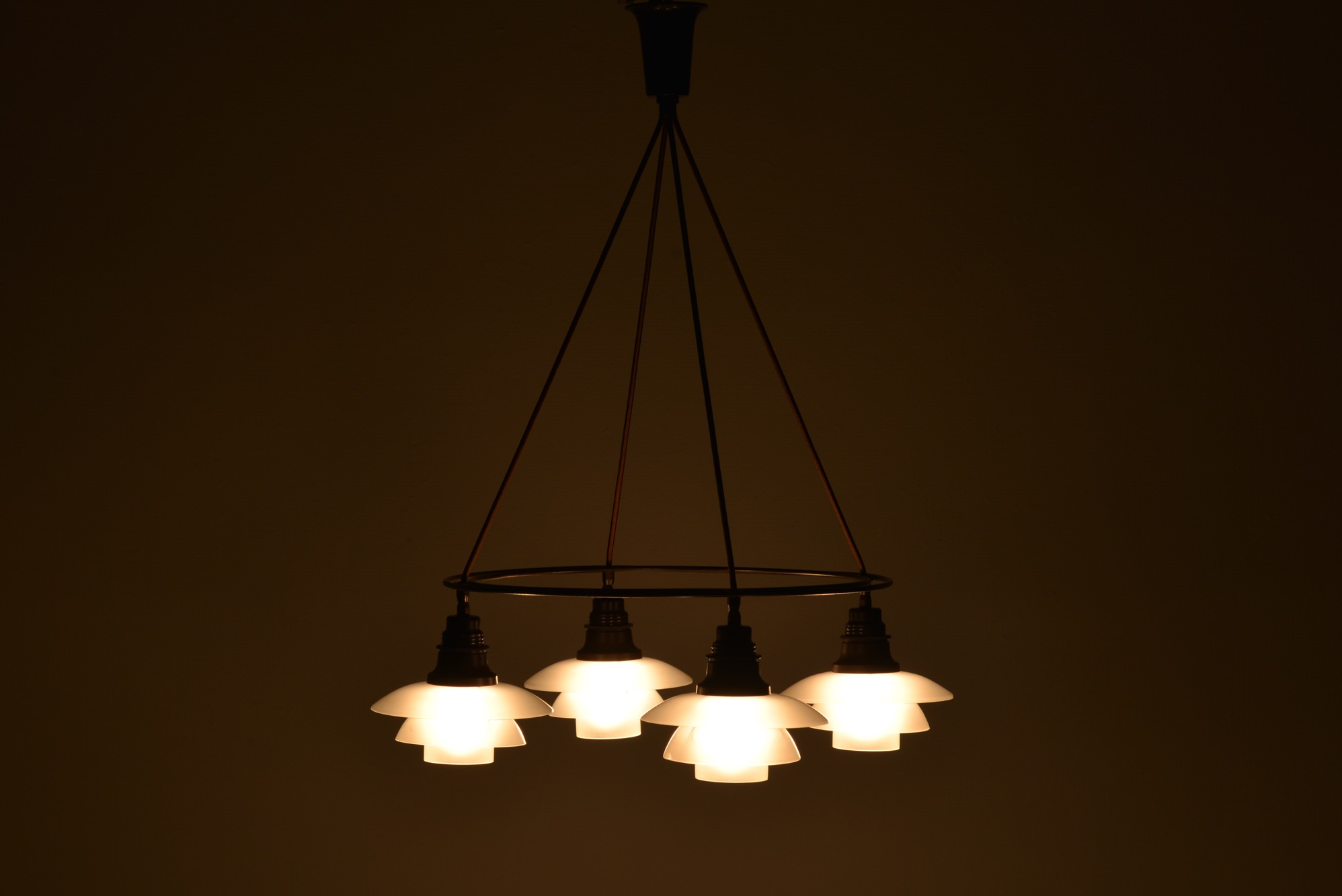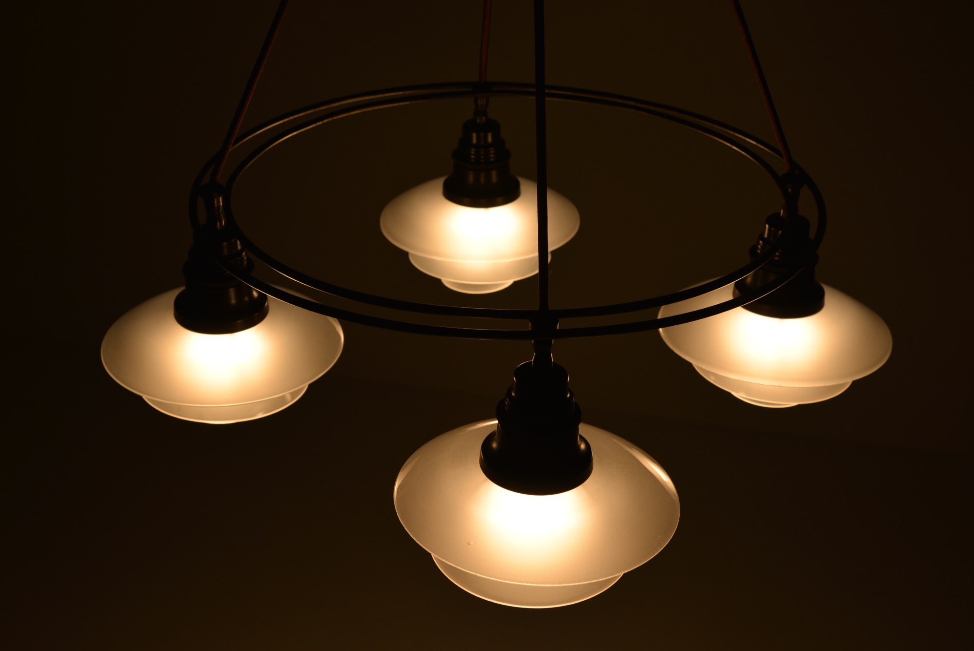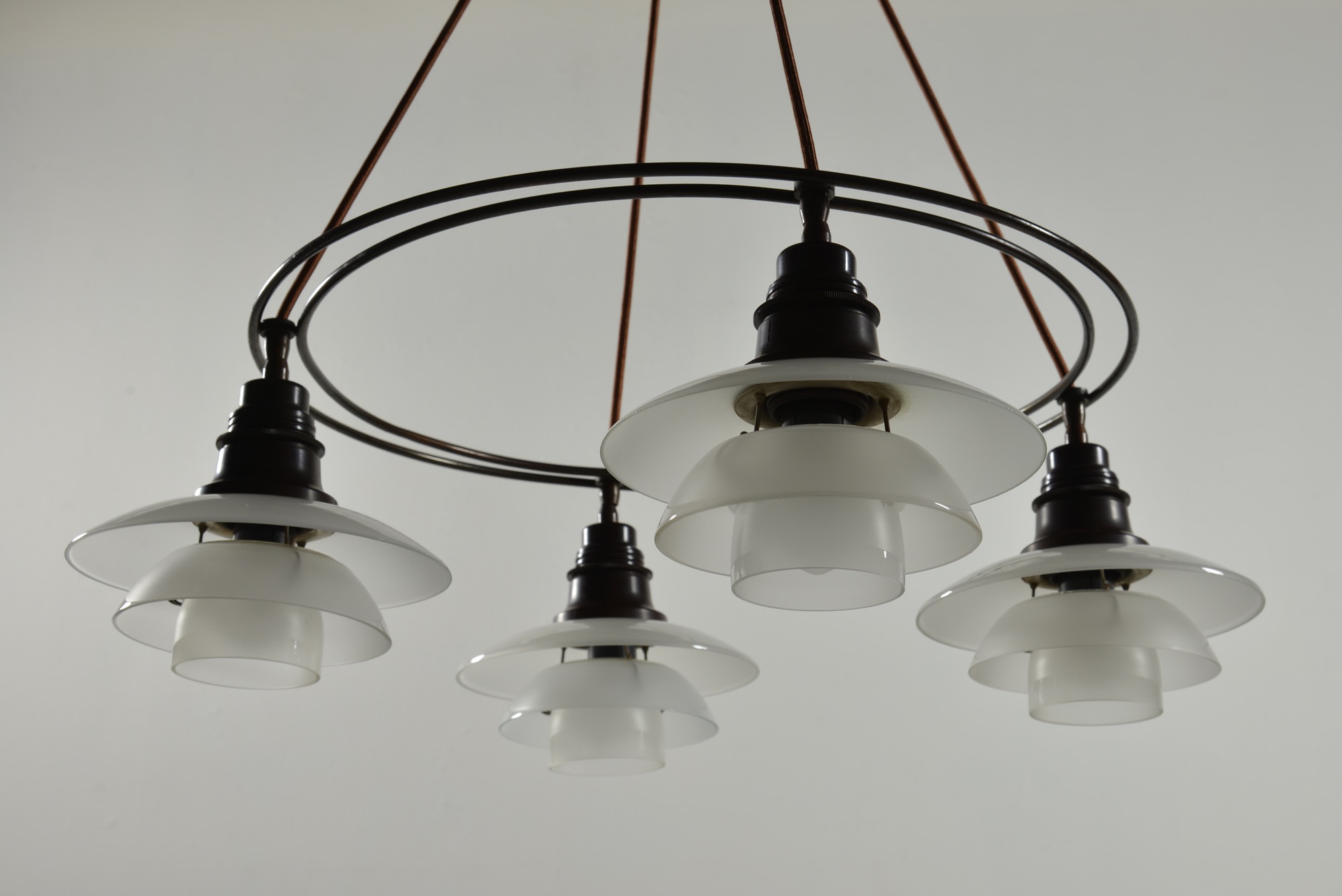 ポール・ヘニングセンによるPH2/2 "ツインリング" シャンデリア、1930年代の製品です。4つのランプを銅製二重環状のフレームに通すだけの構造のもので、ベークライト素材のソケットに2/2の腐食フロストガラスシェード、ボトムボウル付きの構成です。お部屋に合わせて配線の長さの調整は行えますので、詳しくはお問い合わせください。
