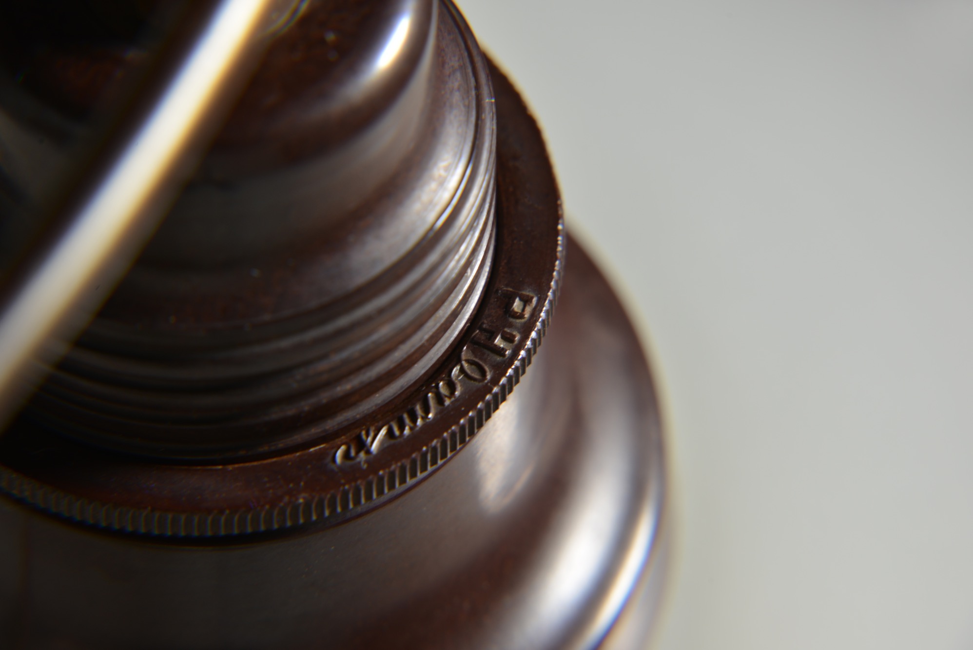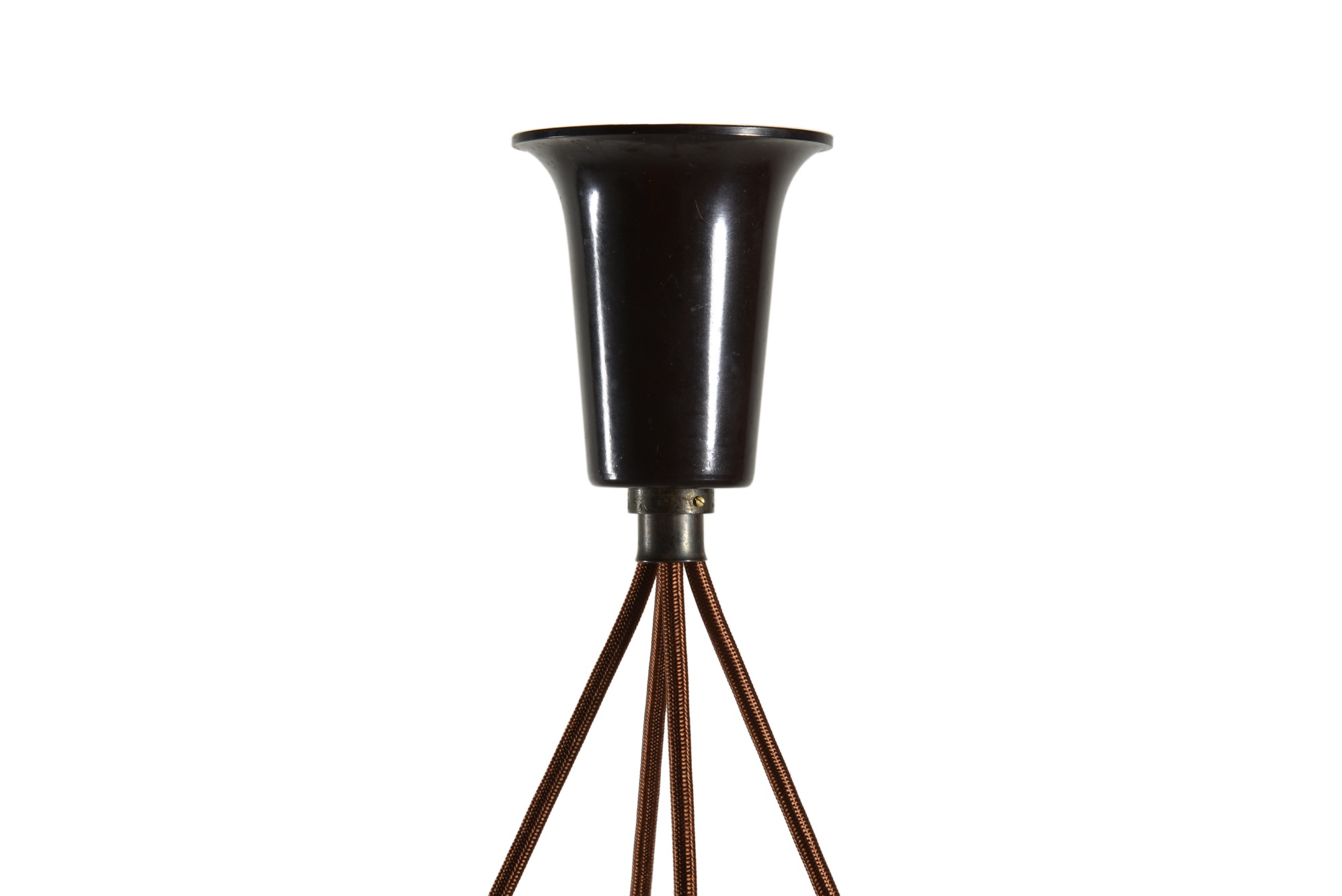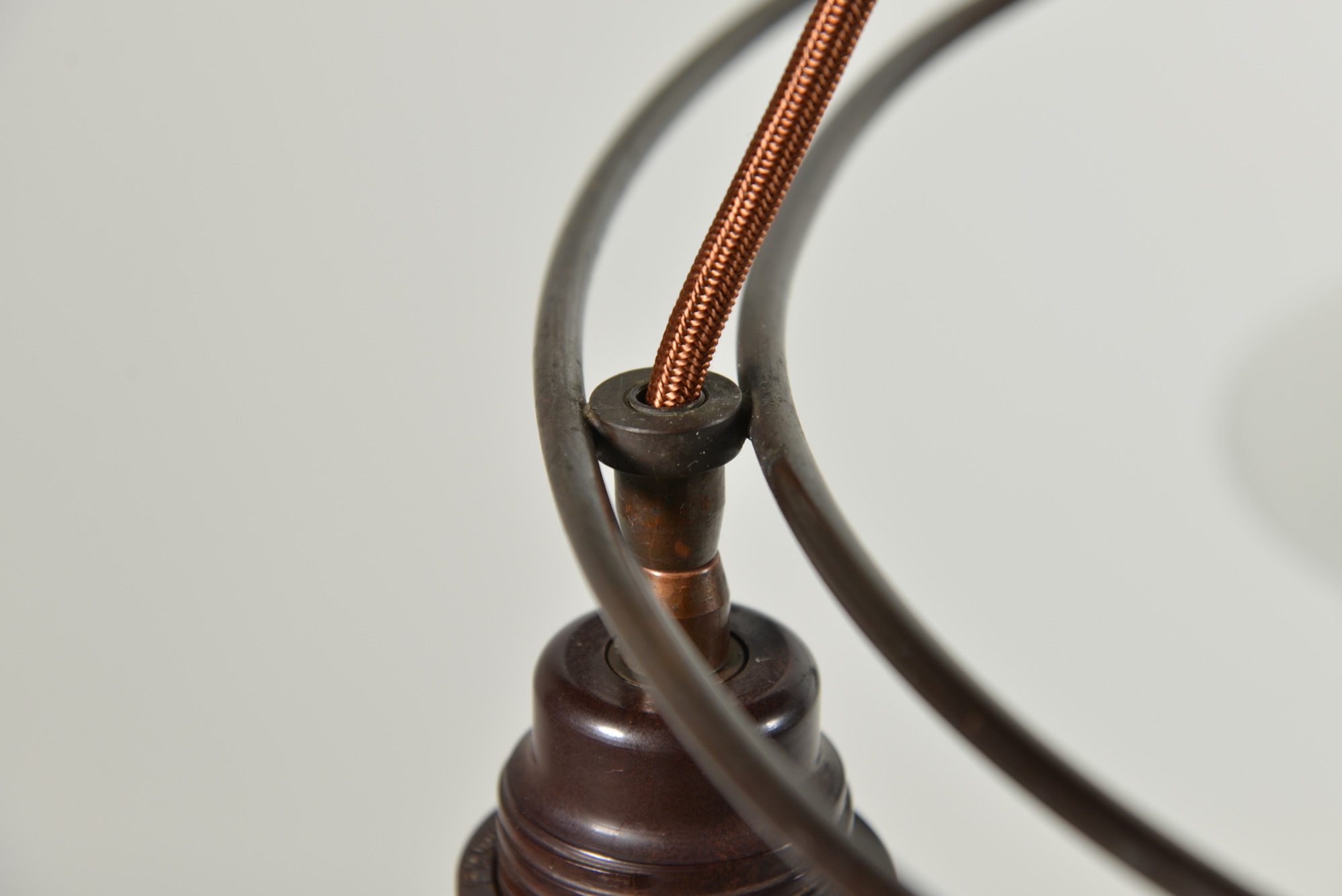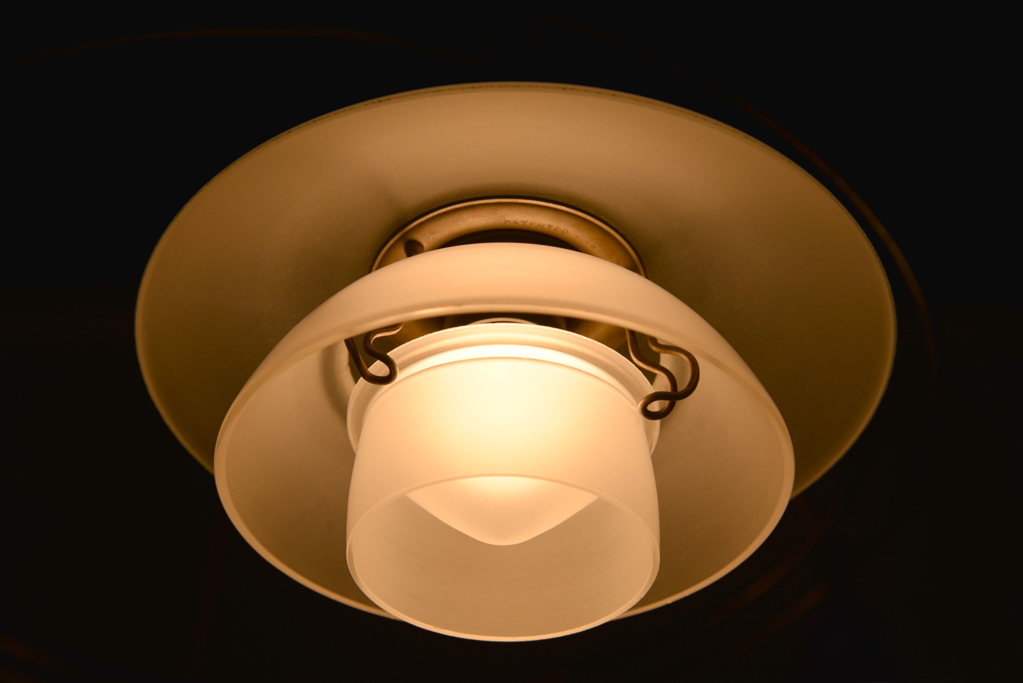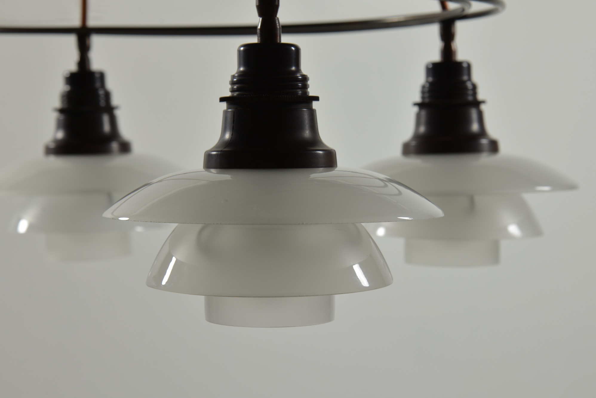 ポール・ヘニングセンによるPH2/2 "ツインリング" シャンデリア、1930年代の製品です。4つのランプを銅製二重環状のフレームに通すだけの構造のもので、ベークライト素材のソケットに2/2の腐食フロストガラスシェード、ボトムボウル付きの構成です。お部屋に合わせて配線の長さの調整は行えますので、詳しくはお問い合わせください。