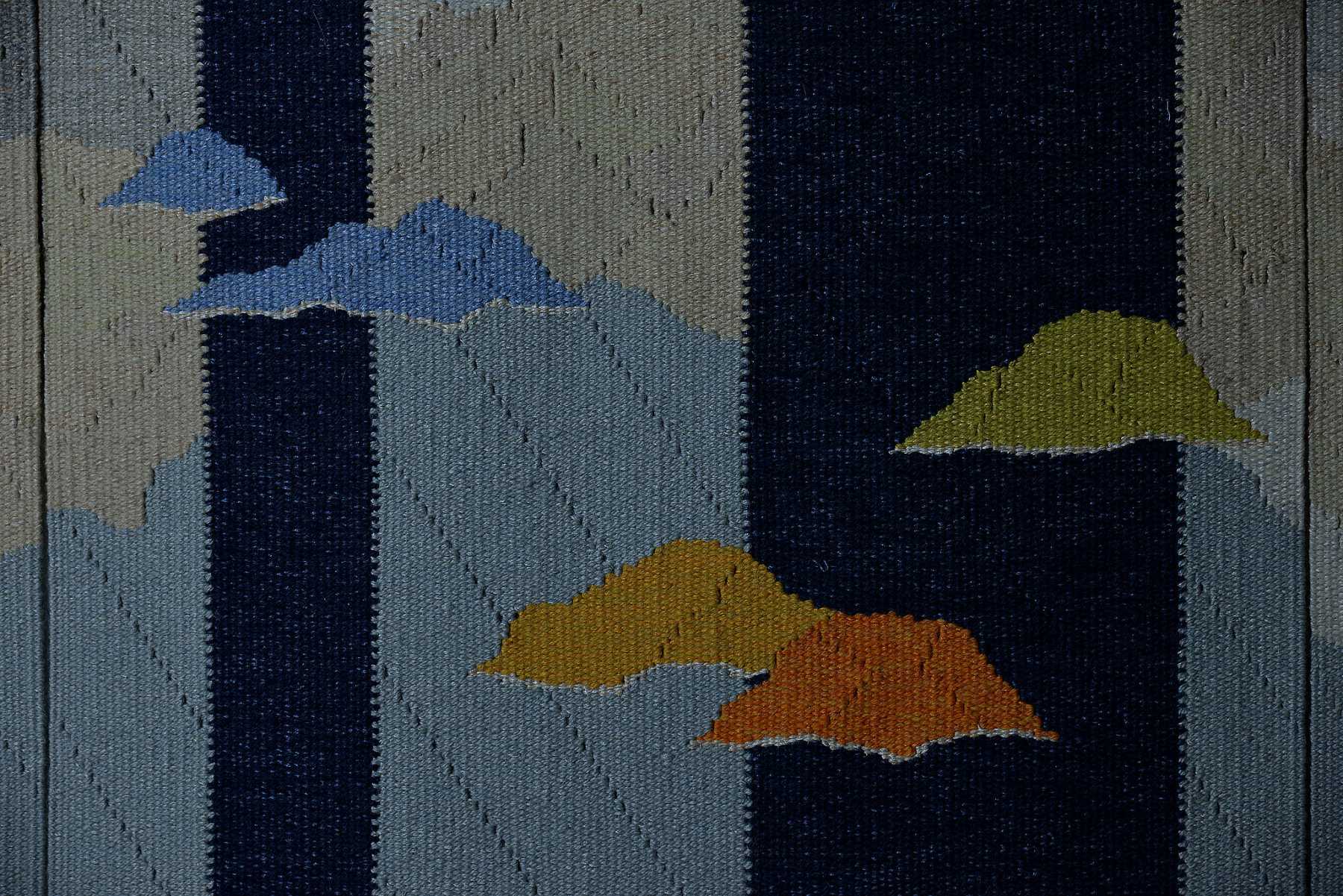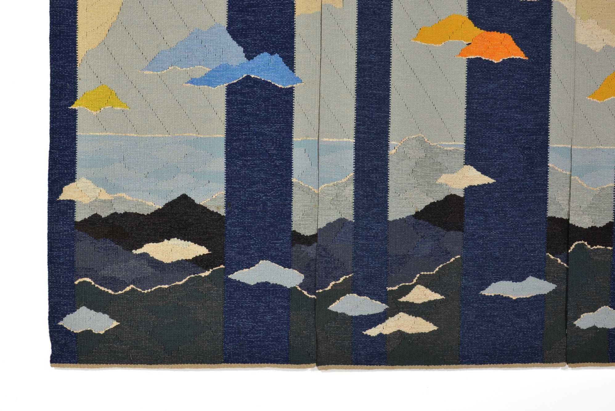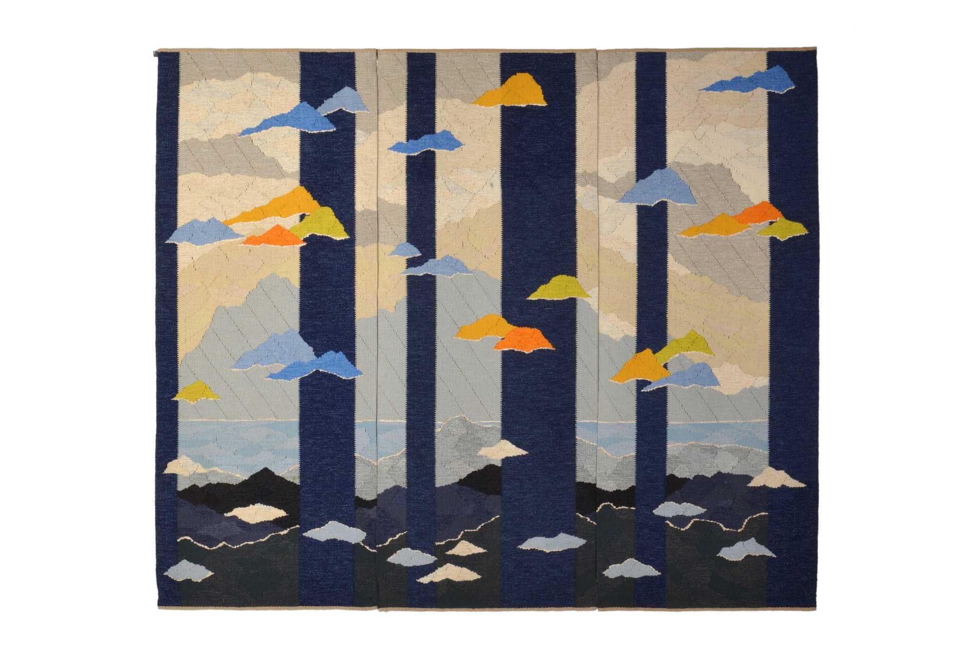 デンマークの工芸家、ヴィーベケ・グレガースによるタペストリー、"Travel Through Landscape" 三幅対の構成で、1981年に織られたものです。この作家についての情報は少なく詳細は判っておりませんが、教会のタペストリーや祭壇装飾を手がけており、表現やその技術が高く評価された作家のようです。