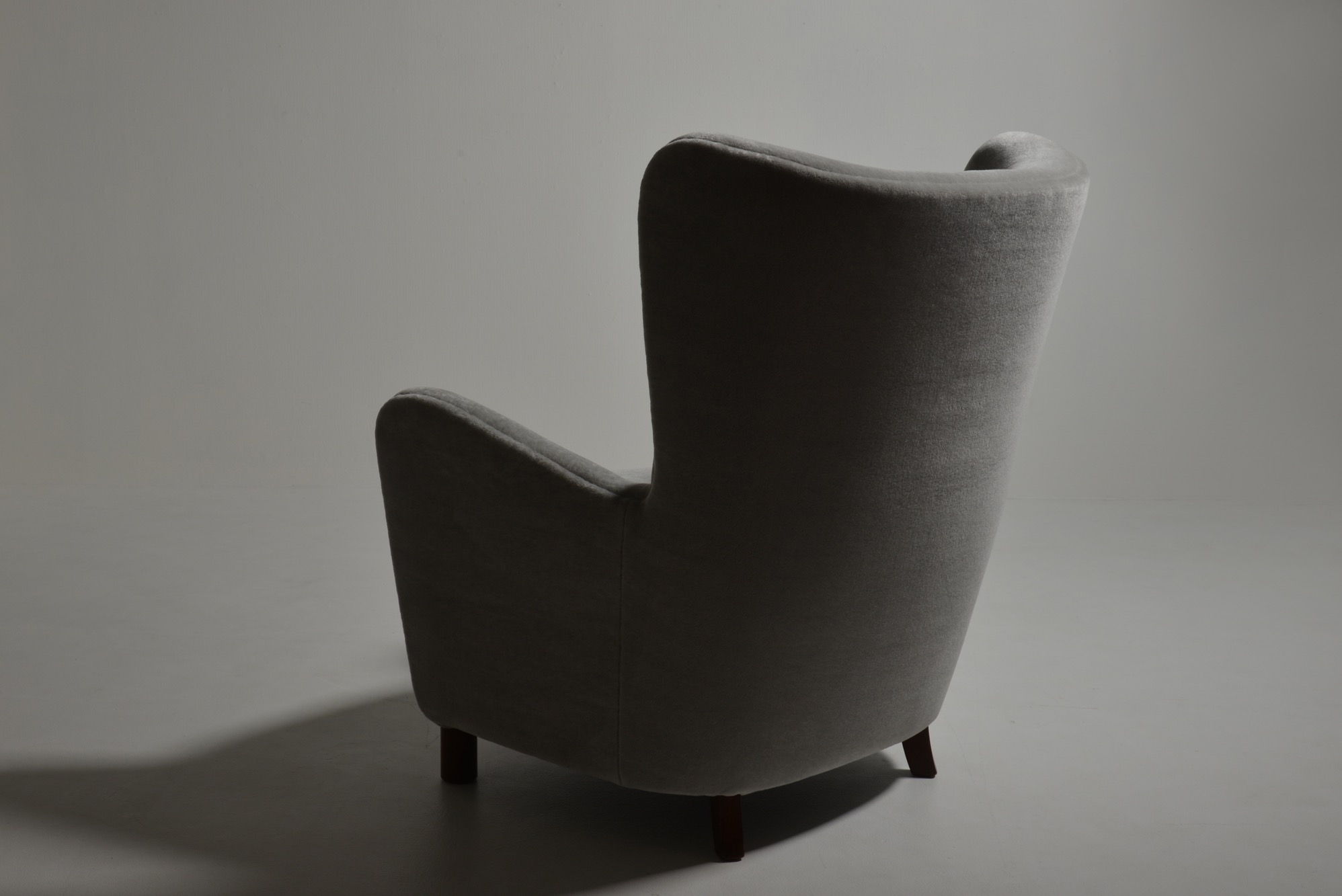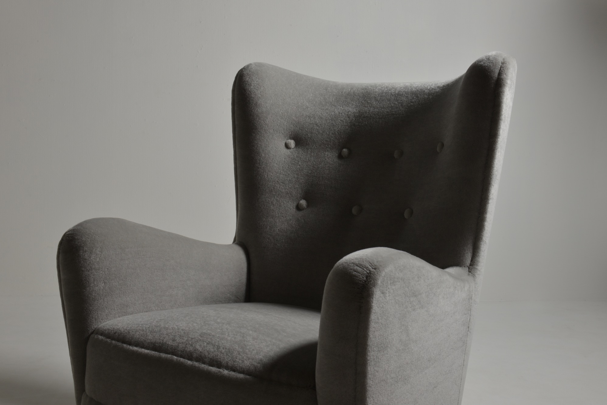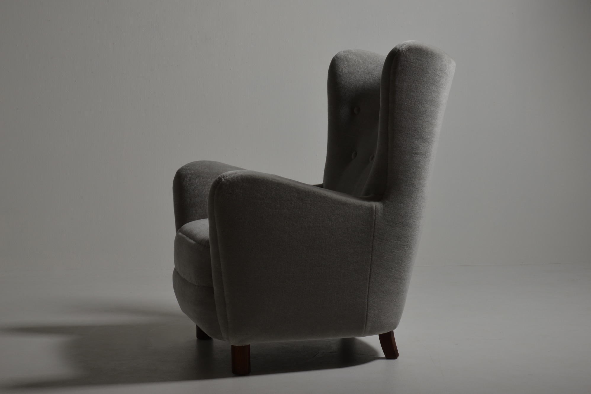 デンマークを代表する家具工房、フリッツ・ハンセンによって1940年代に作られた張り包みのイージーチェアです。デンマークの生地メーカー、Danish Art Weaving社によるアンゴラヤギのモヘア生地 "Marimba Mohair" を用いて張り替えました。肌触りの良い生地で、きれいに張り上がっています。