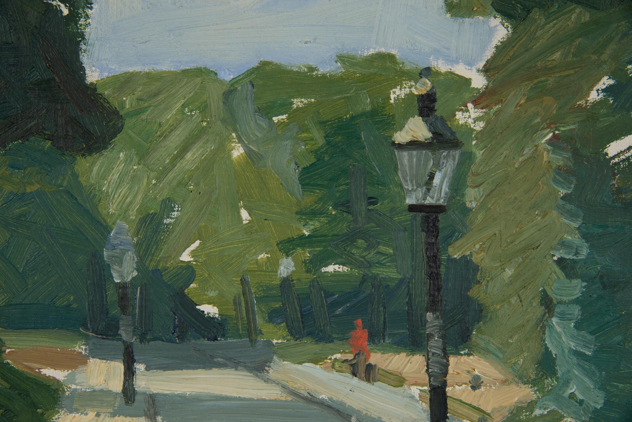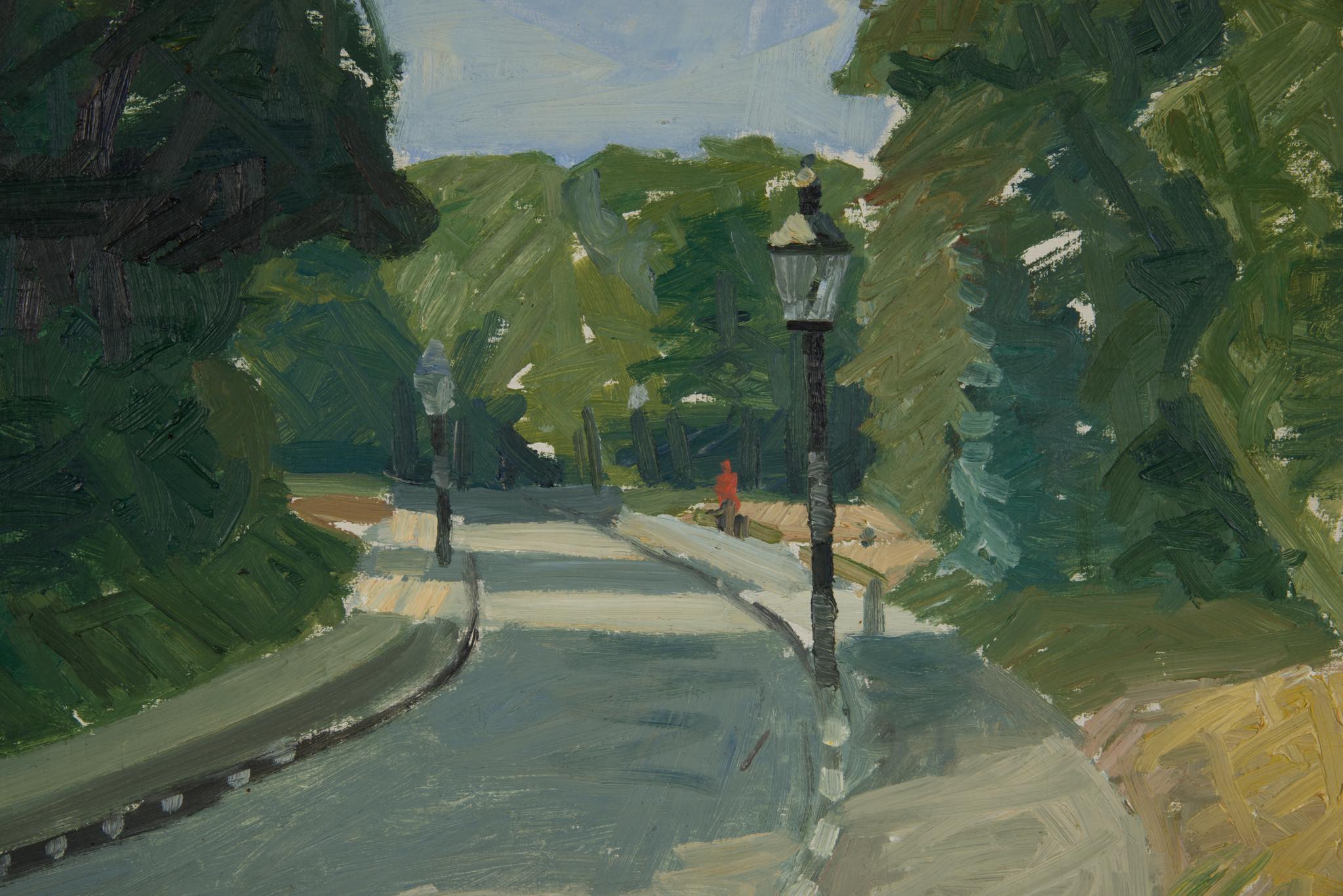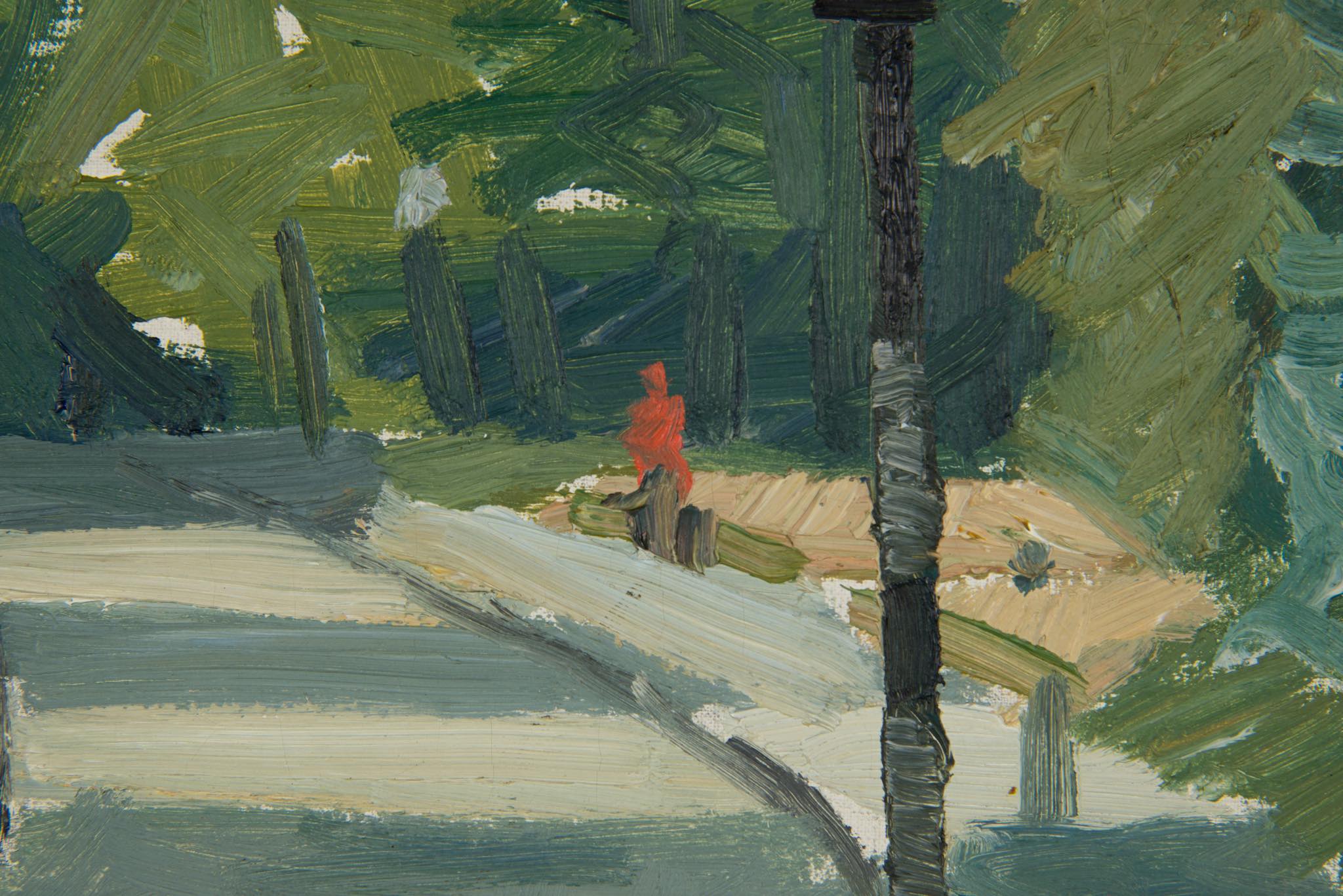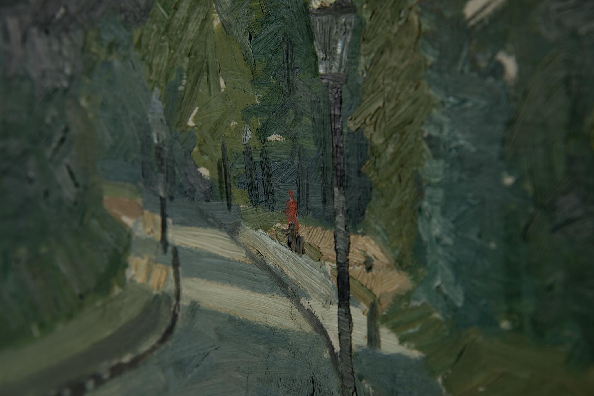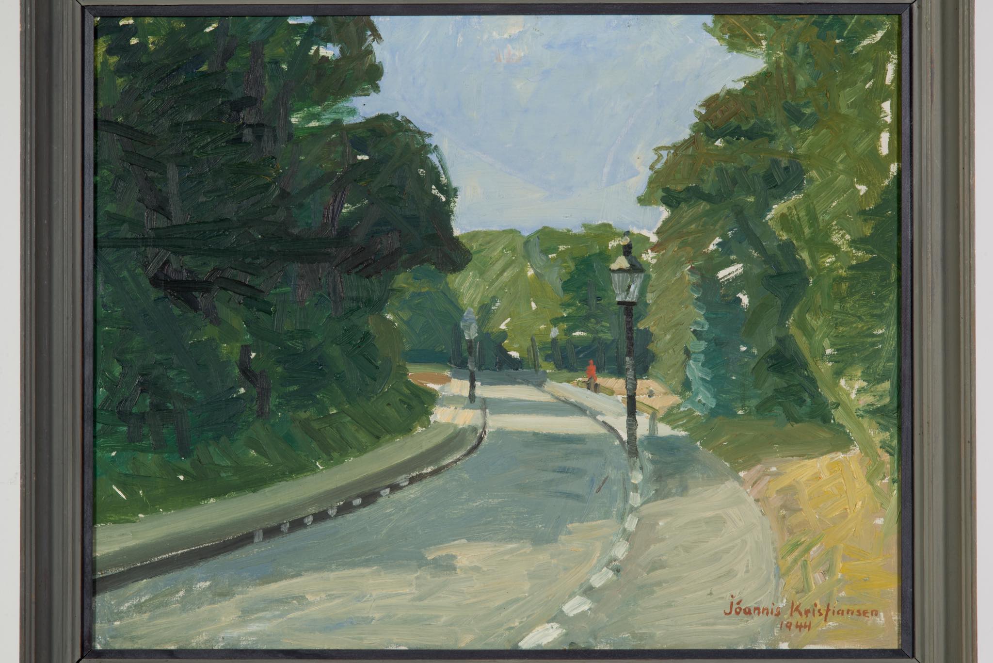 デンマーク領、フェロー諸島出身の画家、 ヨハニス・クリスチャンセンによる初夏の風景画作品です。赤い衣服を纏った女性が静かな初夏の道を自転車で走り抜けるひと時の風景が描かれています。サインにある1944年は、氏が故郷のフェローへ戻る前の年となり、暫し滞在したコペンハーゲンの周辺か、郊外の景色を描いたものと思われます。