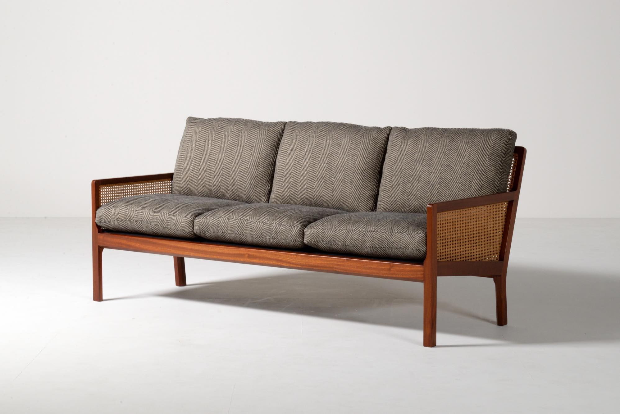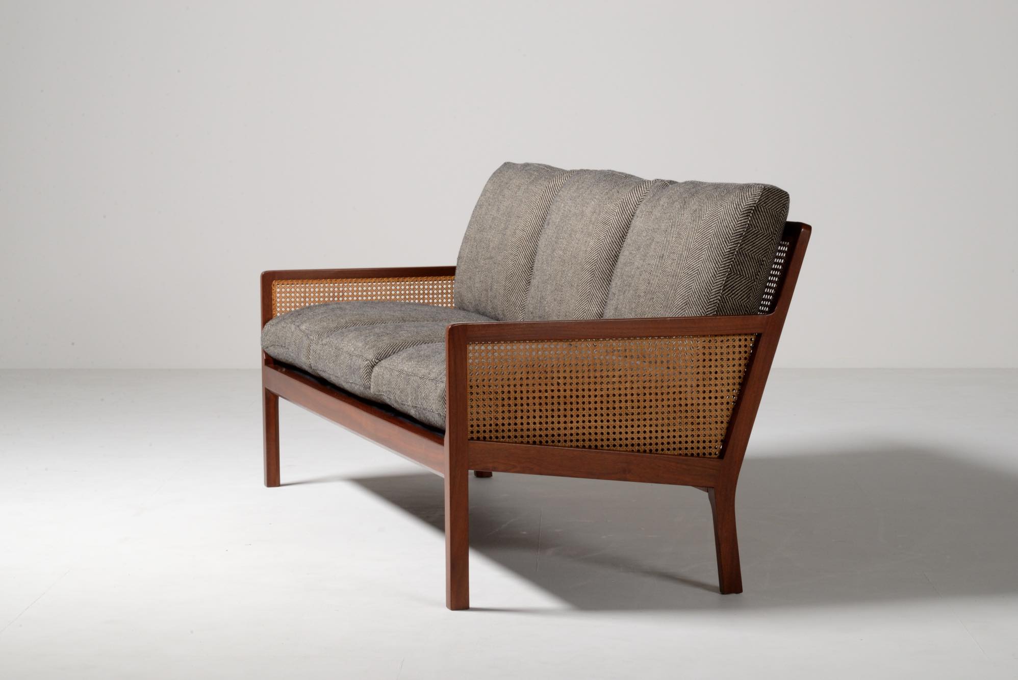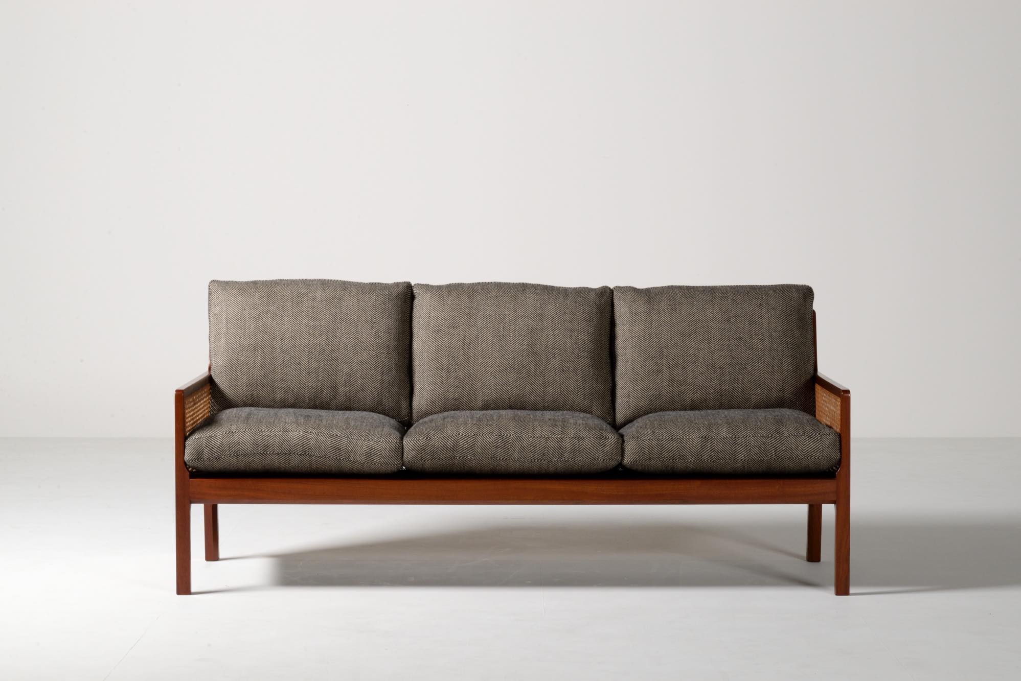 デンマークのデザイナー、Bernt Petersen/ベアント・ピーターセンによる籐張りのソファです。1964年に発表されたシリーズで、こちらもその頃に作られたものでしょう。アームにクッションの備わらない、ひとまわり小振りな3人掛けのタイプです。フレームはマホガニー材が用いられており、背もたれとアーム下には籐張りが施されています。ファブリックはイタリアのロロ・ピアーナ・インテリアのリネンの椅子張り用生地にて張り替えました。とても綺麗な状態です。