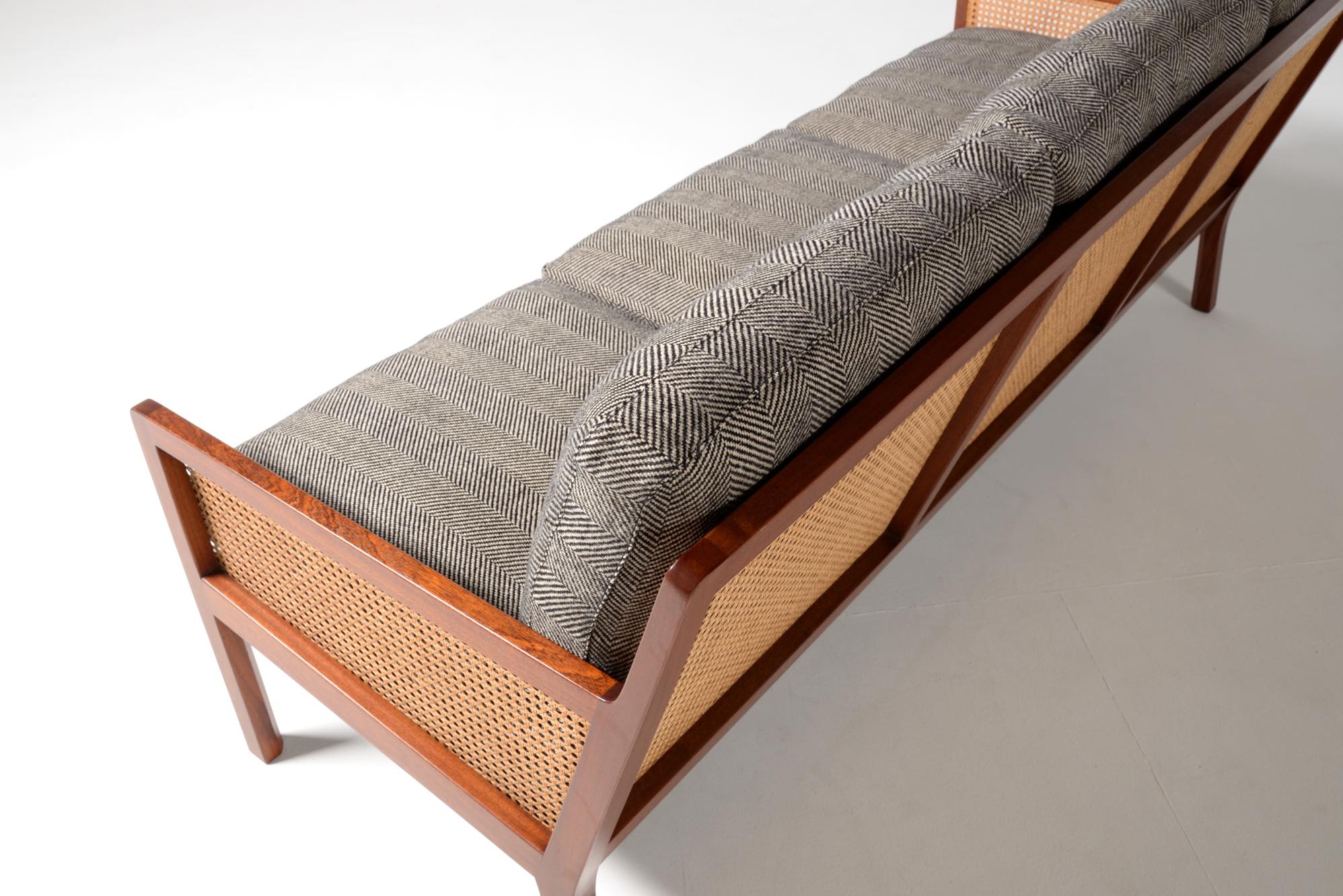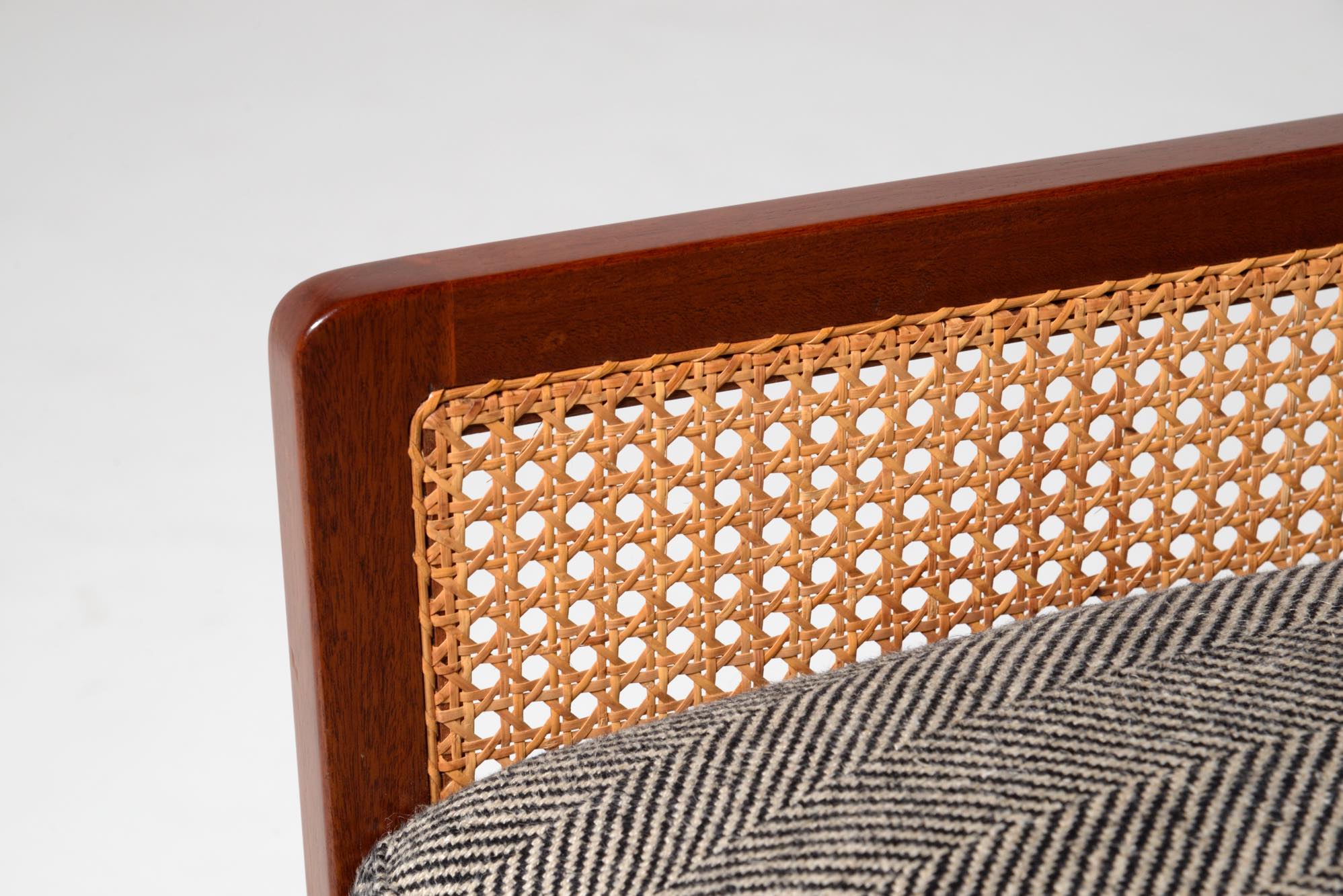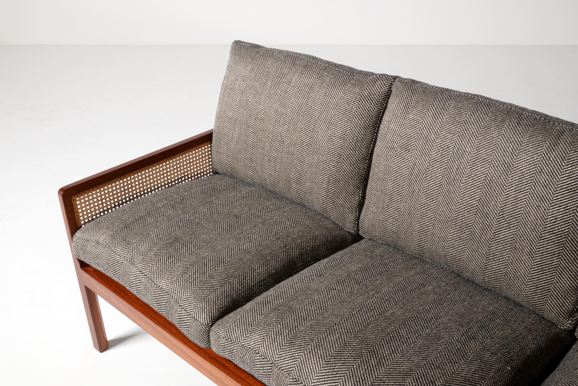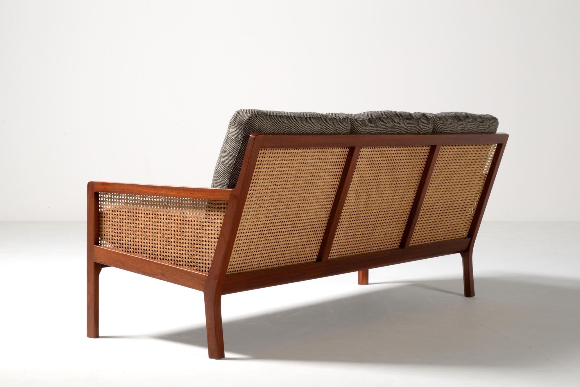 デンマークのデザイナー、Bernt Petersen/ベアント・ピーターセンによる籐張りのソファです。1964年に発表されたシリーズで、こちらもその頃に作られたものでしょう。アームにクッションの備わらない、ひとまわり小振りな3人掛けのタイプです。フレームはマホガニー材が用いられており、背もたれとアーム下には籐張りが施されています。ファブリックはイタリアのロロ・ピアーナ・インテリアのリネンの椅子張り用生地にて張り替えました。とても綺麗な状態です。