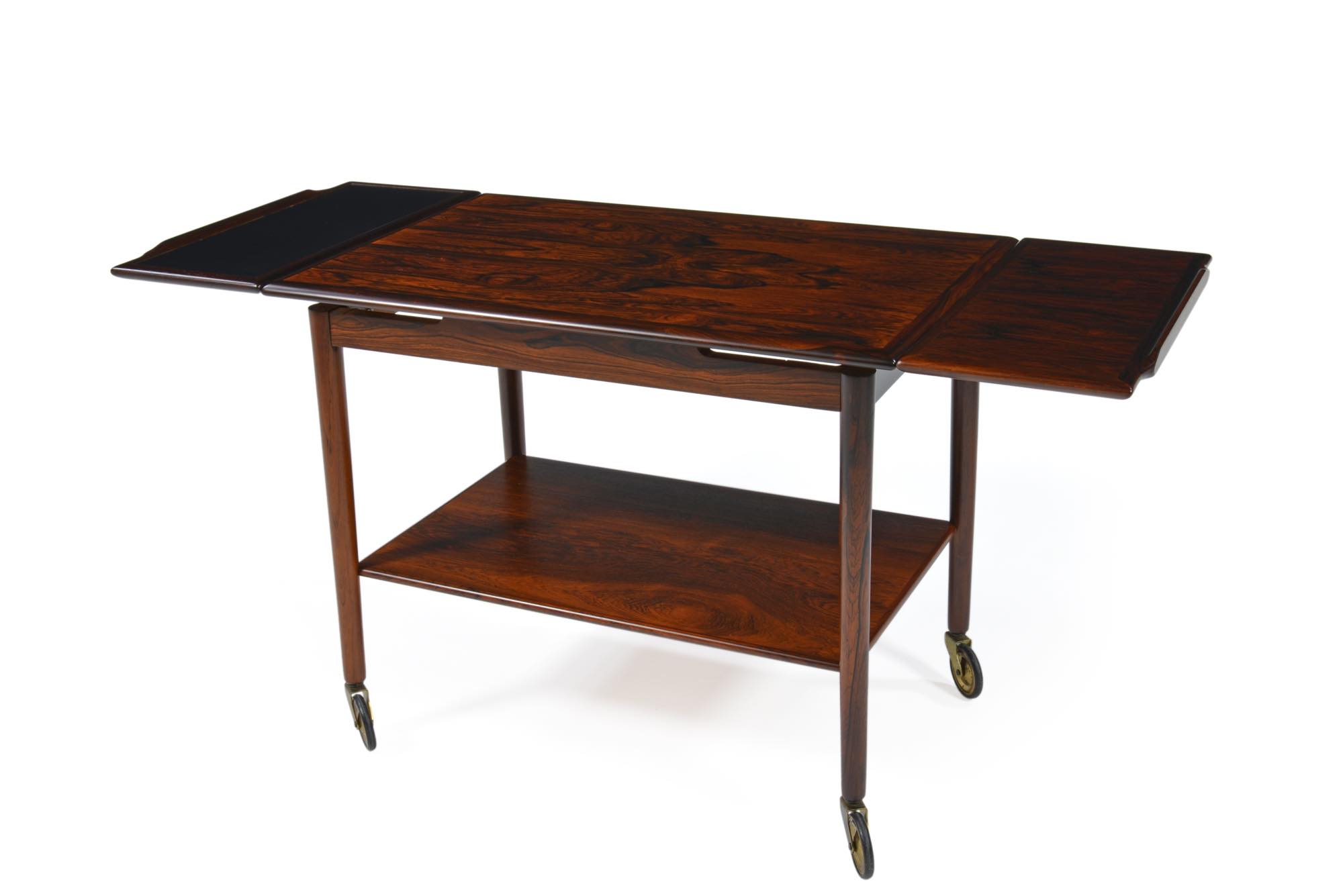 1960年代に作られたローズウッドのトローリーです。カクテルを作るなど水分の伴う作業台として、エクステンションリーフに黒のフォーマイカ材が張られた作りのものです。