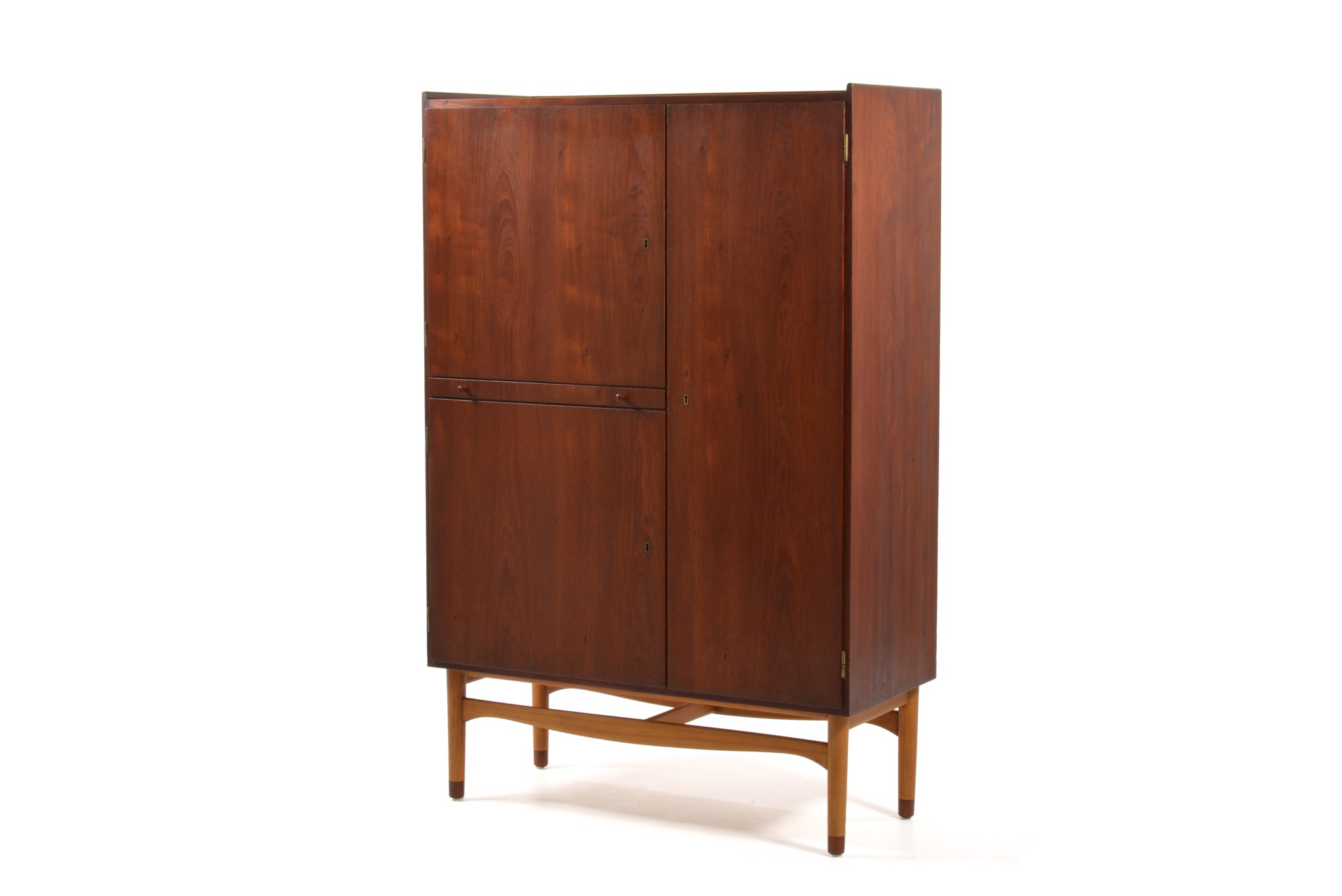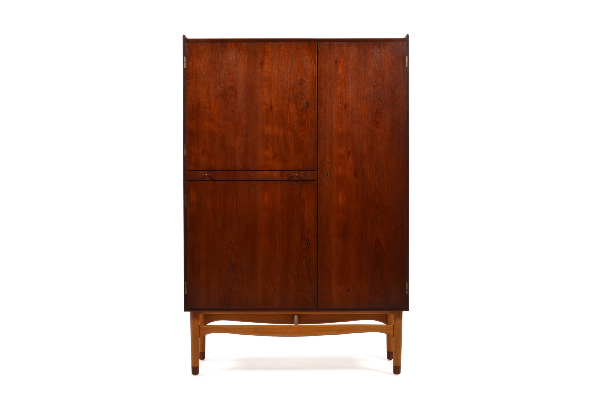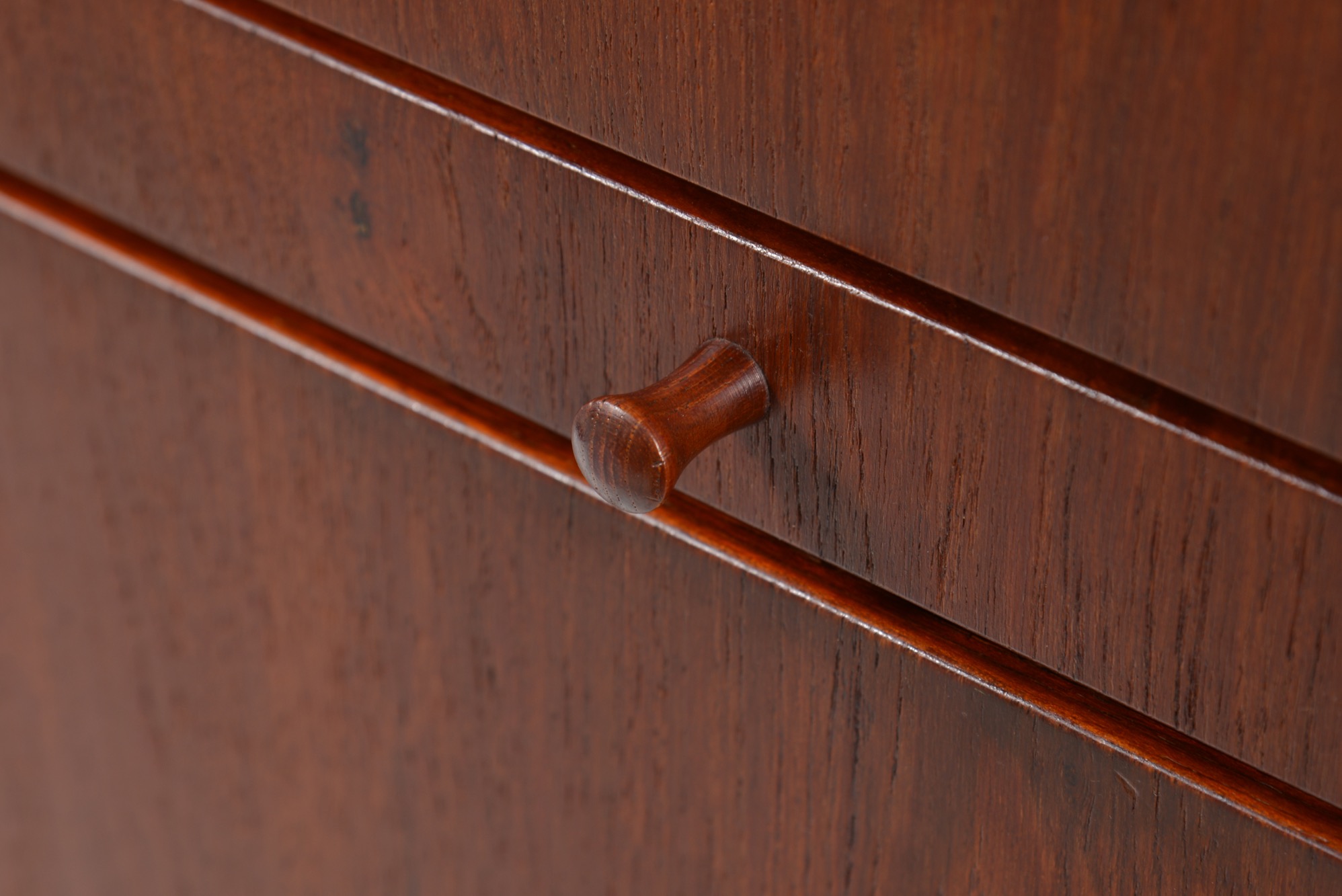 フィン・ユールによるカップボードキャビネットです。ボヴィルケ工房によるもので、フィン・ユール作品の中では古い時代のプロダクトです。チーク材の本体にビーチ材の脚部、チーク材のシューが備わるもので、時代の趣が反映されたデザインとなっています。扉内の抽斗は差す位置を変えることで、嵩のある小物も仕舞うことができ、デンマークではティーカップなど2客くらいを重ねて収納したりします。鍵が二本付属します。