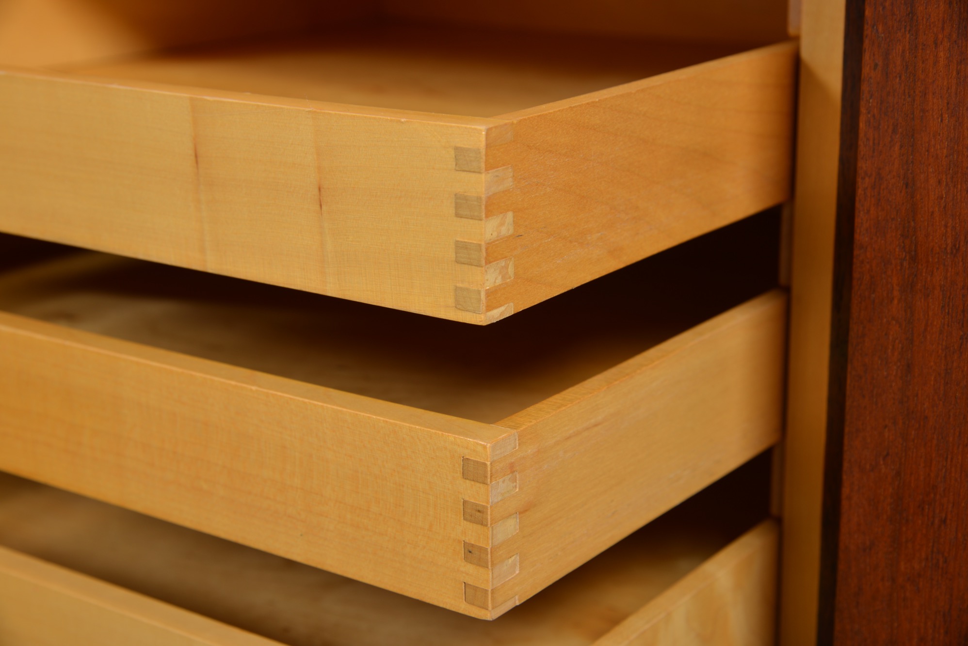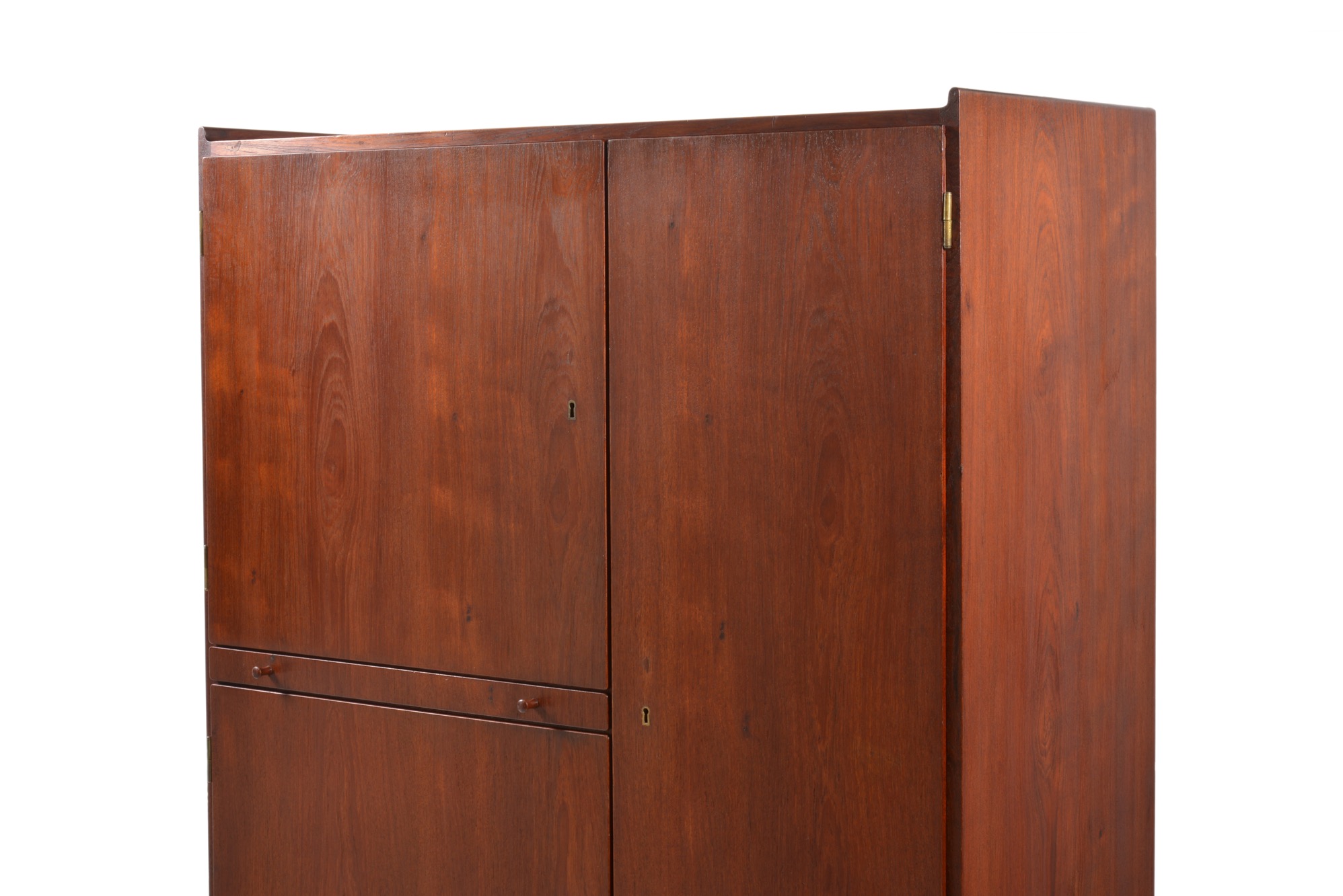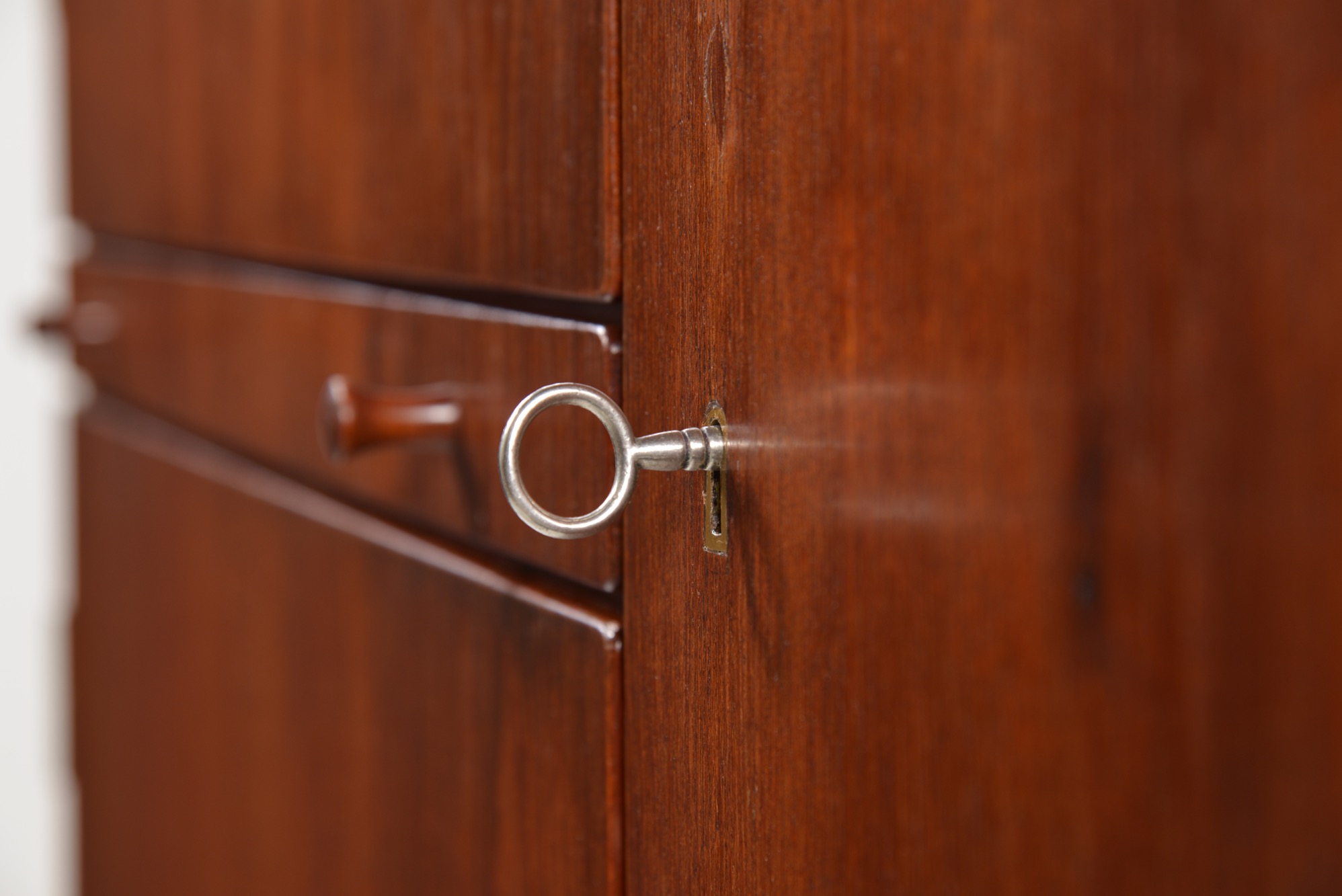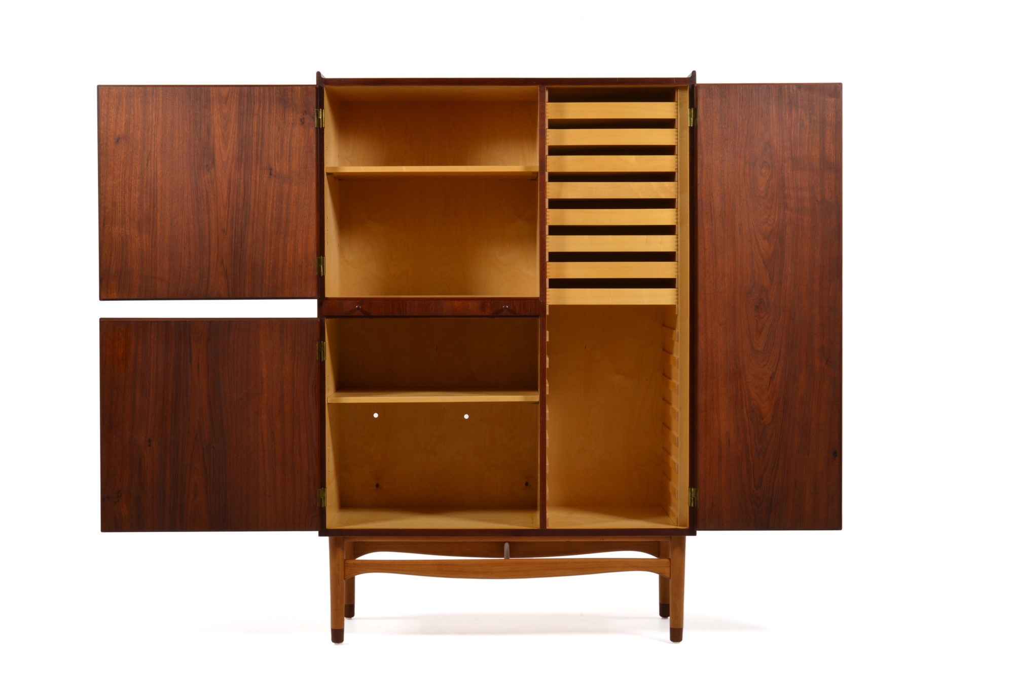 フィン・ユールによるカップボードキャビネットです。ボヴィルケ工房によるもので、フィン・ユール作品の中では古い時代のプロダクトです。チーク材の本体にビーチ材の脚部、チーク材のシューが備わるもので、時代の趣が反映されたデザインとなっています。扉内の抽斗は差す位置を変えることで、嵩のある小物も仕舞うことができ、デンマークではティーカップなど2客くらいを重ねて収納したりします。鍵が二本付属します。