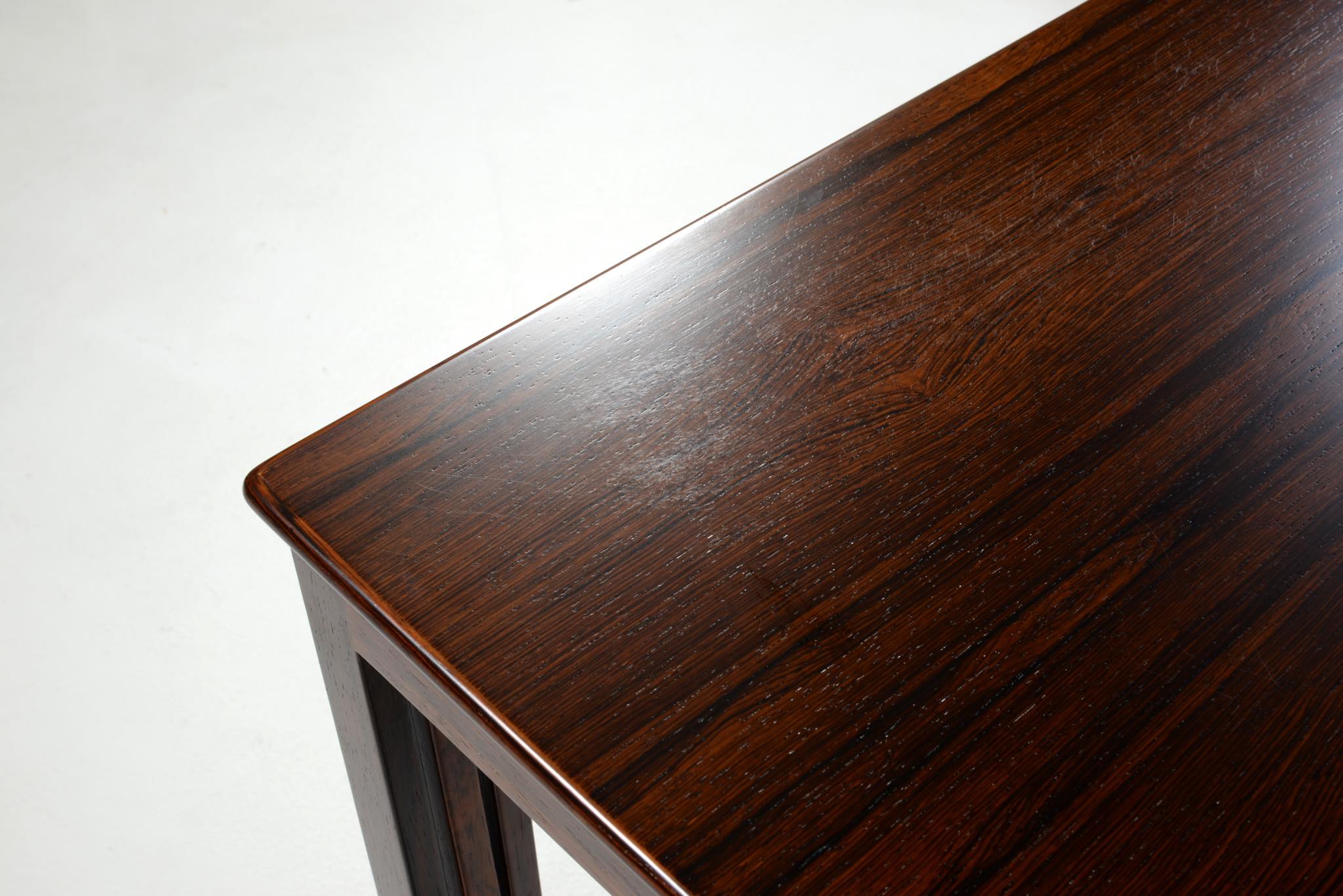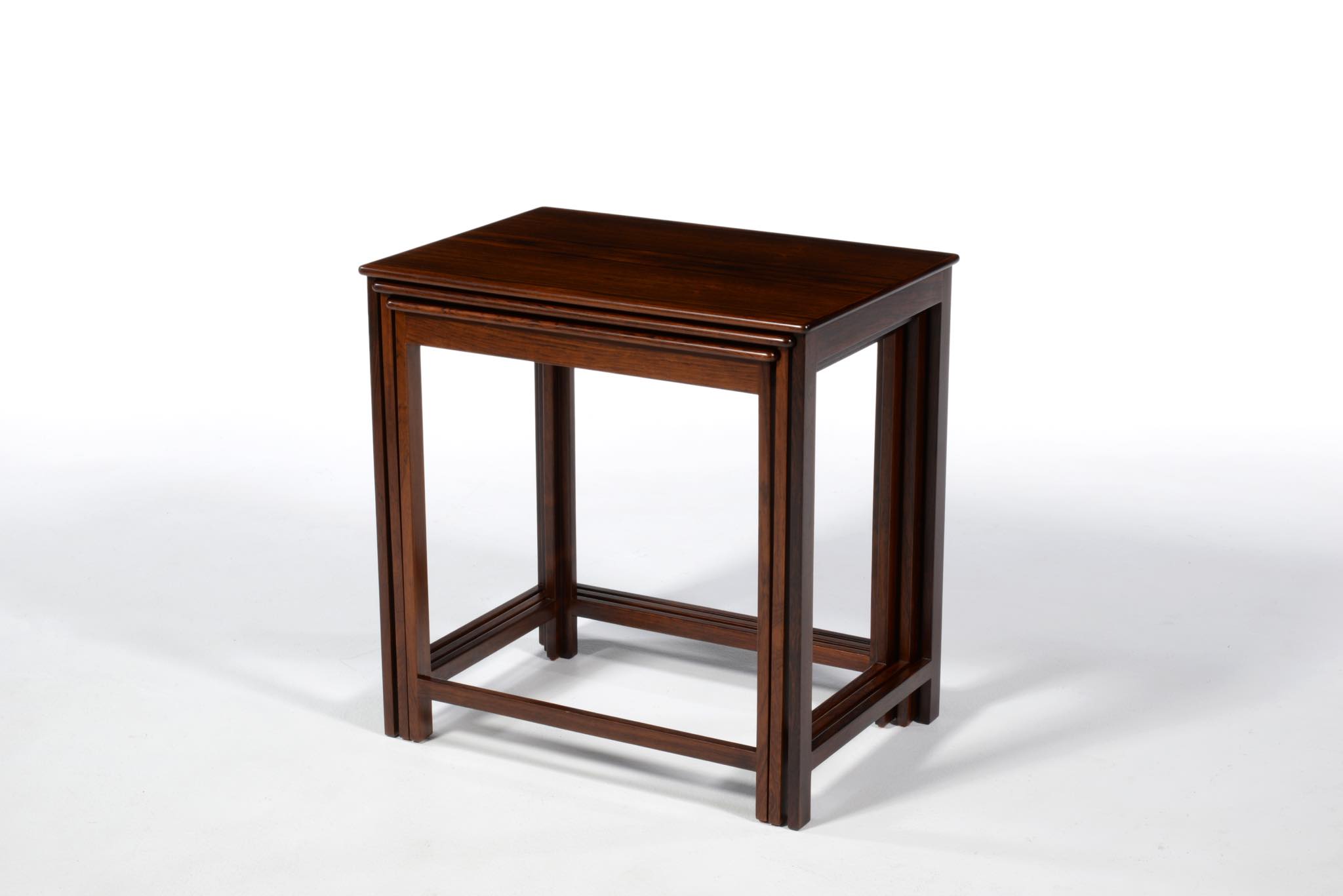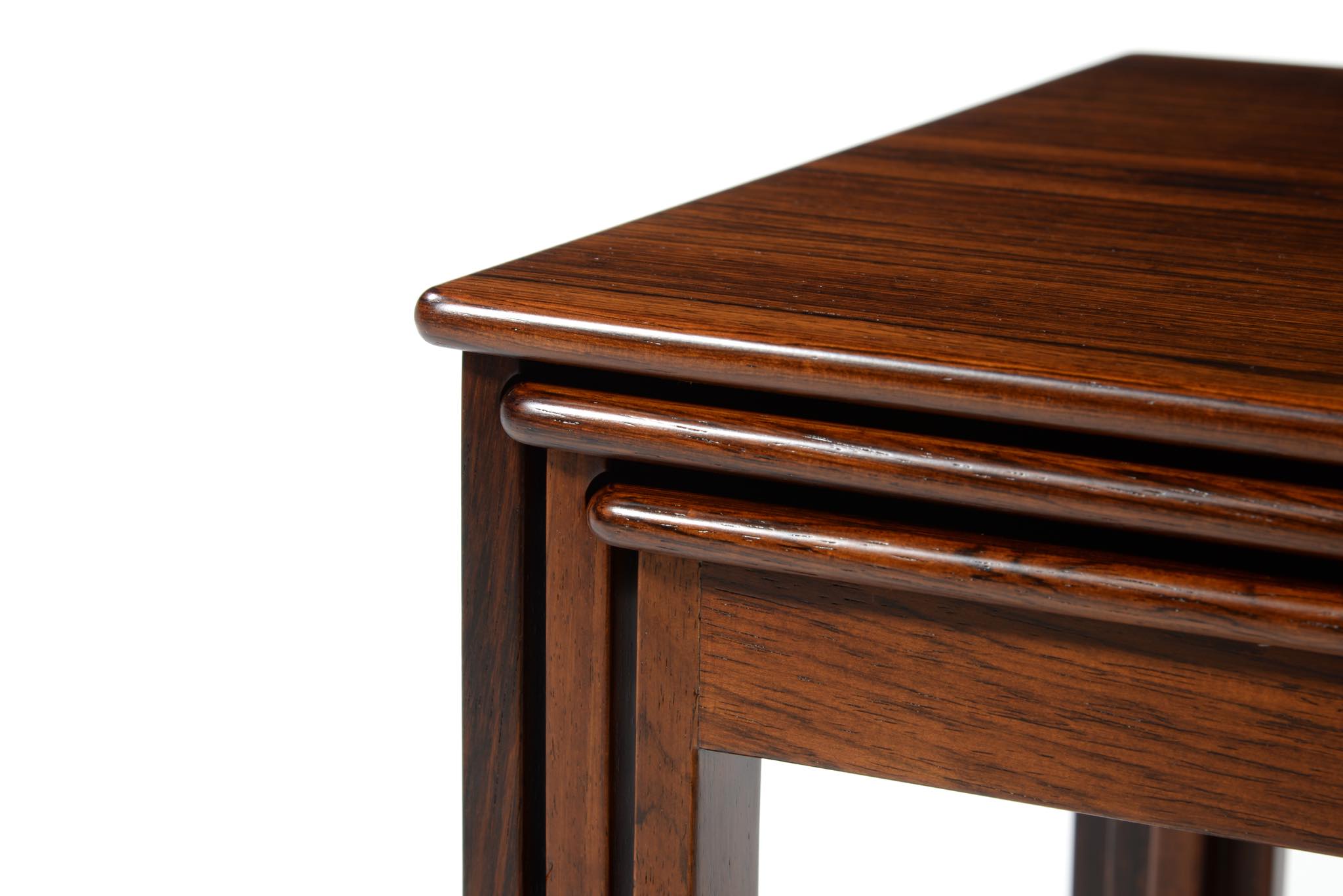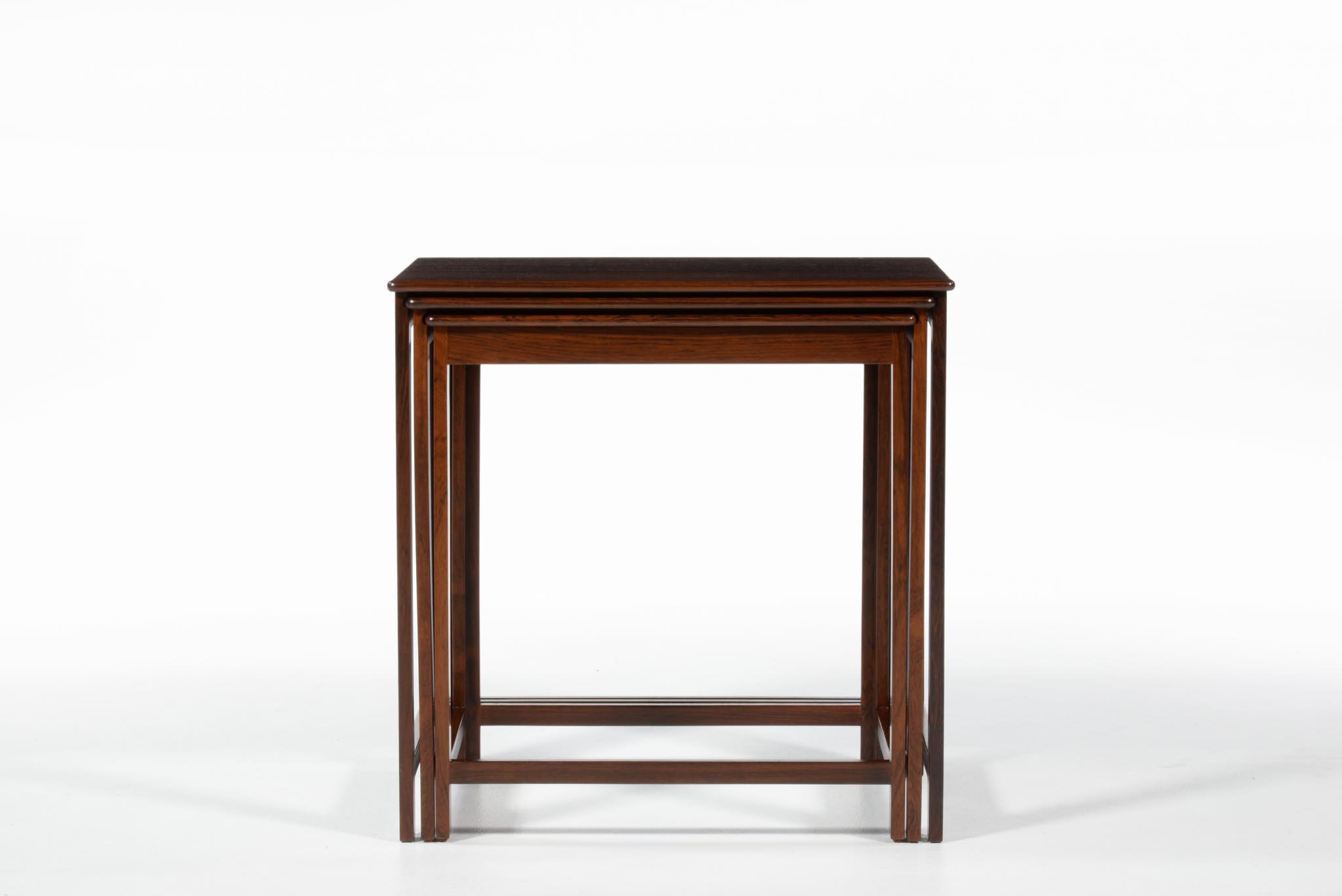 デンマークを代表するデザイナーでキャビネットメーカーの、Jacob Kjær/ヤコブ・ケアによるネストテーブルです。1950年代頃のものでしょう。名工、ルド・ラスムッセン工房、或いは、ヤコブ・ケア工房にて作られたようです。天板は突き板のタイプで、良質なローズウッド材が用いられています。