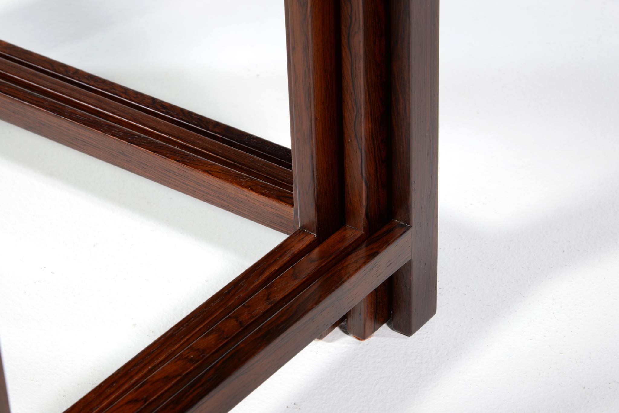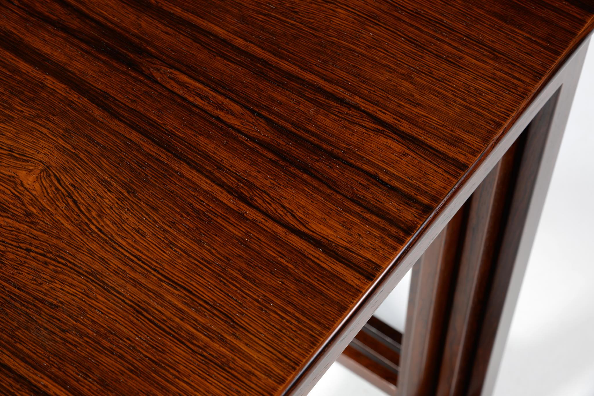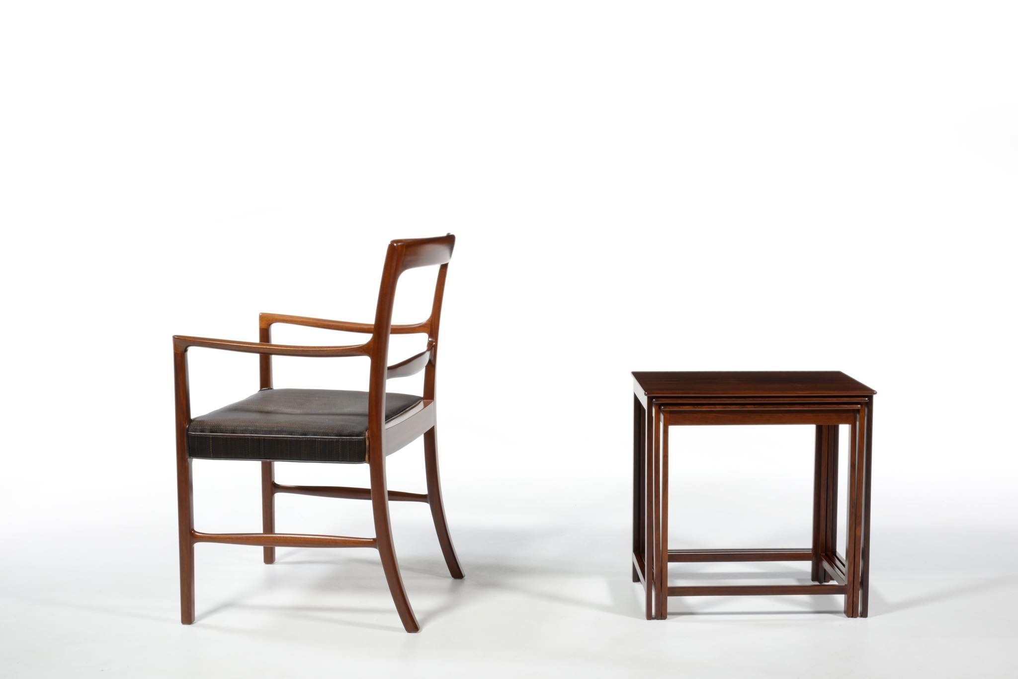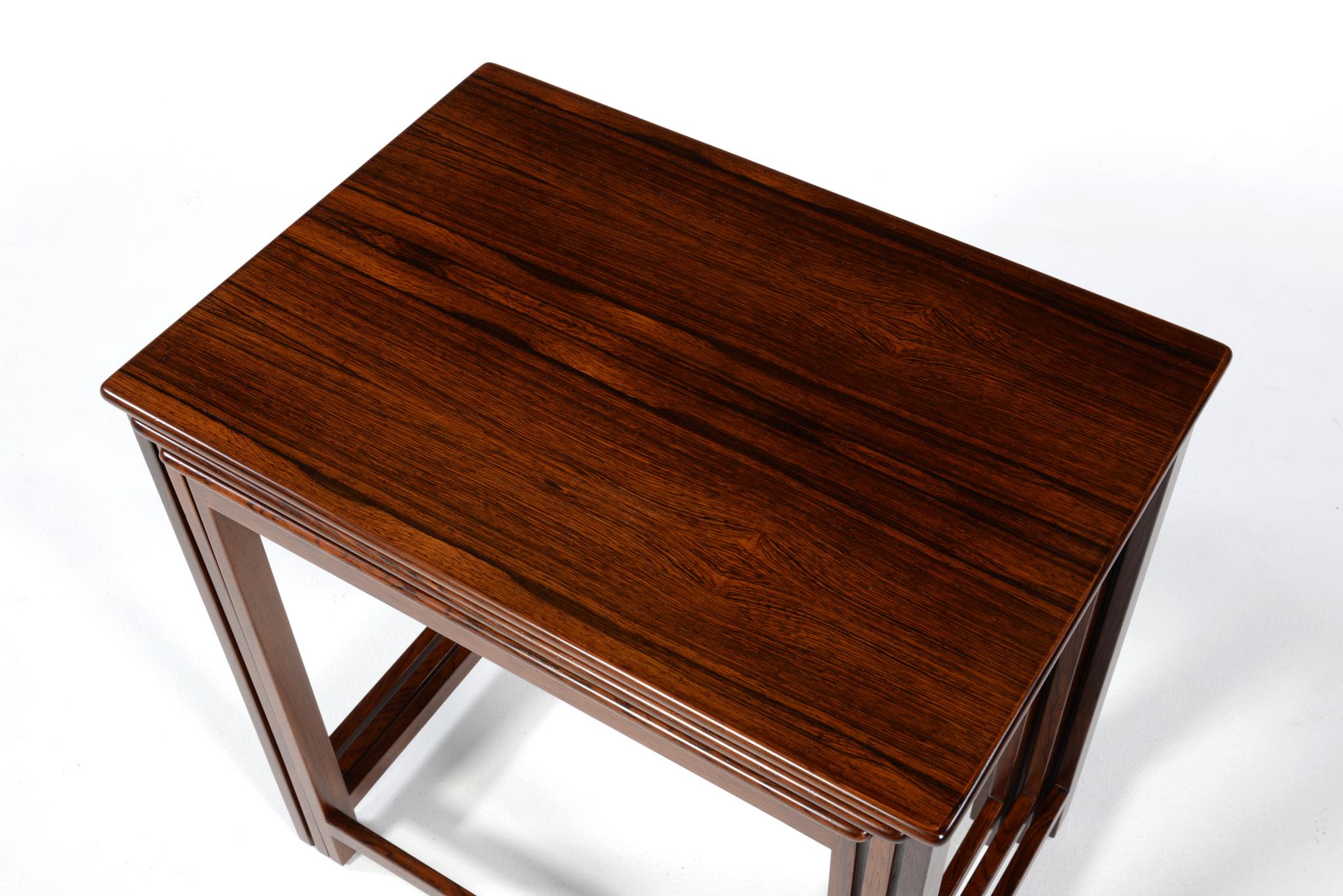 デンマークを代表するデザイナーでキャビネットメーカーの、Jacob Kjær/ヤコブ・ケアによるネストテーブルです。1950年代頃のものでしょう。名工、ルド・ラスムッセン工房、或いは、ヤコブ・ケア工房にて作られたようです。天板は突き板のタイプで、良質なローズウッド材が用いられています。