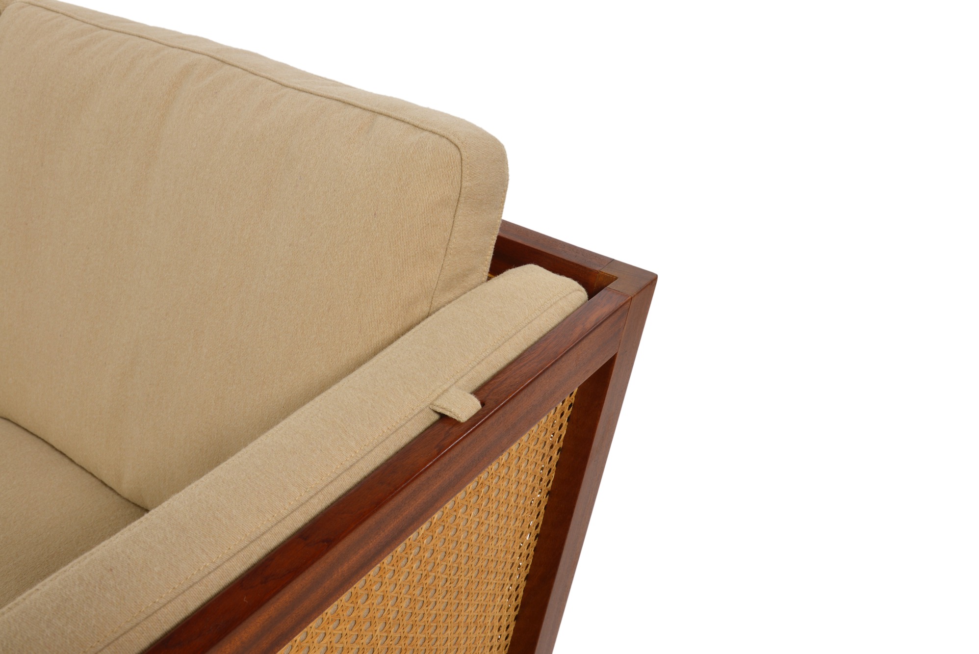 デンマークのデザイナー、ベアント・ピーターセンによる籐張りのソファです。アームにクッションの備わる大きなタイプです。