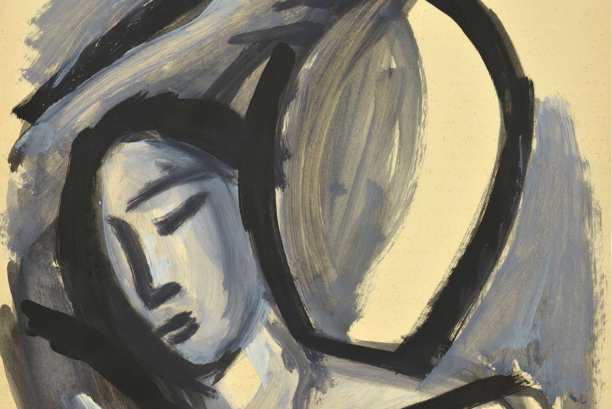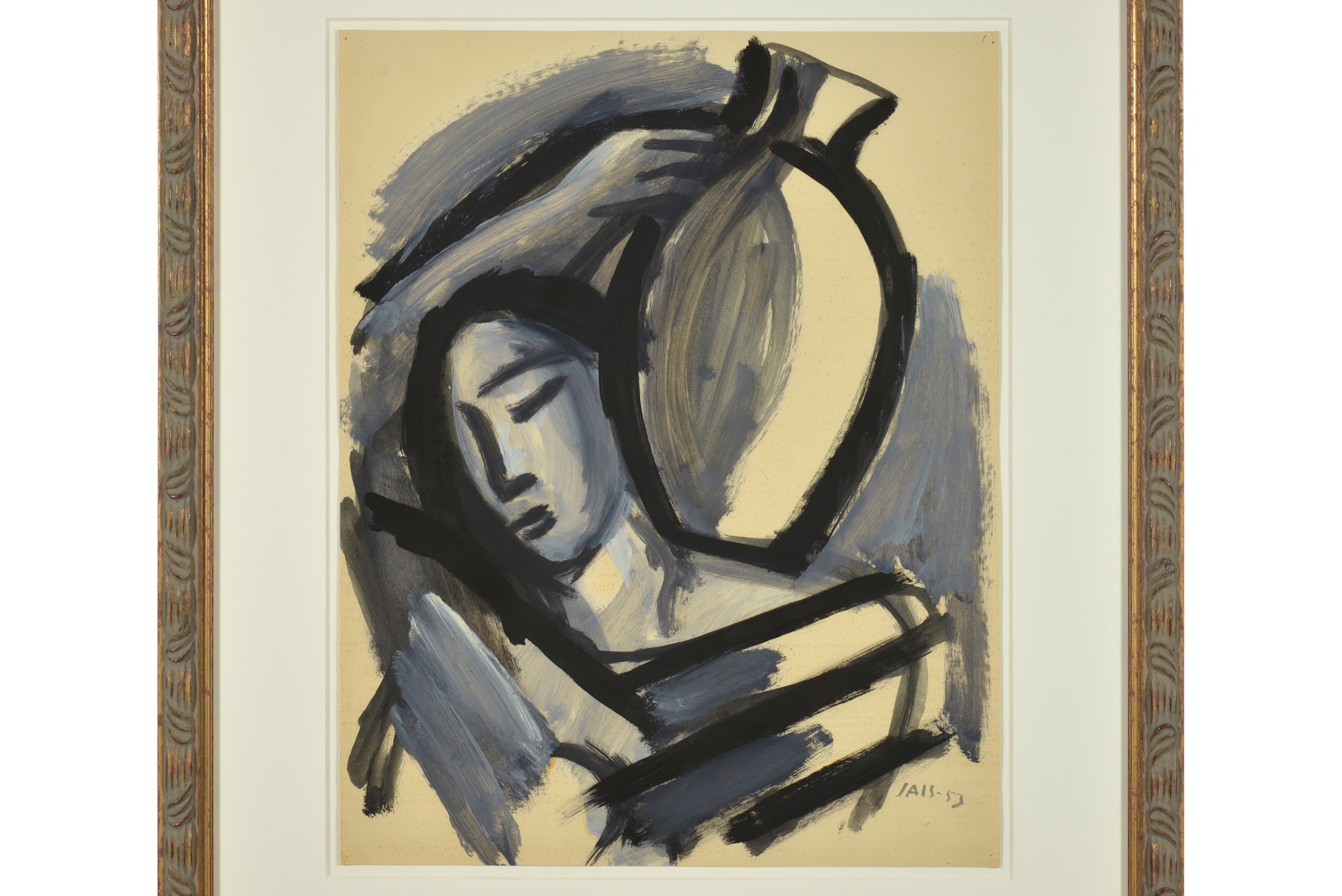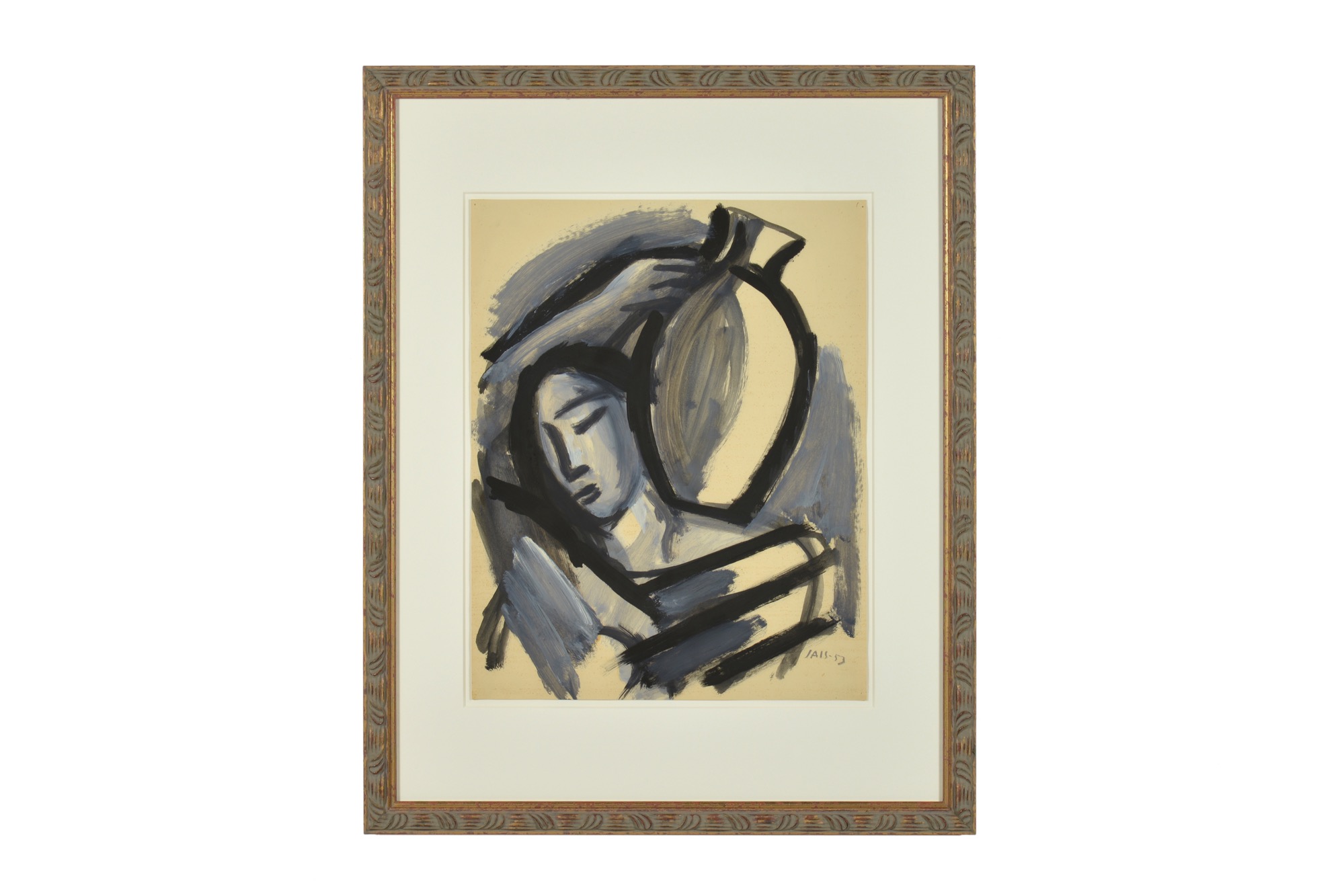 デンマークの芸術家、Jais Nielsen/ヤイス・ニールセンによるミクスドメディア作品です。イエスの説話「サマリアの女」をモチーフに描いています。紙に画鋲痕があり、若干の黄ばみが見られますが、退色などはなくきれいな状態です。新たに額装を施しました。