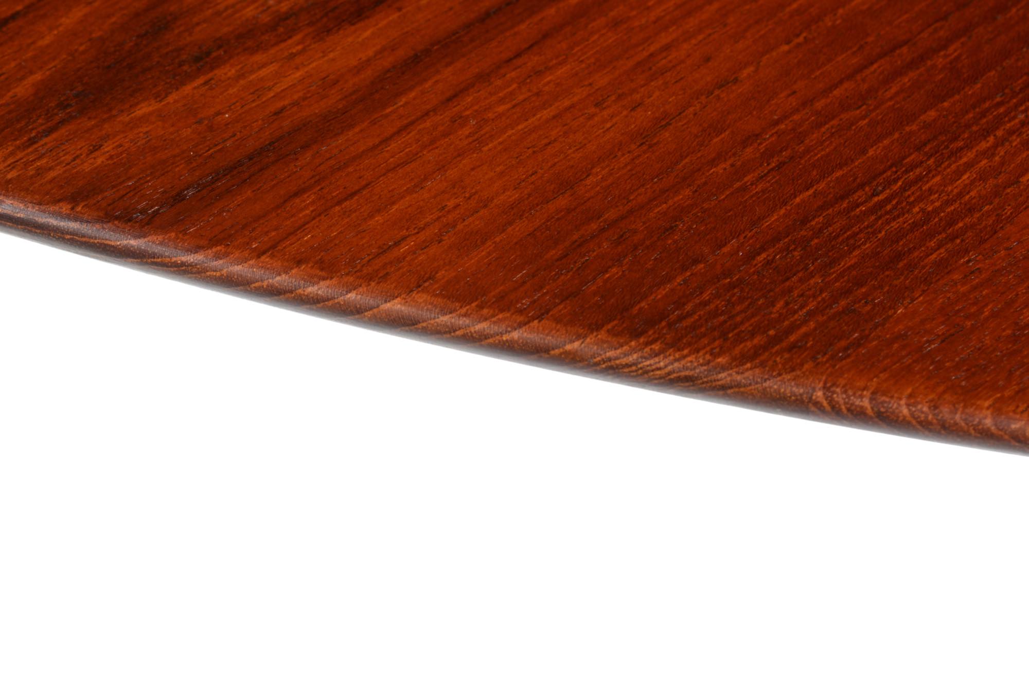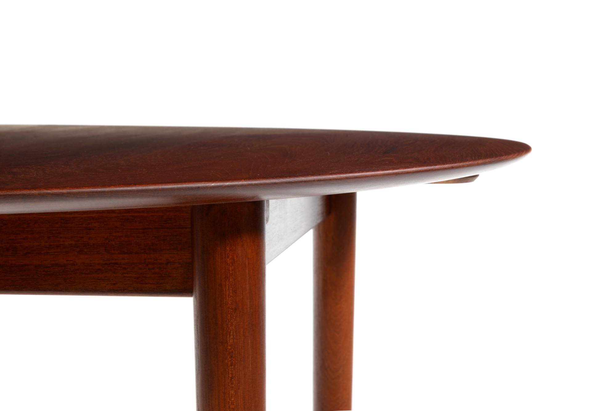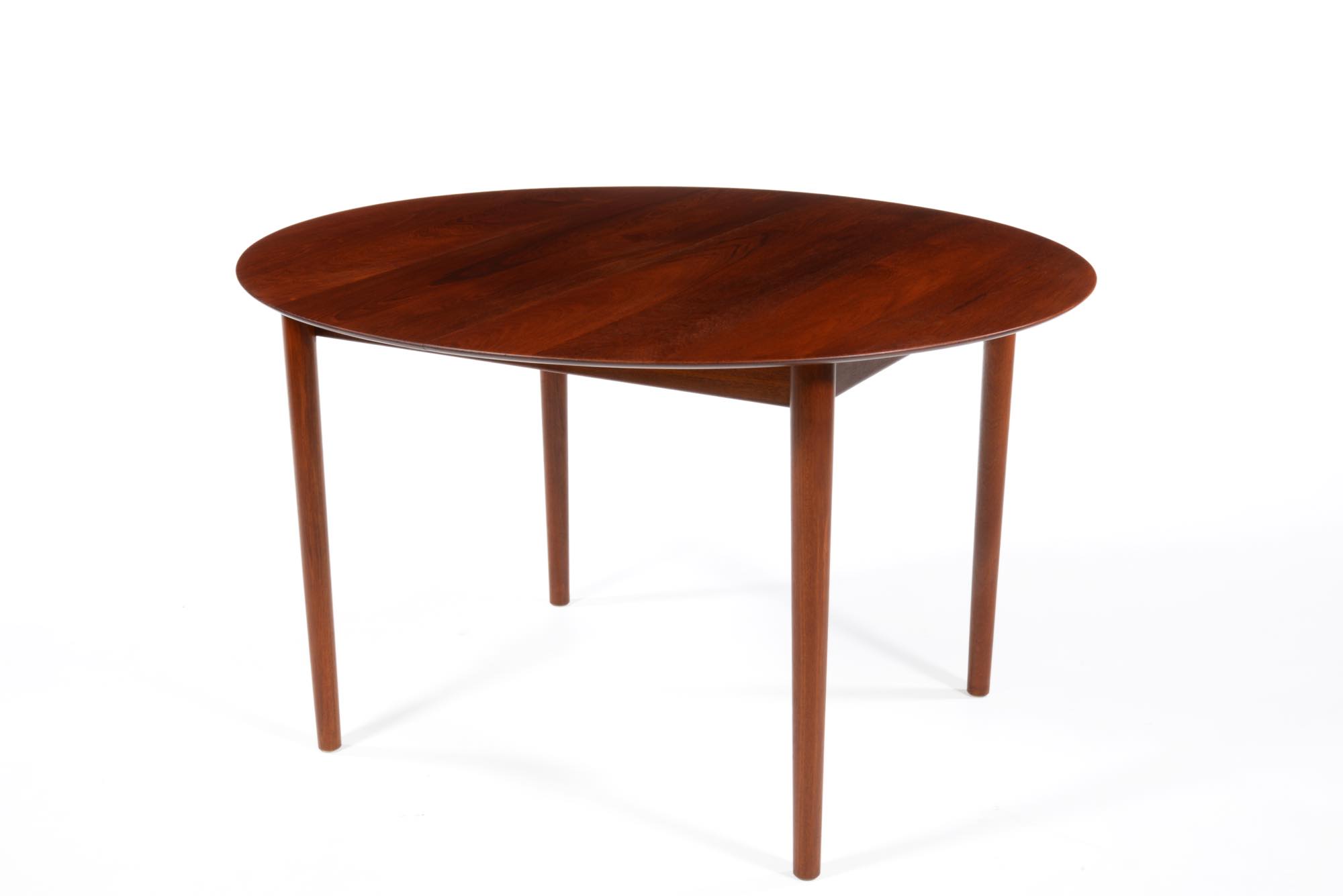 ピーター・ヴィッツとオルラ・ミュルゴー・ニールセンによってデザインされたダイニングテーブルです。ゆったりと楕円がかったトップは美しいラインを描いています。きれいなつくりのもので、タイ国原産と思しきチークの無垢集成材が用いられています。エクステンションリーフは付属しません。